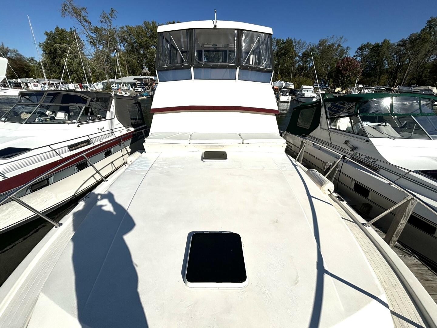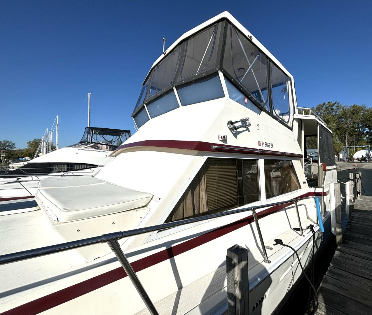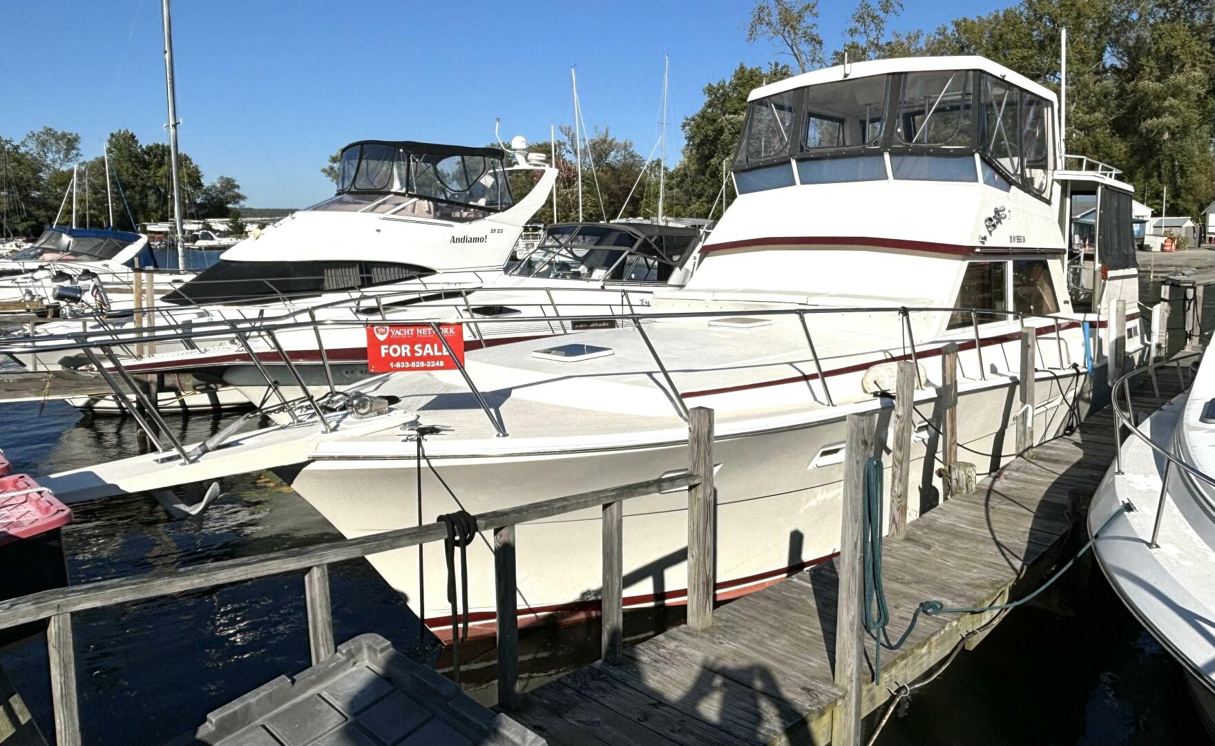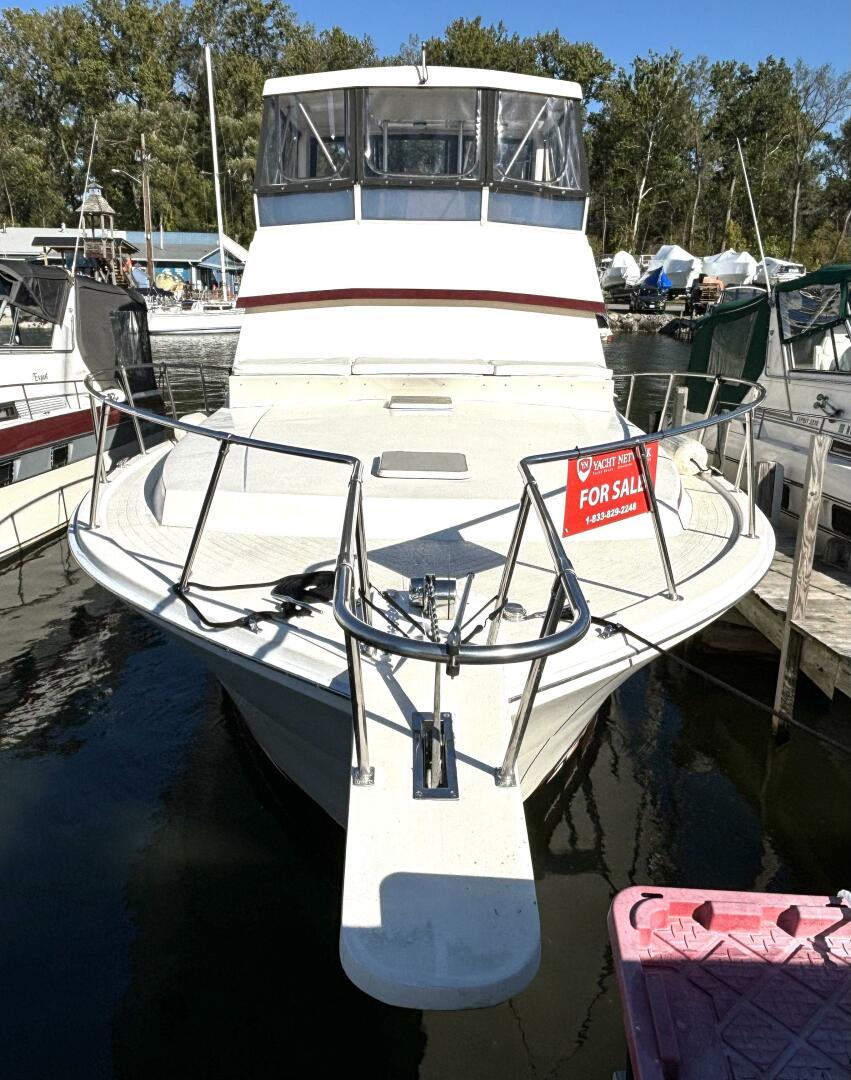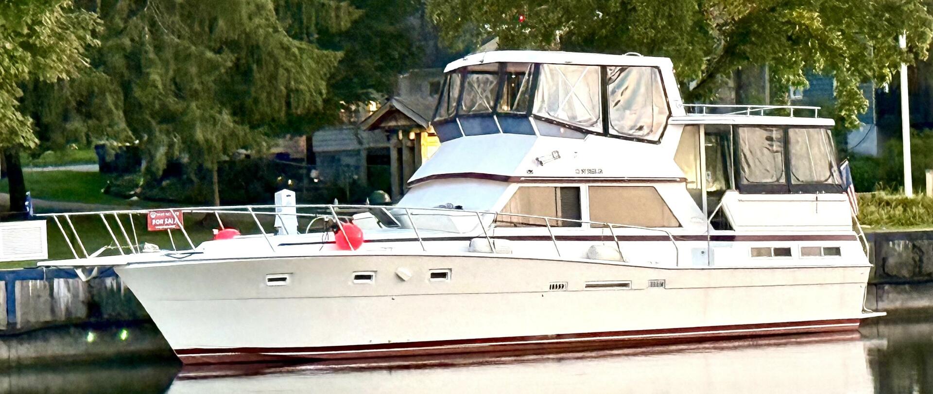 This gorgeous condition Viking 44 Motor Yacht is full of character, charm and openness, which is perfect to be utilized as a live aboard vessel, a looper boat, or simply a well appointed day cruiser! You will love the open concept and how much room there is aboard, all the way from the massive, fully covered and enclosed aft deck with all new canvas and Strataglass, to the giant salon and galley encompassing the full 15' beam of the vessel. With plenty of room for entertaining, there are also sleeping accommodations for up to 8! She is a double cabin setup, with the master stateroom consisting of queen size walk-around bed, full wall dresser with drawers, cabinet storage, full length hanging lockers and a master head with stall shower and electric toilet. The forward stateroom has upper and lower berths, also with a hanging locker, storage drawers and a dressing seat with quilted cushions. Additional sleeping arrangements can be made from the dinette that converts into another bed as well as the L-shaped lounge convertible sofa in the salon. The forward head provides all your guests with another stall shower and electric toilet for use. The galley is fully equipped with a refrigerator and freezer, sink, garbage disposal, microwave, a newly implemented ceramic cooktop with teak trim (2023), and plenty of cabinetry and counter space. Back outside, you will find the huge aft deck, complete with outdoor furniture, a beautifully refinished wooden dropdown bar, and access to the bow, bridge and helm. The bridge and helm are nicely laid out with two lounge seats with vinyl covered foam cushions, adjustable helm and companion seats, full lighted instrumentation, and easy access to your GPS, chartplotters, VHF, radio, etc. The entire bridge is also protected by a hardtop and fully enclosed by the upgraded canvas/isinglass. While this nearly 40 year old vessel is in amazing condition and pride of ownership certainly shows, there have been some recent upgrades and maintenance done as well to blend old build charm with modern day improvements. Recent improvements include but are not limited to new aft deck cushions (2025), new transmission cables (2025), all new canvas and Strataglass (2024), resurfaced top roof and pulpit (2024), new 4 speaker bluetooth stereo (2023), reinforced foredeck and Lewmar power windless, new freshwater pump and new hot water heater. All this is powered by twin Detroit Diesels (Model 6-71 TI) that are running strong and are known for their durability and reliability. Come check out this beauty today and experience the exquisite woodworking rarely found in boats anymore, the ability to move freely around both inside and out, and the pride of ownership of a Viking Motor Yacht that you will be hard pressed to find one nicer!
