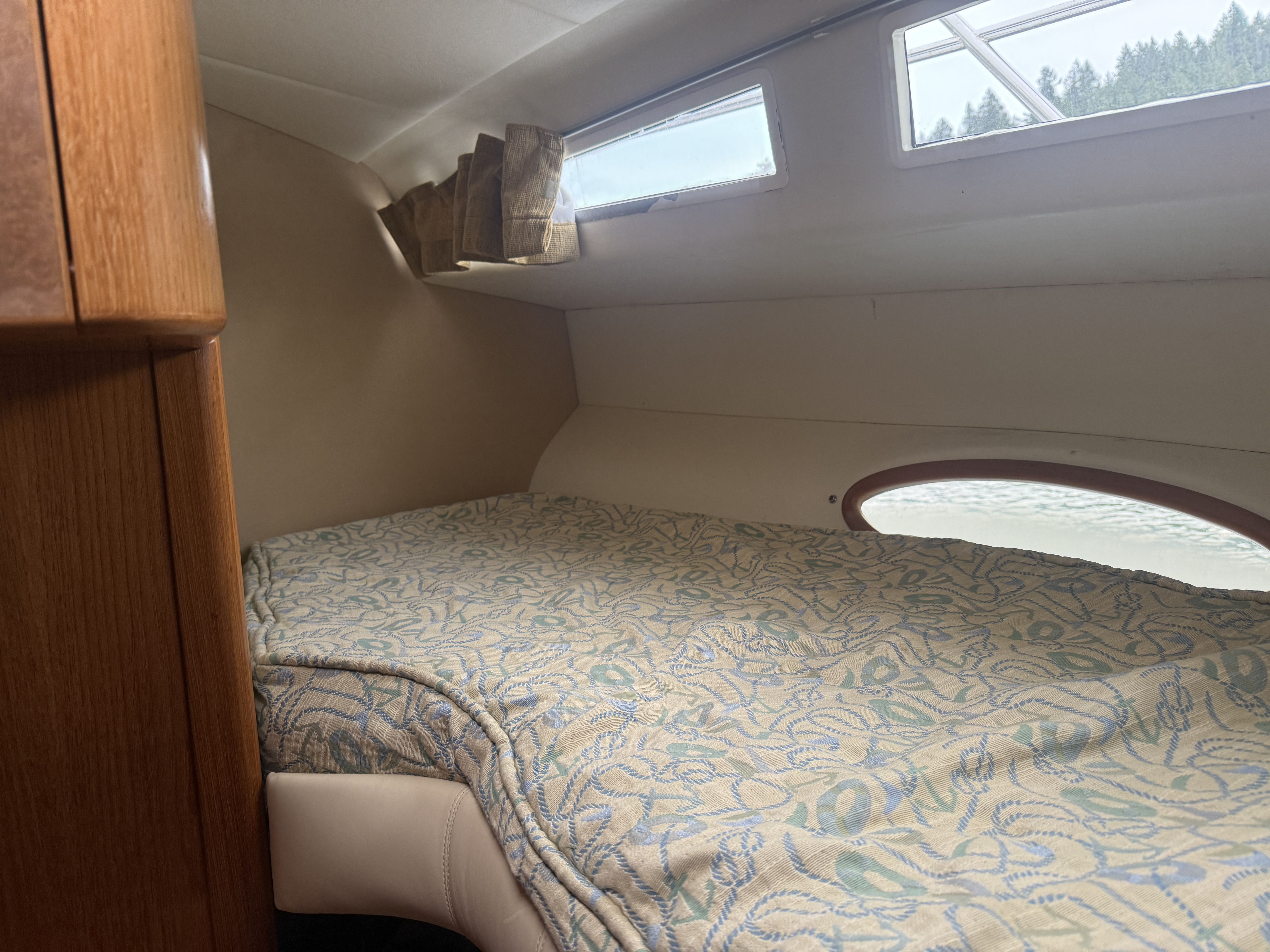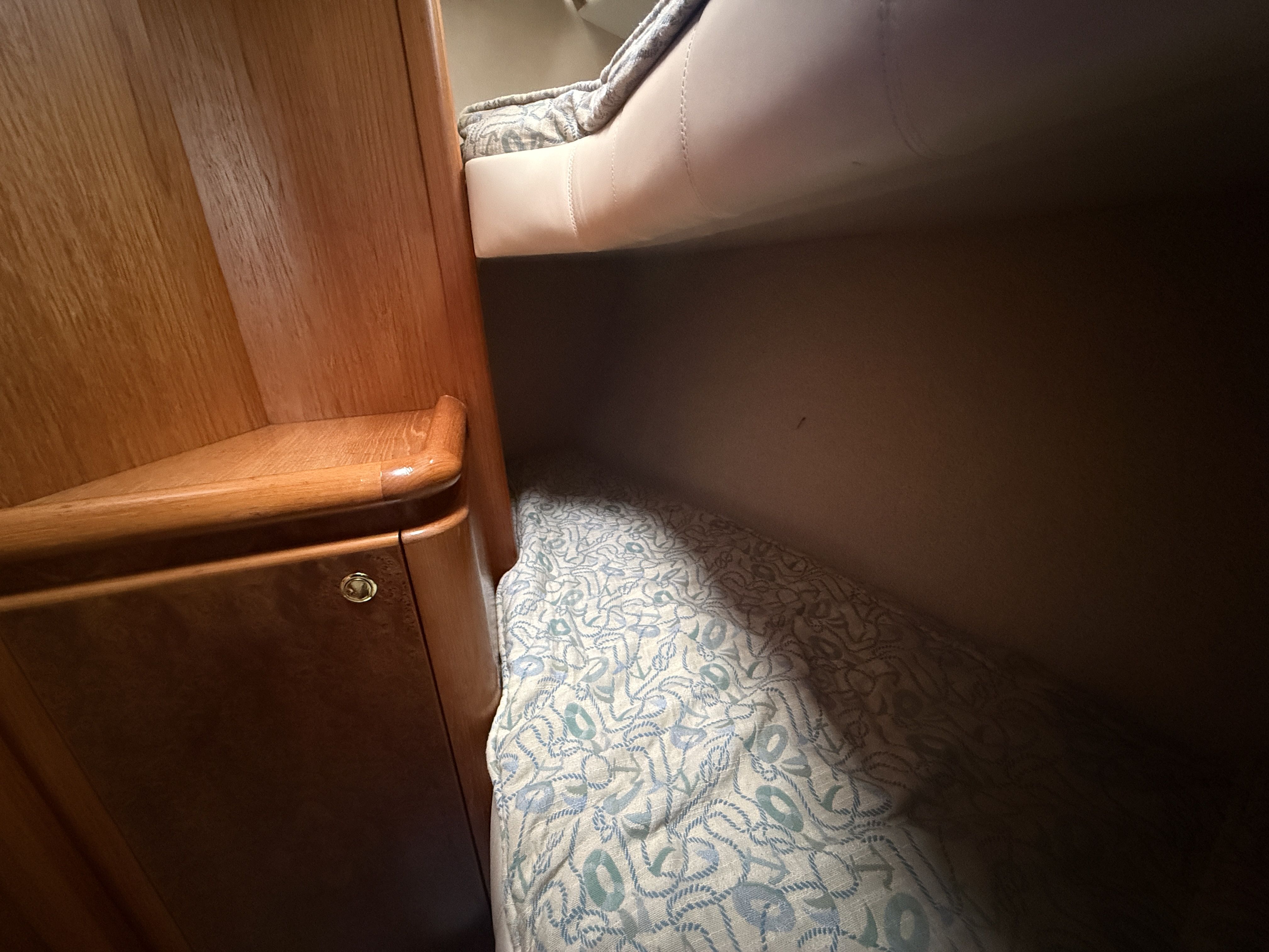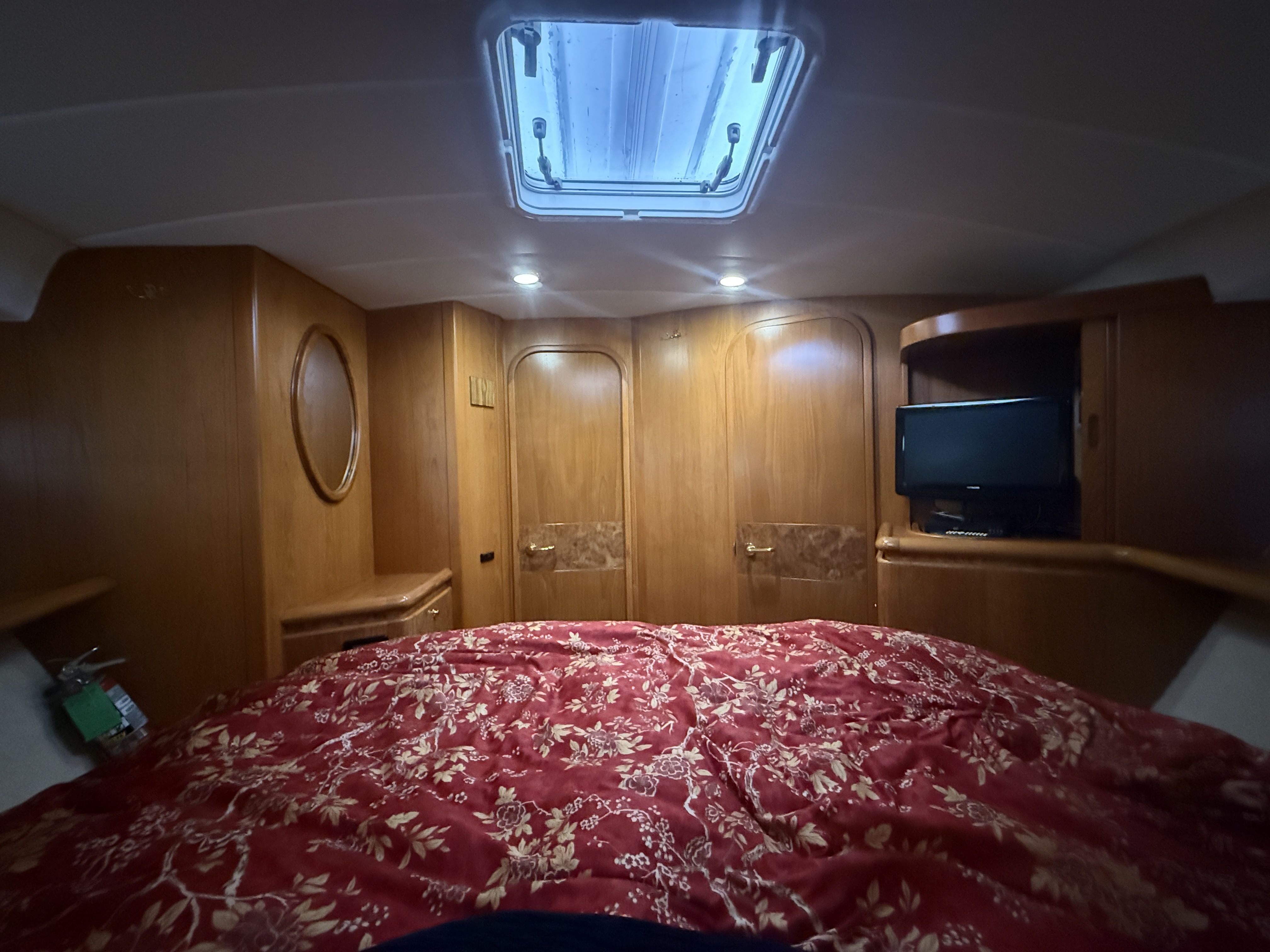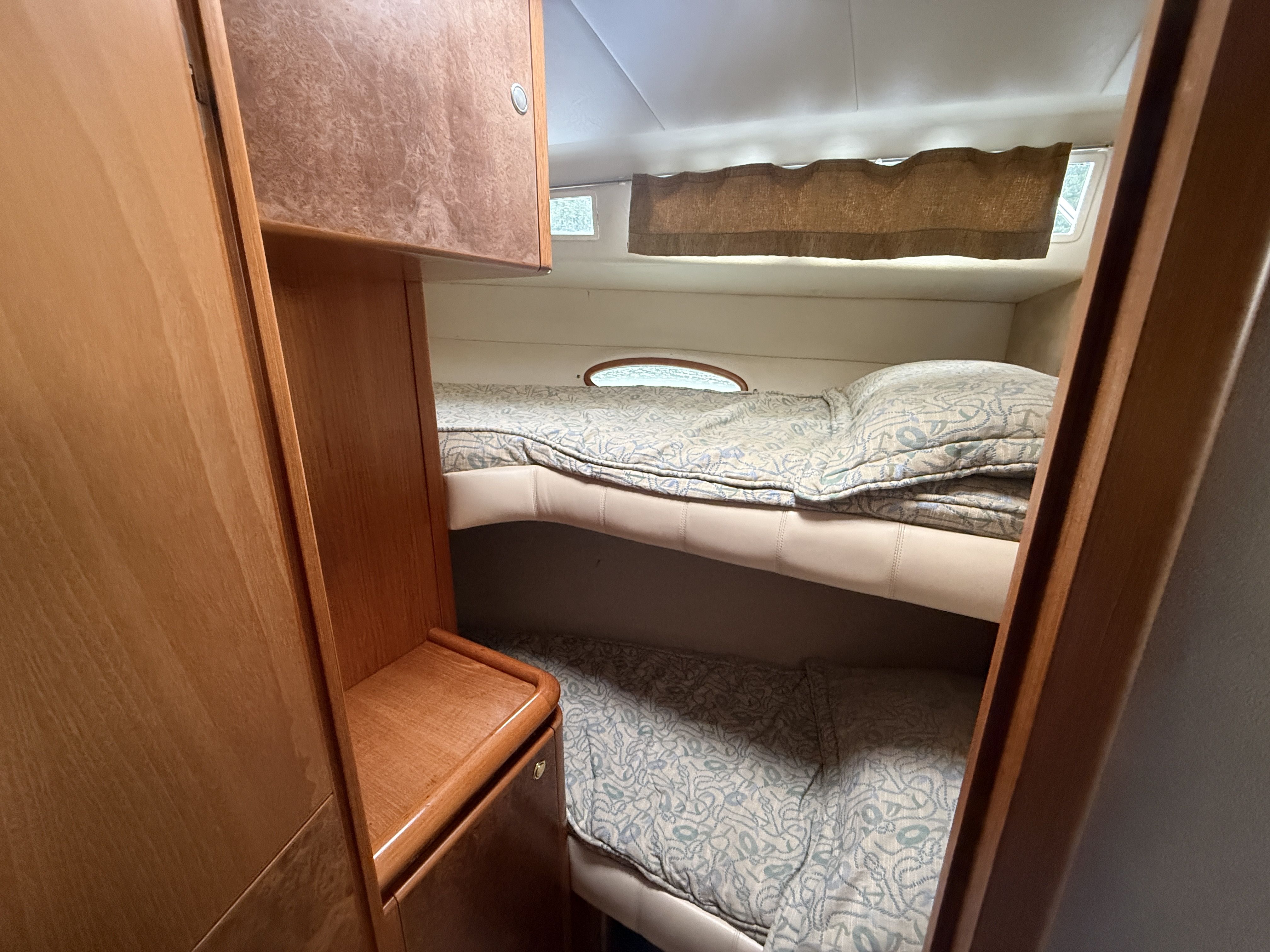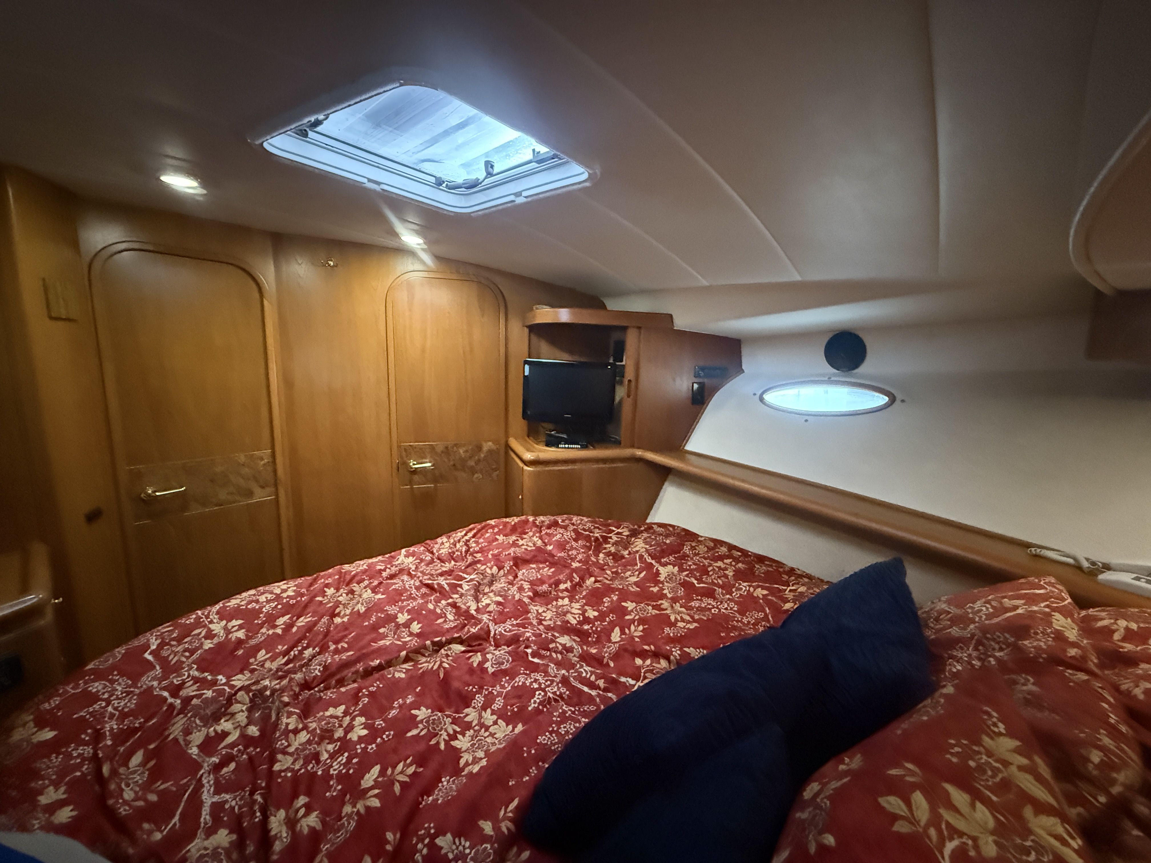 Below deck, the three-cabin, two-head layout provides excellent family or guest accommodations. The forward master stateroom features a queen berth, flat-screen TV, and private ensuite with stand-up shower and VacuFlush head. The port guest cabin offers a twin berth and storage cabinetry, while the starboard guest cabin provides two bunks with natural light and ventilation through an overhead hatch. Reverse-cycle air conditioning runs throughout the vessel, ensuring comfort in every cabin.