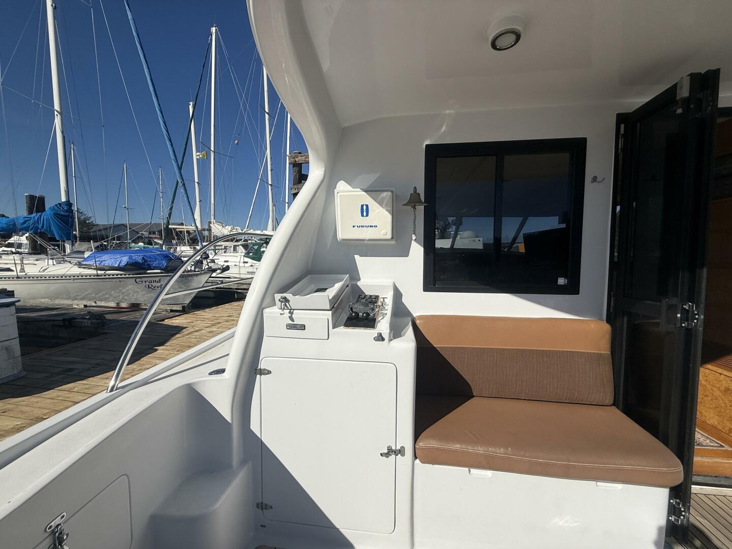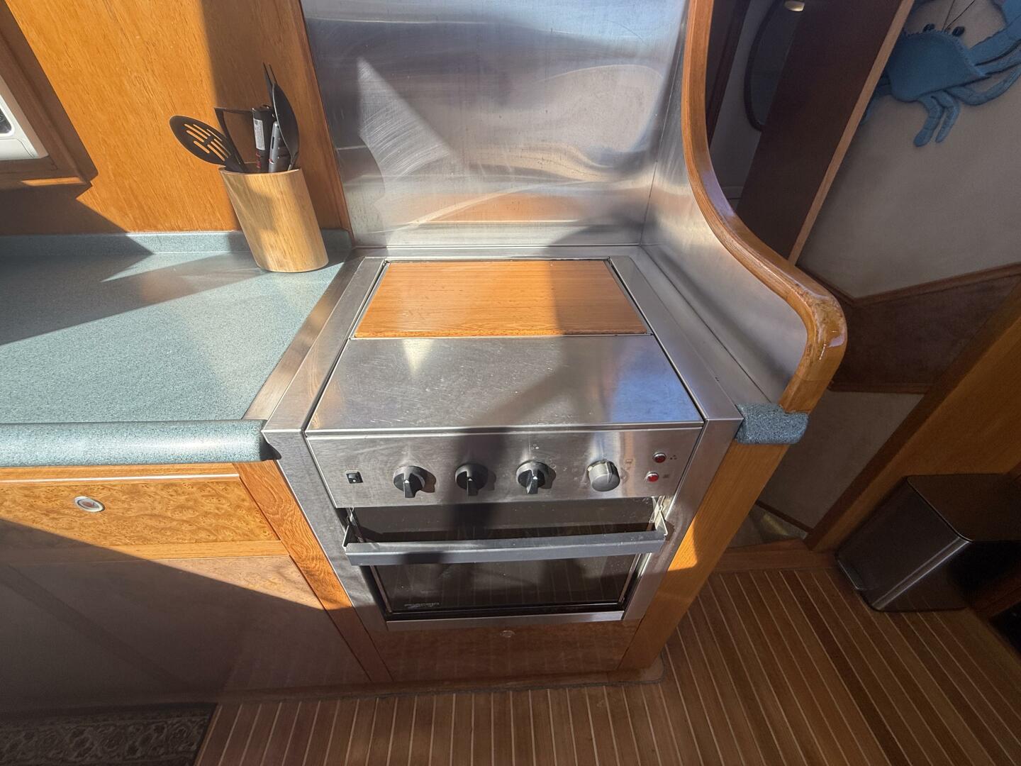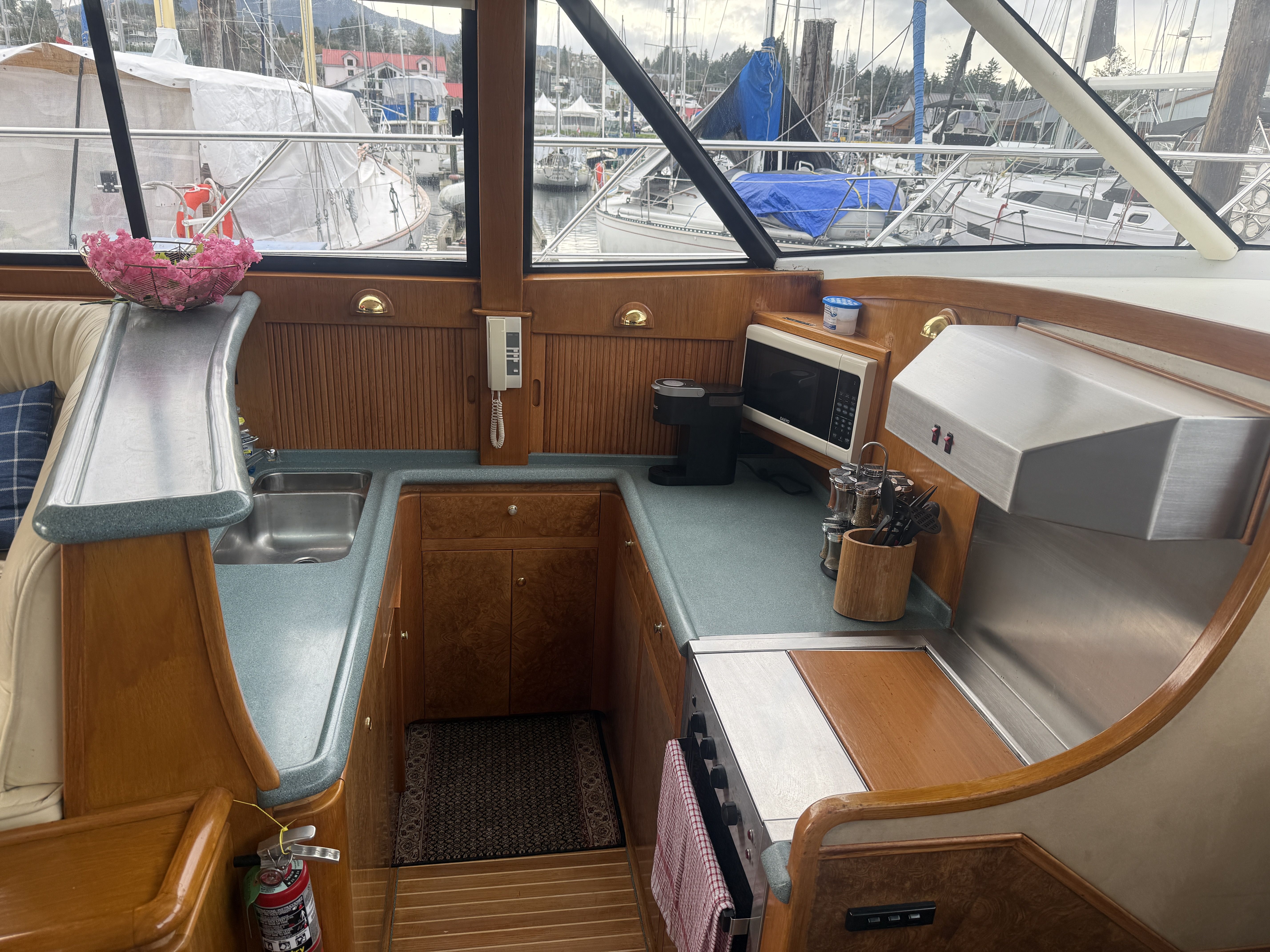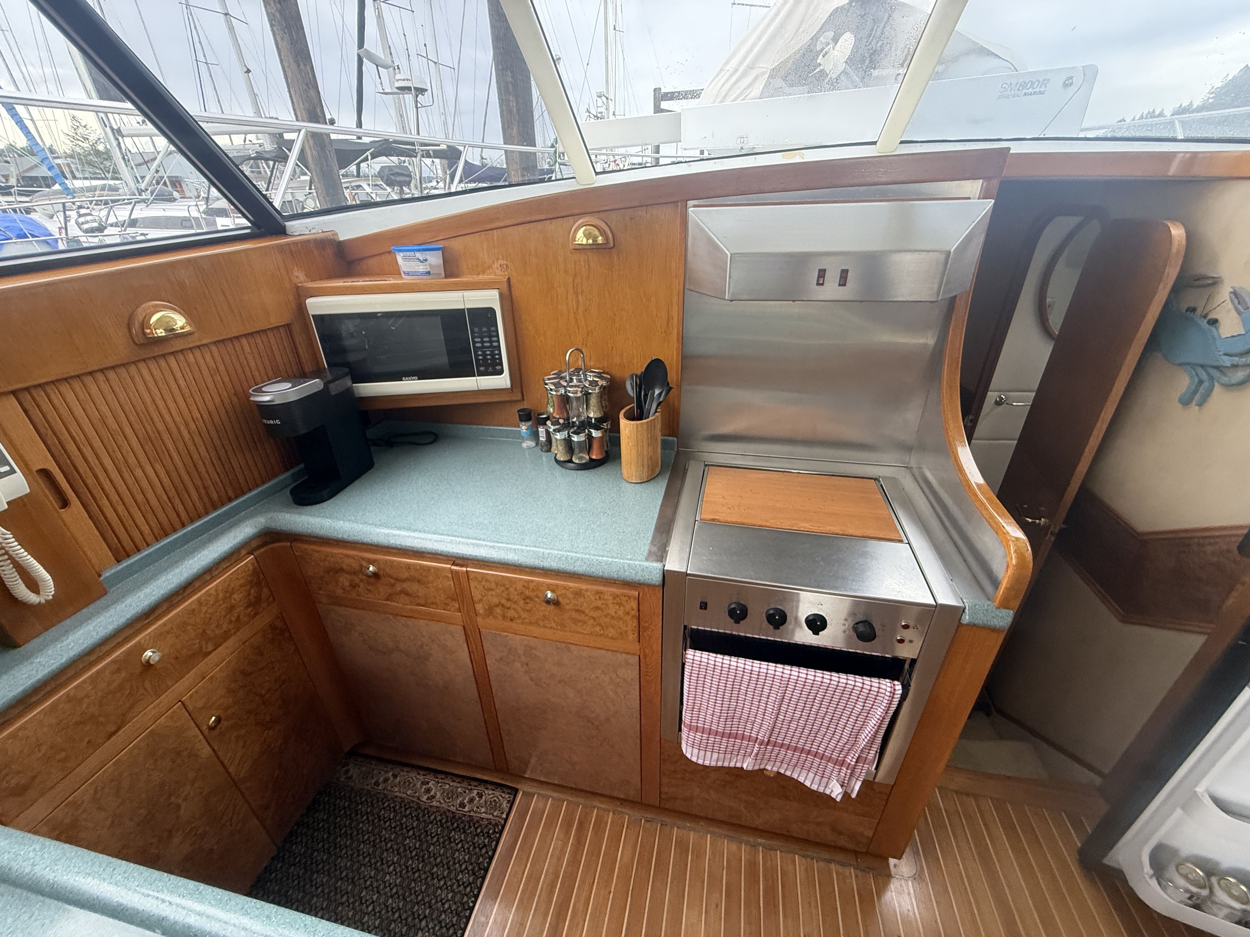 The interior showcases quality and comfort. The main salon offers generous seating, beautiful joinery, a Roku flat-screen TV, and a Kenwood stereo system. The galley is equipped with a Force 10 electric oven and three-burner range, a Sanyo microwave, Vitrifrigo 12/24 volt refrigerator, freezer, and U-Line ice maker, all supported by a Magnum Energy inverter/charger and a Raritan 20-gallon water heater.