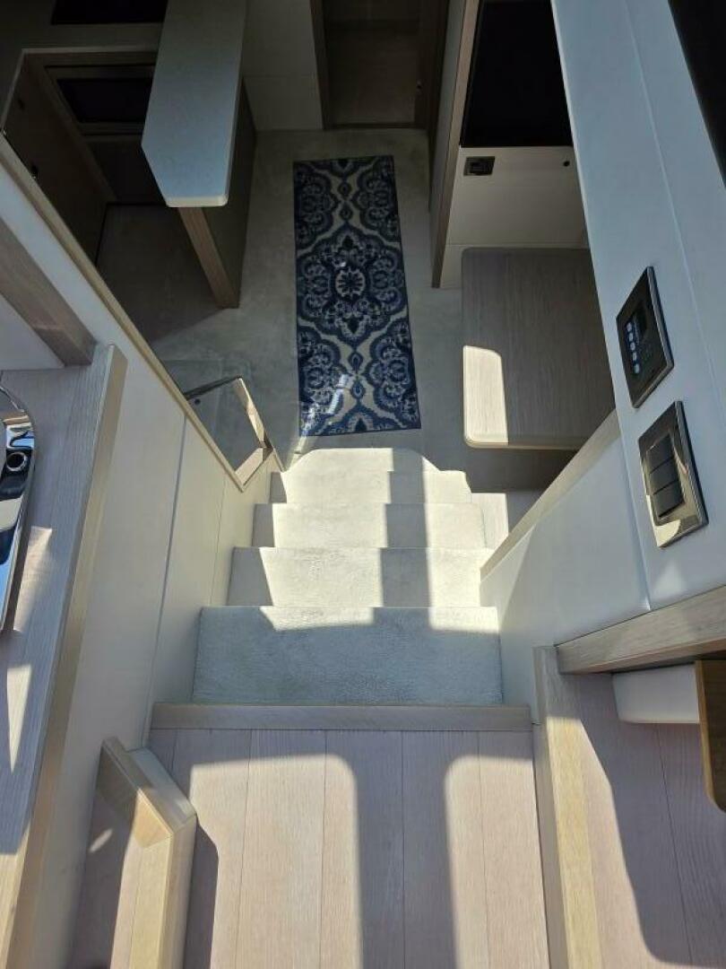 - Molded stairwells part and stbd. in the transom with stainless steel handrails and teak treads