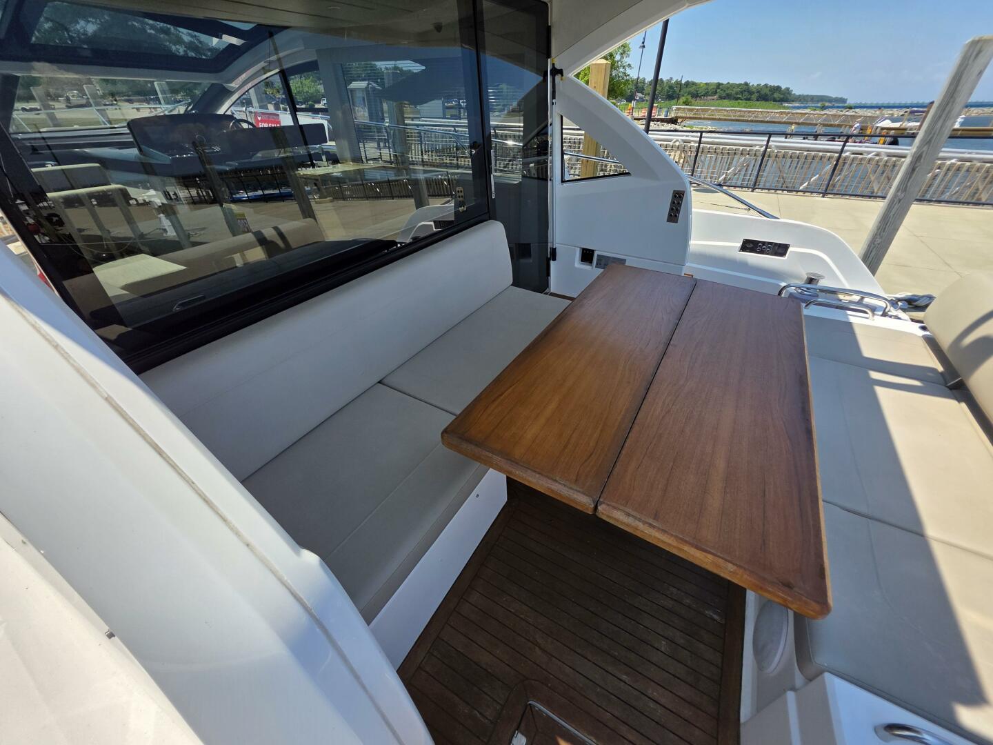 - Teak-topped, hinged leaf table mounted on the aft deck