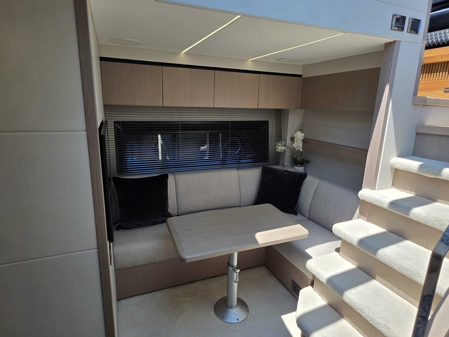 - U-settee, aft to port with pedestal mounted Hi/low table