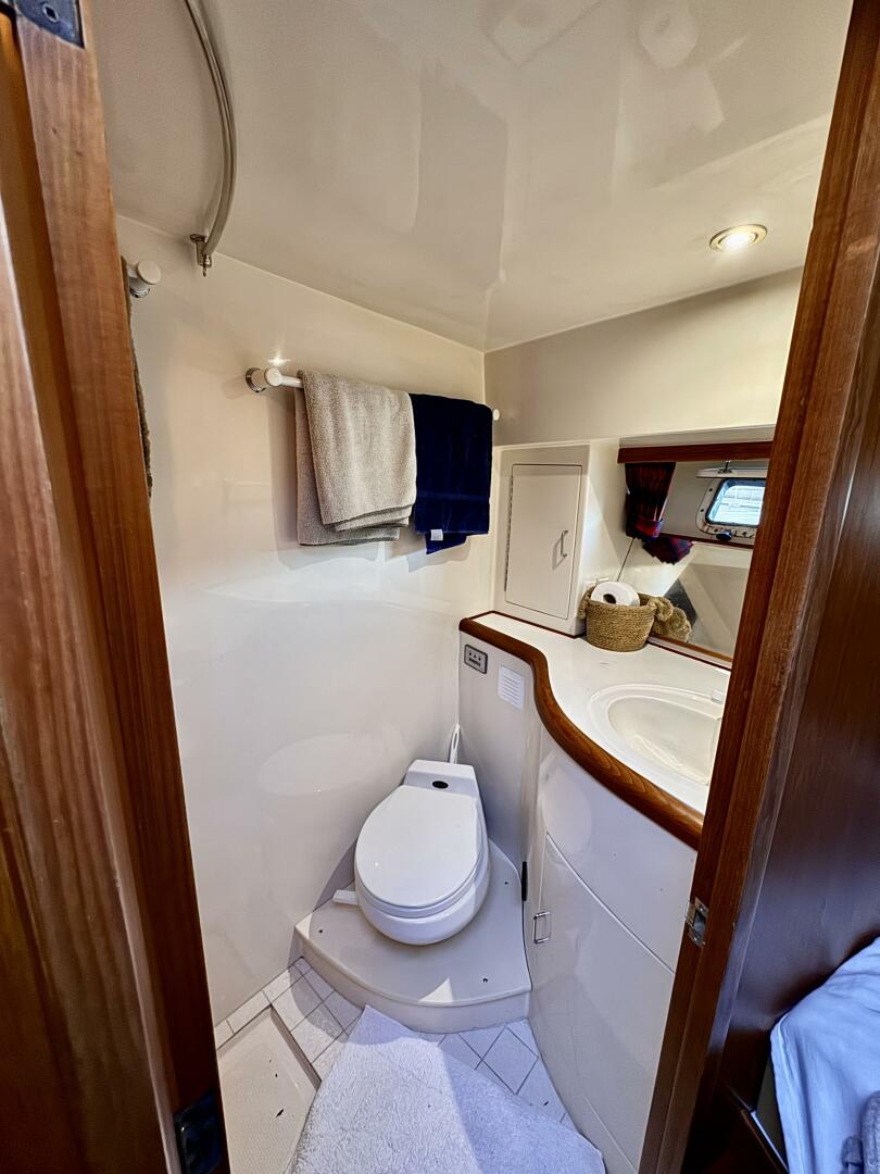 Enclosed Head accessible from both staterooms: VacuFlush toilet, built-in vanity with storage, separate standup stall shower