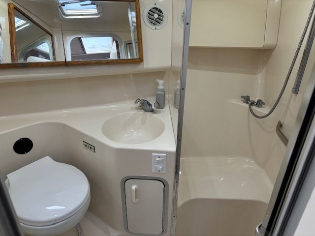 The Salon is large and comfortable with a convertible sofa suitable for hosting extra overnight guests. There is, of course, a v-birth and an aft-cabin for main occupants. The fully equipped Galley also features a large counter top which is great for meal preparation. The Head features a separate stand-up shower stall.