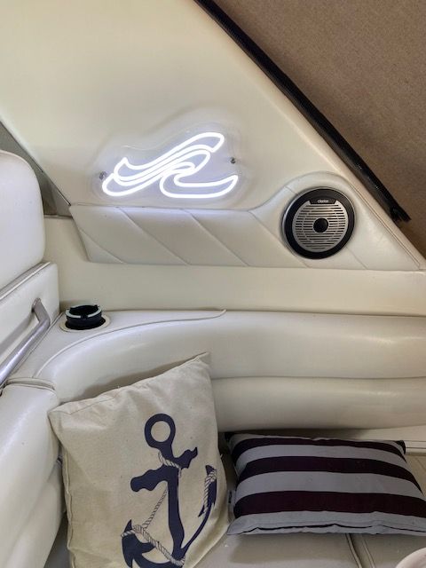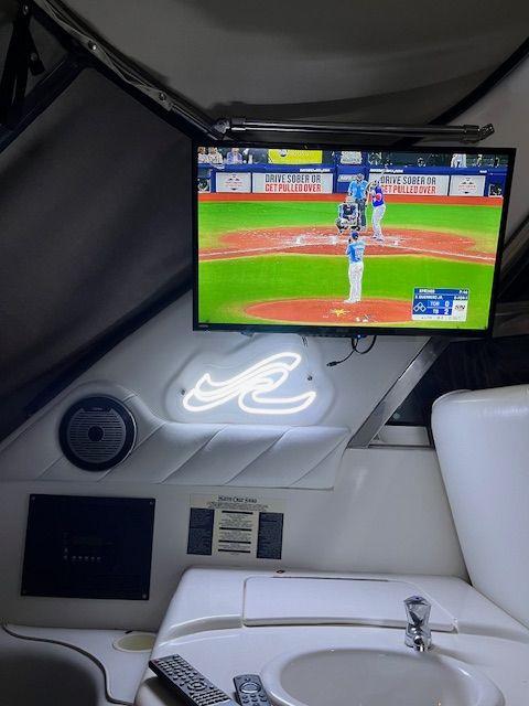 Installed on this boat is a $10,000 Clarion sound system with 8 speakers, subwoofer, amps, and a remote control! There are also 3 TVs on board.