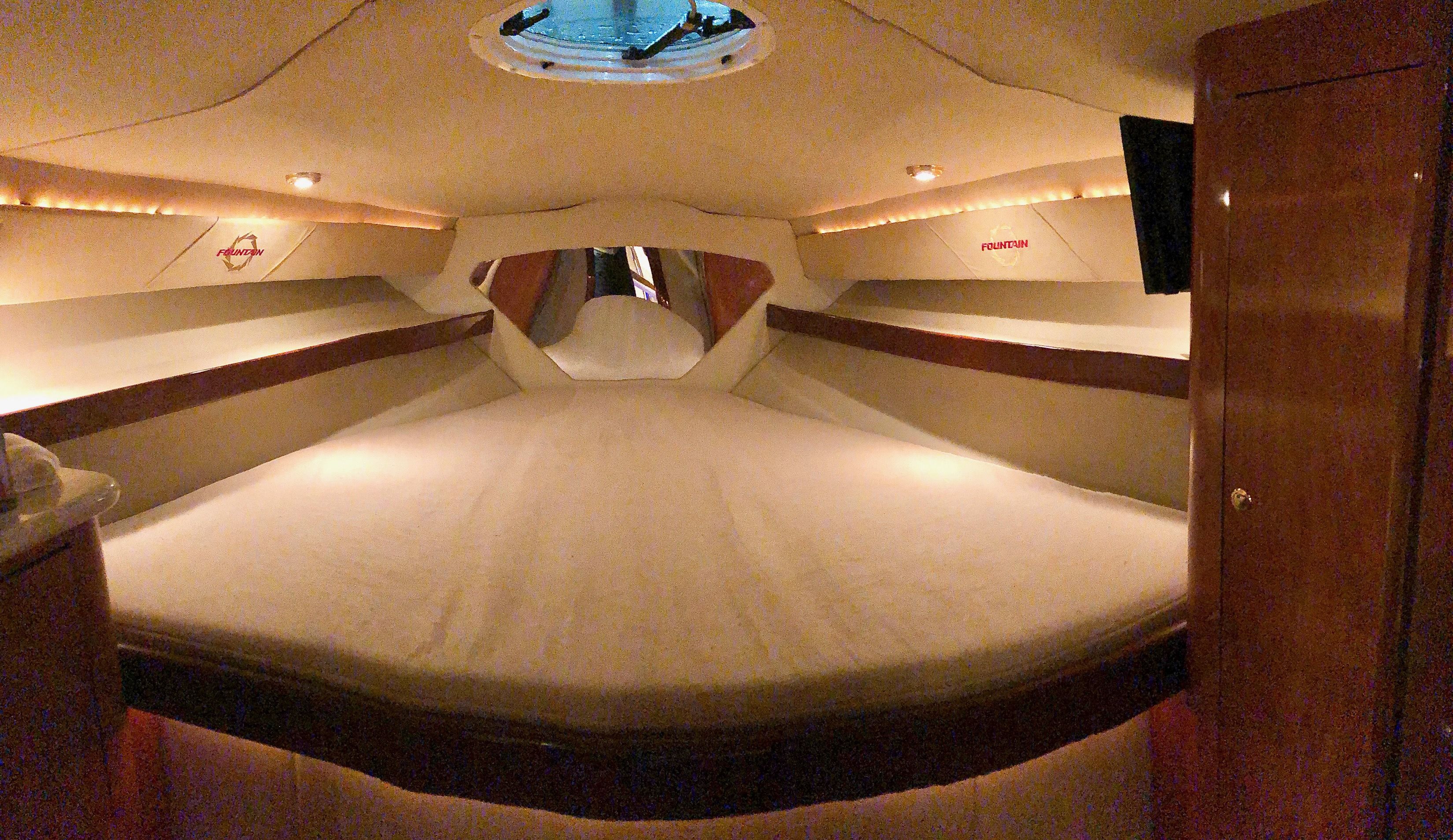 The Fountain 38 Express Cruiser (38 EC) takes that performance DNA and blends it with genuine cruising comfort. With a 10'6" beam, 6'4" of cabin headroom, a proper forward stateroom, mid-cabin sleeper, full galley, and stand-up VacuFlush head with shower, it offers the accommodation of a luxury express cruiser while still capable of 60+ mph speeds with the right power. Spacious cockpit seating, bolster helm seats, a wrap-around aft lounge, and a wet bar all make this model a favorite for both serious runs and social days on the water.