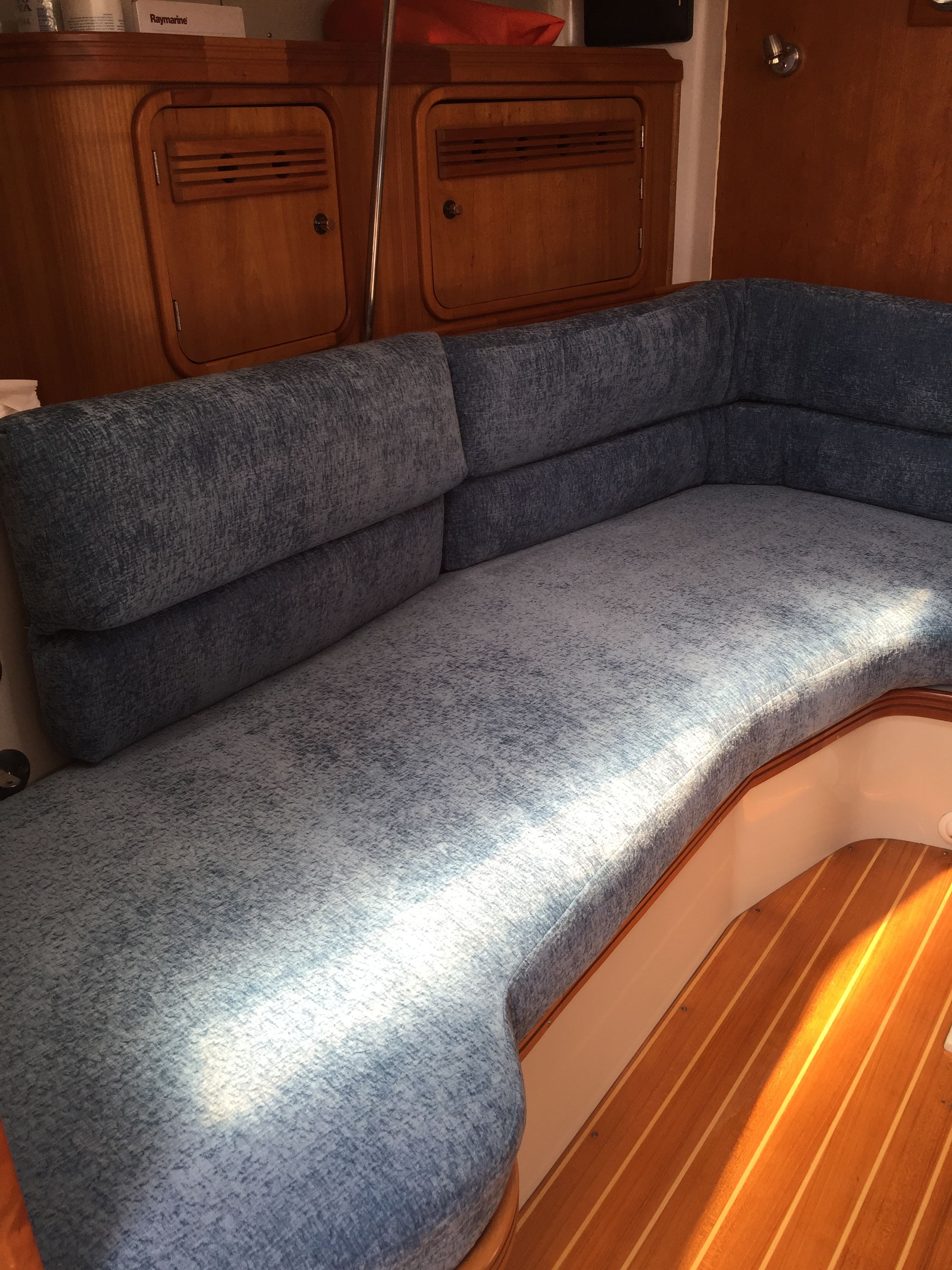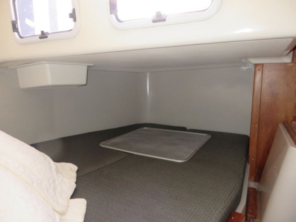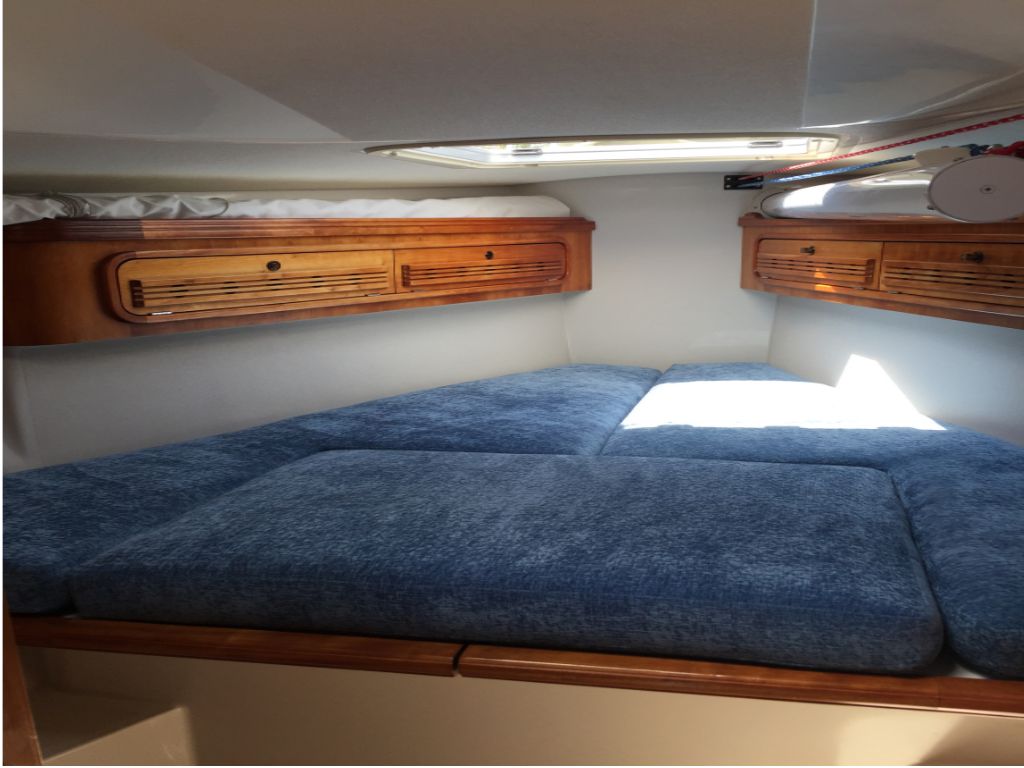 Large forward cabin with convertible sail-handling platform and strong, lightweight honeycomb panels for sail storage under V-berth