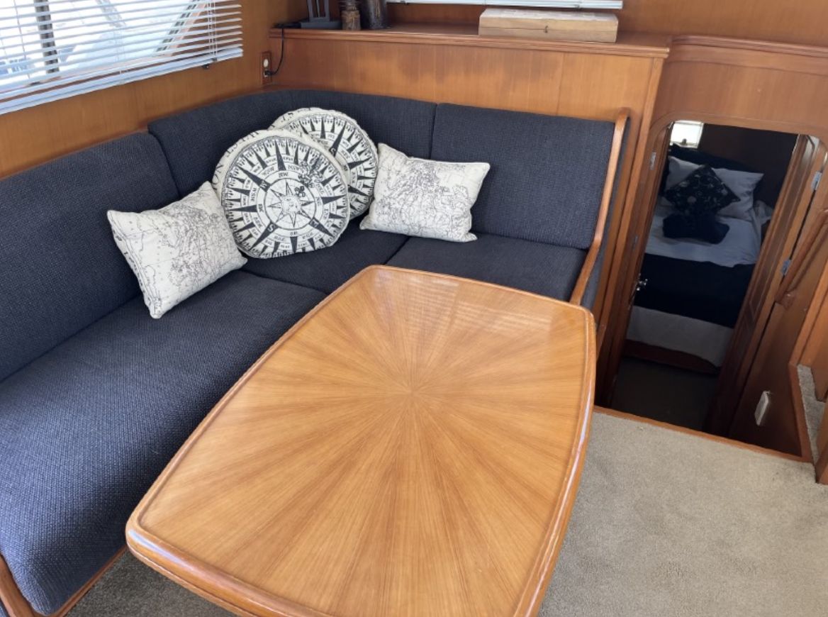 This 44 shows well with some owner upgrades notably including a NEW SWIM PLATFORM.and re-bedded/sealed aft windows. Some interior wood staining and damage is visible from a previous leak. Vessel is powered with Mercruier gas engines and a bow thruster. Great TWIN CABIN LAYOUT and massive outdoor space on the rear sundeck.