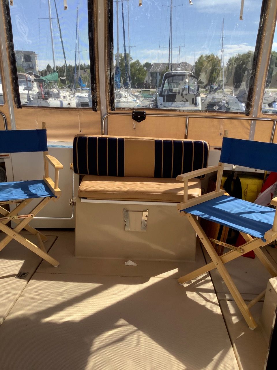 Full cockpit enclosure with Sunbrella bimini/top and side screens (installed 2024 by Genco)
