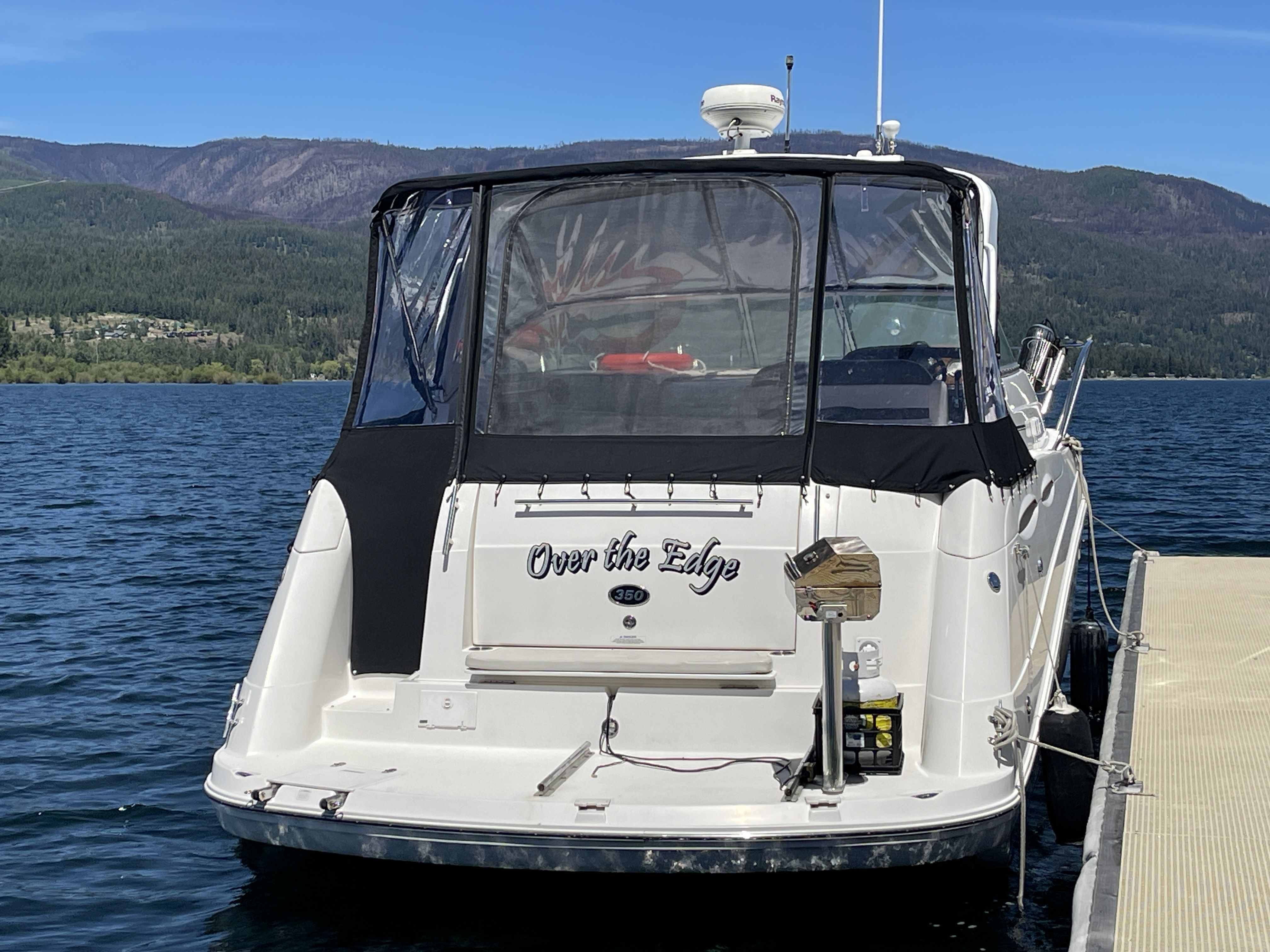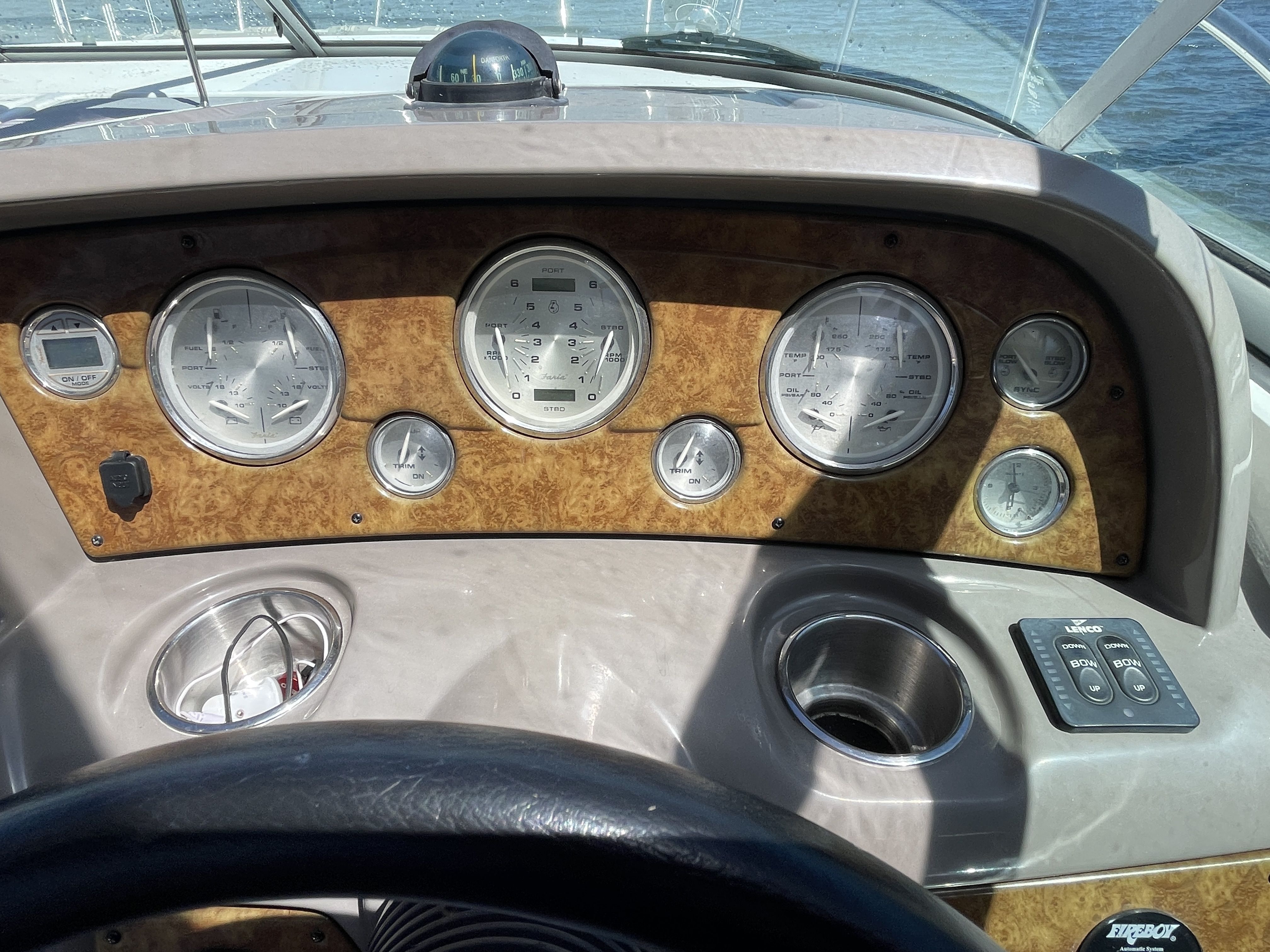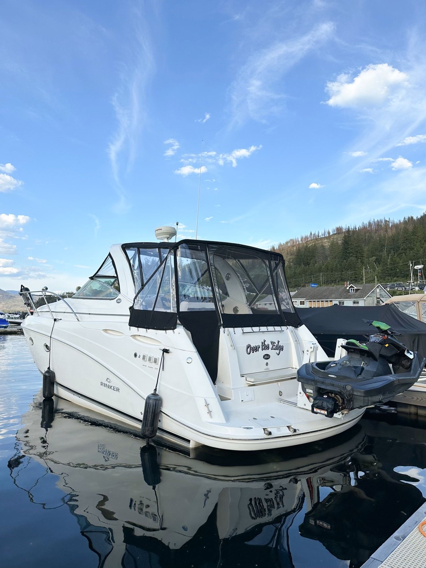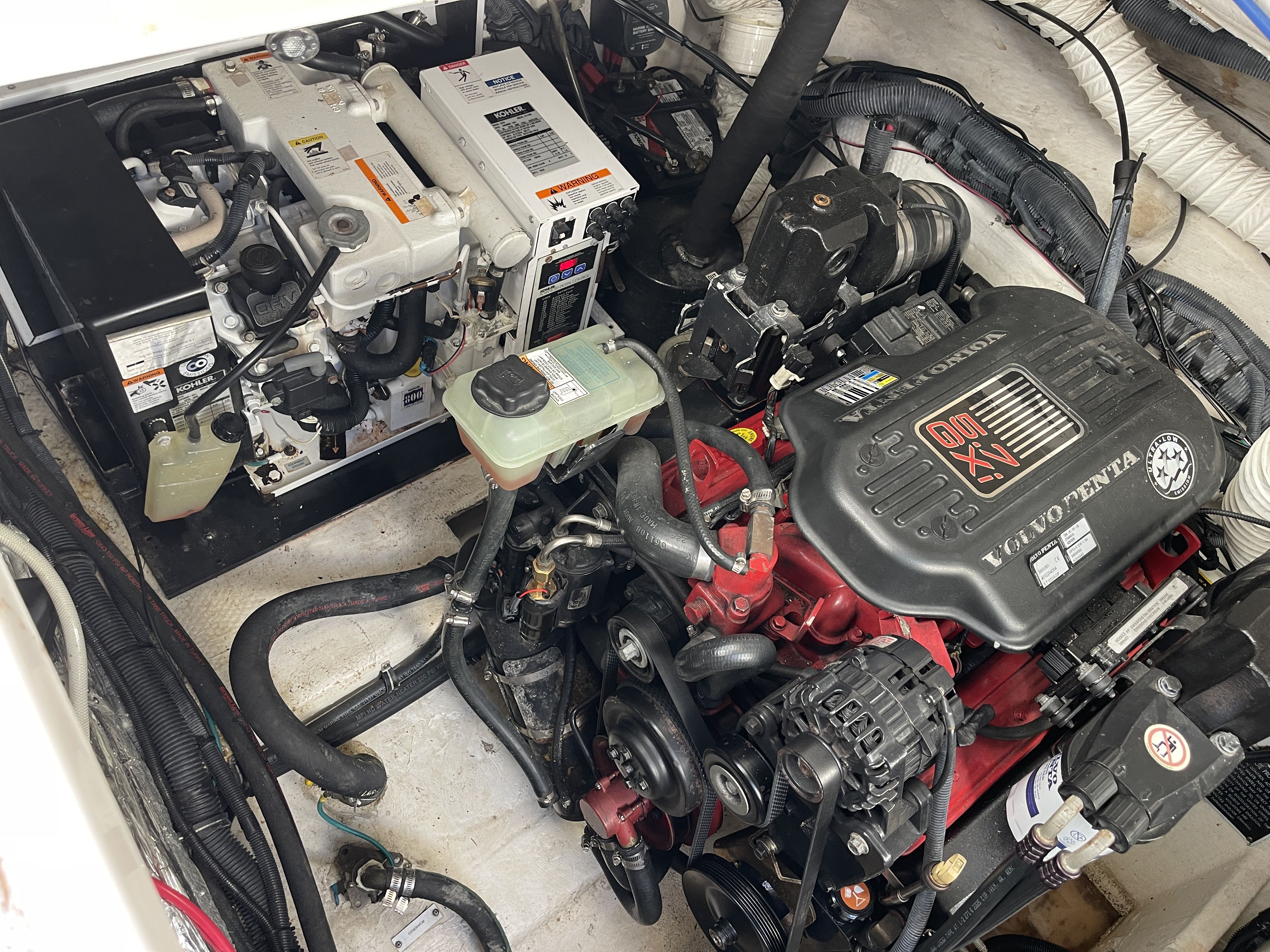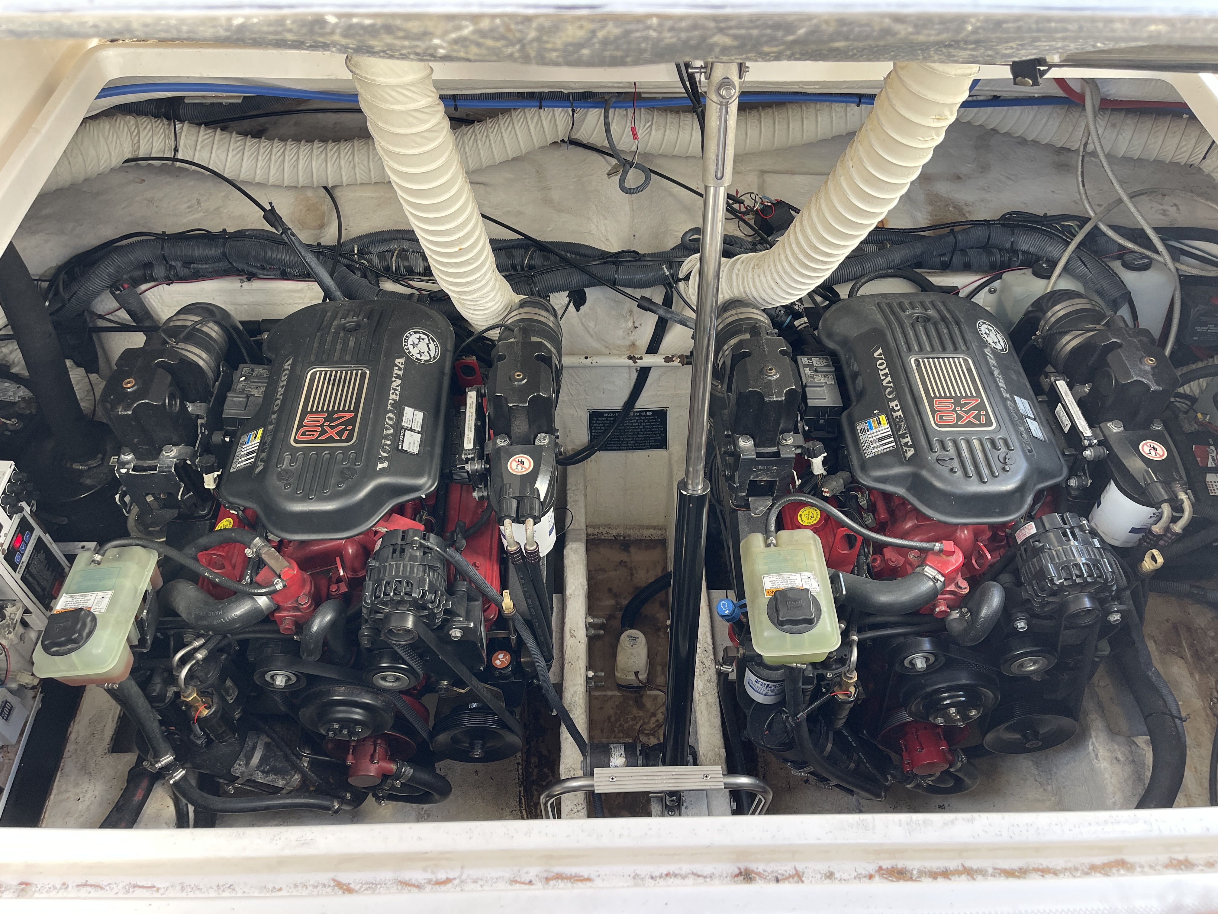 This 2007 Rinker 350 Express Cruiser is powered by twin Volvo Penta 5.7L GXi engines with 380-P/390- STBD hours, and a Kohler generator with 550 hours. The boat is equipped with Volvo Ocean X Dual Prop drives that were installed new 3 years ago. The Rinker 350 offers a unique layout both above and below deck. For entertaining the cockpit has Ultradeck flooring(NEW 2024), the cockpit is enclosed with a full Camper Package(New vinyl 2024) and includes a large U-shaped seat that converts to an aft sunbed, a wet bar with 2 fridges, blender and sink. The helm is equipped with a 7" Raymarine Touchscreen GPS, Raymarine Radar and Standard Horizon VHF. Out back you have an integral swim grid with Ultradeck flooring(New 2024), Transom Seat, Kuuma SS BBQ. NEW(2025) 2000 Watt Xantrex Inverter Charger w/ 4 NEW Discovery AGM 6 volt 390 Amp/hour/each house batteries