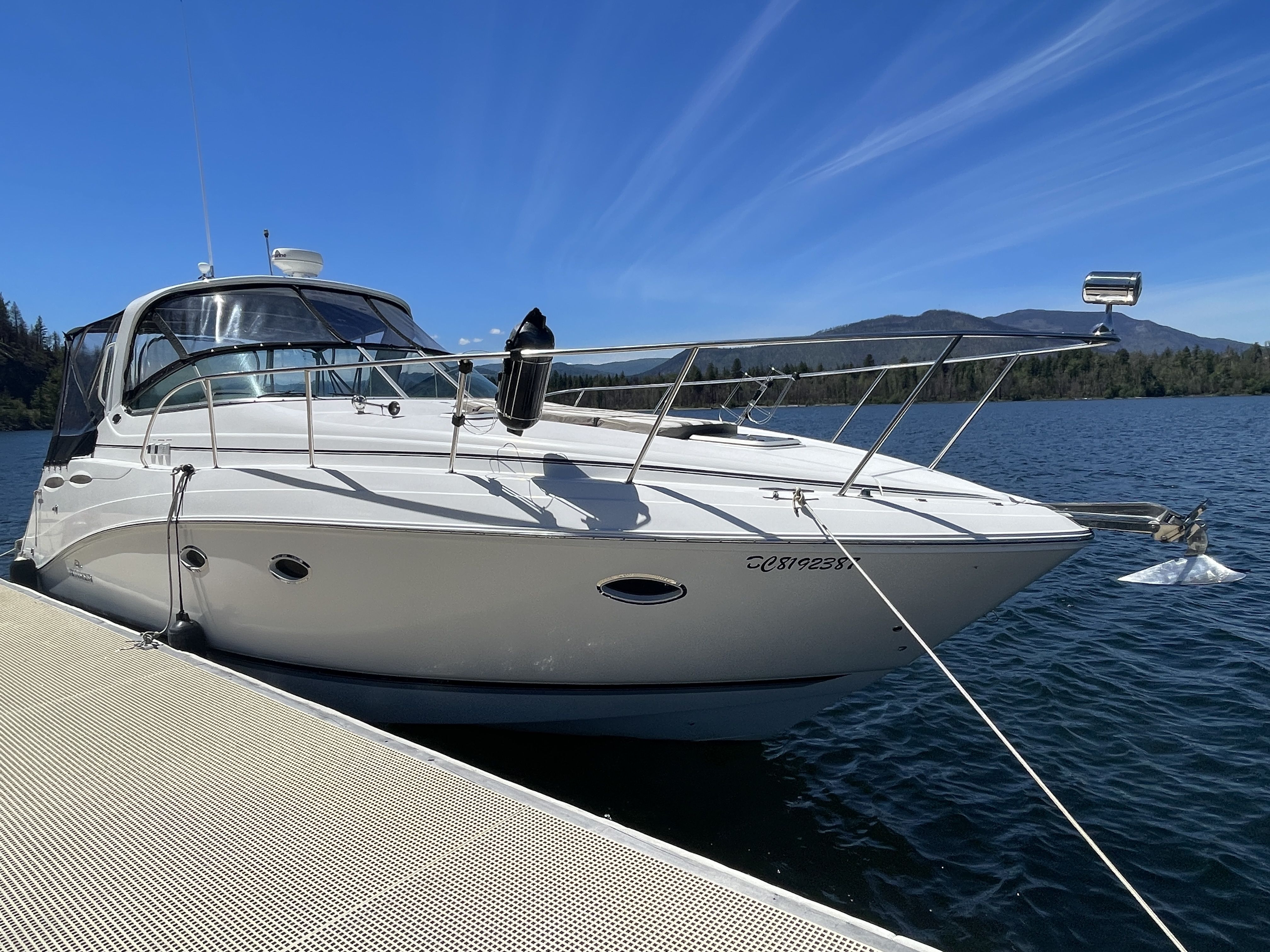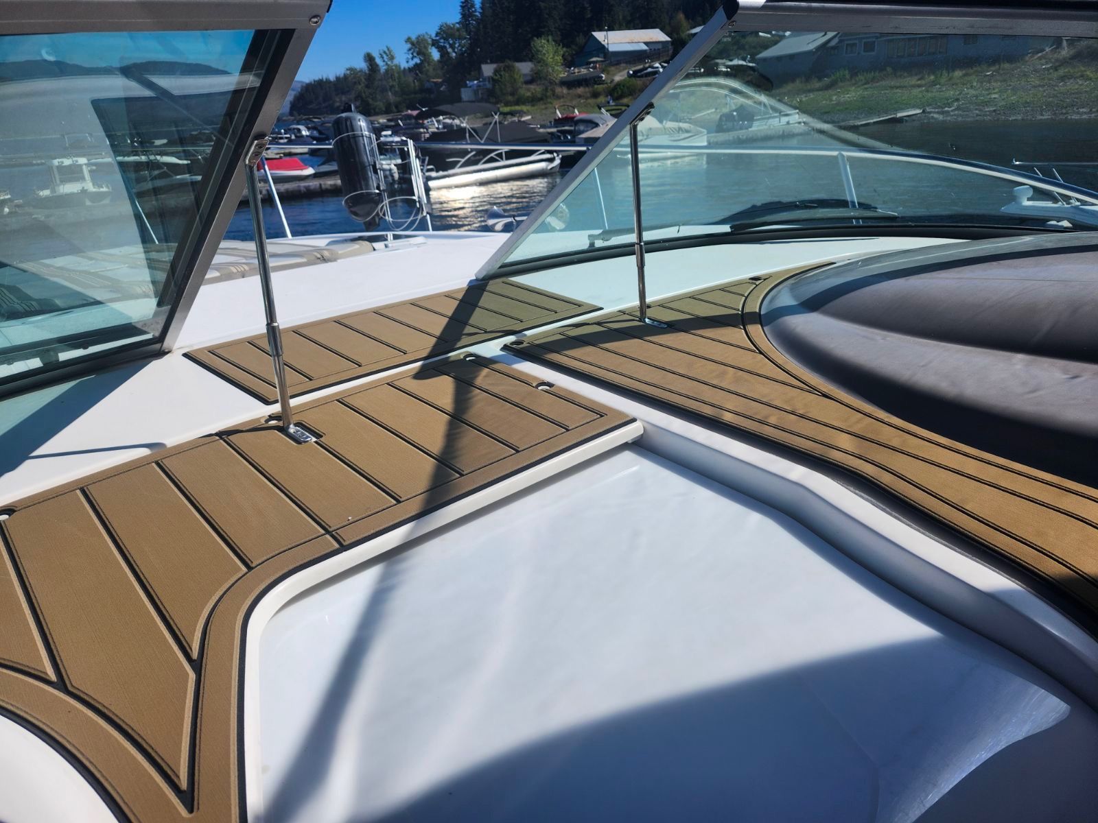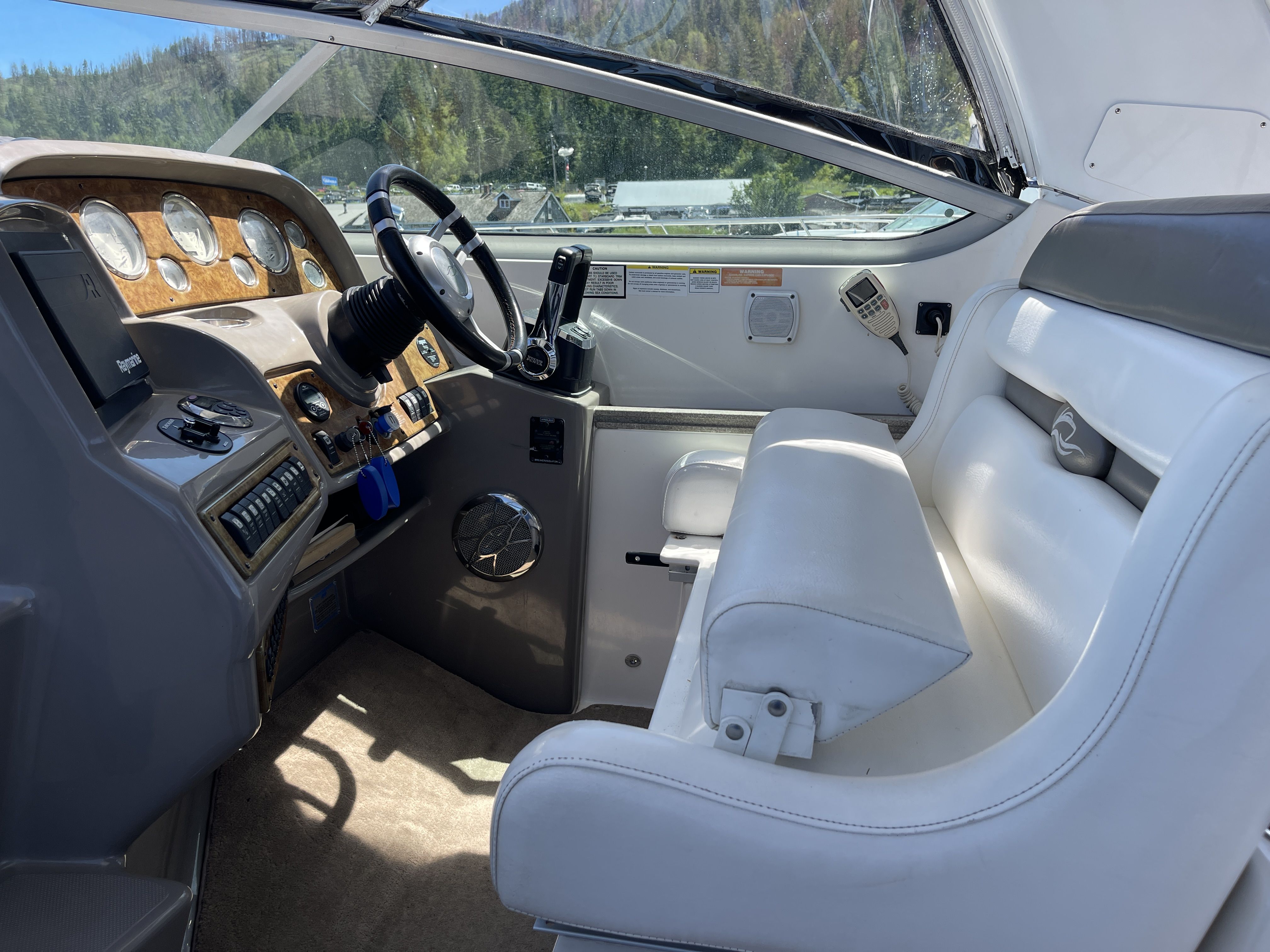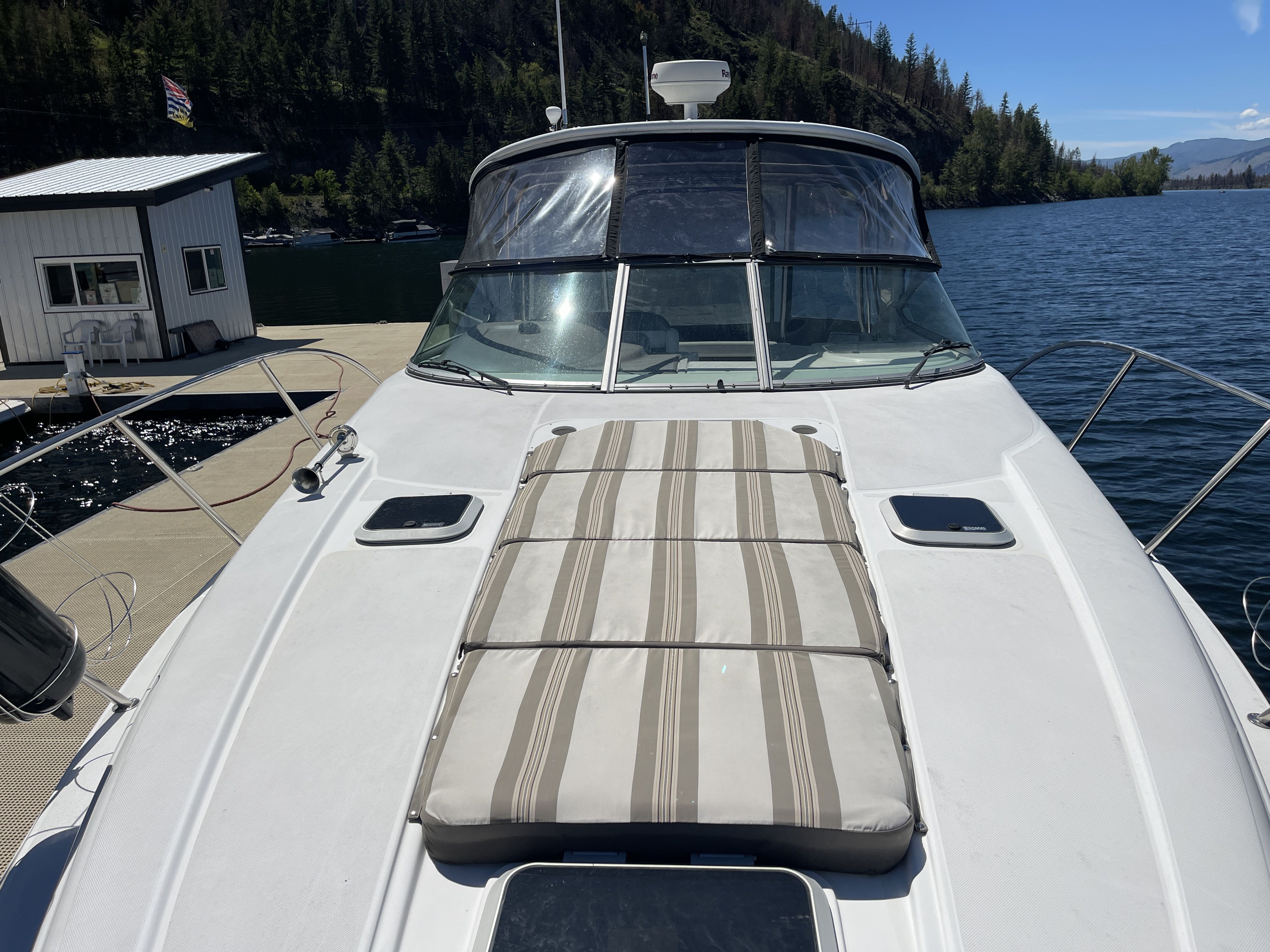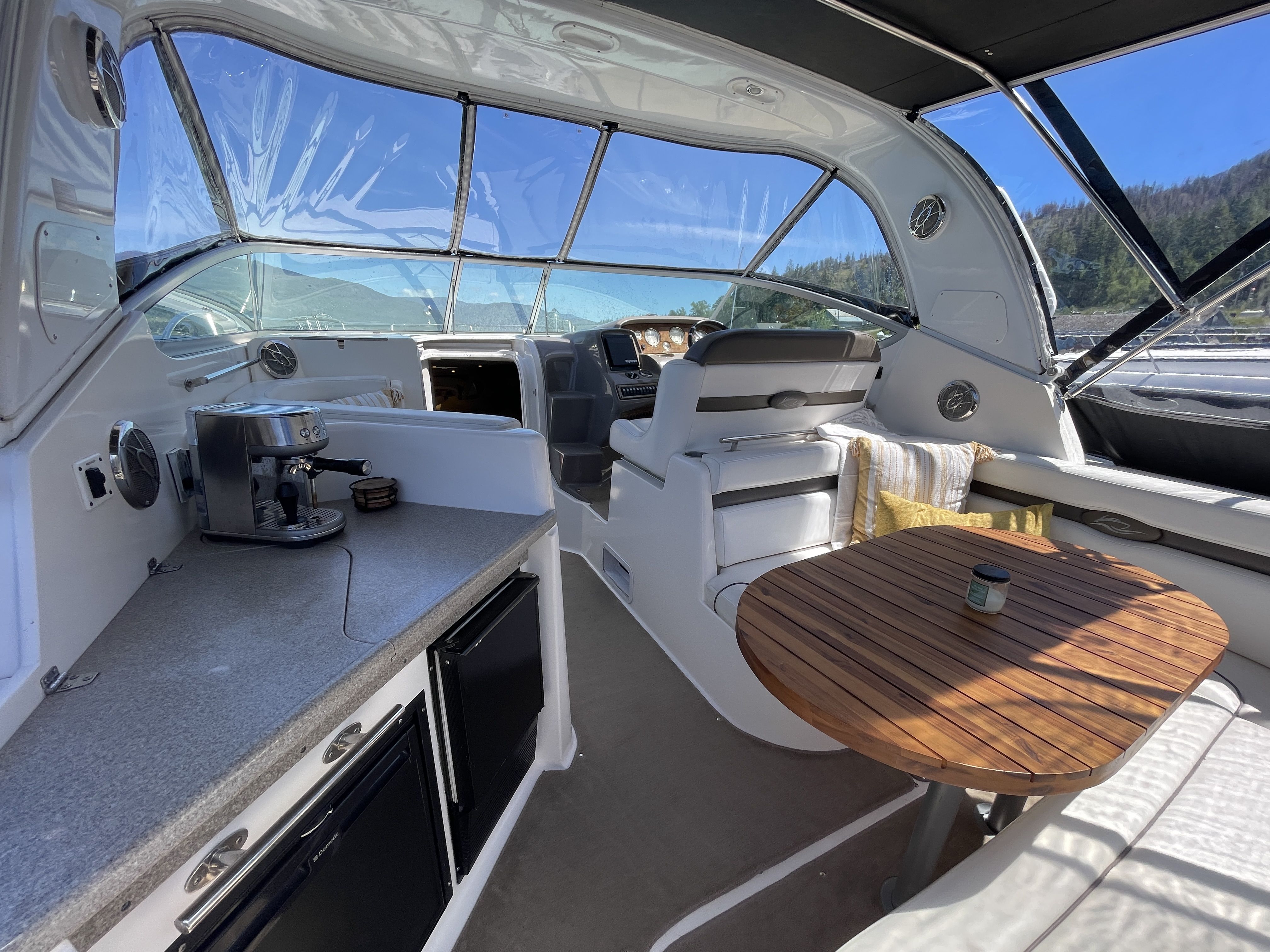 This 2007 Rinker 350 Express Cruiser is powered by twin Volvo Penta 5.7L GXi engines with 380-P/390- STBD hours, and a Kohler generator with 550 hours. The boat is equipped with Volvo Ocean X Dual Prop drives that were installed new 3 years ago. The Rinker 350 offers a unique layout both above and below deck. For entertaining the cockpit has Ultradeck flooring(NEW 2024), the cockpit is enclosed with a full Camper Package(New vinyl 2024) and includes a large U-shaped seat that converts to an aft sunbed, a wet bar with 2 fridges, blender and sink. The helm is equipped with a 7" Raymarine Touchscreen GPS, Raymarine Radar and Standard Horizon VHF. Out back you have an integral swim grid with Ultradeck flooring(New 2024), Transom Seat, Kuuma SS BBQ. NEW(2025) 2000 Watt Xantrex Inverter Charger w/ 4 NEW Discovery AGM 6 volt 390 Amp/hour/each house batteries