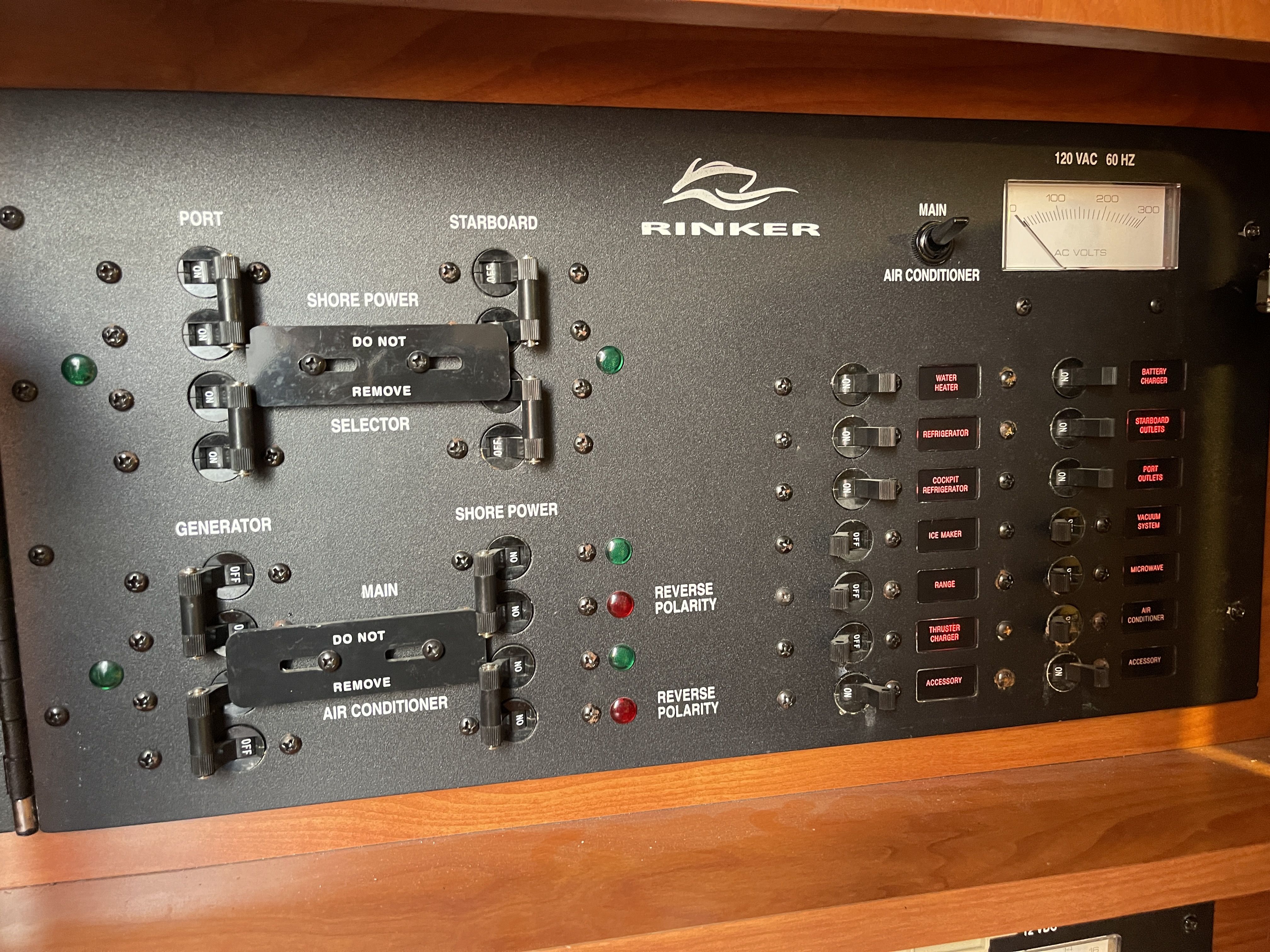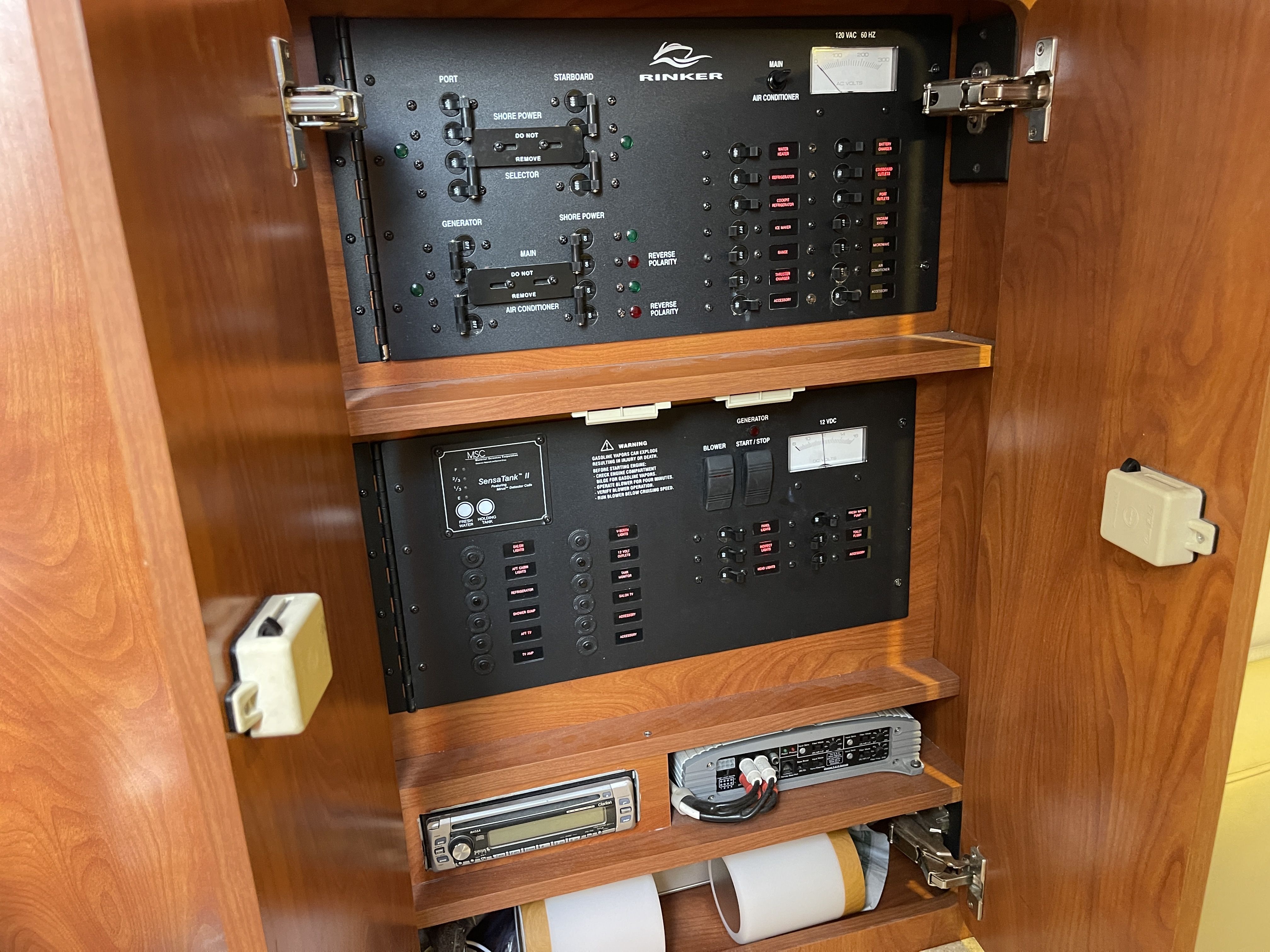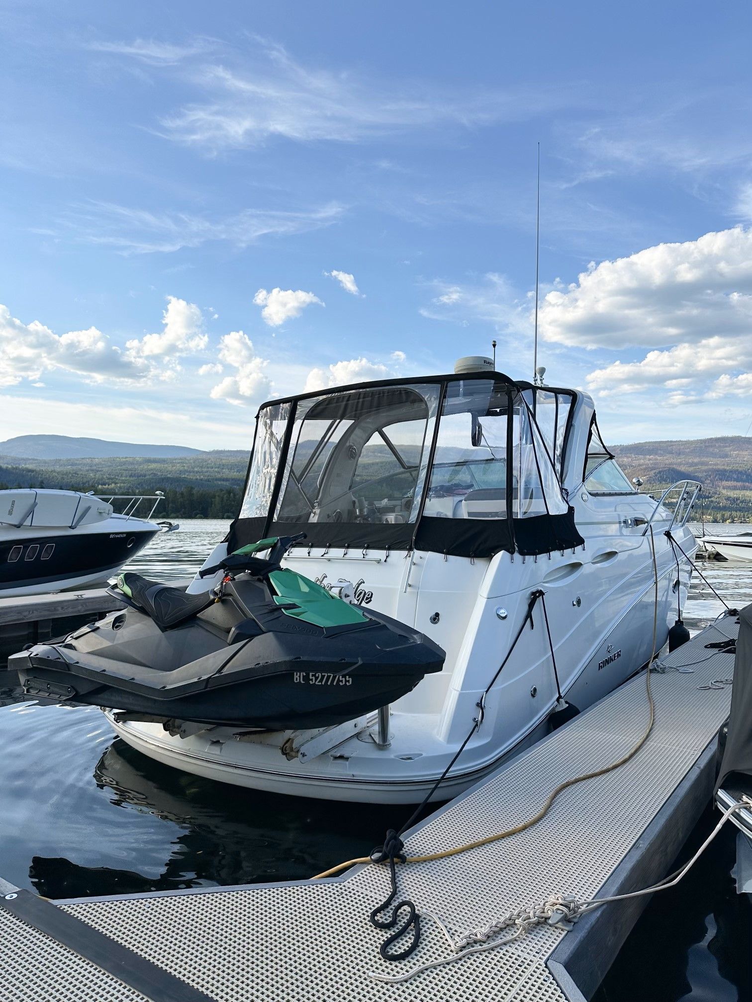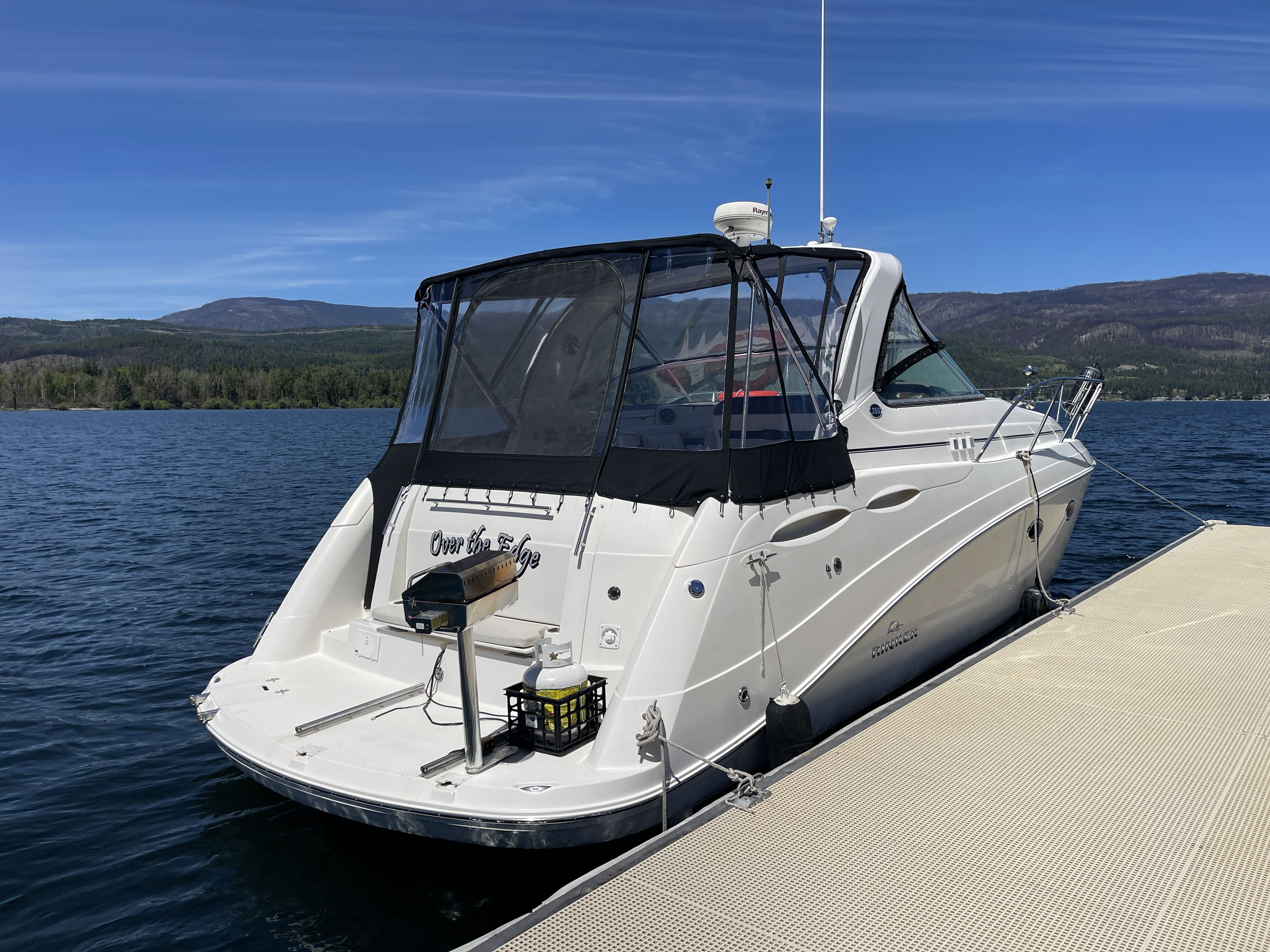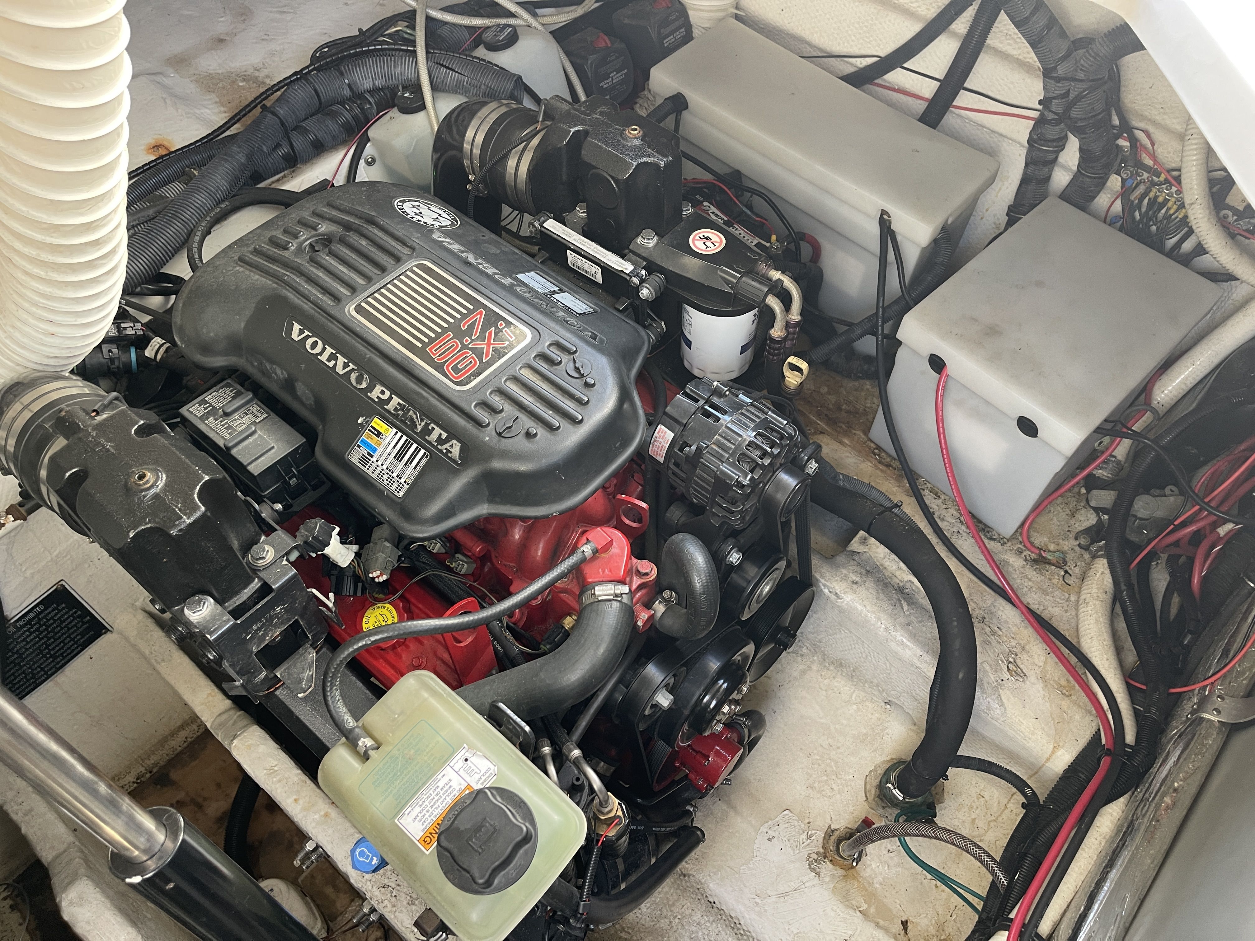 This 2007 Rinker 350 Express Cruiser is powered by twin Volvo Penta 5.7L GXi engines with 380-P/390- STBD hours, and a Kohler generator with 550 hours. The boat is equipped with Volvo Ocean X Dual Prop drives that were installed new 3 years ago. The Rinker 350 offers a unique layout both above and below deck. For entertaining the cockpit has Ultradeck flooring(NEW 2024), the cockpit is enclosed with a full Camper Package(New vinyl 2024) and includes a large U-shaped seat that converts to an aft sunbed, a wet bar with 2 fridges, blender and sink. The helm is equipped with a 7" Raymarine Touchscreen GPS, Raymarine Radar and Standard Horizon VHF. Out back you have an integral swim grid with Ultradeck flooring(New 2024), Transom Seat, Kuuma SS BBQ. NEW(2025) 2000 Watt Xantrex Inverter Charger w/ 4 NEW Discovery AGM 6 volt 390 Amp/hour/each house batteries