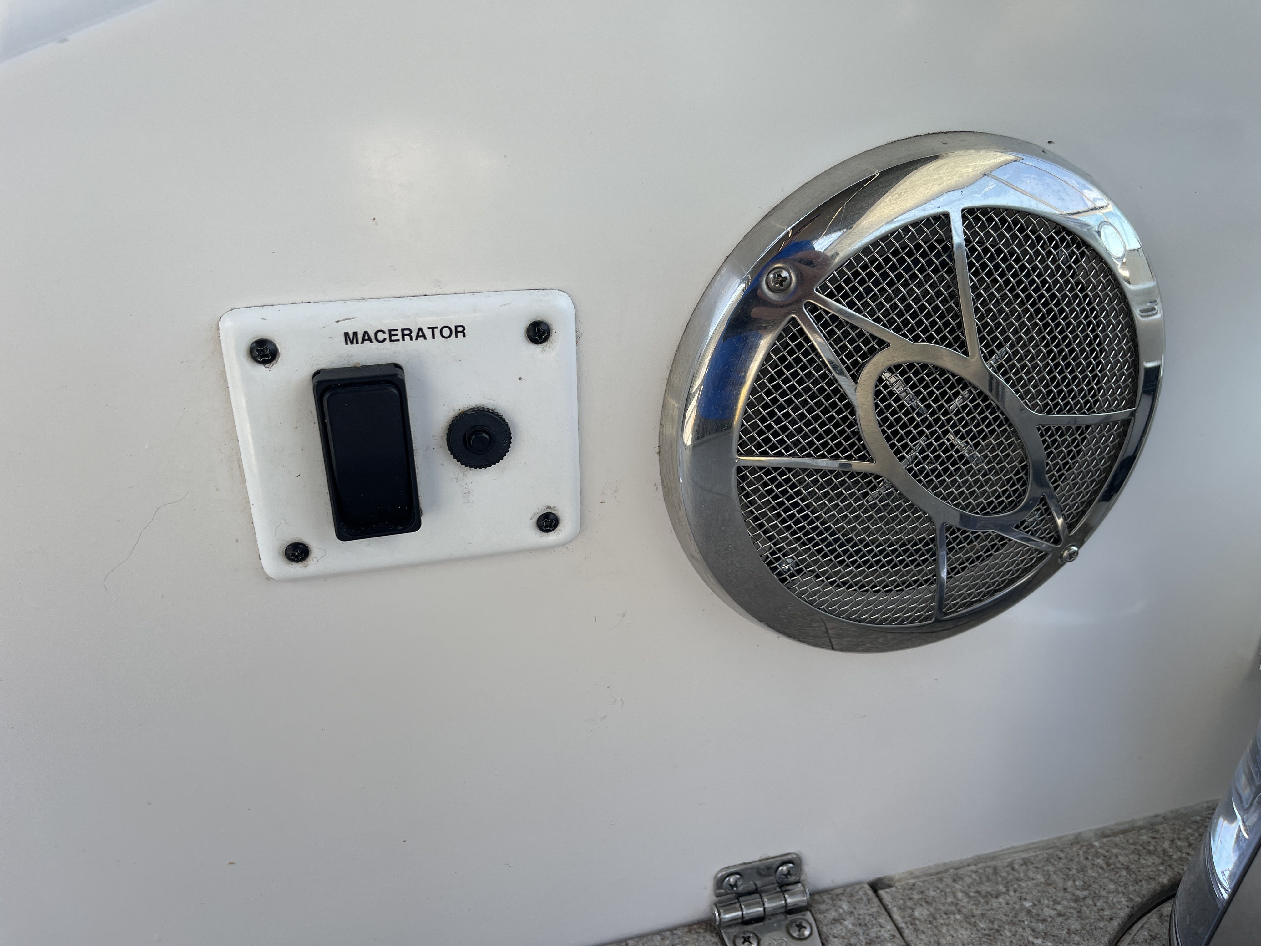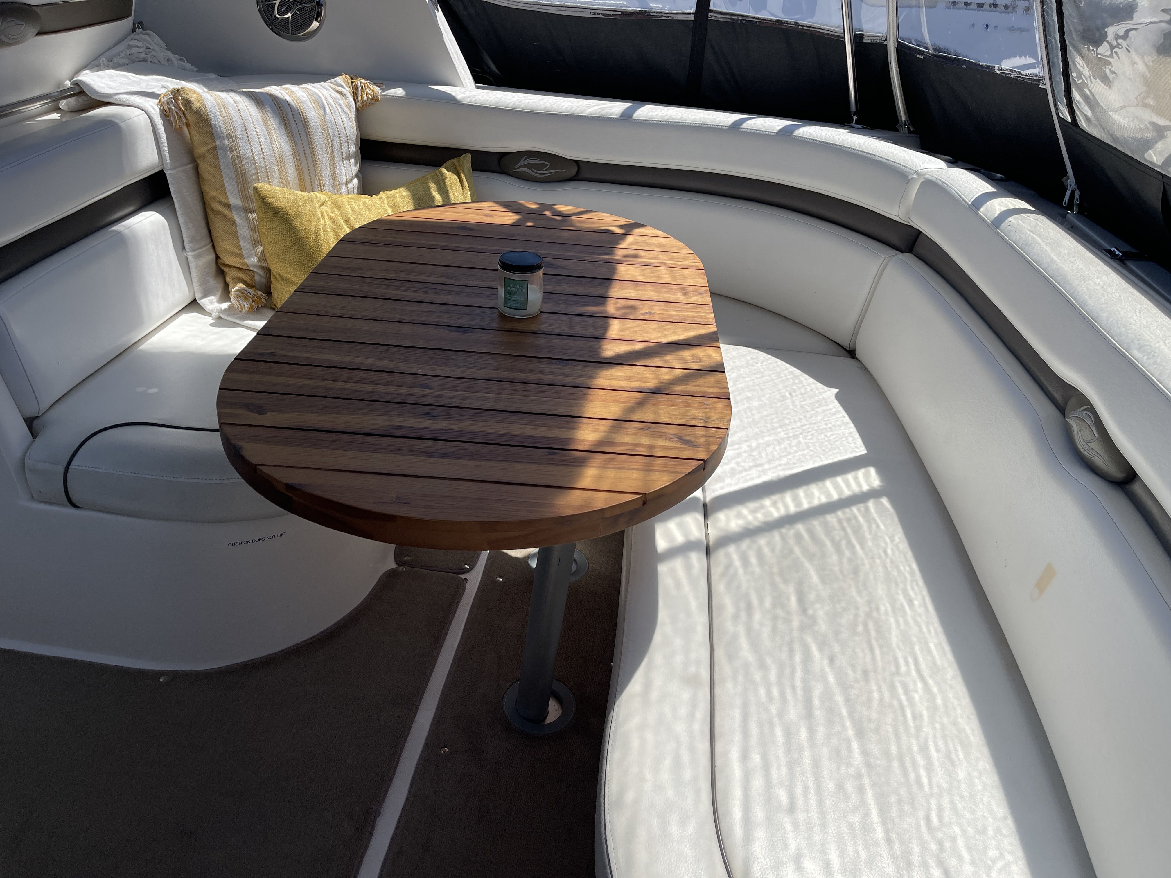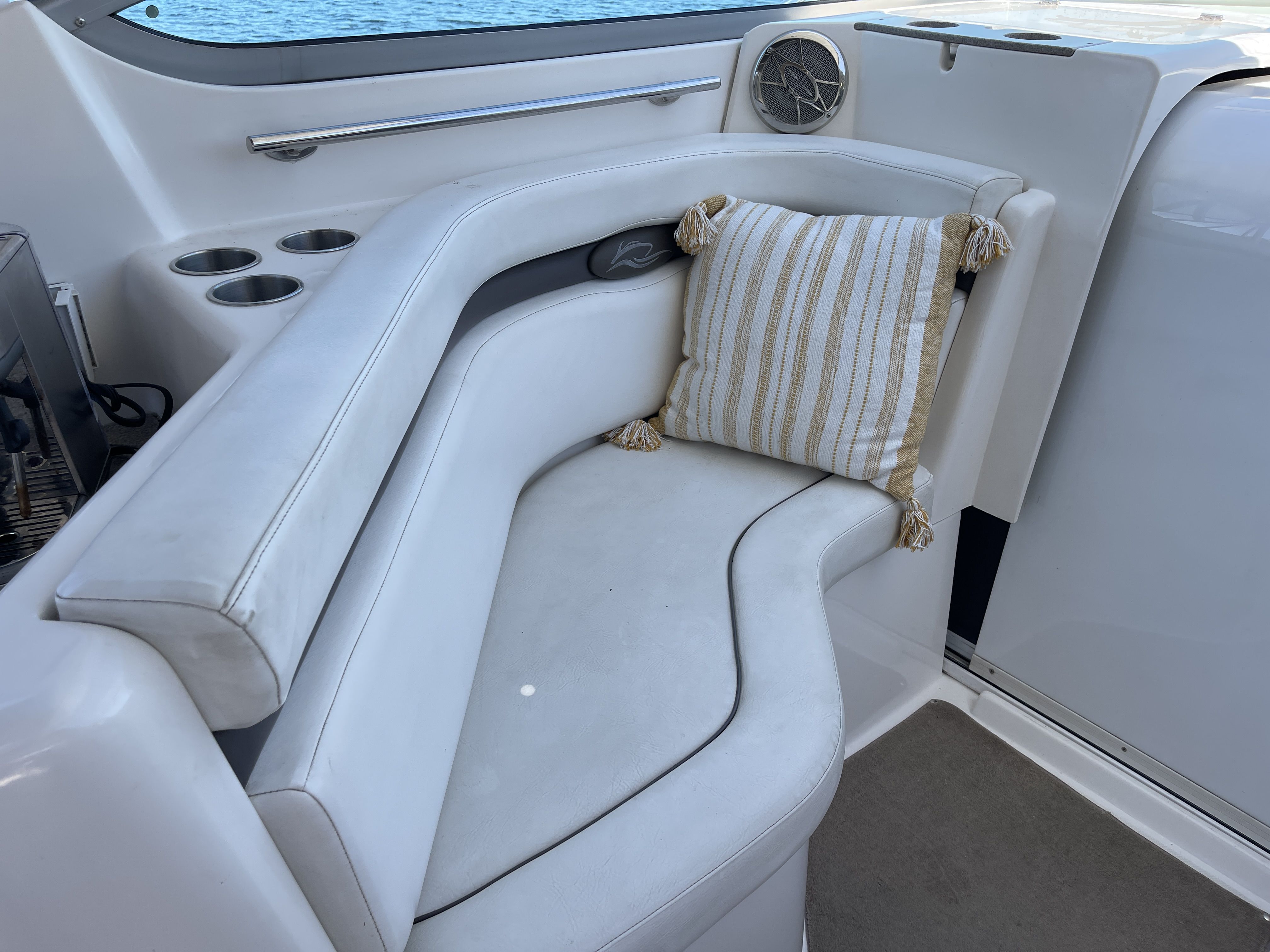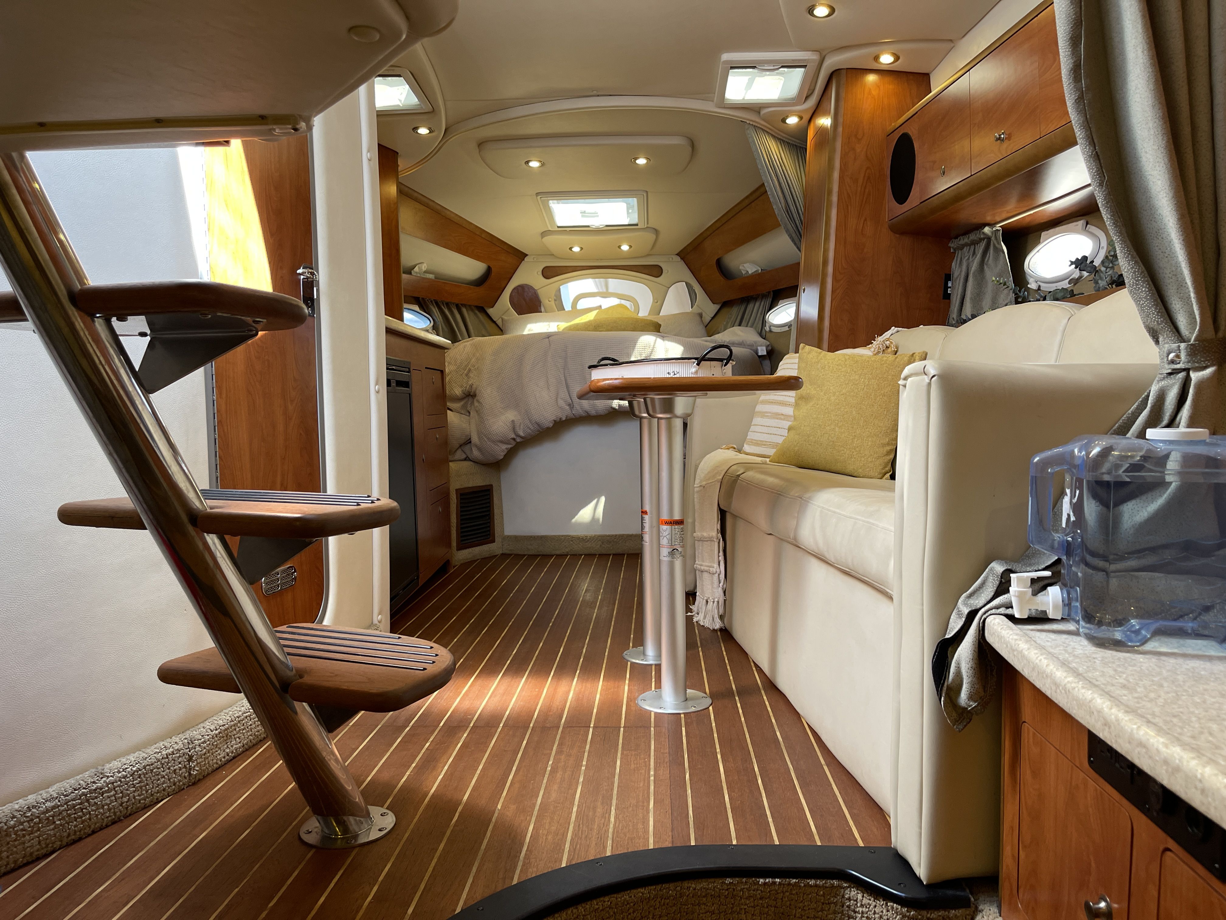 Below deck this boat offers a great layout and plenty of options. The cabin is equipped with AC/Heat, finished with cherry wood cabinets and beautiful teak & holly flooring. The salon area has a large 3-seat sofa that converts to a double bed for sleeping. The galley is equipped with a sink, 2-burner stove, refrigerator, microwave oven with coffee maker, and flatscreen TV. The forward v-berth has a large centerline queen-size bed. The aft U-shaped lounge converts to a double berth as well. The head is equipped with a vacuflush toilet and separate shower.