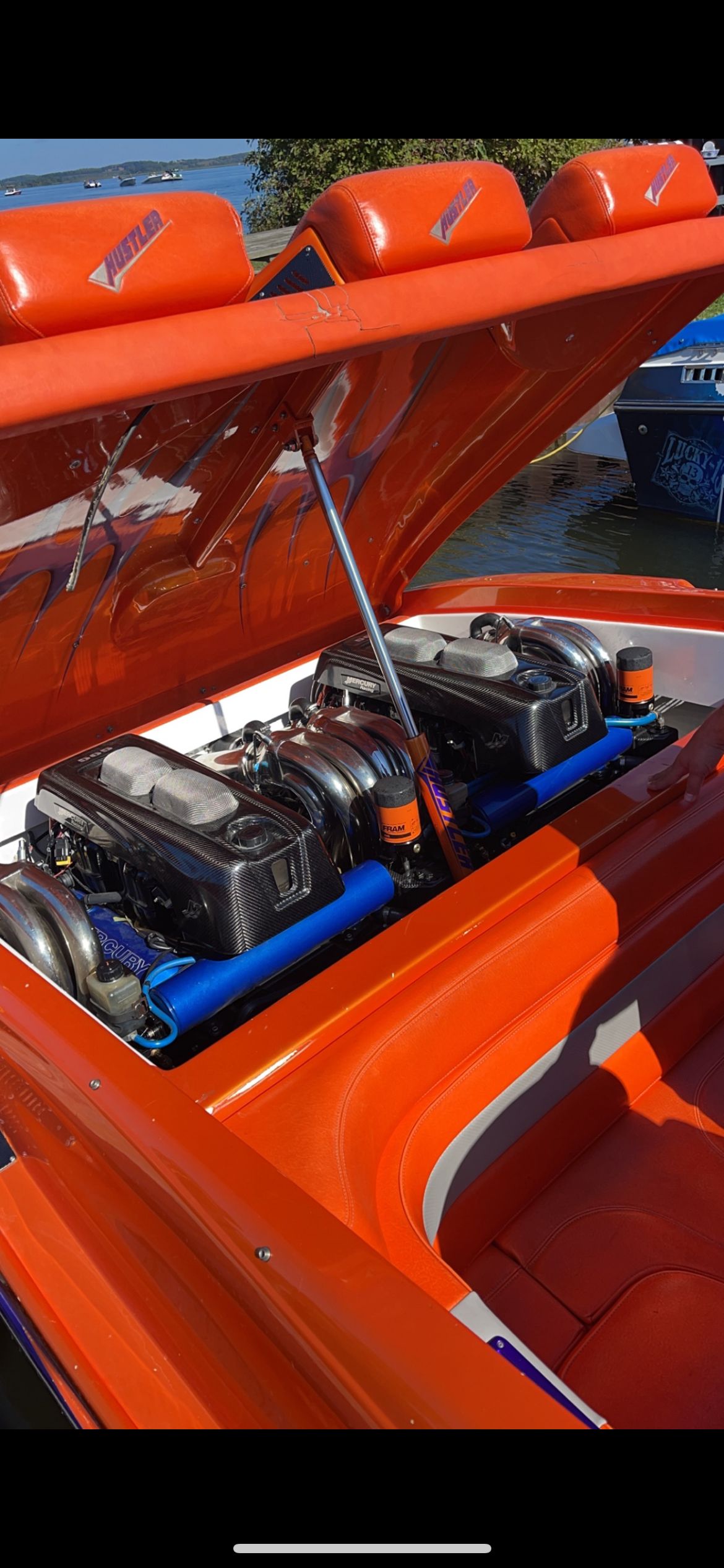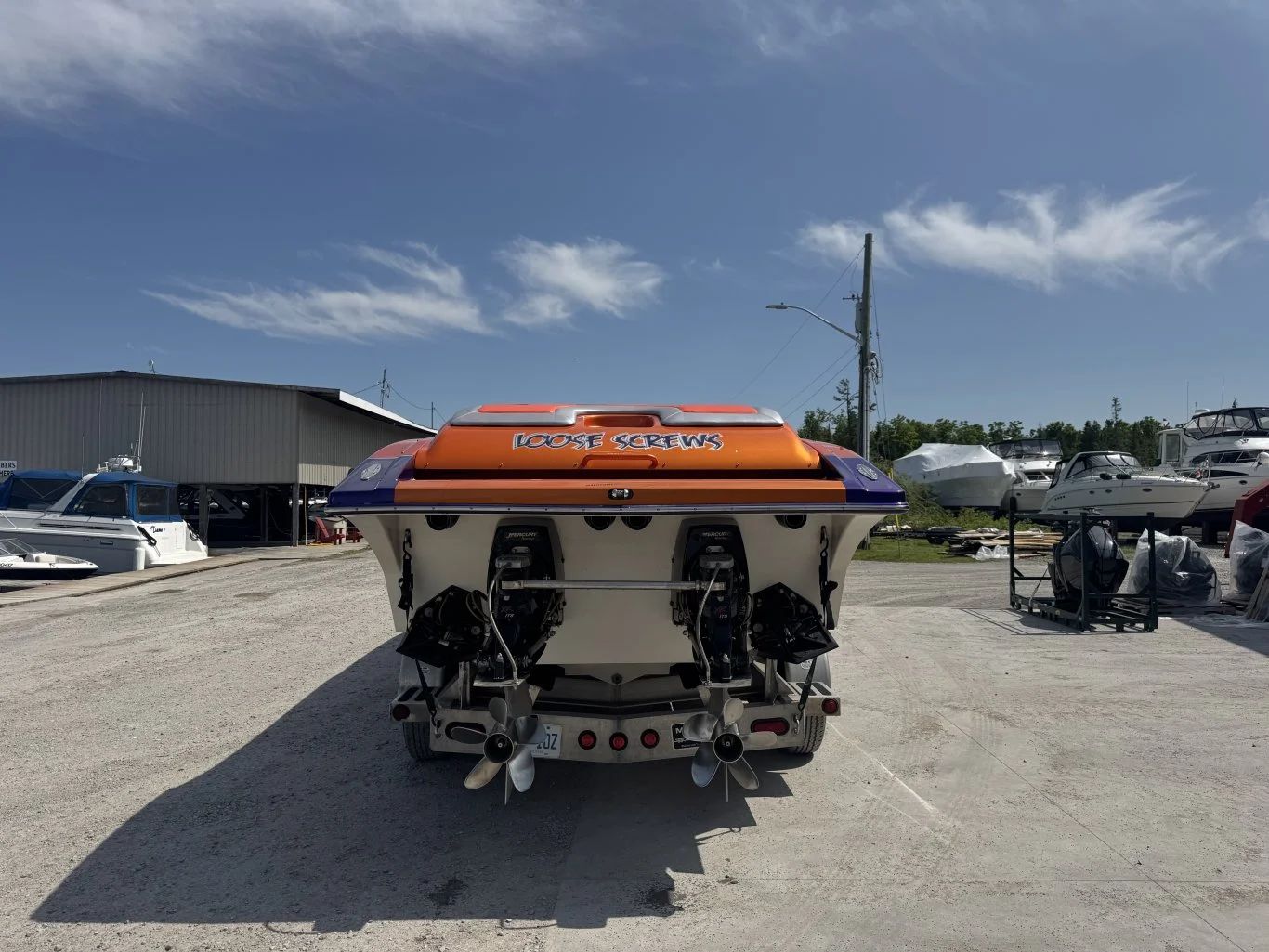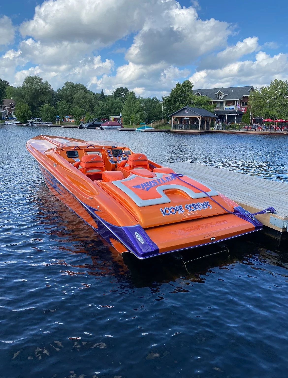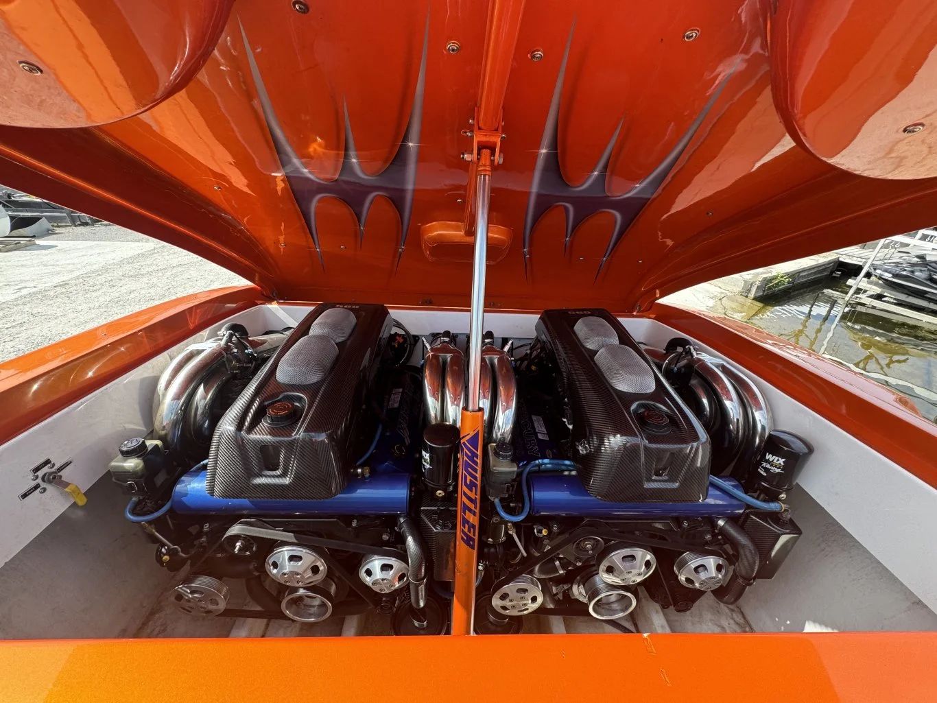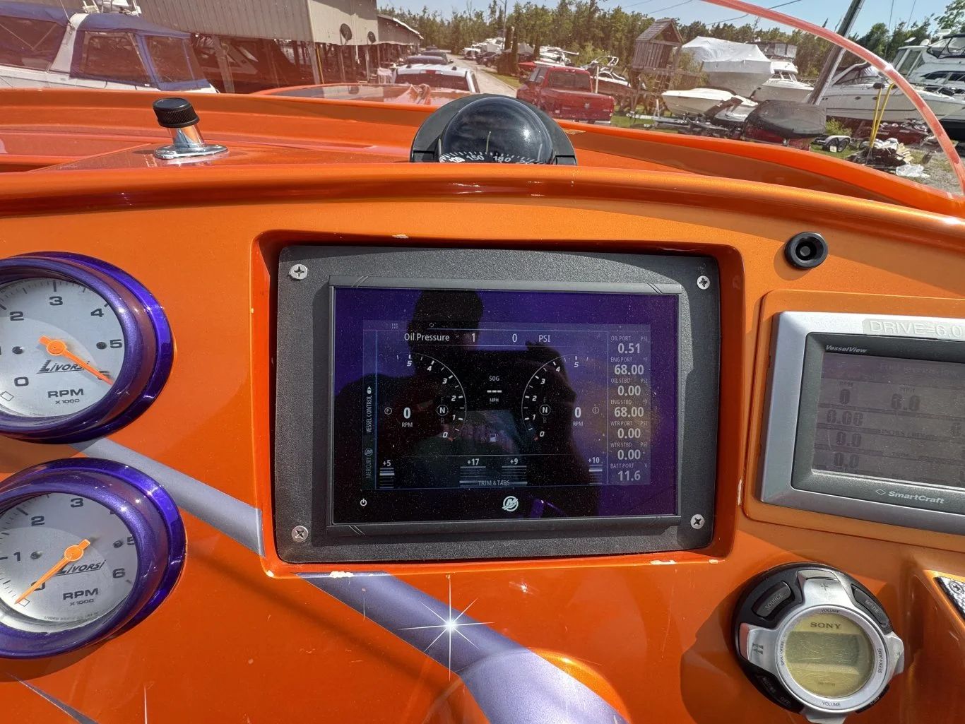A complete custom interior refit, brand-new VesselView displays, and fully rebuilt drives and engines elevate this Cheetah well beyond a typical production example. Finished in striking Lamborghini Orange with purple graphics, the boat commands attention at every dock, poker run, or performance event.