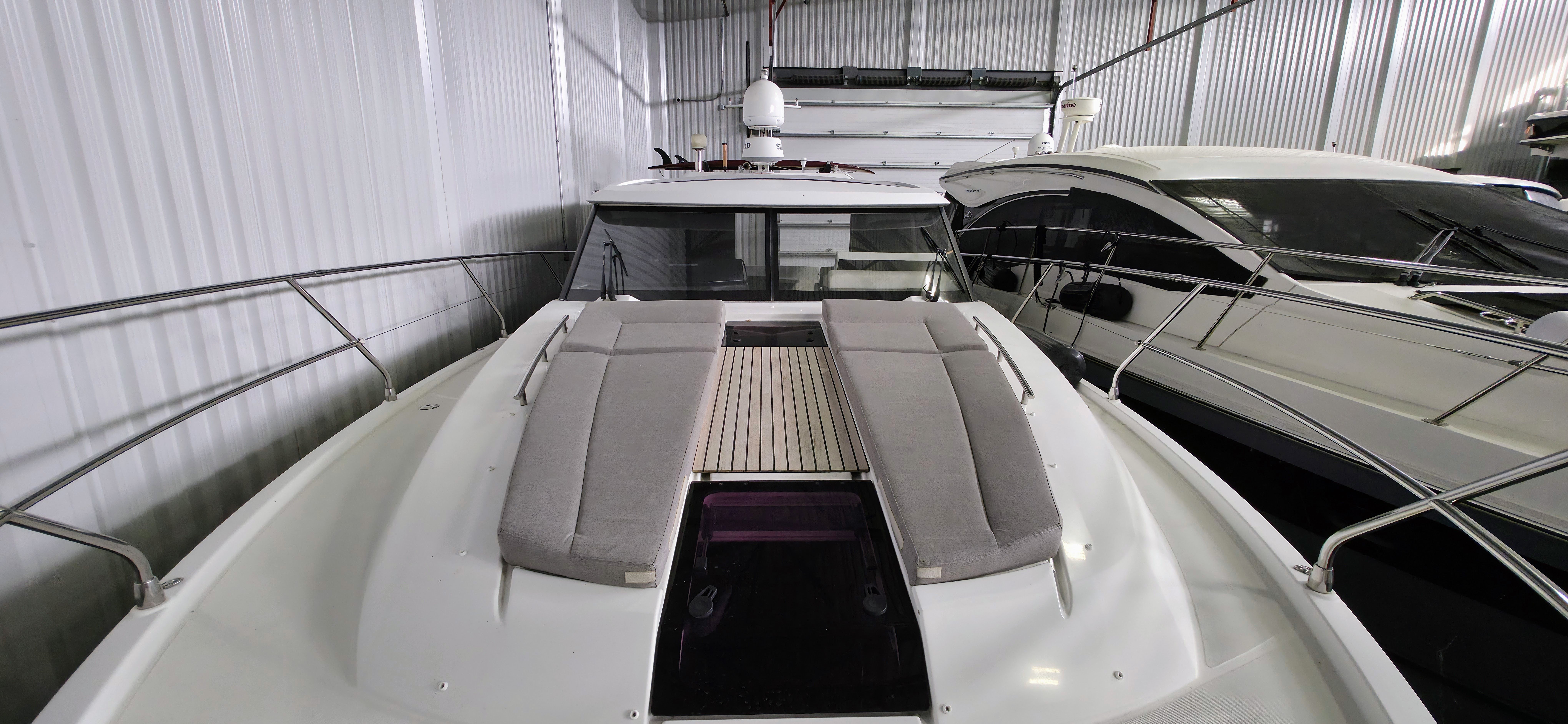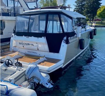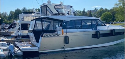 This 2014 Jeanneau NC 14 has seen only freshwater use and has been stored indoors every winter. Powered by twin Volvo Penta IPS 500 pod drives with joystick control, it's easy to maneuver and efficient underway. This vessel features two private cabins, a bright salon with large sliding doors and sunroofs, generous storage, and recent upgrades include new canvas, AGM batteries, and full ceramic hull treatment. The hydraulic swim platform, cockpit grill, and EZ Rest sunpad complete a very complete and user-friendly spec.