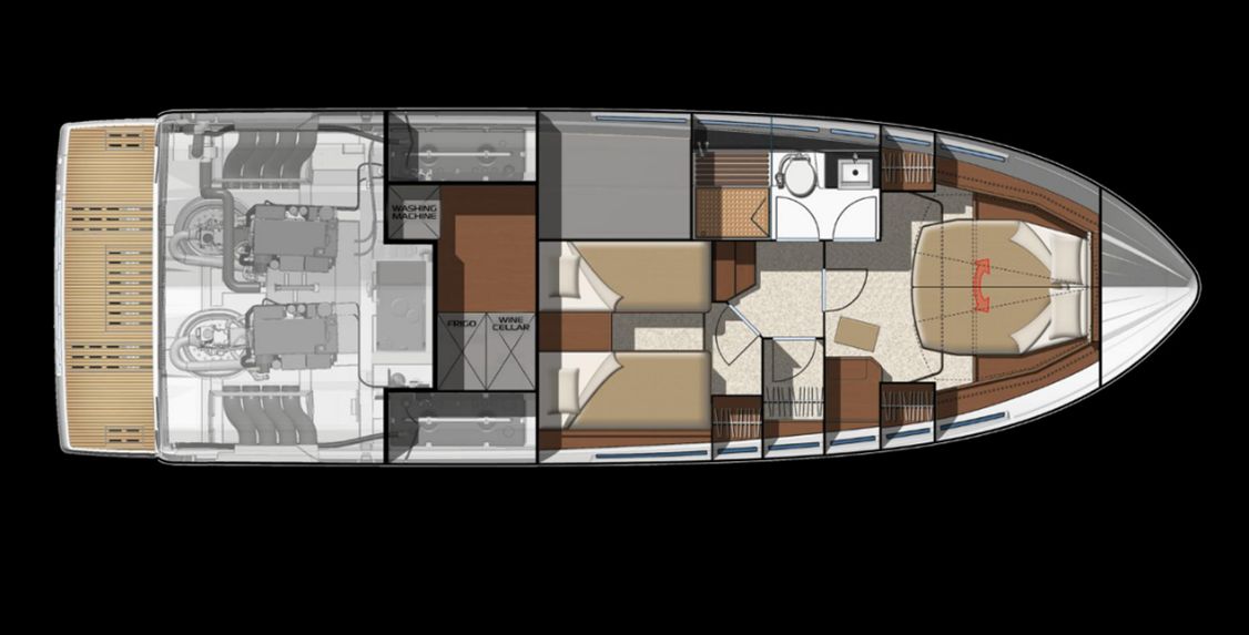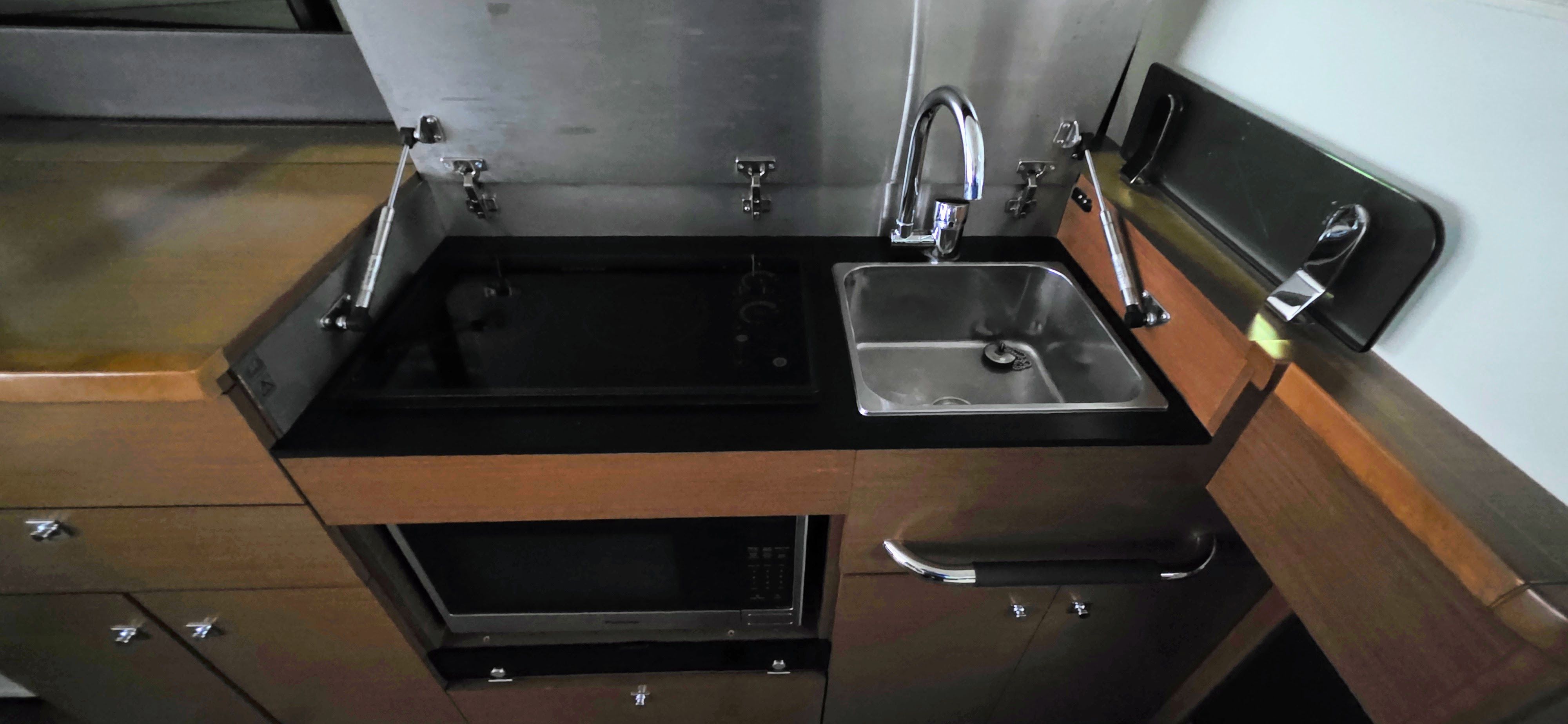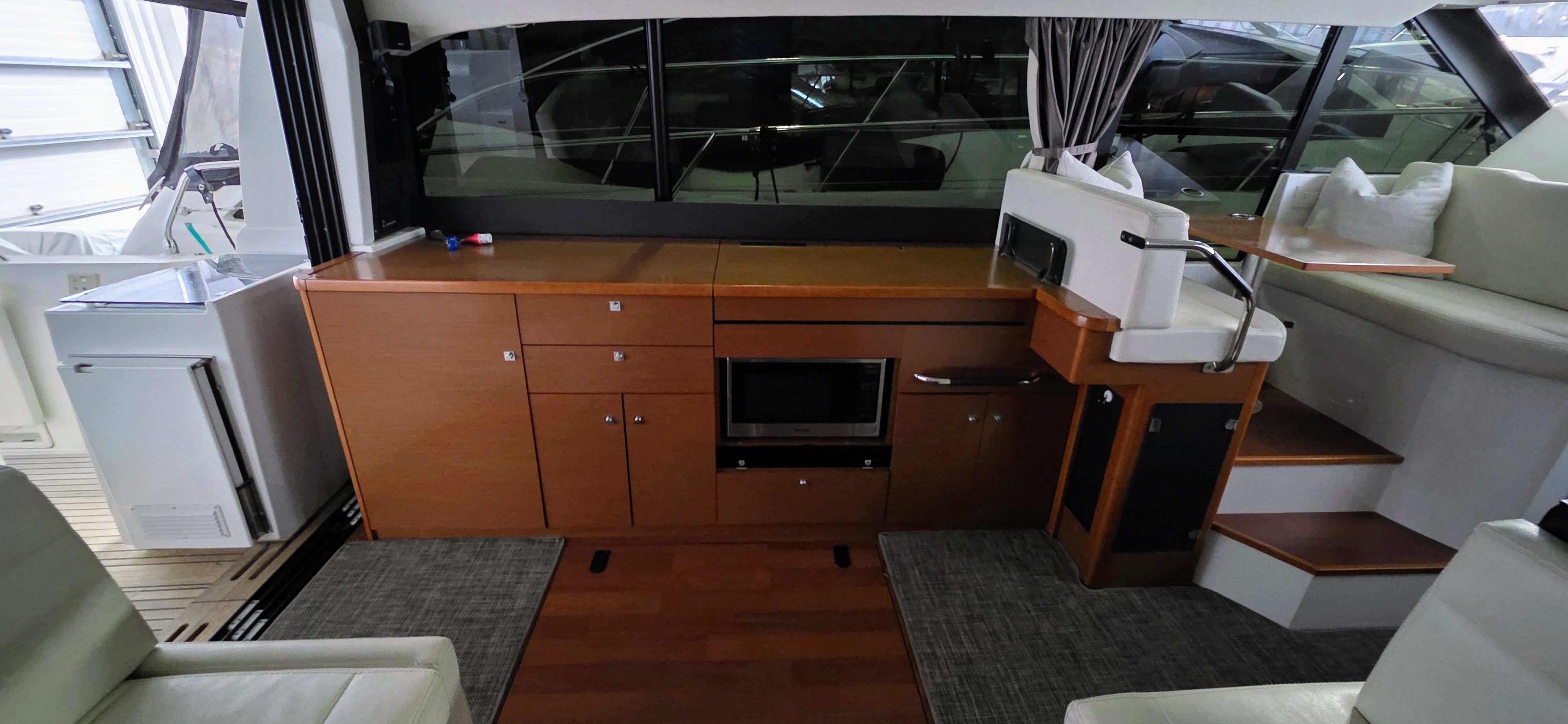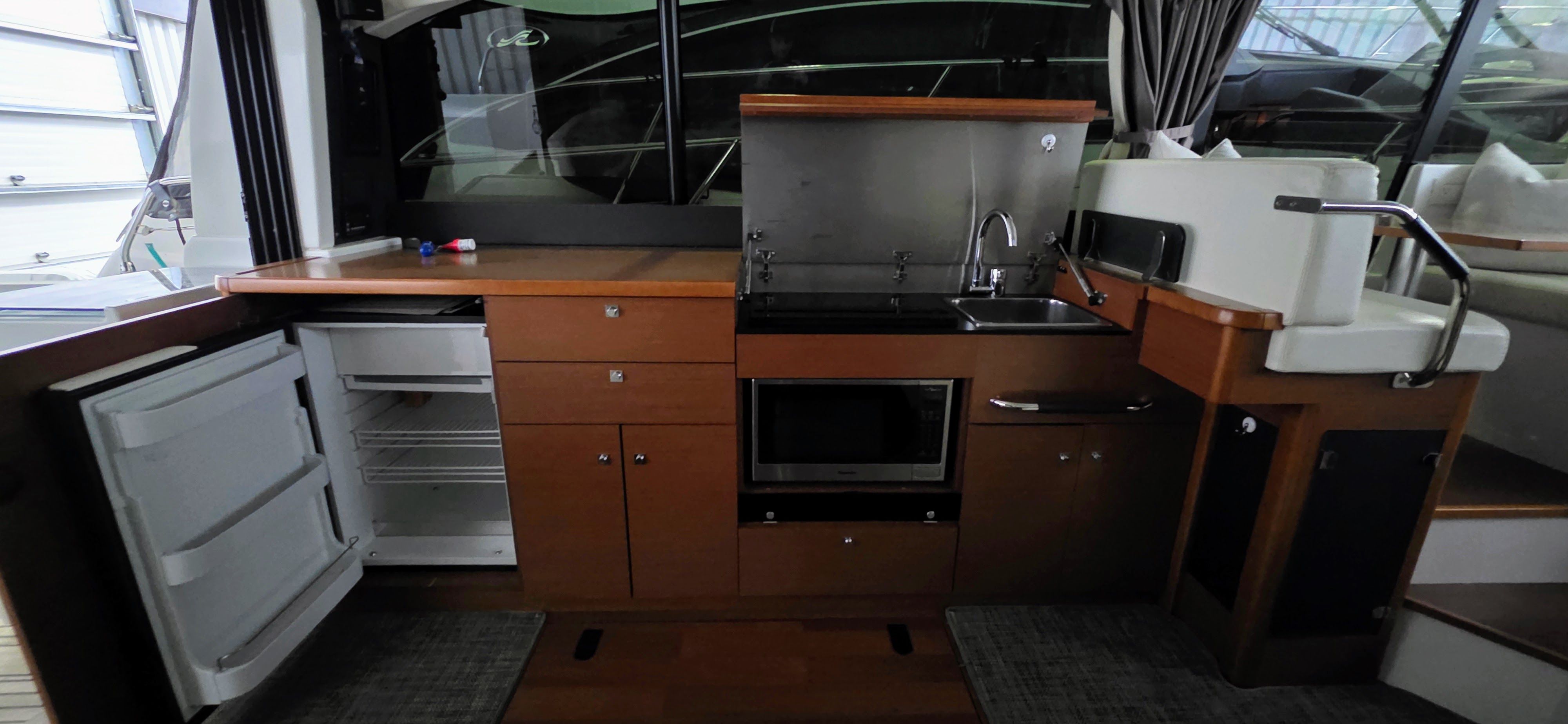 - Galley to port with fridge, microwave, sink, and storage