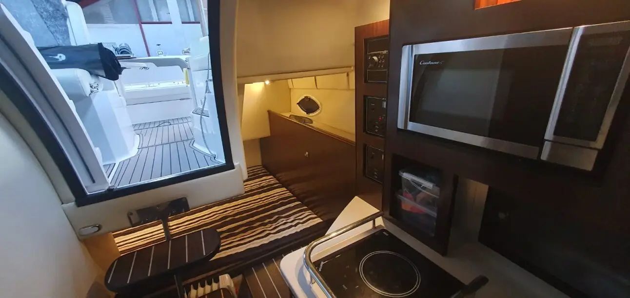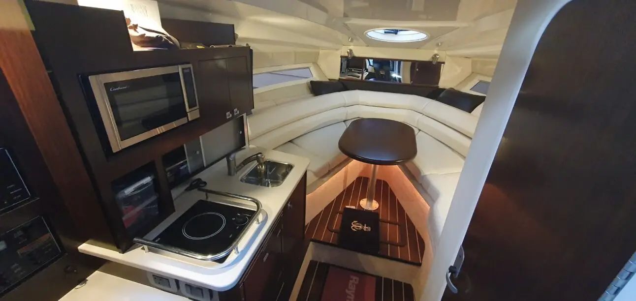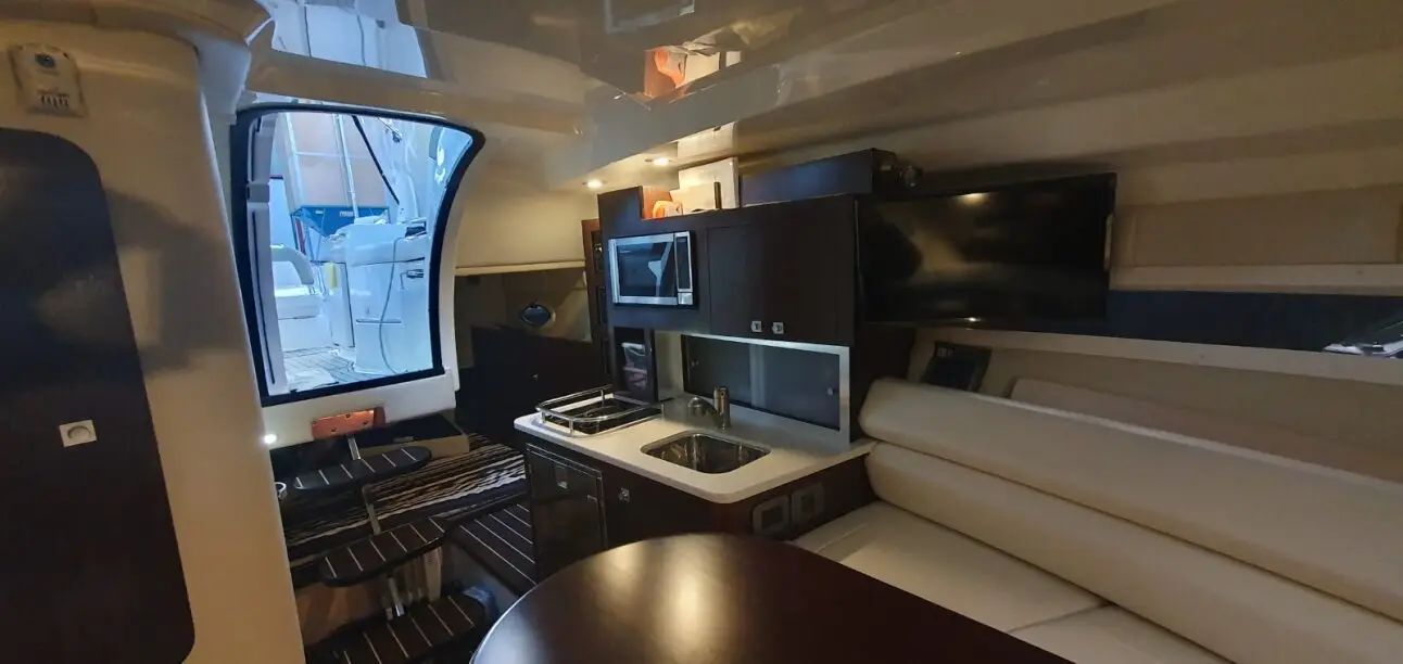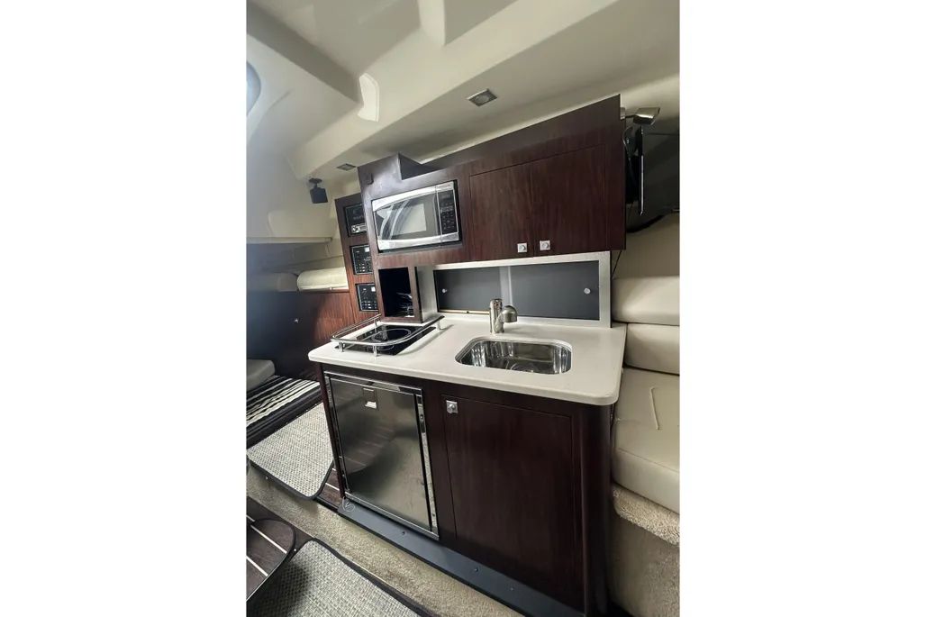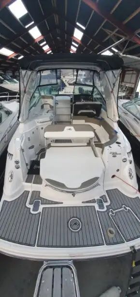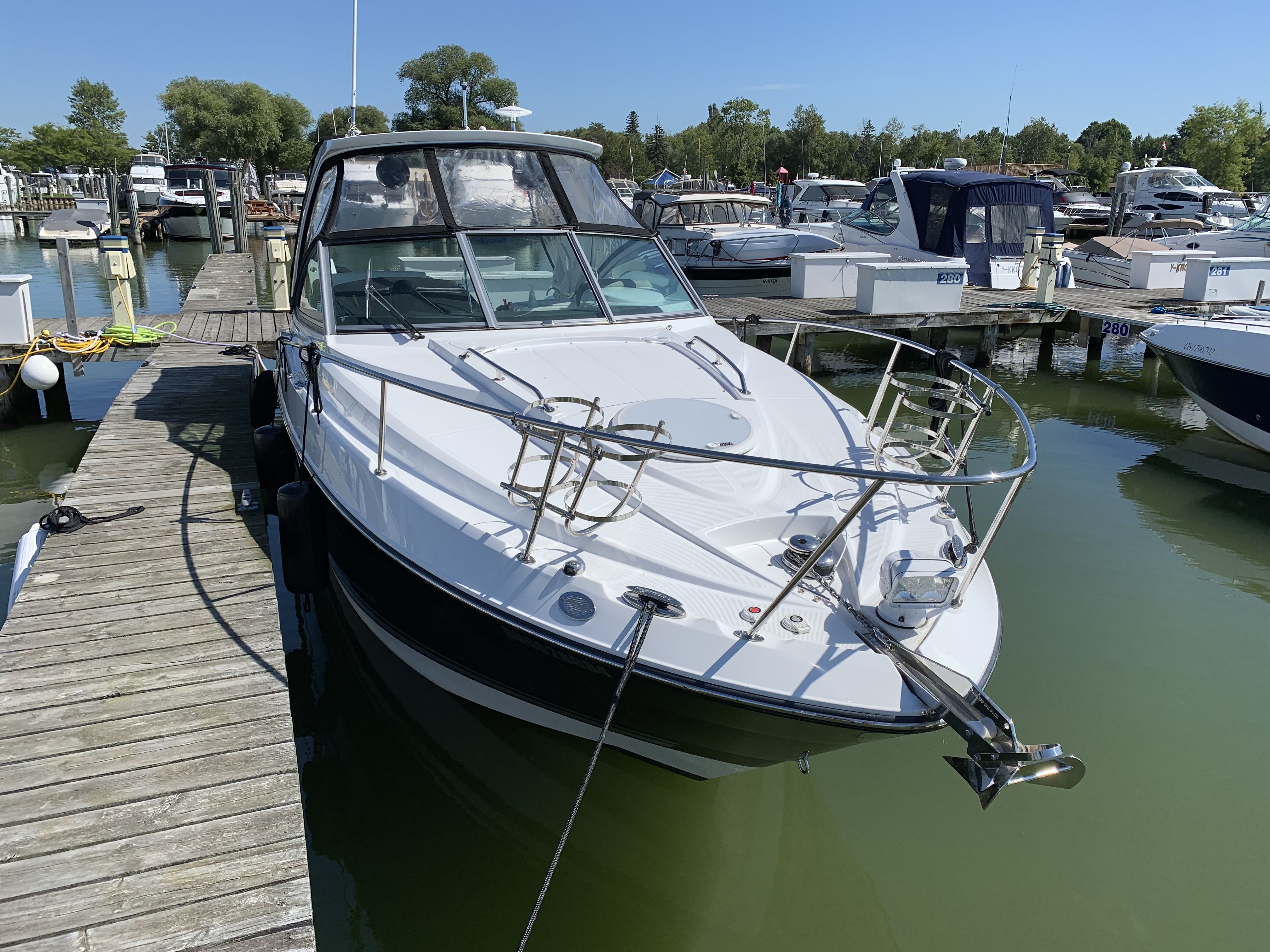 This 2017 Monterey 295 Sport Yacht is a single-owner, 100% freshwater boat with a striking black hull and full canvas cockpit enclosure with screens (black). Power is provided by an upgraded MerCruiser 8.2L Mag with low hours around 160, plus bow thruster for confident docking. Loaded with premium upgrades including Active Trim, trim tabs, windlass anchor, chart plotter, VHF radio, upgraded sound system, cockpit colour lighting, cockpit seadek flooring, underwater lighting, cockpit wet bar with fridge, air conditioner & heater, cooktop, microwave, cabin fridge, and BBQ.