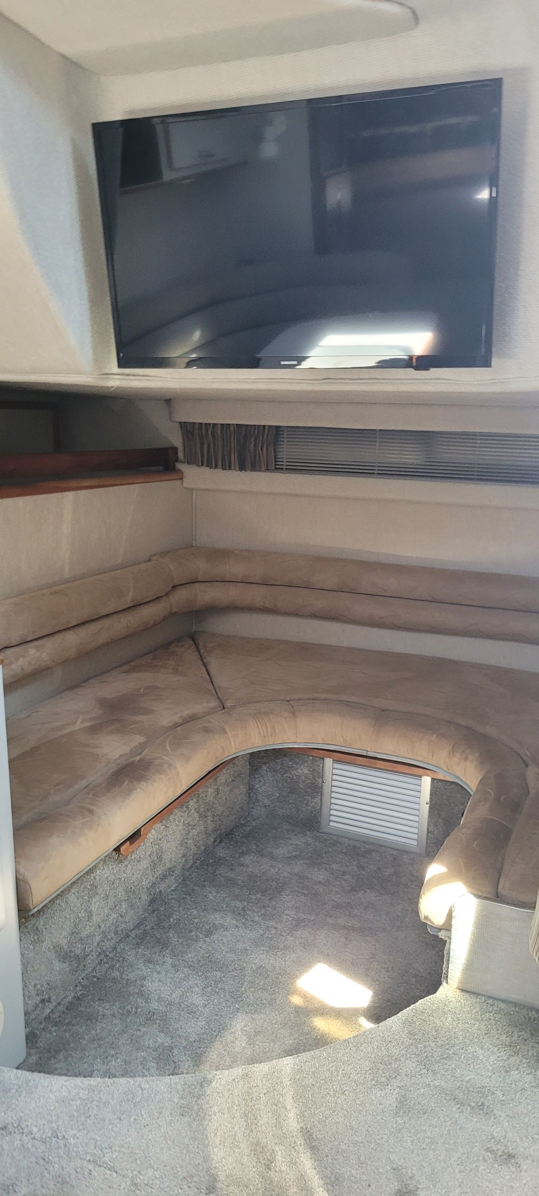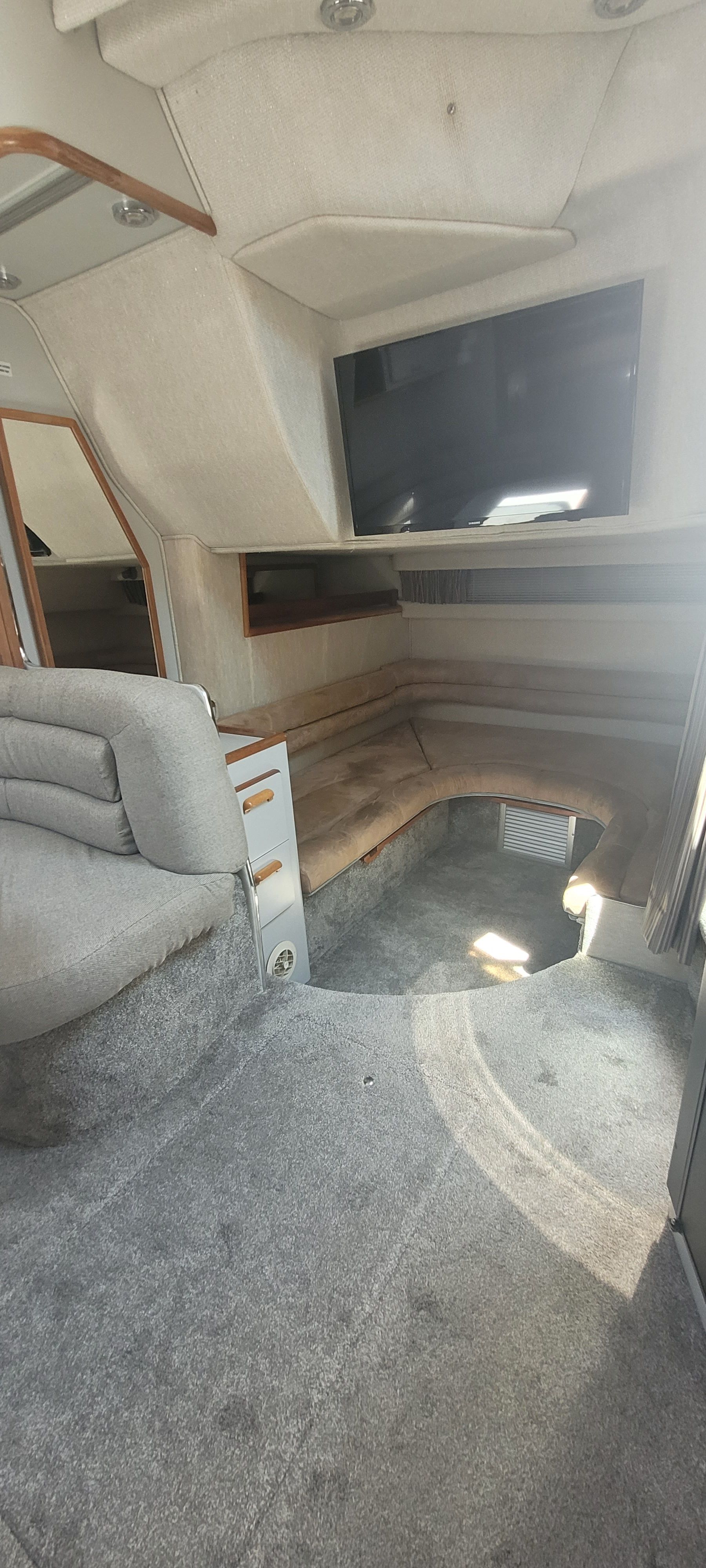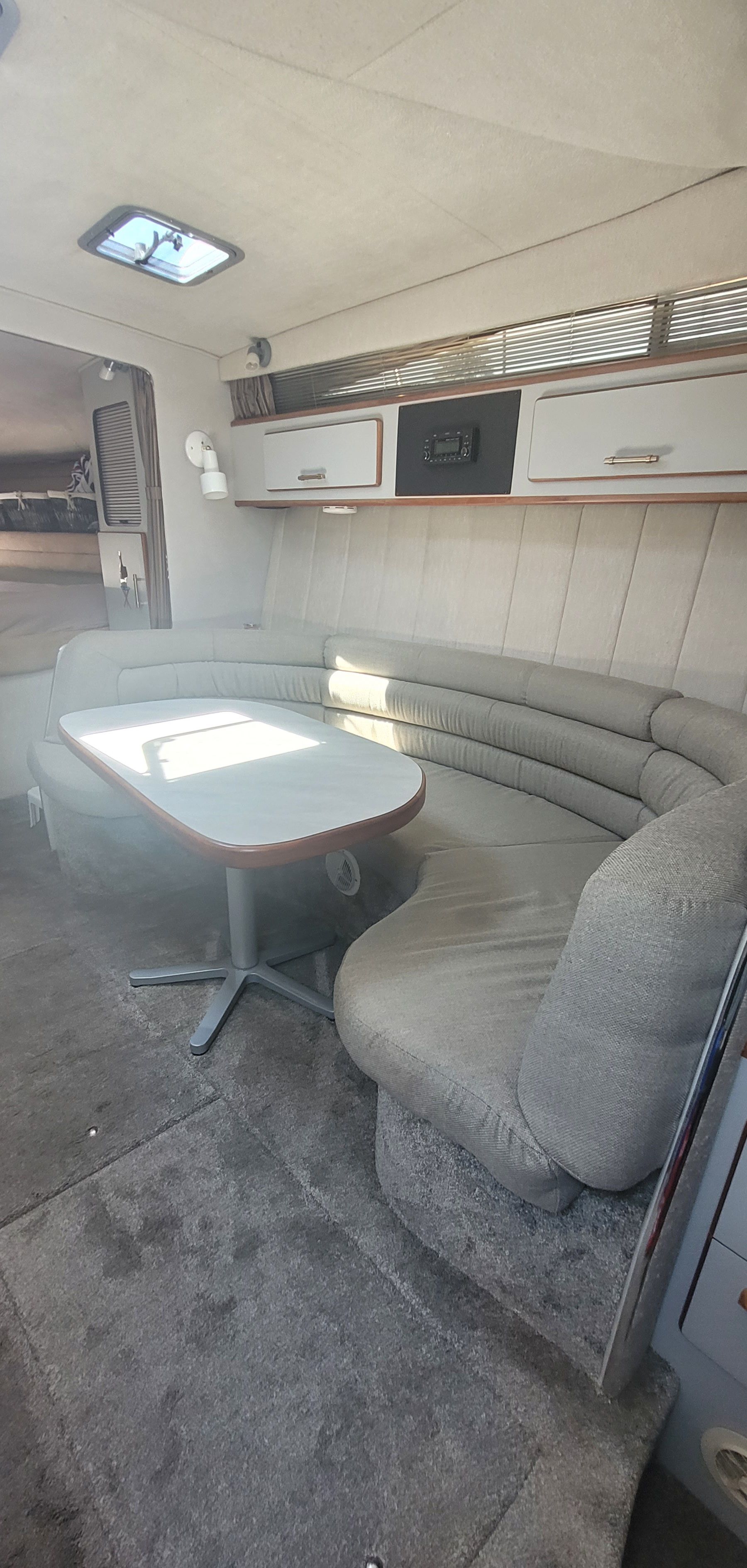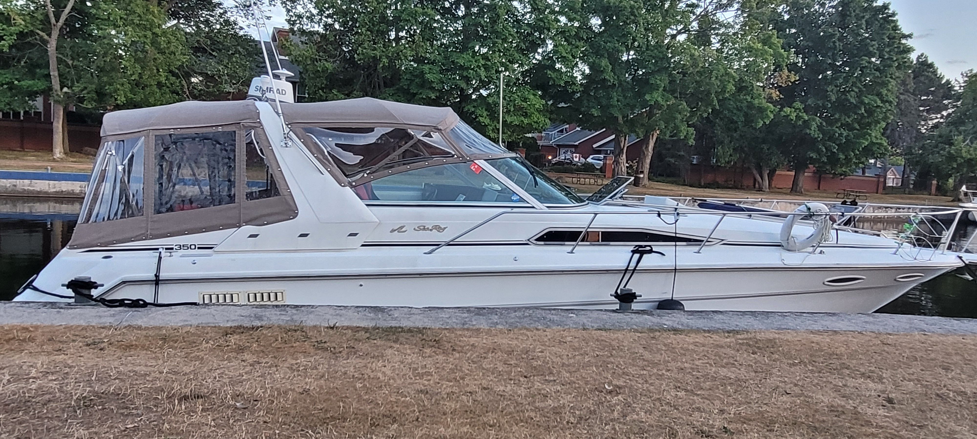 This 1991 Sea Ray 350 Sundancer is a freshwater boat located in Pefferlaw, ON and presents in fantastic condition with desirable onboard systems including heating and air conditioning, generator power, and twin Mercruiser 7.41L engines with V-drive. Notable recent improvements include a brand new complete camper canvas top/sides with isinglass (end of 2024), a new windlass motor, a new custom V-berth mattress topper, plus interior updates including new carpet flooring and a new salon dinette seat. Electronics highlights include Simrad Broadband 4G radar and a Simrad NSS evo35 chartplotter for confident navigation.