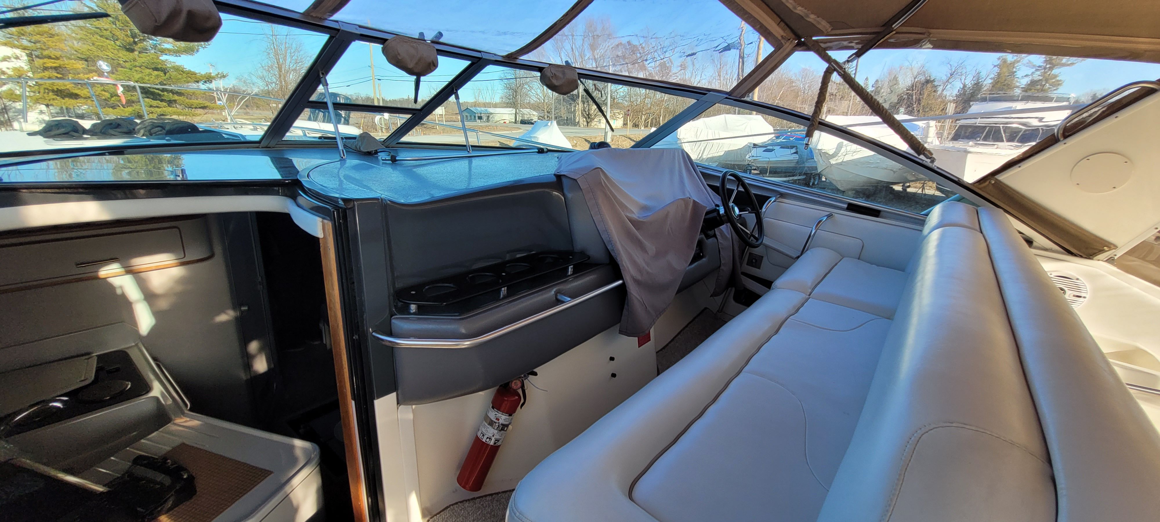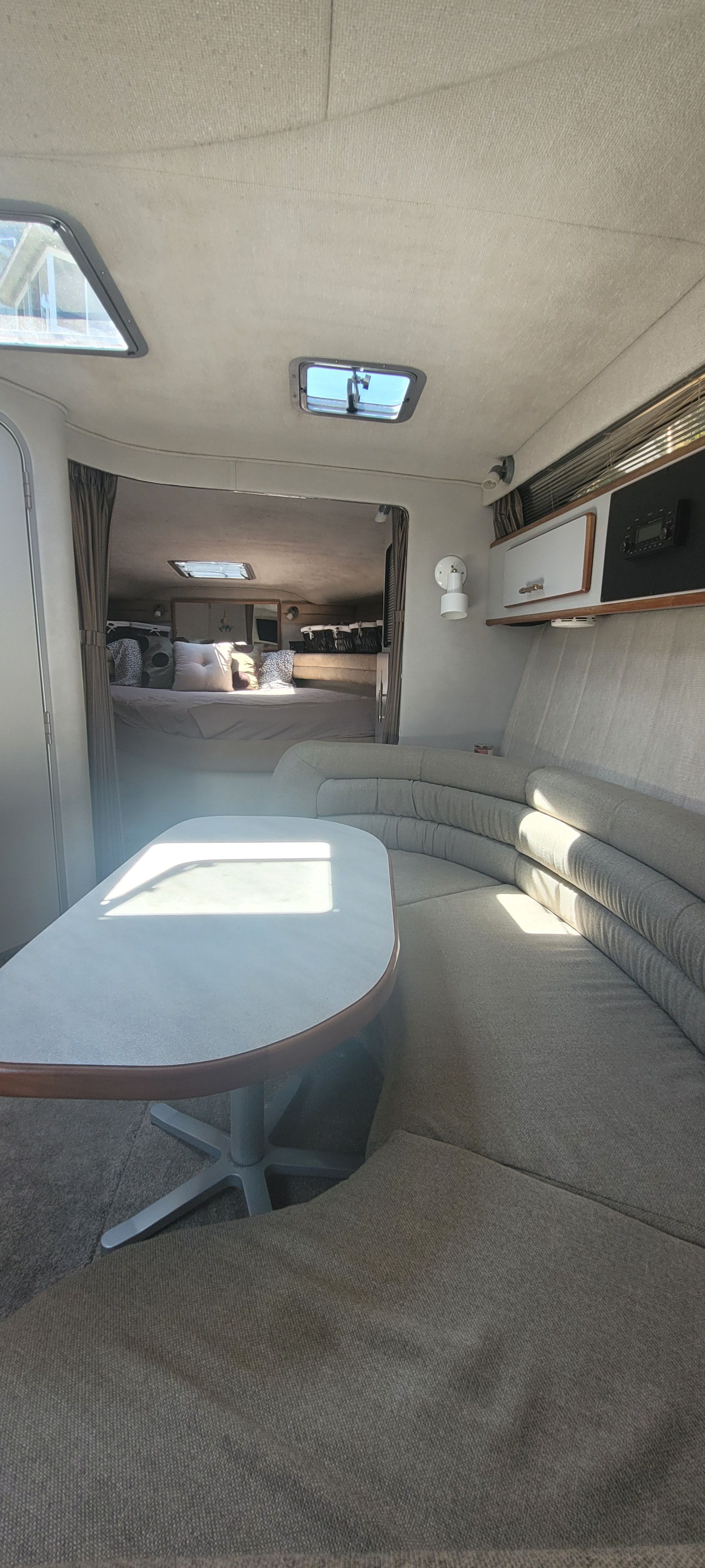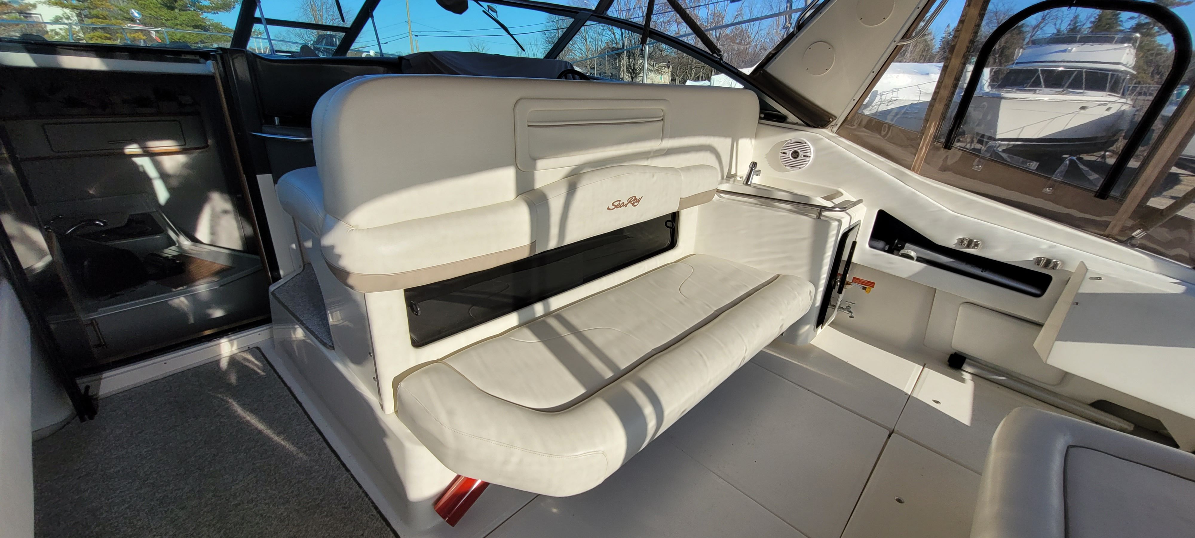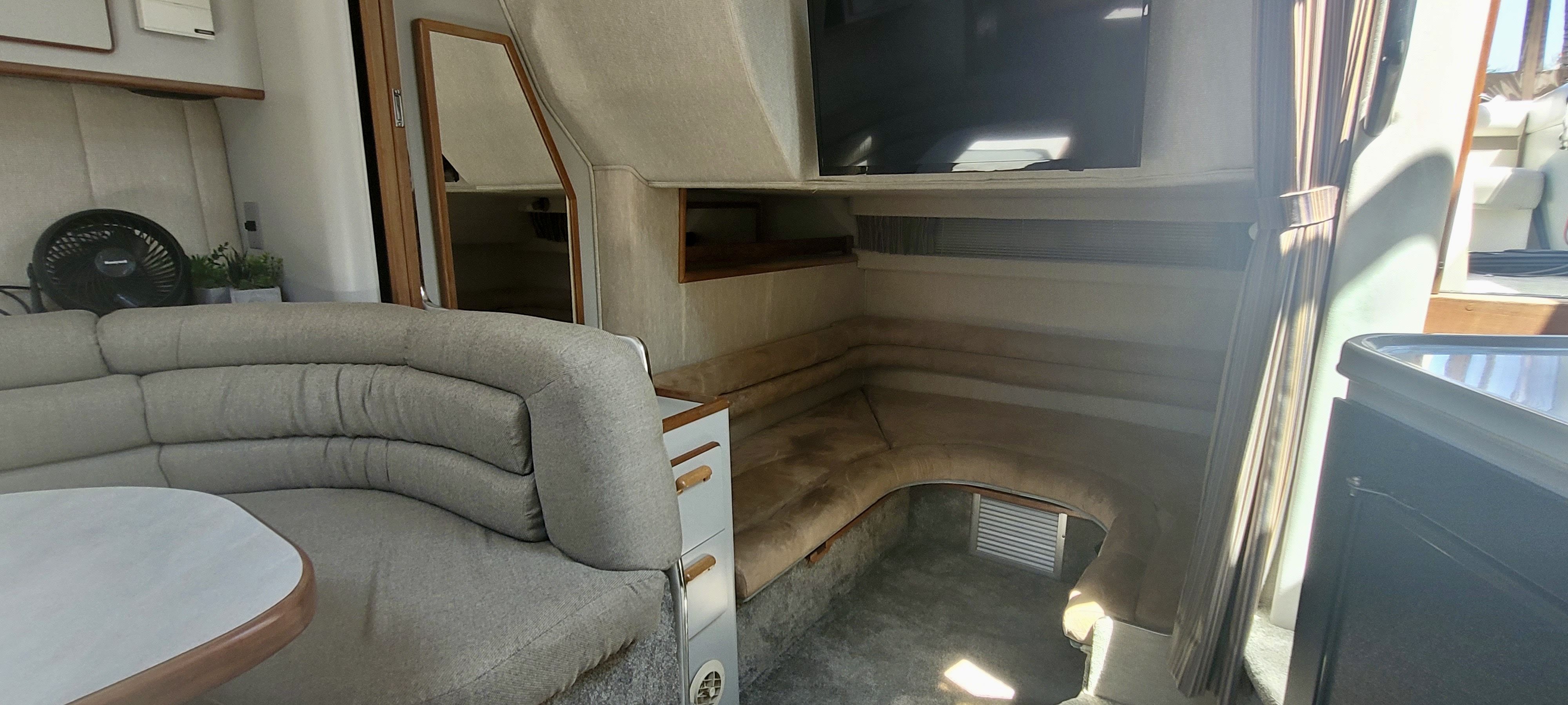 This 1991 Sea Ray 350 Sundancer is a freshwater boat located in Pefferlaw, ON and presents in fantastic condition with desirable onboard systems including heating and air conditioning, generator power, and twin Mercruiser 7.41L engines with V-drive. Notable recent improvements include a brand new complete camper canvas top/sides with isinglass (end of 2024), a new windlass motor, a new custom V-berth mattress topper, plus interior updates including new carpet flooring and a new salon dinette seat. Electronics highlights include Simrad Broadband 4G radar and a Simrad NSS evo35 chartplotter for confident navigation.