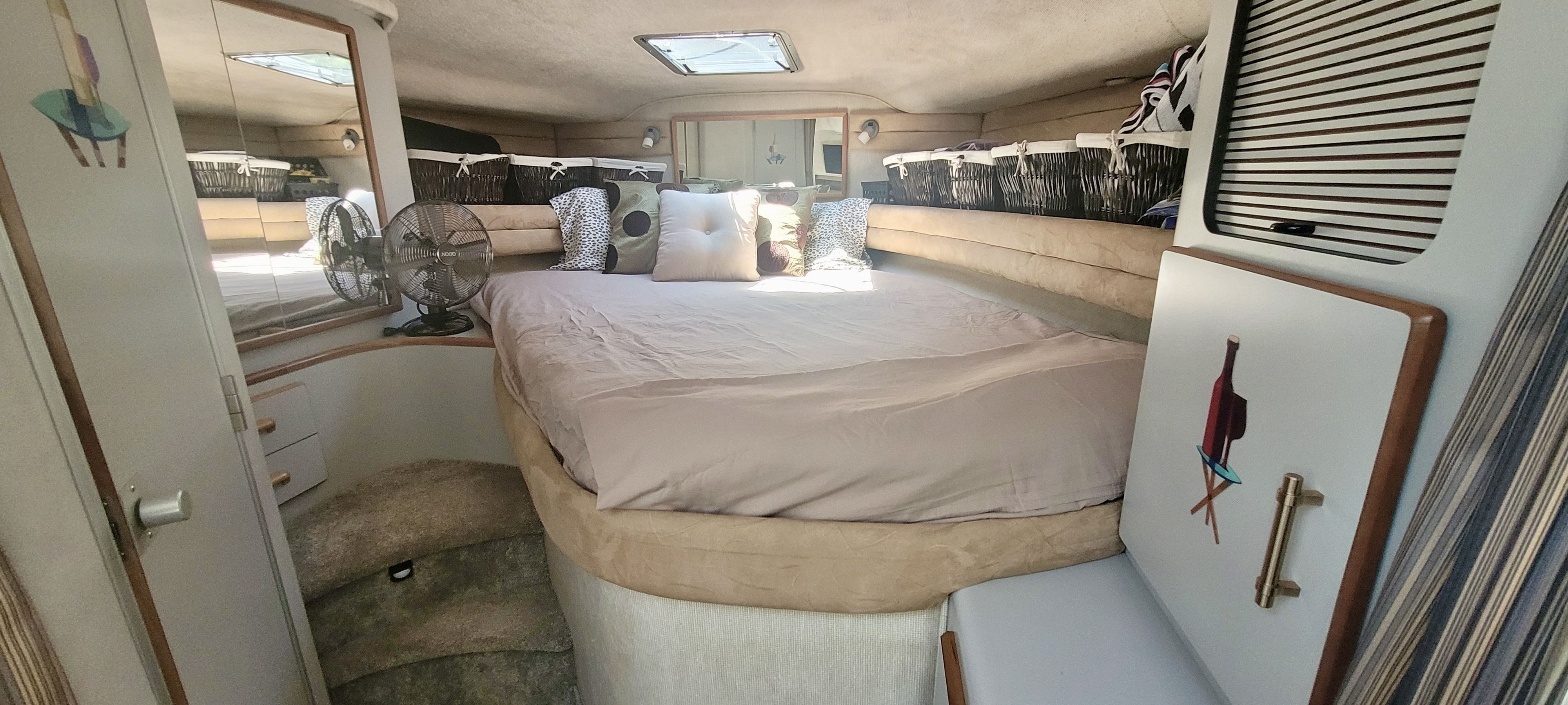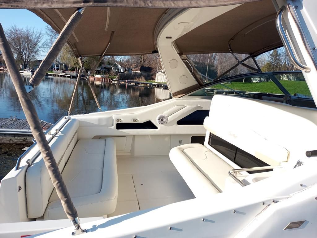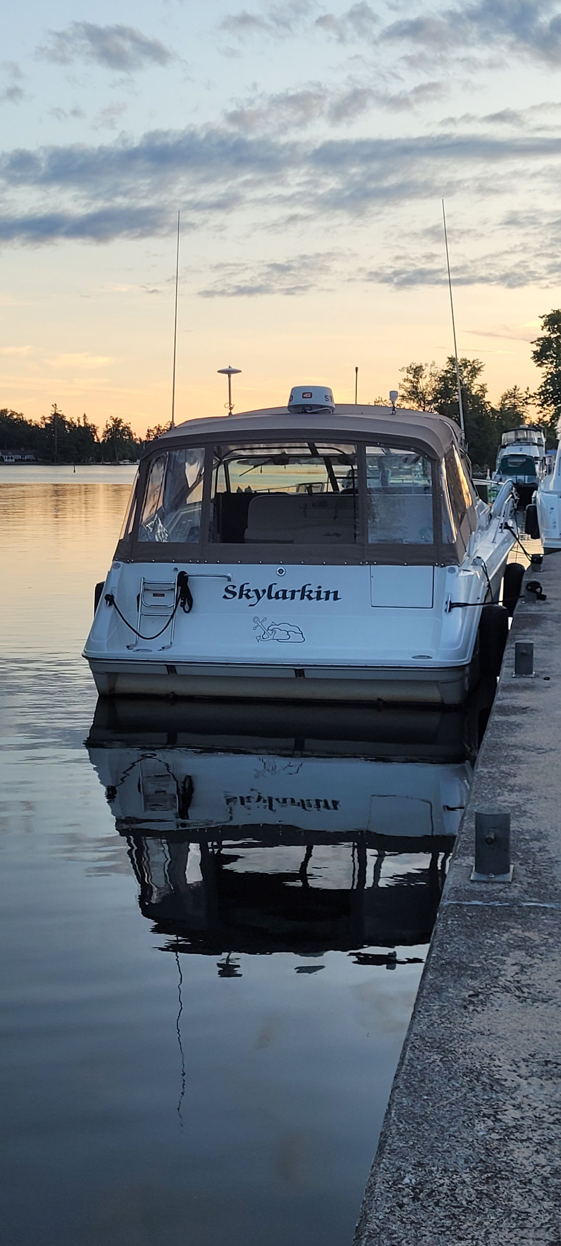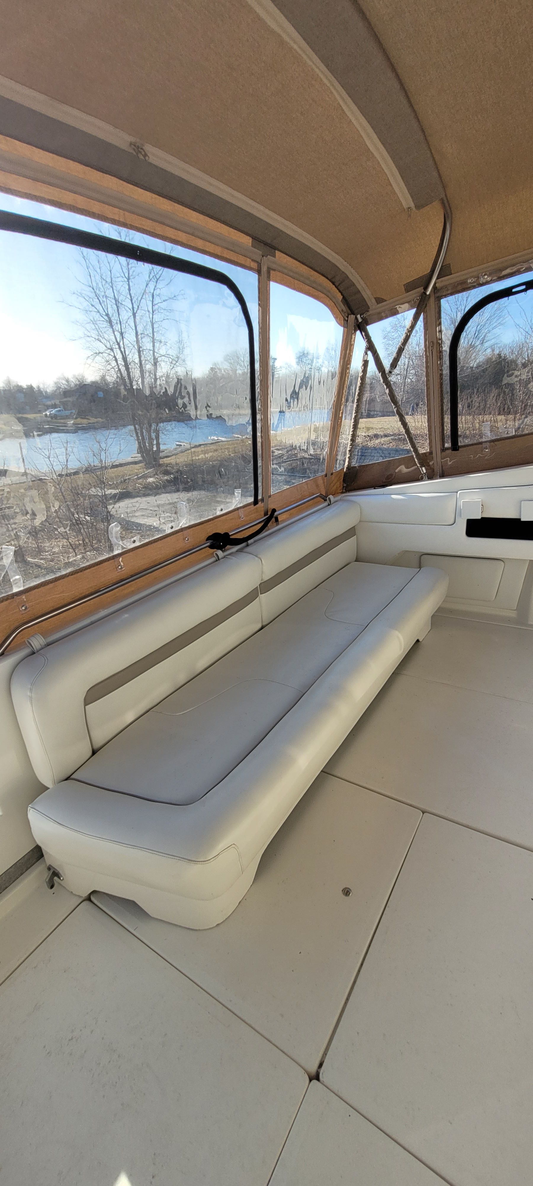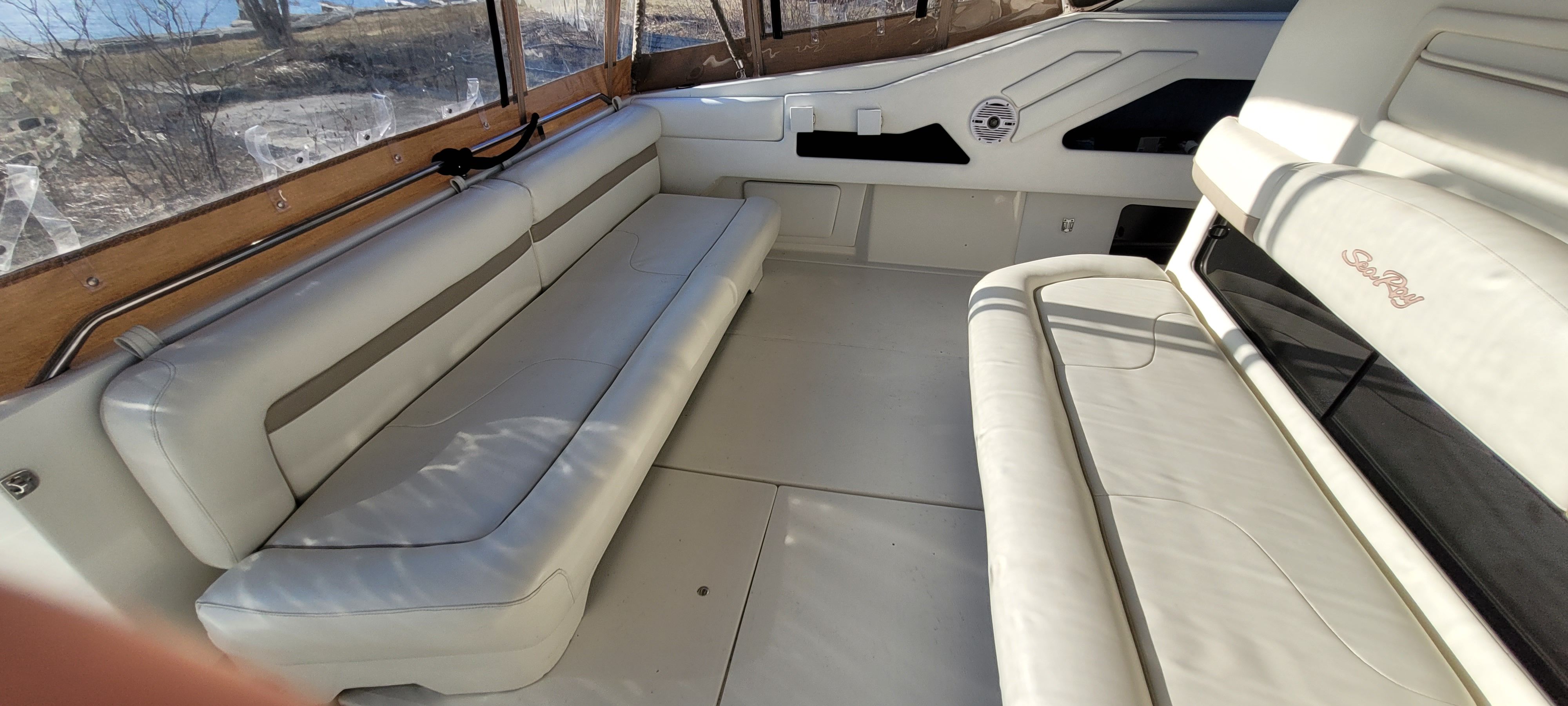 This 1991 Sea Ray 350 Sundancer is a freshwater boat located in Pefferlaw, ON and presents in fantastic condition with desirable onboard systems including heating and air conditioning, generator power, and twin Mercruiser 7.41L engines with V-drive. Notable recent improvements include a brand new complete camper canvas top/sides with isinglass (end of 2024), a new windlass motor, a new custom V-berth mattress topper, plus interior updates including new carpet flooring and a new salon dinette seat. Electronics highlights include Simrad Broadband 4G radar and a Simrad NSS evo35 chartplotter for confident navigation.