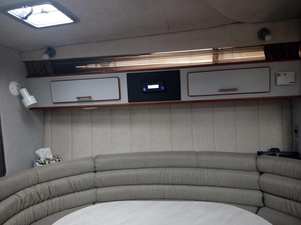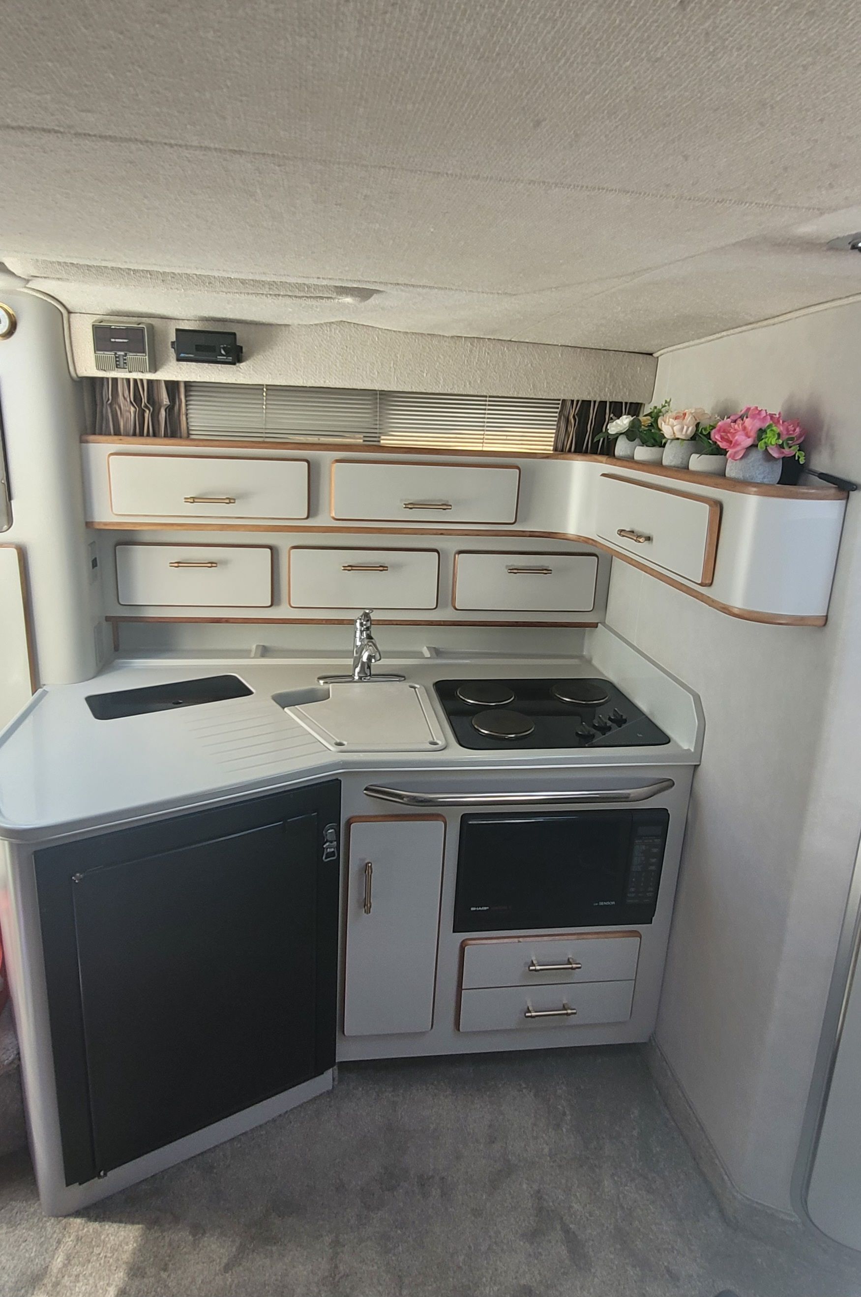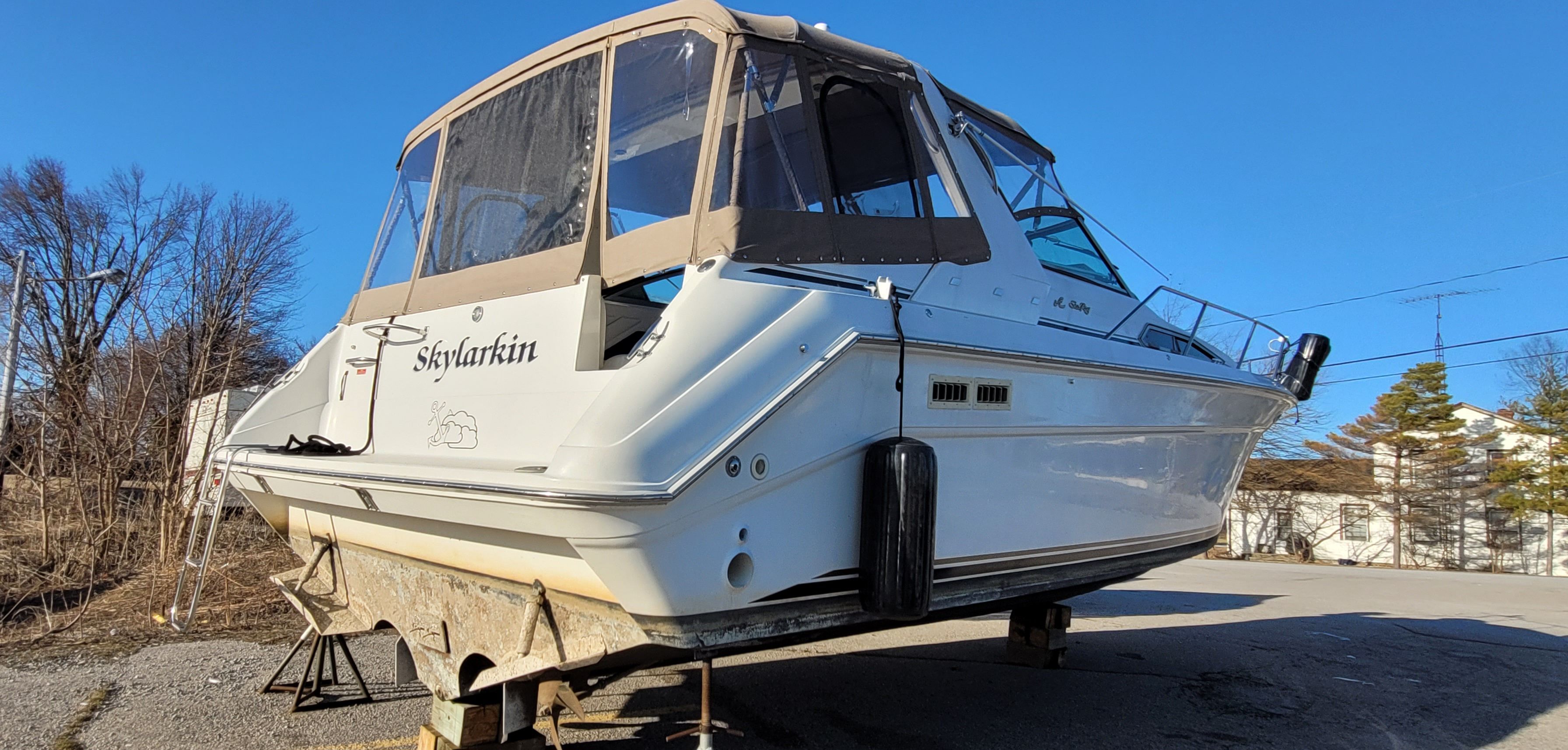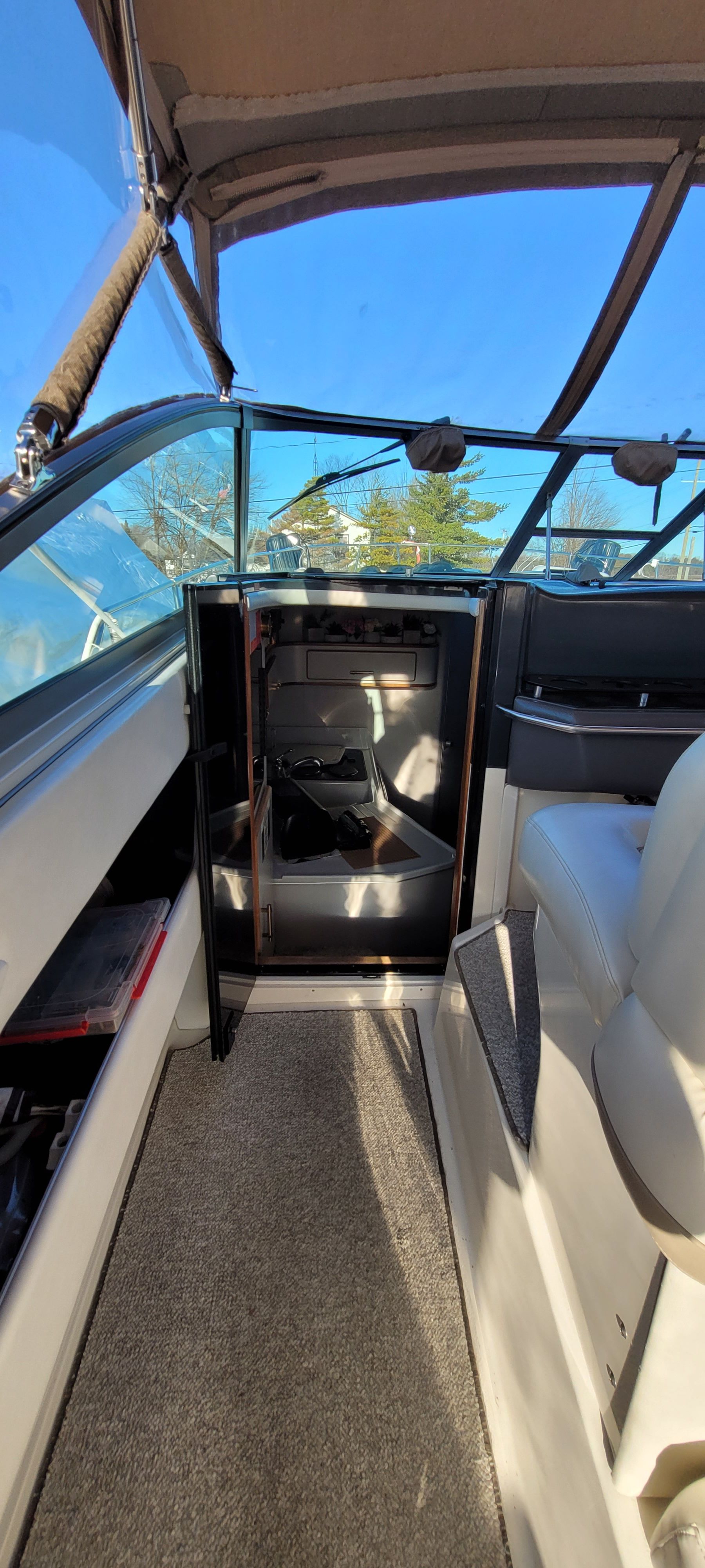This 1991 Sea Ray 350 Sundancer is a freshwater boat located in Pefferlaw, ON and presents in fantastic condition with desirable onboard systems including heating and air conditioning, generator power, and twin Mercruiser 7.41L engines with V-drive. Notable recent improvements include a brand new complete camper canvas top/sides with isinglass (end of 2024), a new windlass motor, a new custom V-berth mattress topper, plus interior updates including new carpet flooring and a new salon dinette seat. Electronics highlights include Simrad Broadband 4G radar and a Simrad NSS evo35 chartplotter for confident navigation.