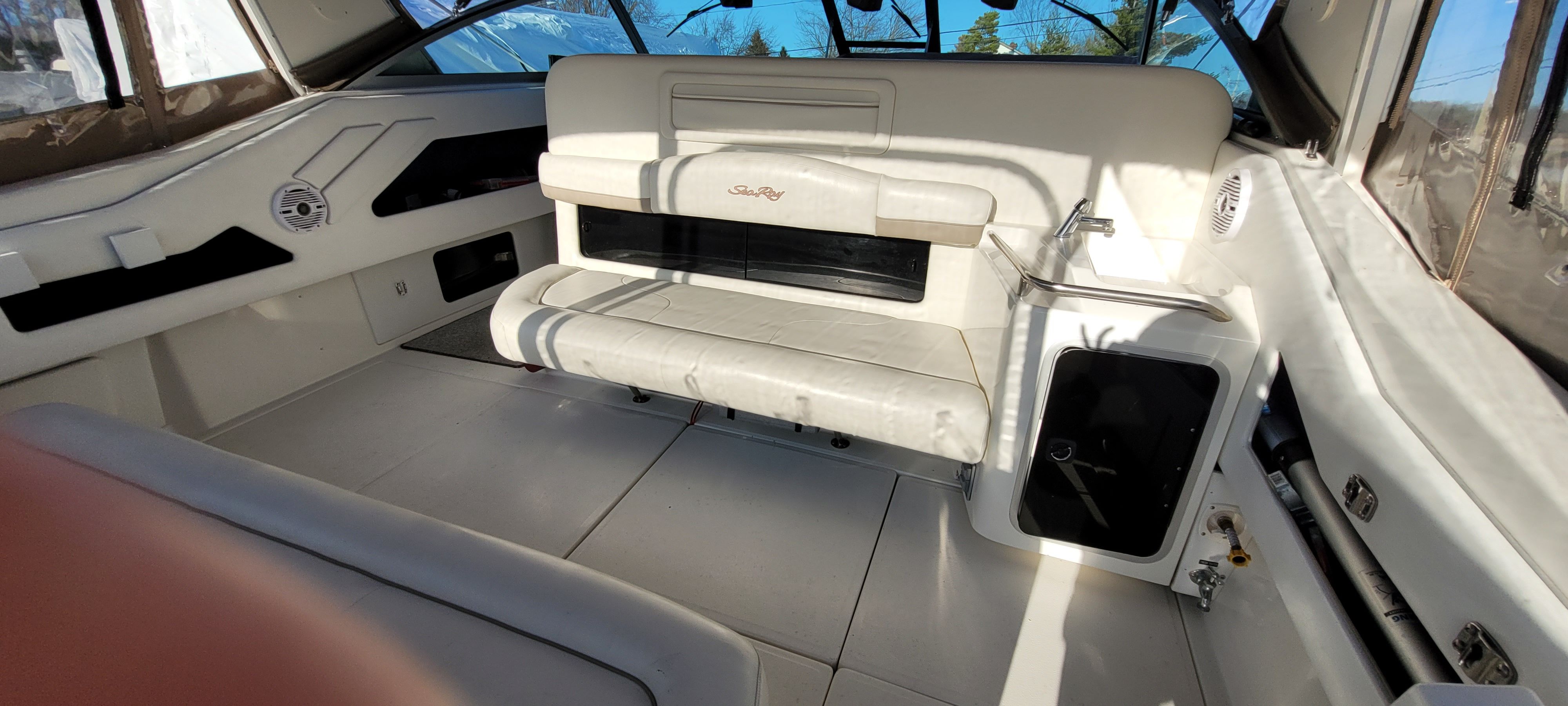 Sea Ray has long been recognized for building upscale cruisers that blend smart layouts with practical onboard systems, quality fiberglass construction, and user-friendly ergonomics—delivering comfortable, confidence-inspiring boating for families and entertaining. The Sea Ray 350 Sundancer is a wide-beamed (12’4”) express cruiser with a desirable mid-cabin interior layout that maximizes space for day cruising and overnights. With generous seating topside, a flexible cabin arrangement that can sleep up to six, a full galley, and an enclosed head with VacuFlush, the 350 Sundancer remains a highly sought-after cruiser for its size and stability.