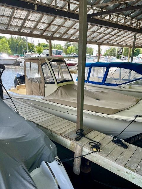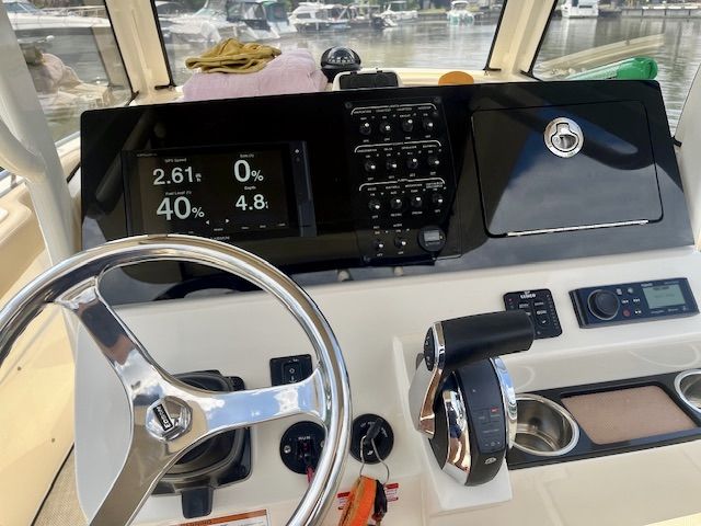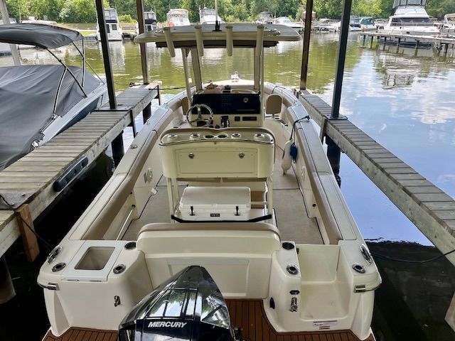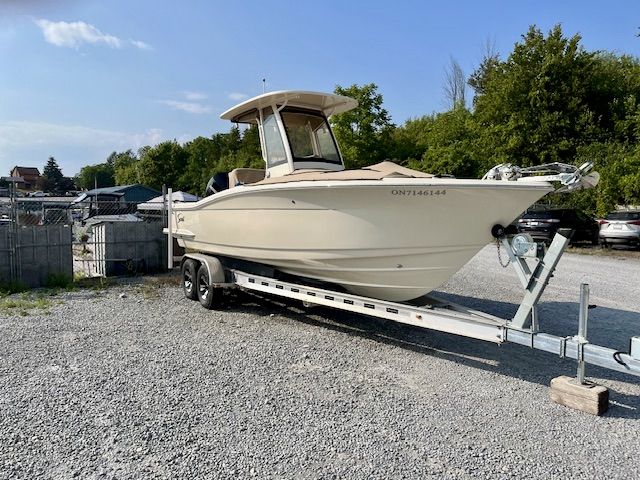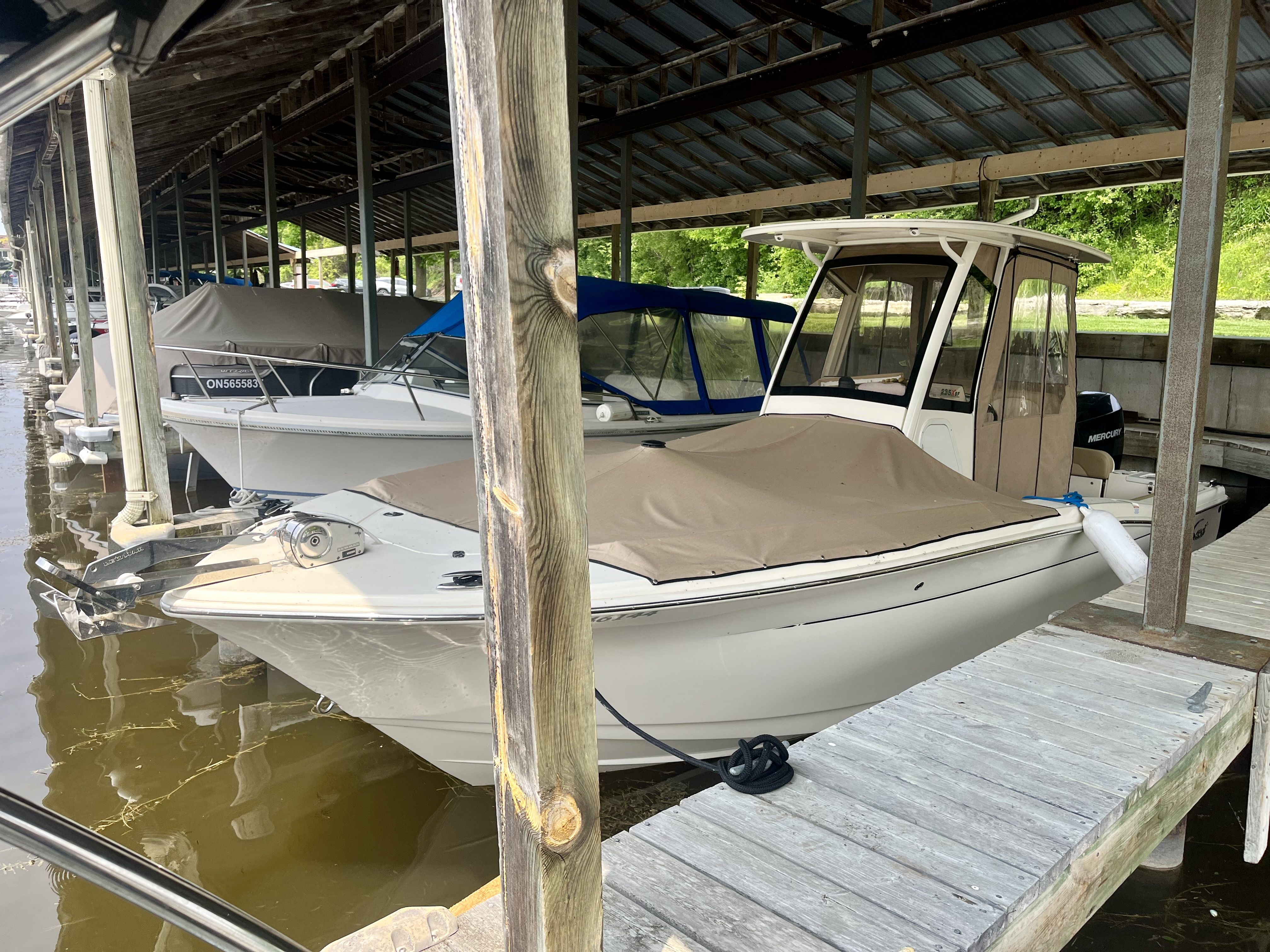 This 2021 Scout 235 XSF is powered by a Mercury Verado 250 with approximately 260 hours and has been professionally maintained with annual engine oil and gear oil changes. Highlights include a finished fiberglass hardtop with solid full windshield, Garmin GPS, windlass anchor, upgraded Bluetooth stereo system with upgraded speakers, LED interior lighting, bait/live well with aerator, rod holders, freshwater hose, porcelain head, removable bow table, walk-around swim platform, and non-slip flooring. Additional features include snap-in Sea Grass flooring, all covers and enclosure seen in the photos, and a high-quality double axle trailer. Reported top speed is 50 MPH.