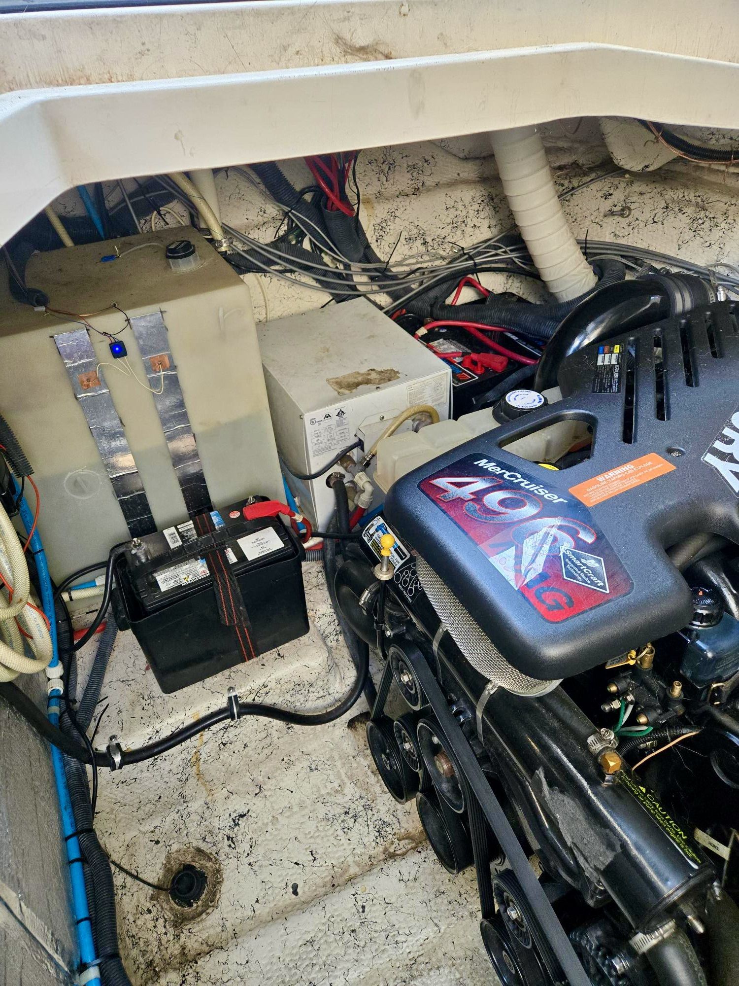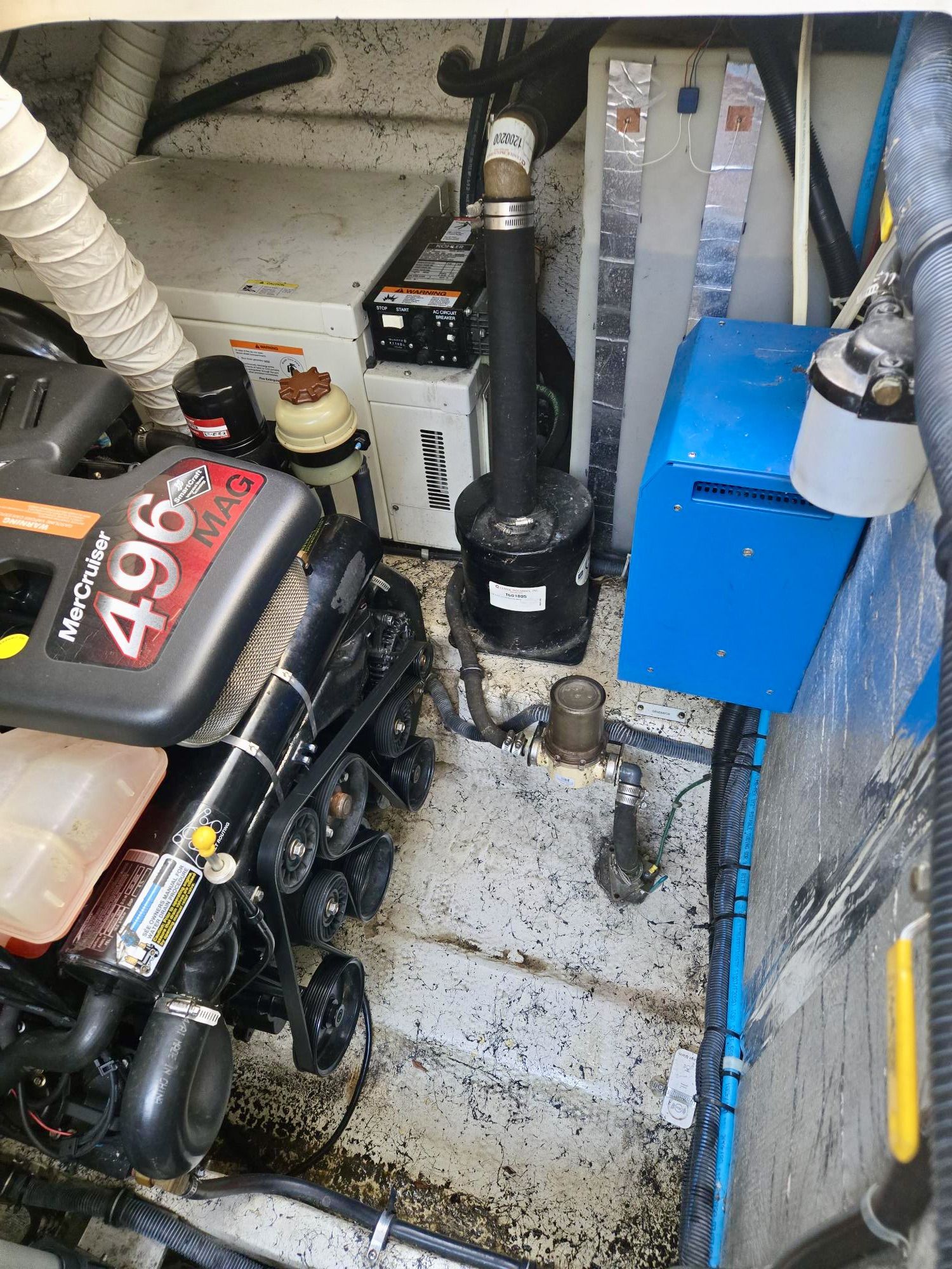 This 2005 Rinker Fiesta Vee 360 is powered by twin big block 8.1L Mercruiser engines with 540 hours and includes a Kohler 5kW generator and 18,000 BTU Marine Air reverse-cycle air conditioning & heating. Notable updates include new canvas (2026), an external bow thruster (2023), an insulated shore power transformer (2024), a Diacom PC-based marine diagnostic system (2023), upgraded tank level monitoring, Tuya APP bilge water leak sensors with push notification, and both engine starters replaced (2024).