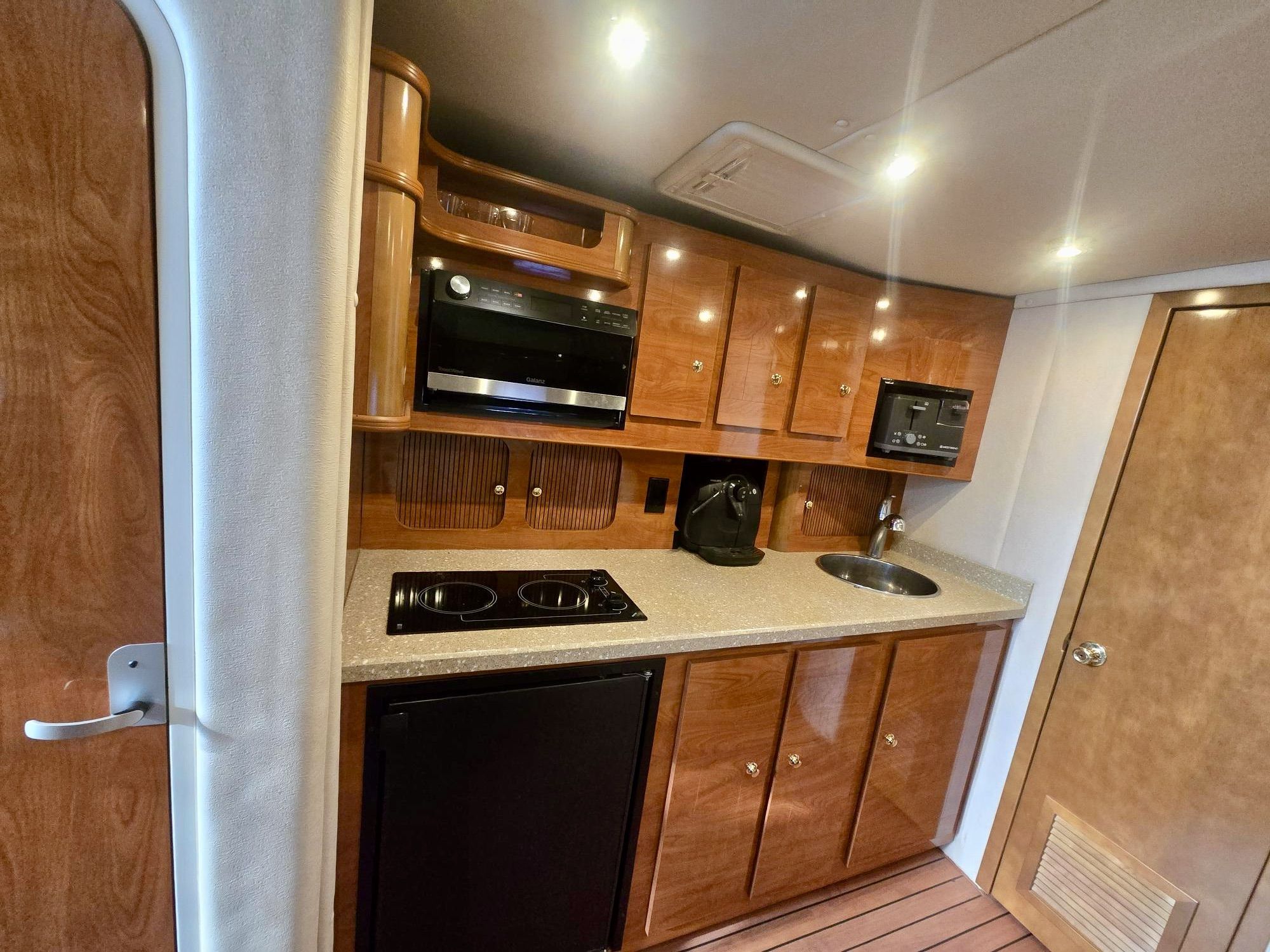 Galley with sink (hot/cold pressure water), cooktop, fridge, microwave