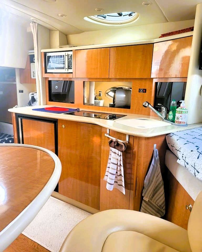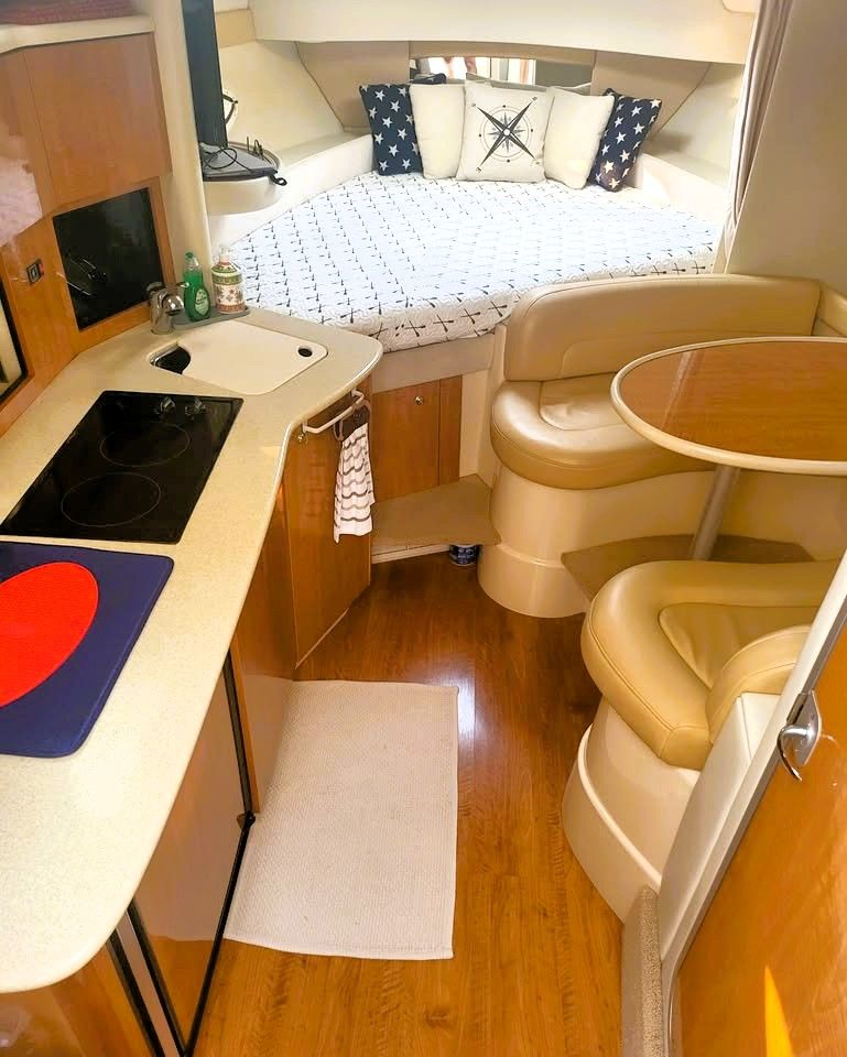 Below deck, the cabin is bright and welcoming with a forward V-berth, spacious mid-cabin lounge, enclosed head with shower, and a fully equipped galley. This layout comfortably accommodates overnight stays for family or guests while maintaining the open, airy feel that makes the 3100 SCR so popular.