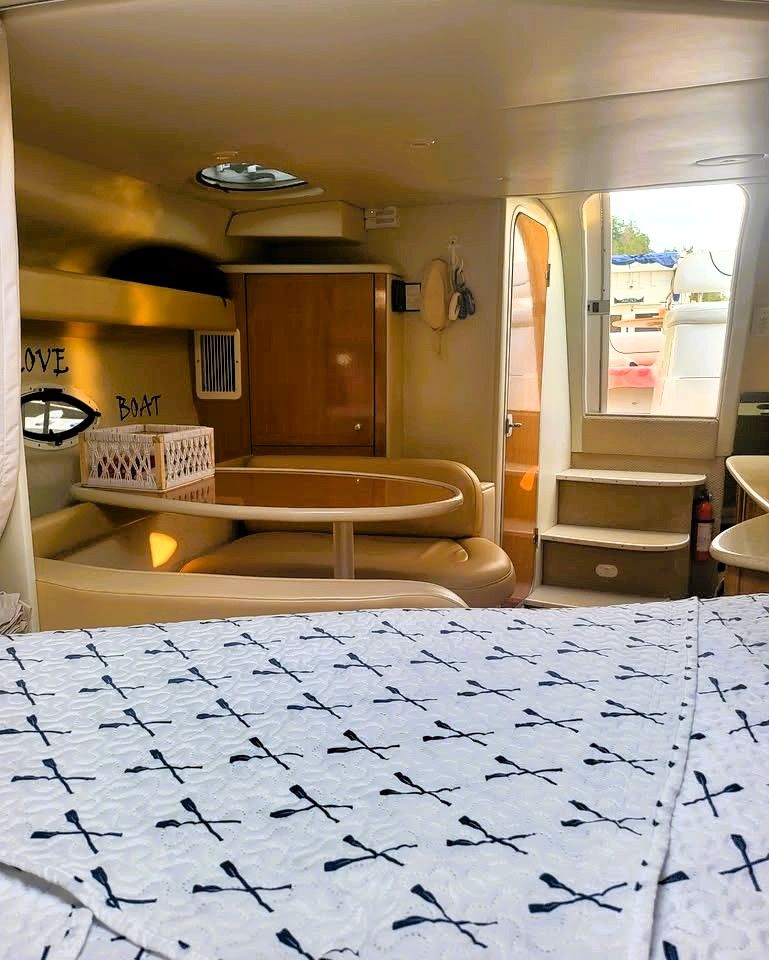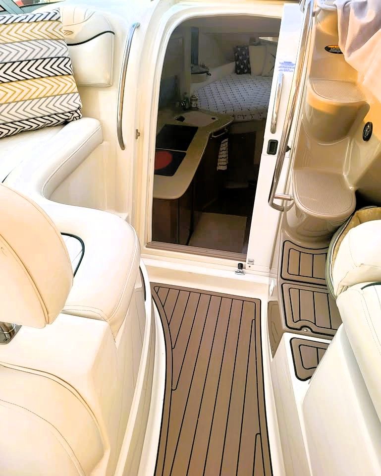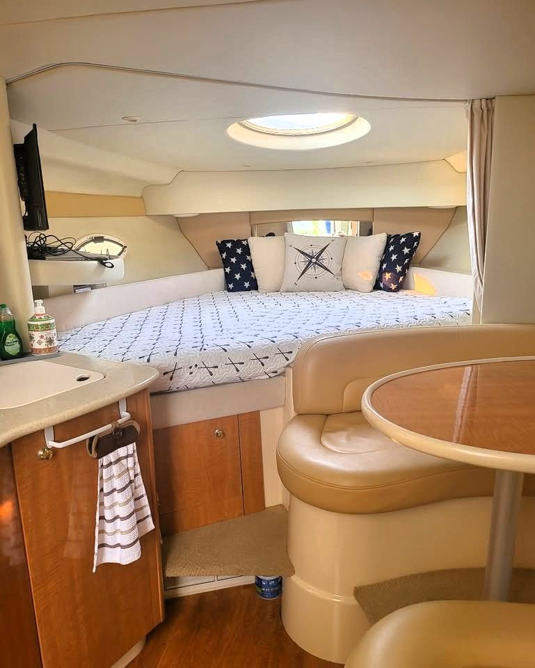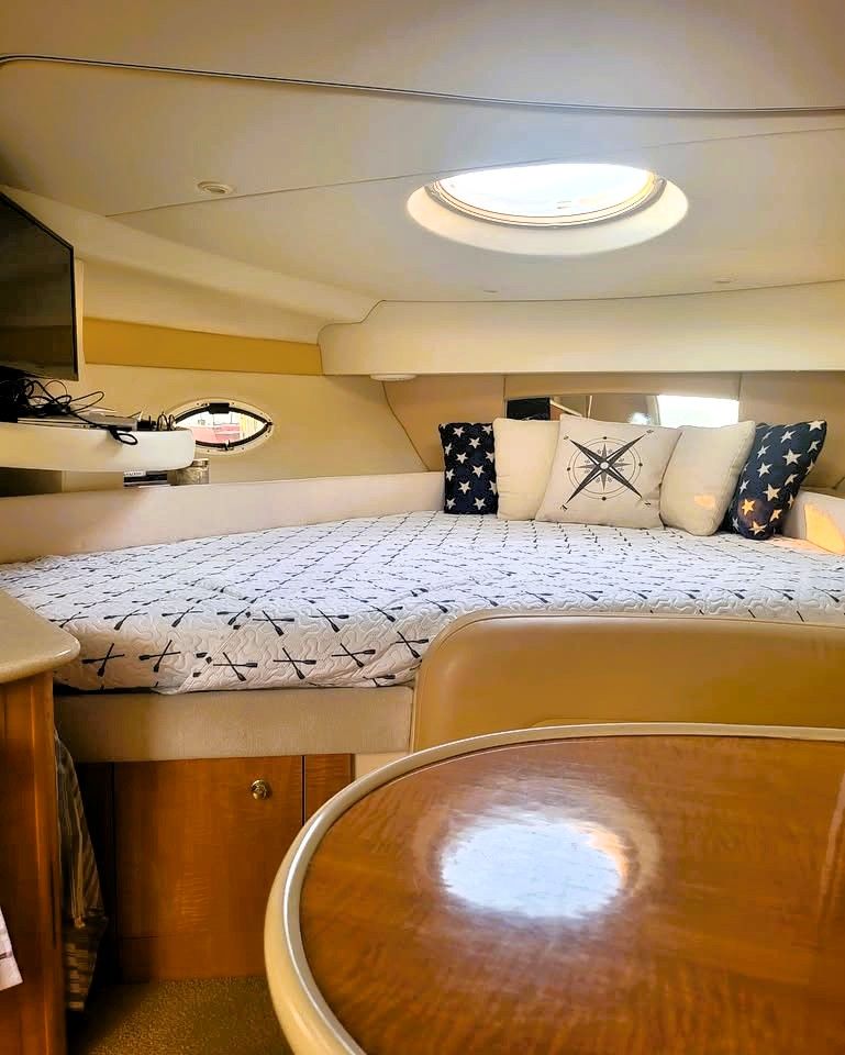 The cockpit layout is one of this model’s strongest features, offering generous seating, excellent traffic flow, and easy access to the swim platform—perfect for entertaining, relaxing at anchor, or enjoying watersports. The helm provides good visibility and intuitive controls, making docking and maneuvering straightforward.