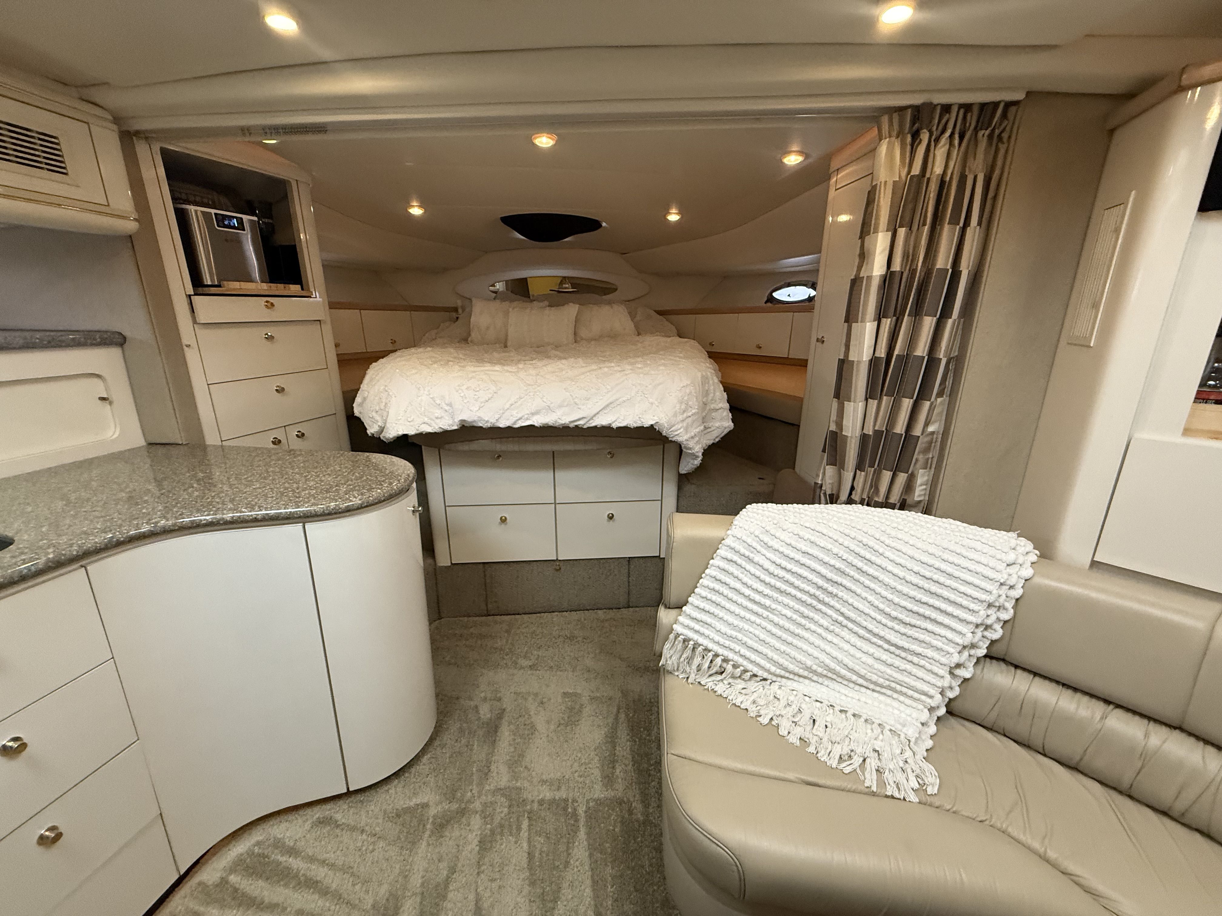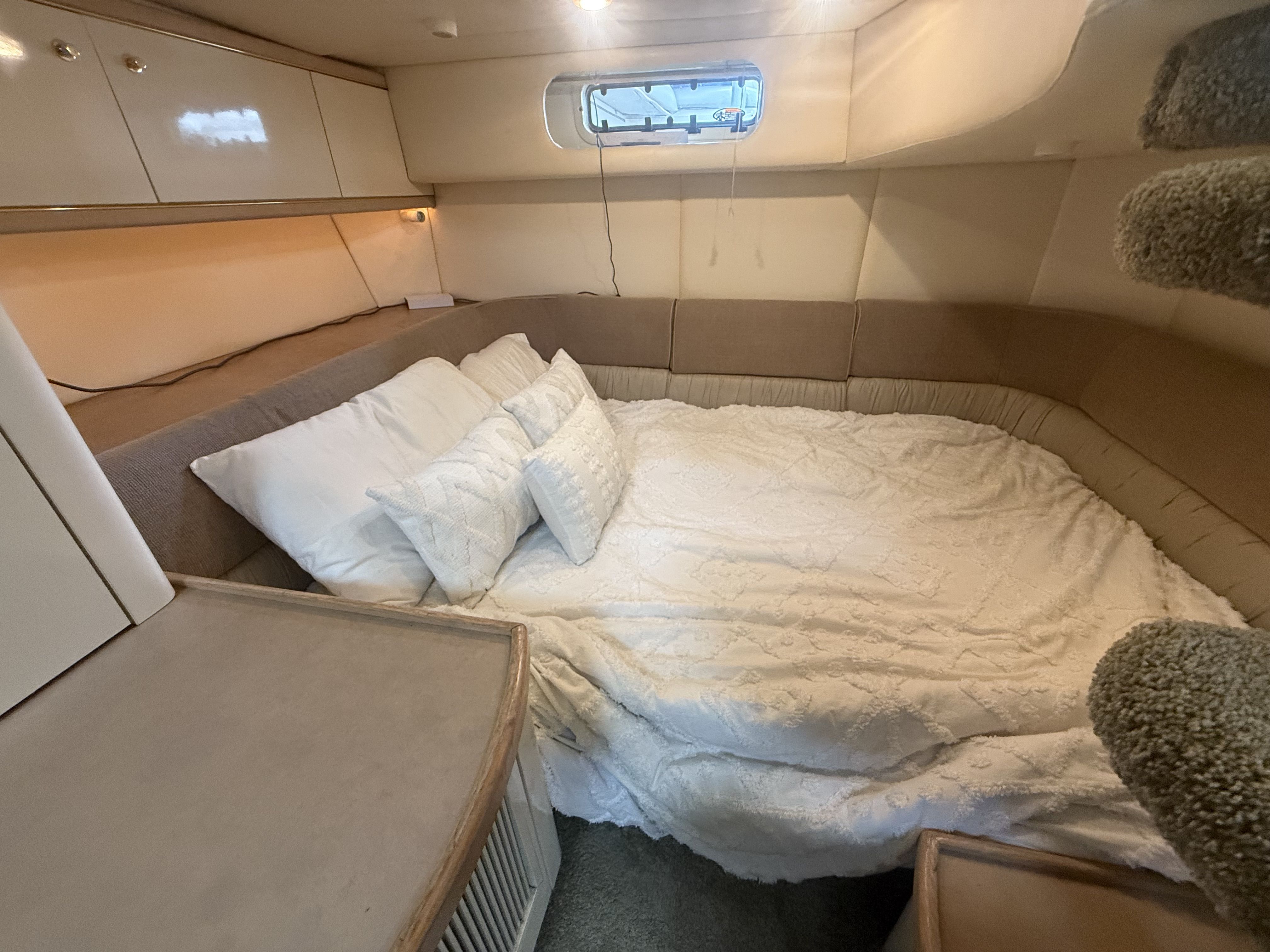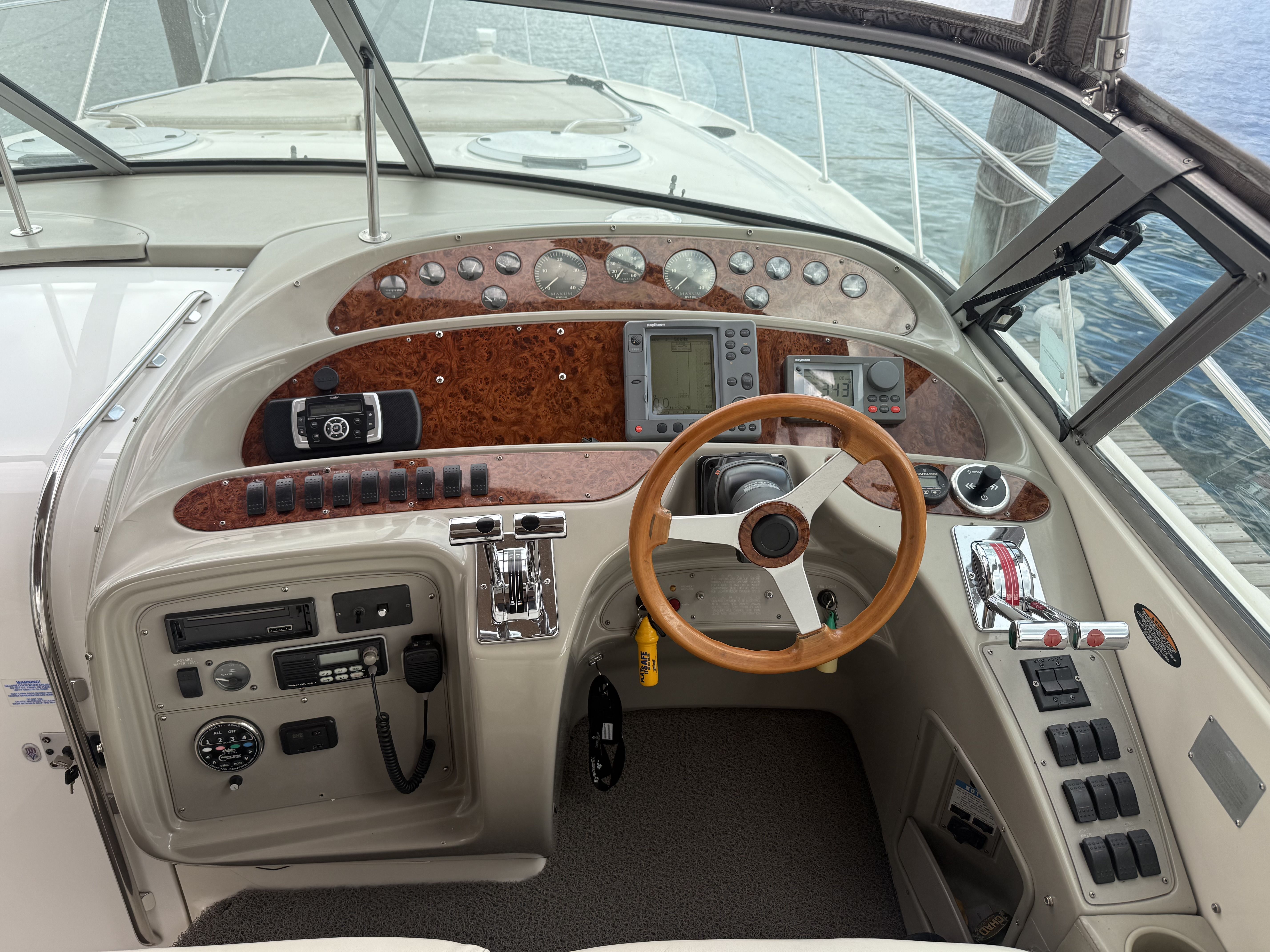 Highlights & Recent Upgrades • Twin Cummins 5.9L Marine Diesels – 1,100 hours, freshly serviced • 8kW Westerbeke Diesel Generator – reliable, quiet onboard power, freshly serviced • Over $5,000 in New AGM Batteries Installed (2025) – 9 total • Full Oil Change on Main Engines & Generator (2025) • New Bow Thruster in 2025 for effortless docking. • New Bottom Paint & New Props (2025) • New Fiberglass & Gelcoat Repairs (2025) – professionally restored finish and full polish. • New Enclosure Isinglass (2025) – crystal-clear visibility • New Custom Table Tops & Swim Ladder (2025) • Premium Exile Audio System – amps, speakers, subs, and LED lighting (app controlled) • LED Mood Lighting in cockpit and warm mood lighting in the saloon + Light Bars for Night Cruising (2025) • New Fridges (Galley & Cockpit) and New Microwave (2023-2025) – all stainless steel • Wet Bar with Bottle Storage, Sink, and Bar Fridge • Ice Maker and Keurig Coffee Maker in Galley (2025) • Forward Sun Pad, Bimini, and Camper Enclosure. The Maxum 4100 SCR offers generous space for entertaining and extended stays aboard: • Seating for 10+ with double bench seats forward and facing settees aft (each with removable table options) • Spacious cockpit with abundant storage and wet bar amenities • Two cedar hanging lockers for wardrobe and storage needs • Mid-cabin interior features a U-shaped lounge that converts to a comfortable berth • Two A/C units with reverse cycle heat – enjoy all-season comfort • Ample storage throughout, including galley cabinets, lockers, and under-seat compartments.
