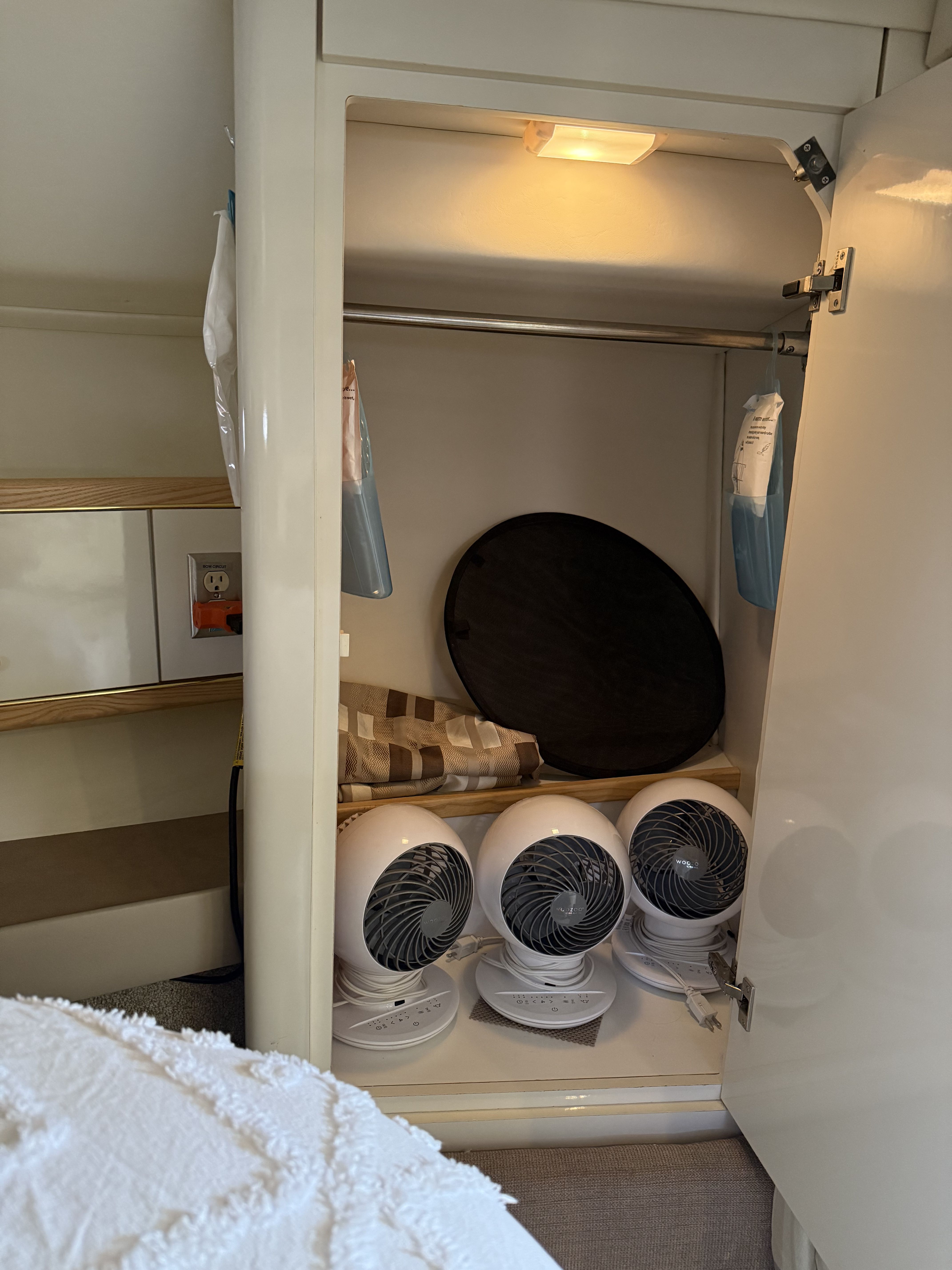 Queen sized walk-around v-birth with hanging lockers and privacy curtains