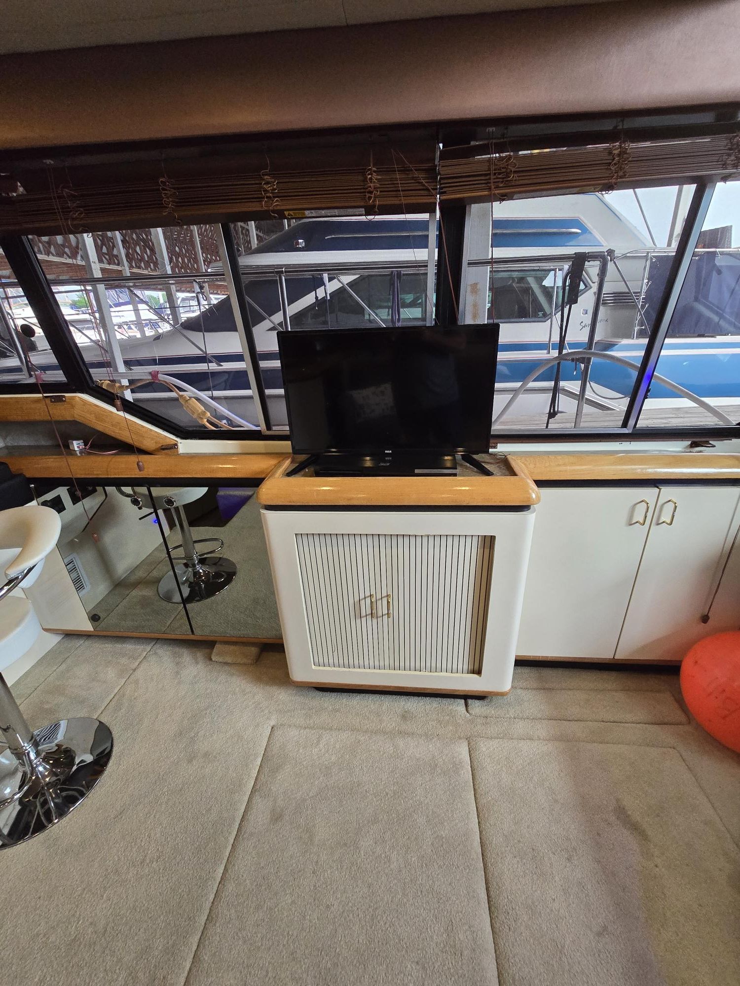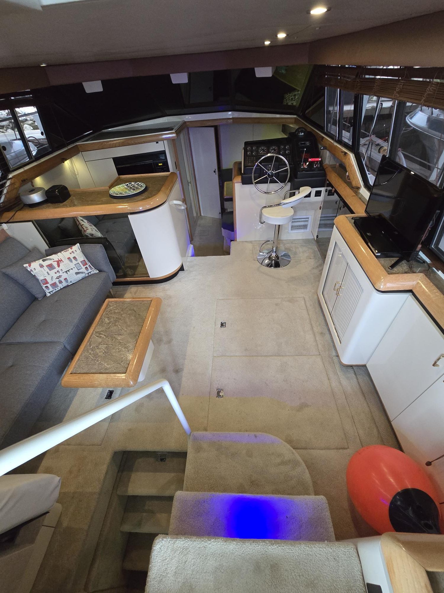 Produced between 1990 and 1993, the Bayliner 4387 Aft Cabin Motor Yacht is a popular midsize cruiser recognized for its exceptional interior volume and practical two-stateroom layout. Built on a modified-V hull with a 14'3" beam, it offers a spacious, light-filled salon with large wraparound windows and a lower helm station. The "galley-down" configuration includes a full electric kitchen and a convertible dinette, while the private master stateroom aft features a queen-size island berth and an ensuite head.