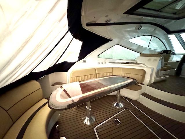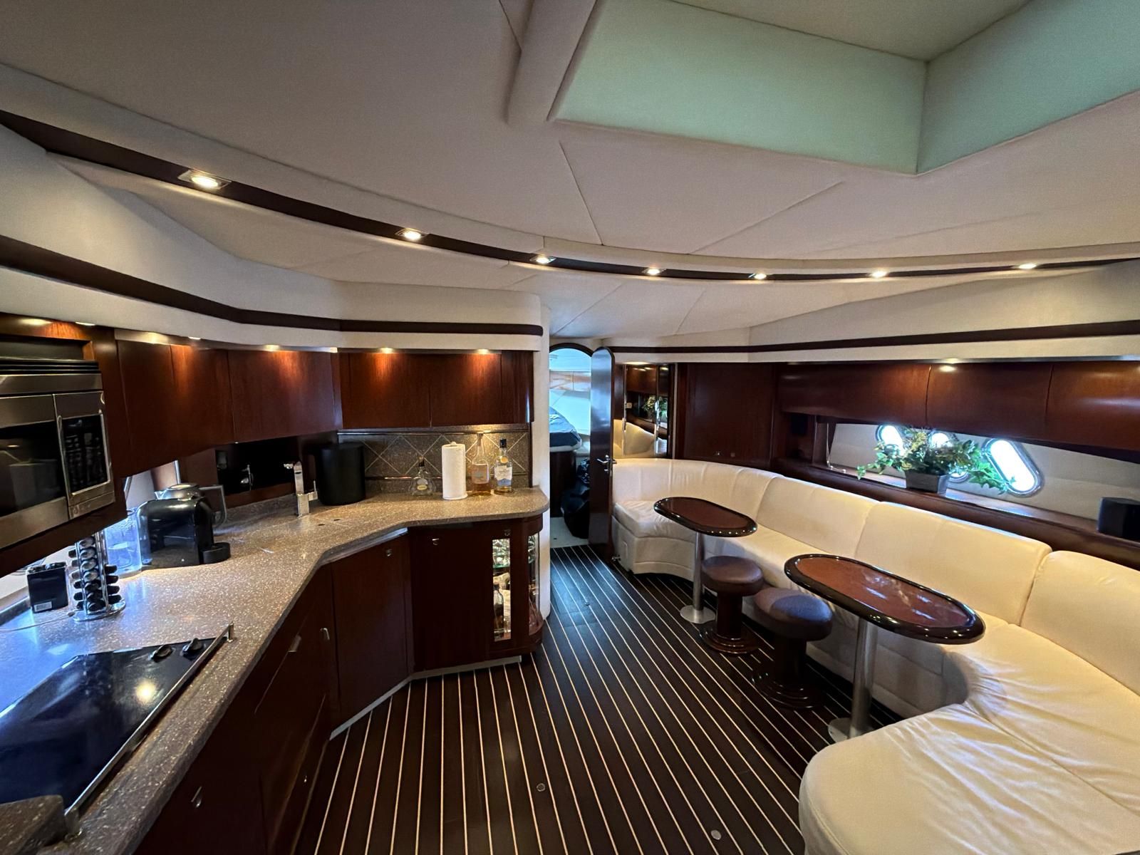 - Cockpit Galley (Wet Bar): Equipped with solid-surface countertops, sink, electric grill, refrigerator, and icemaker.