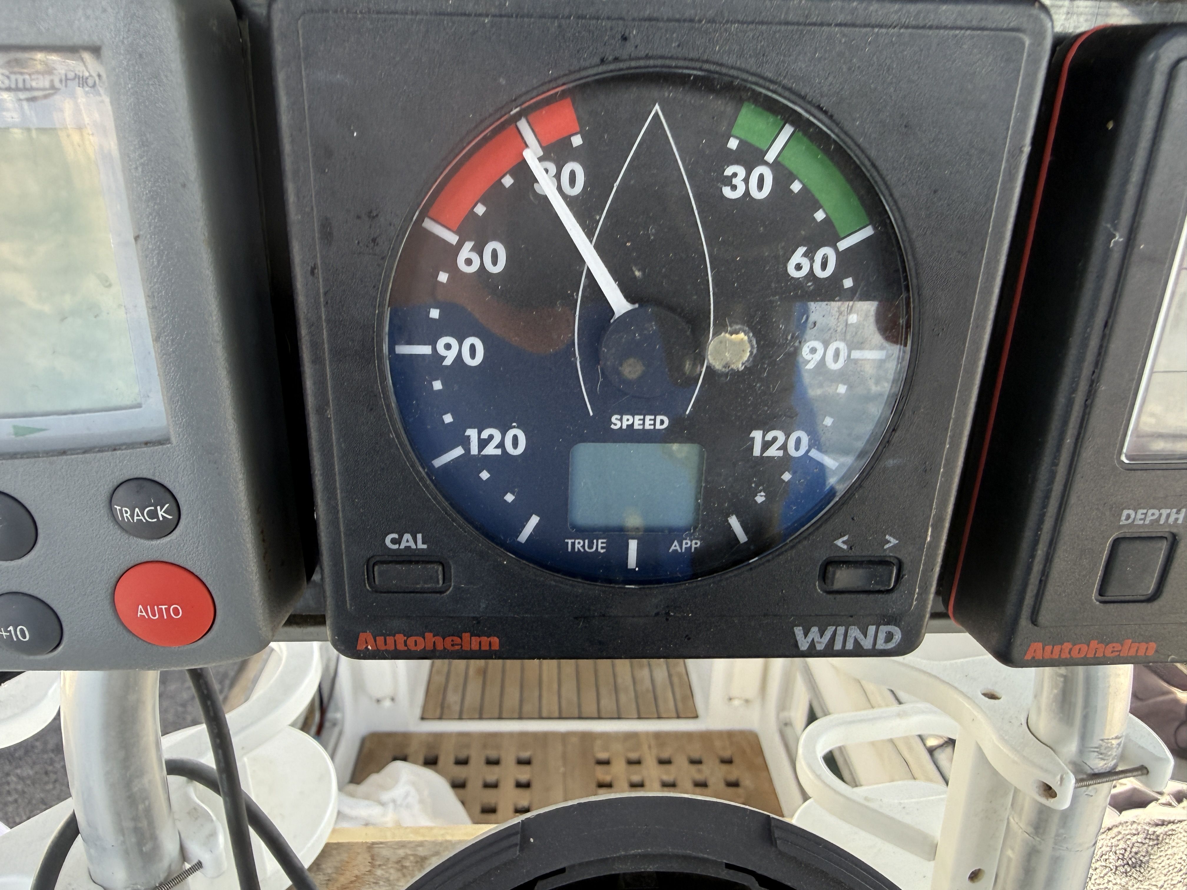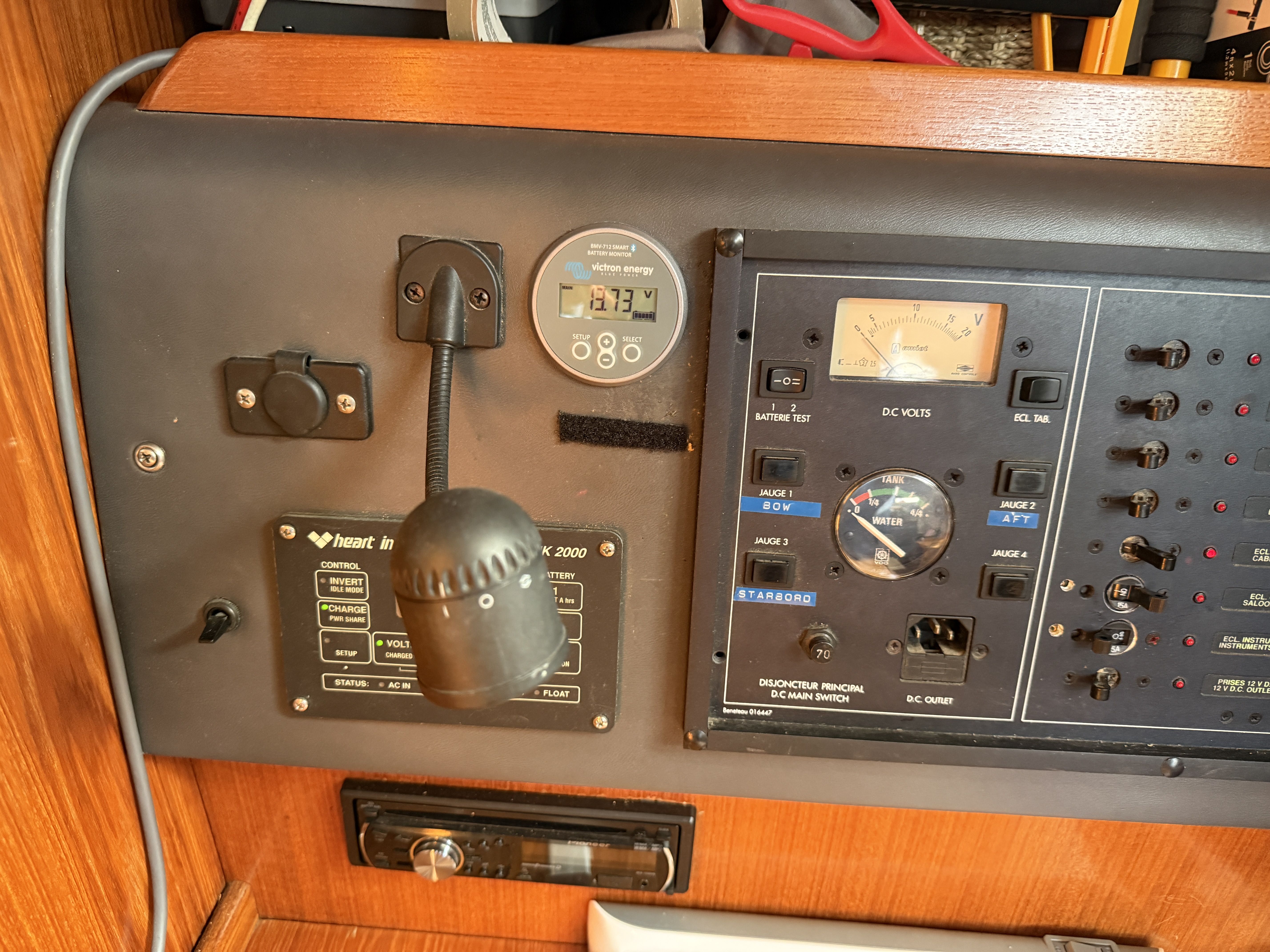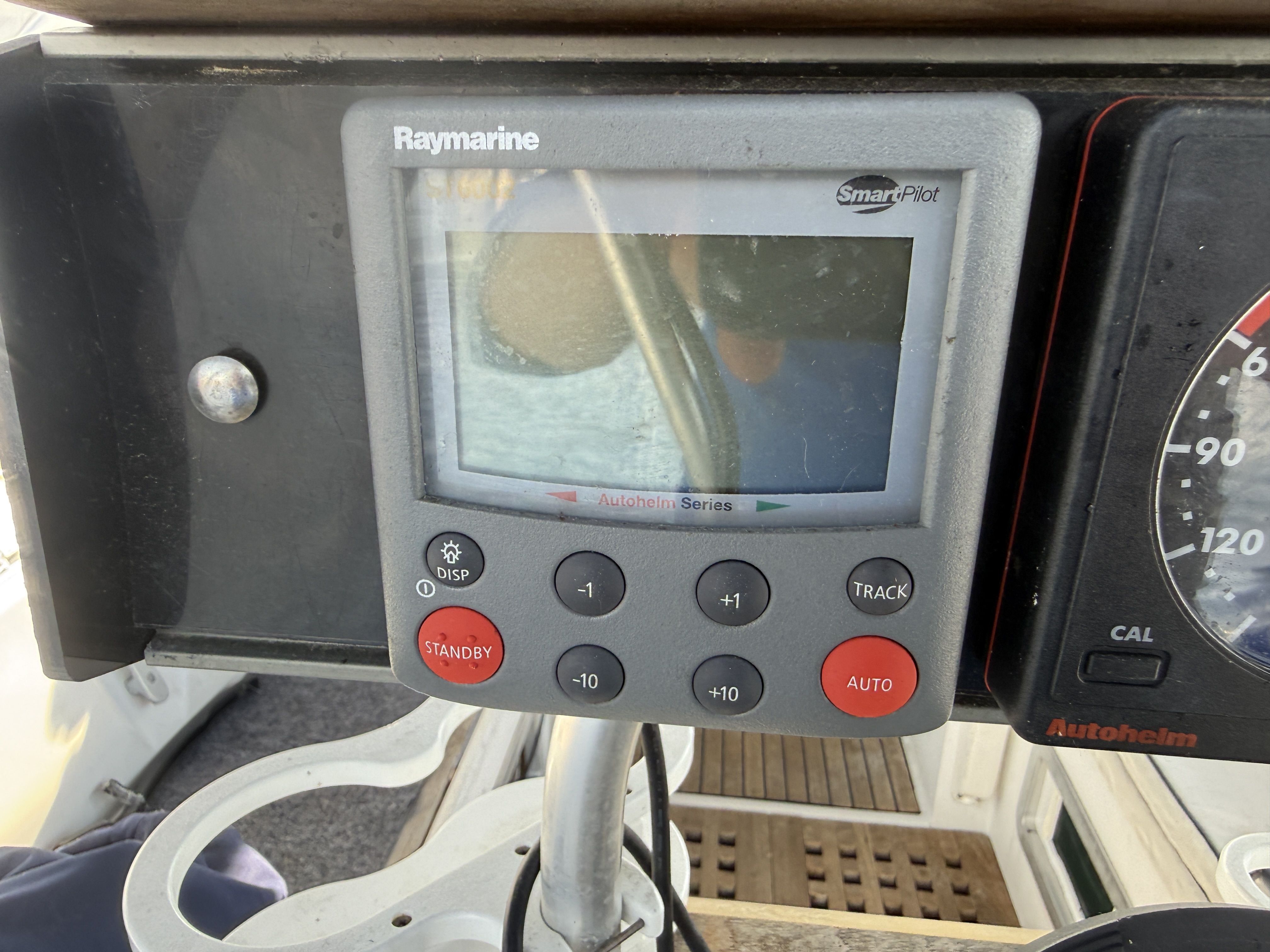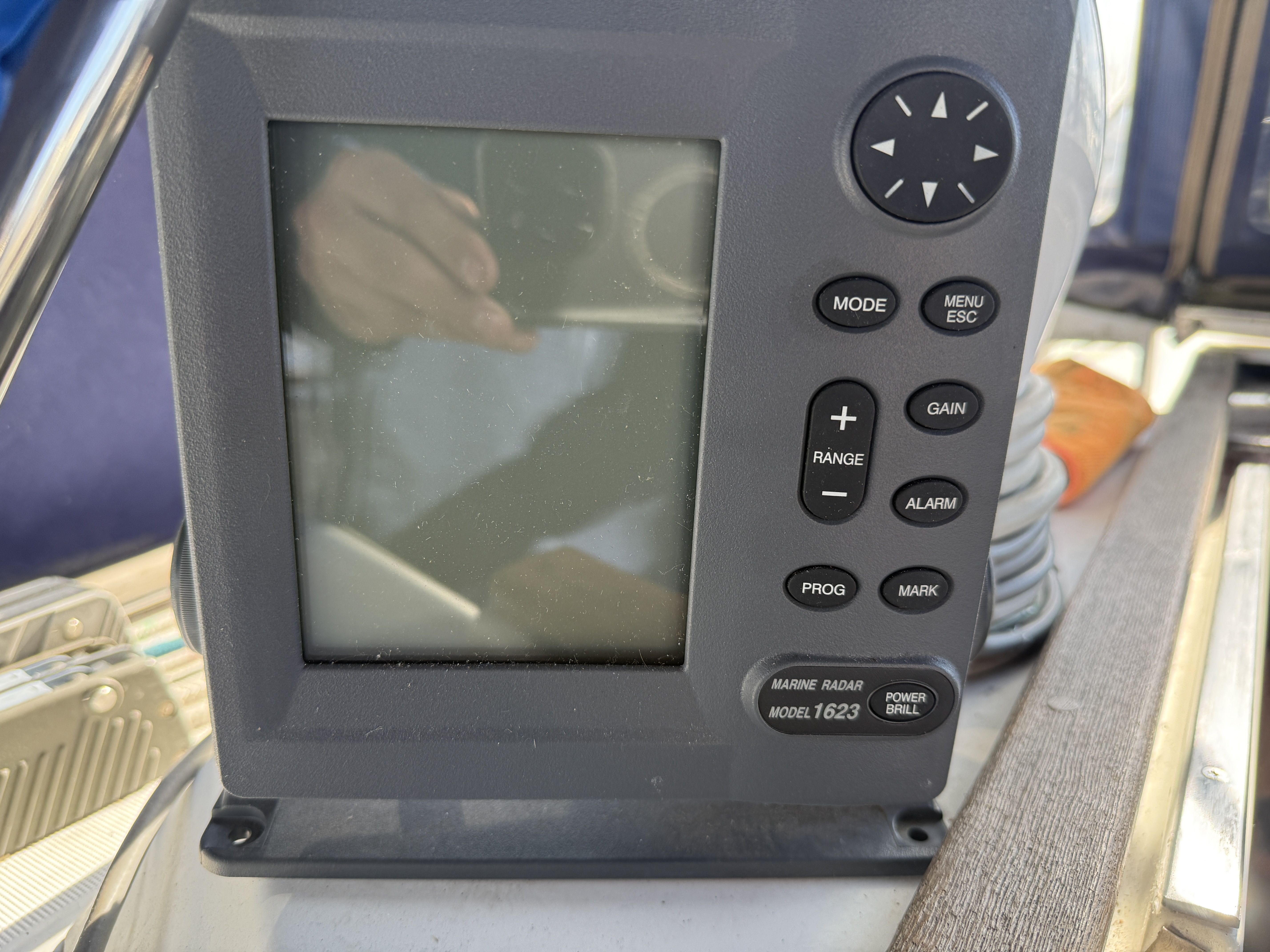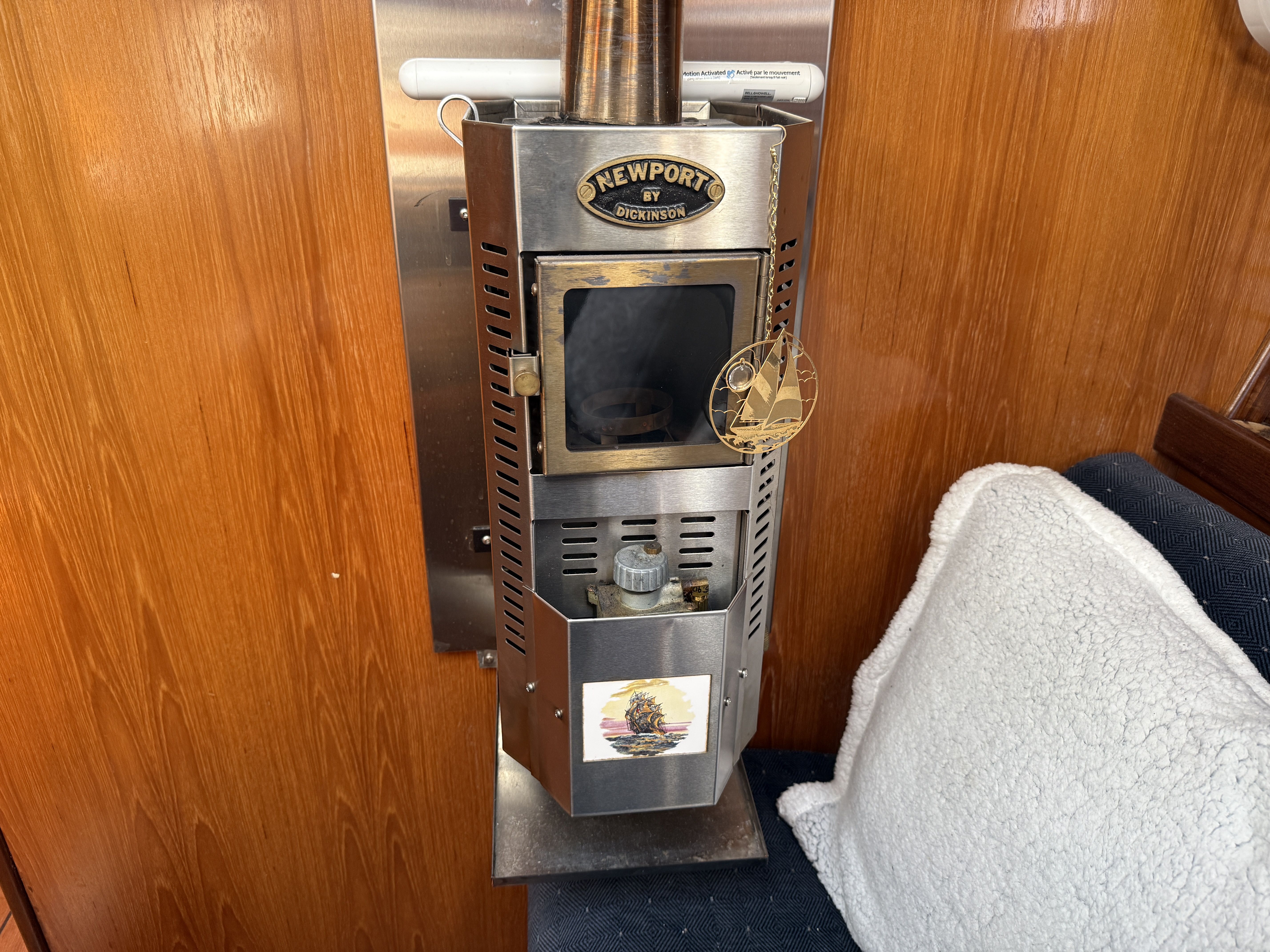 The onboard electronics package includes a Furuno 1623 radar, Raymarine SmartPilot autopilot, Autohelm Tridata instrument, Autohelm wind indicator, and a Raytheon Ray80 VHF. Comfort systems include a NovaCool 12V/24V refrigeration system, hot water tank, Heart Interface charger, and a Sony flat screen TV. The galley is equipped with a Newport by Dickinson heat stove as well as an Eno marine propane stove. Anchoring is supported by a Lewmar Pro-Series 1000 windlass.