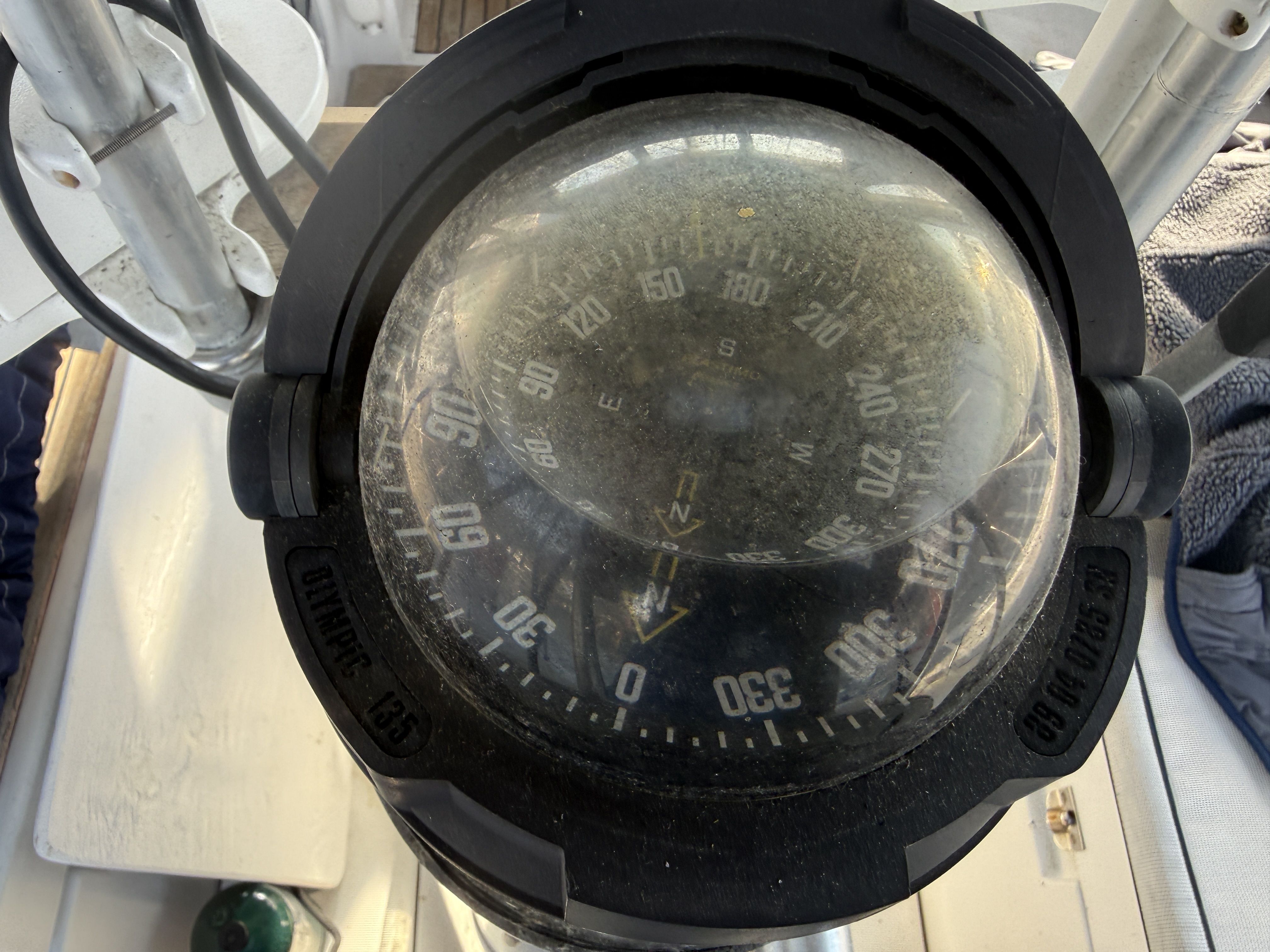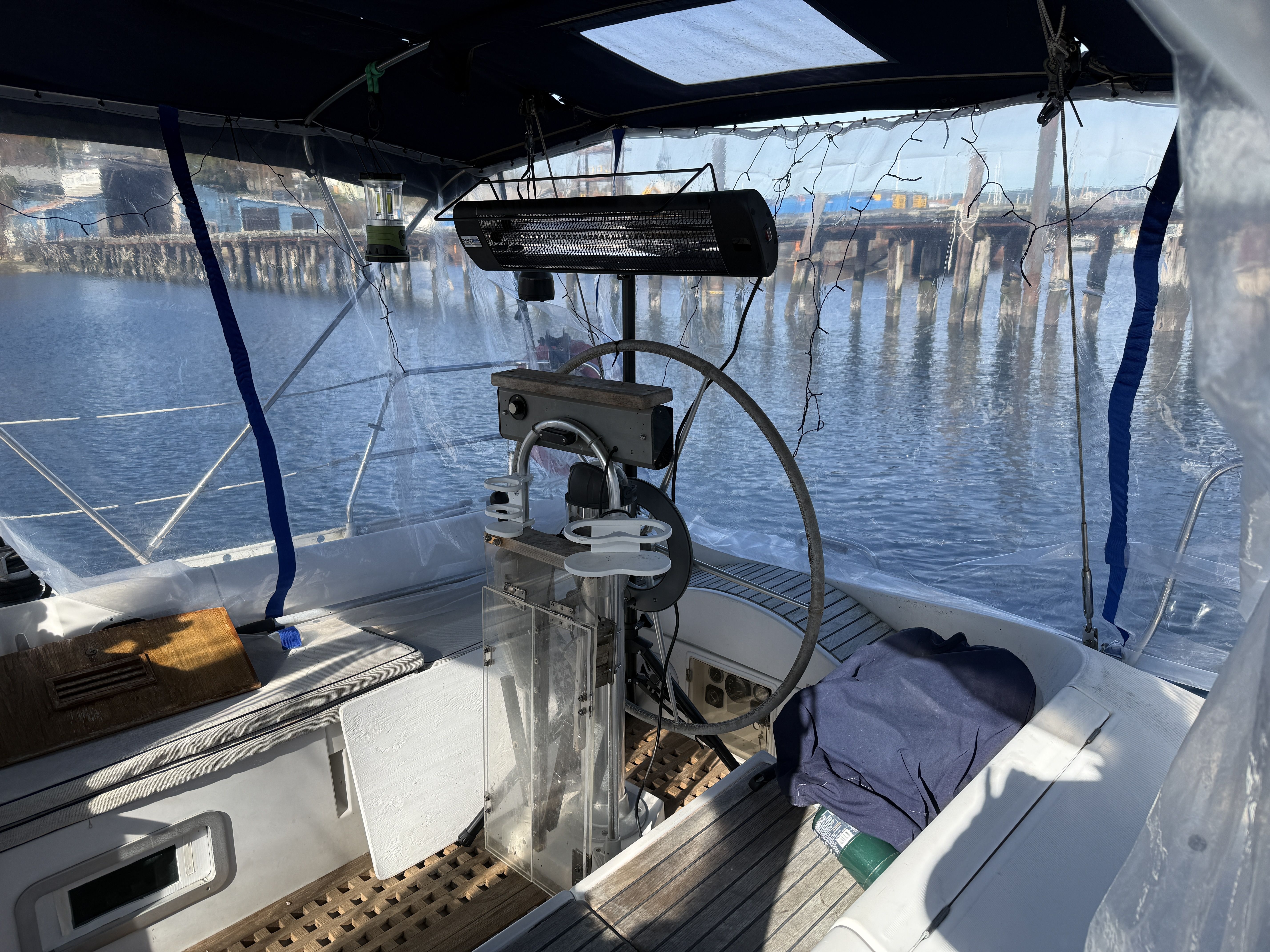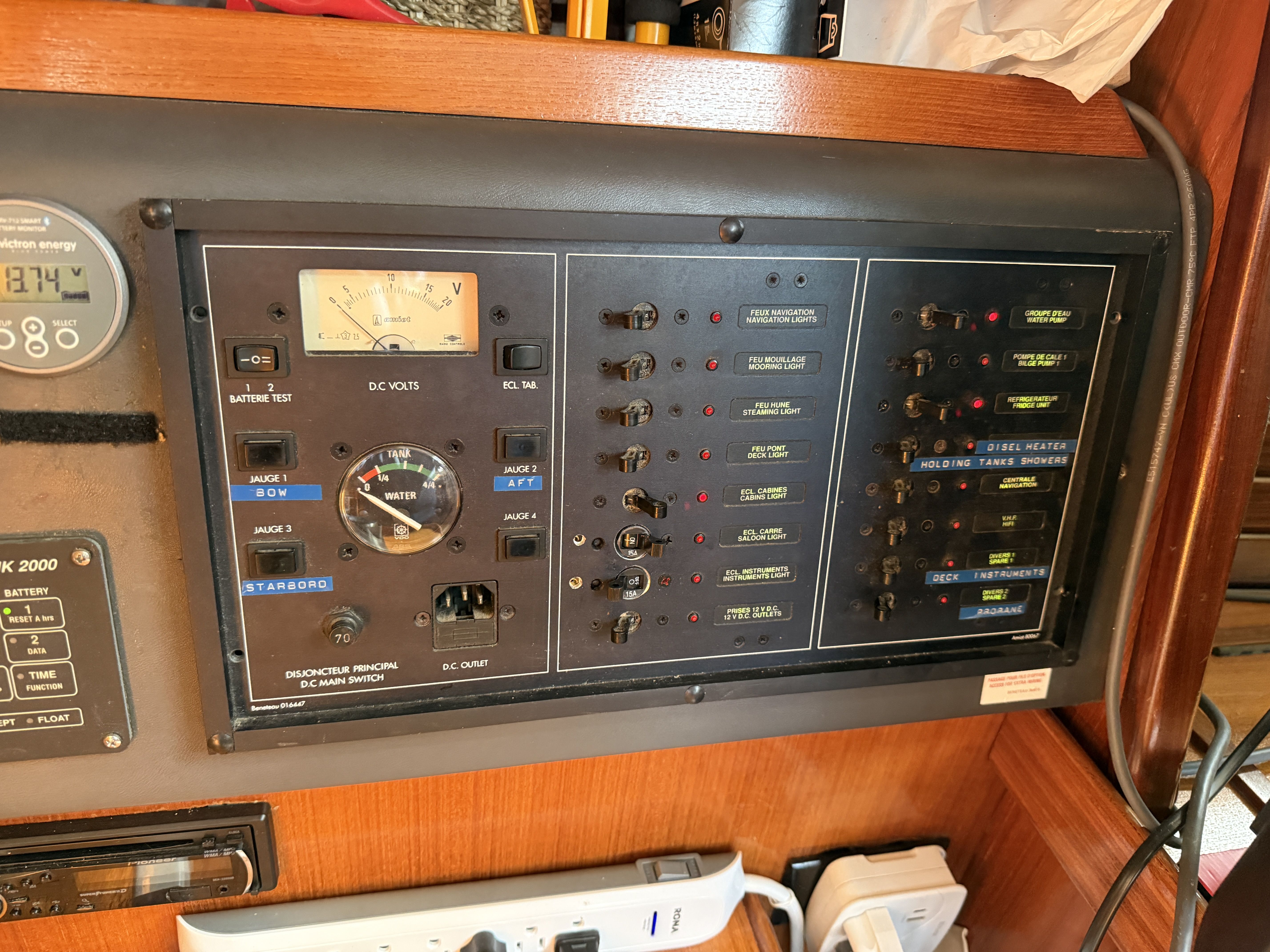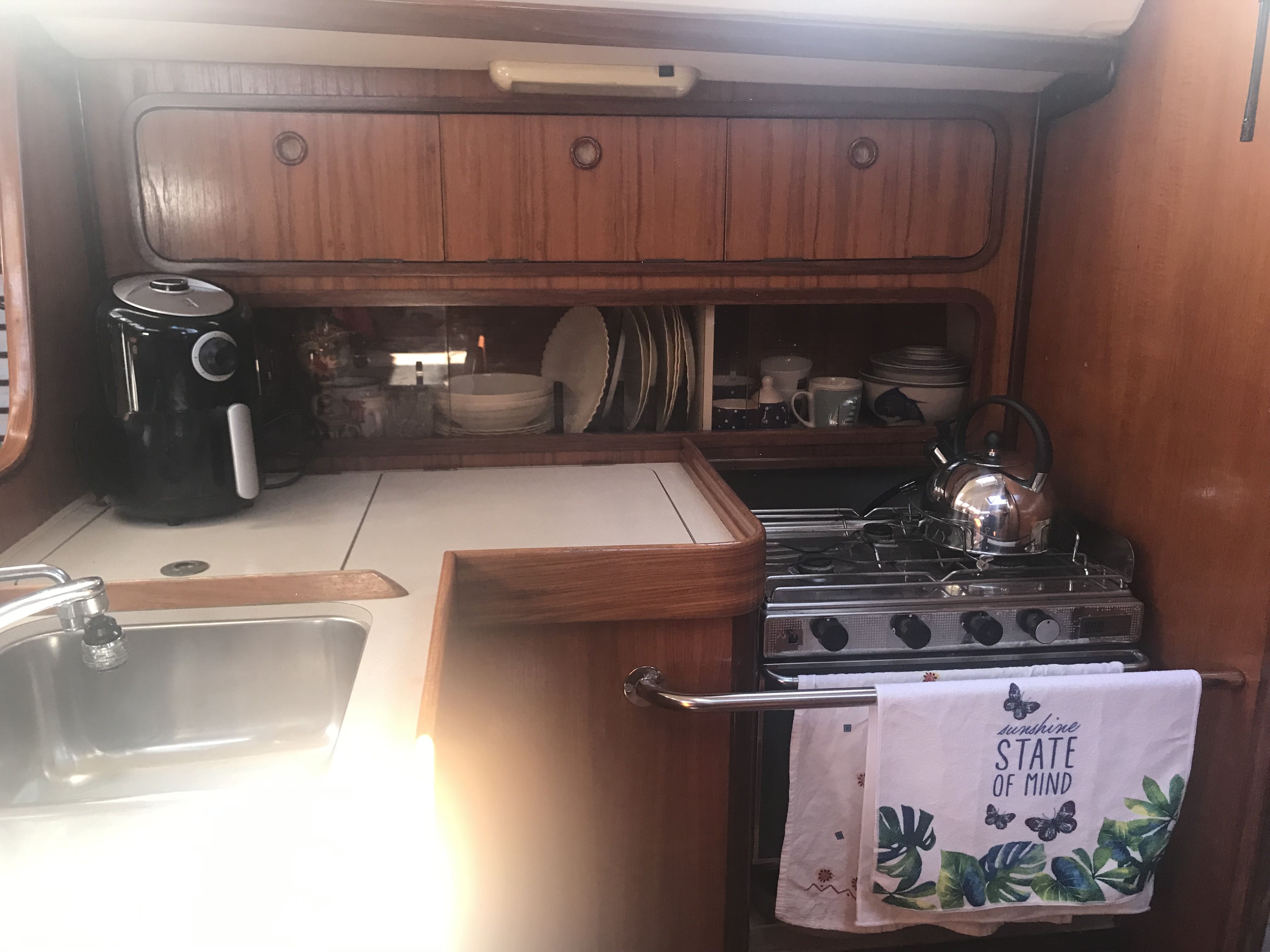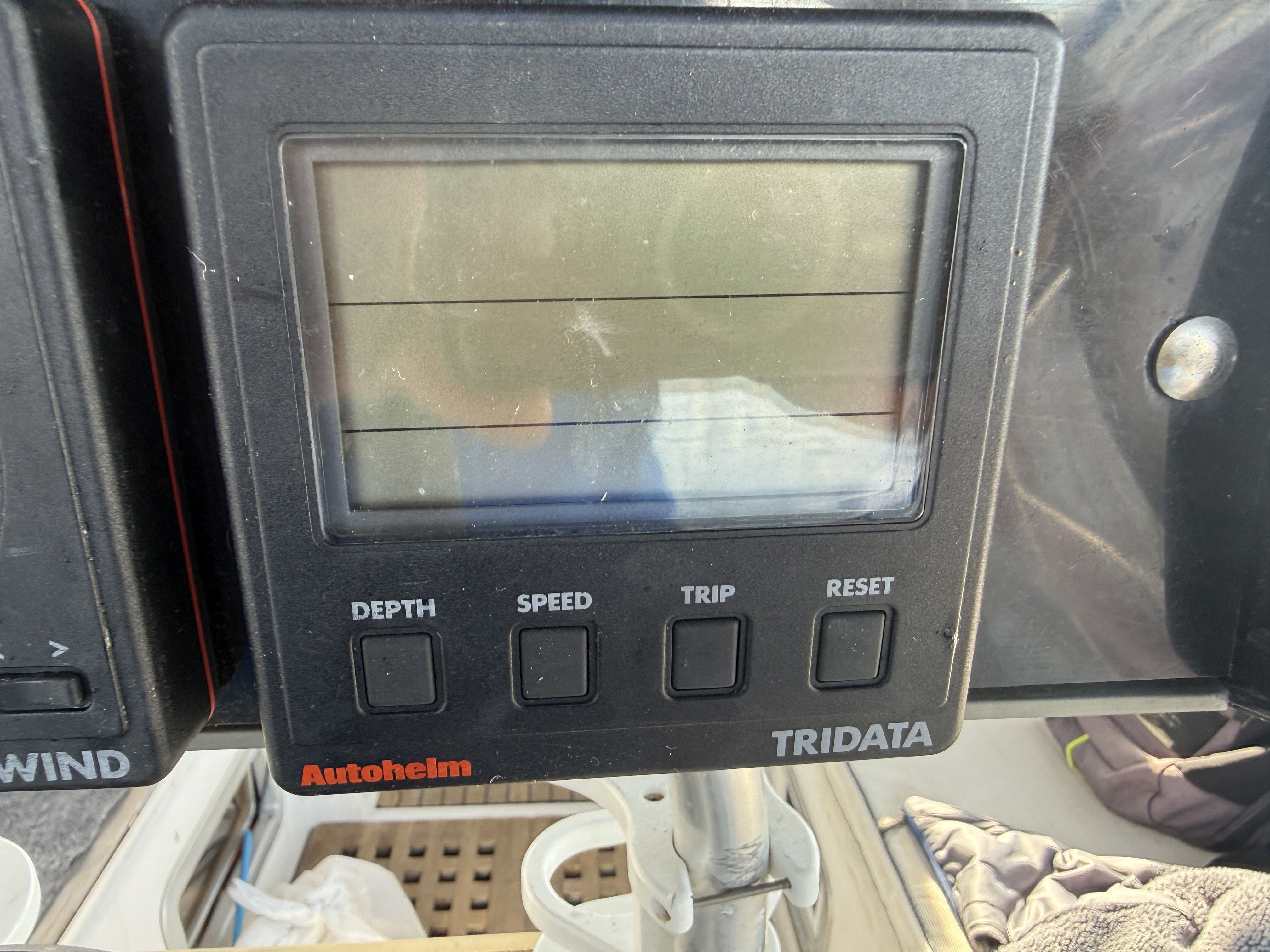 The onboard electronics package includes a Furuno 1623 radar, Raymarine SmartPilot autopilot, Autohelm Tridata instrument, Autohelm wind indicator, and a Raytheon Ray80 VHF. Comfort systems include a NovaCool 12V/24V refrigeration system, hot water tank, Heart Interface charger, and a Sony flat screen TV. The galley is equipped with a Newport by Dickinson heat stove as well as an Eno marine propane stove. Anchoring is supported by a Lewmar Pro-Series 1000 windlass.