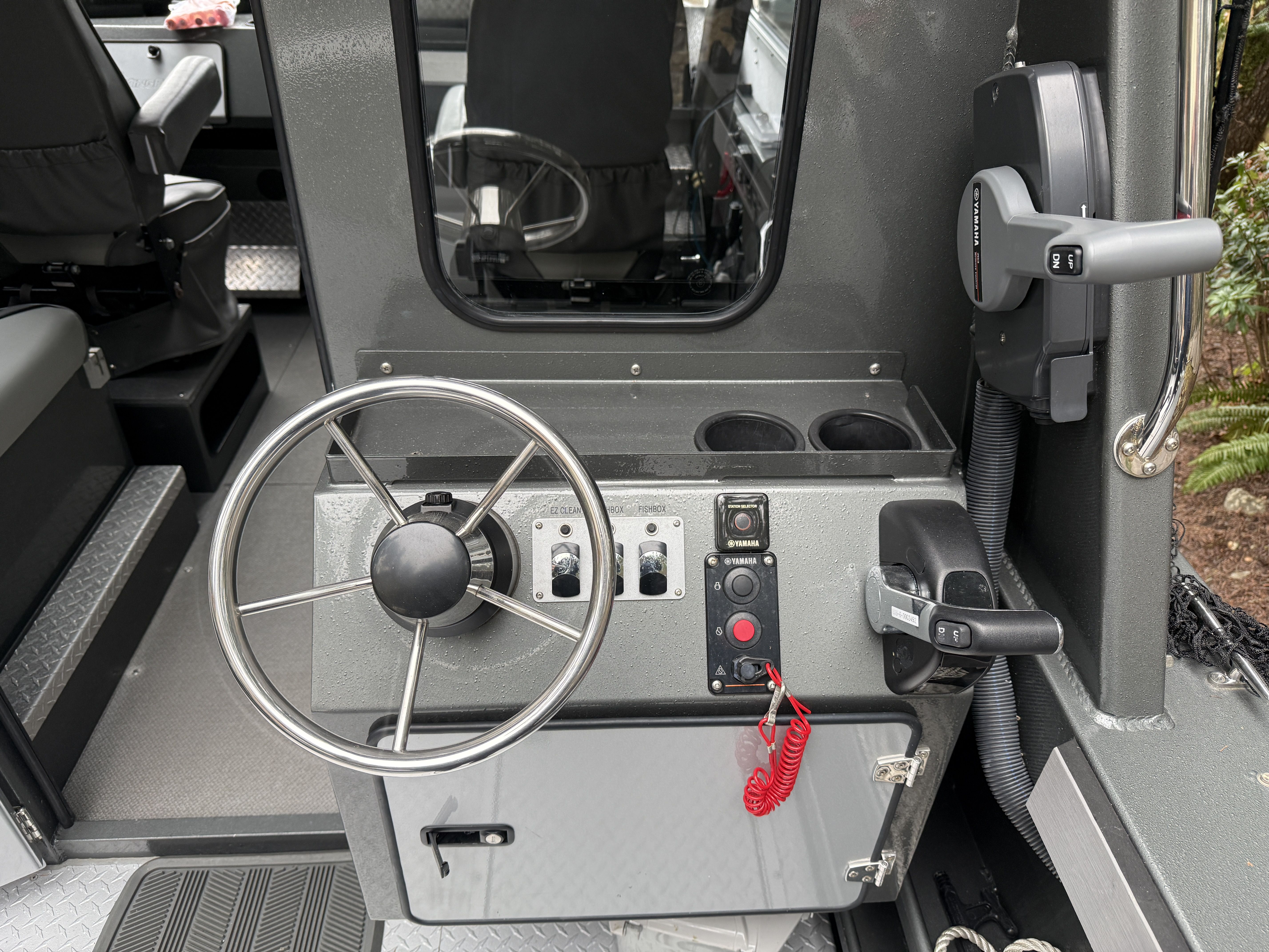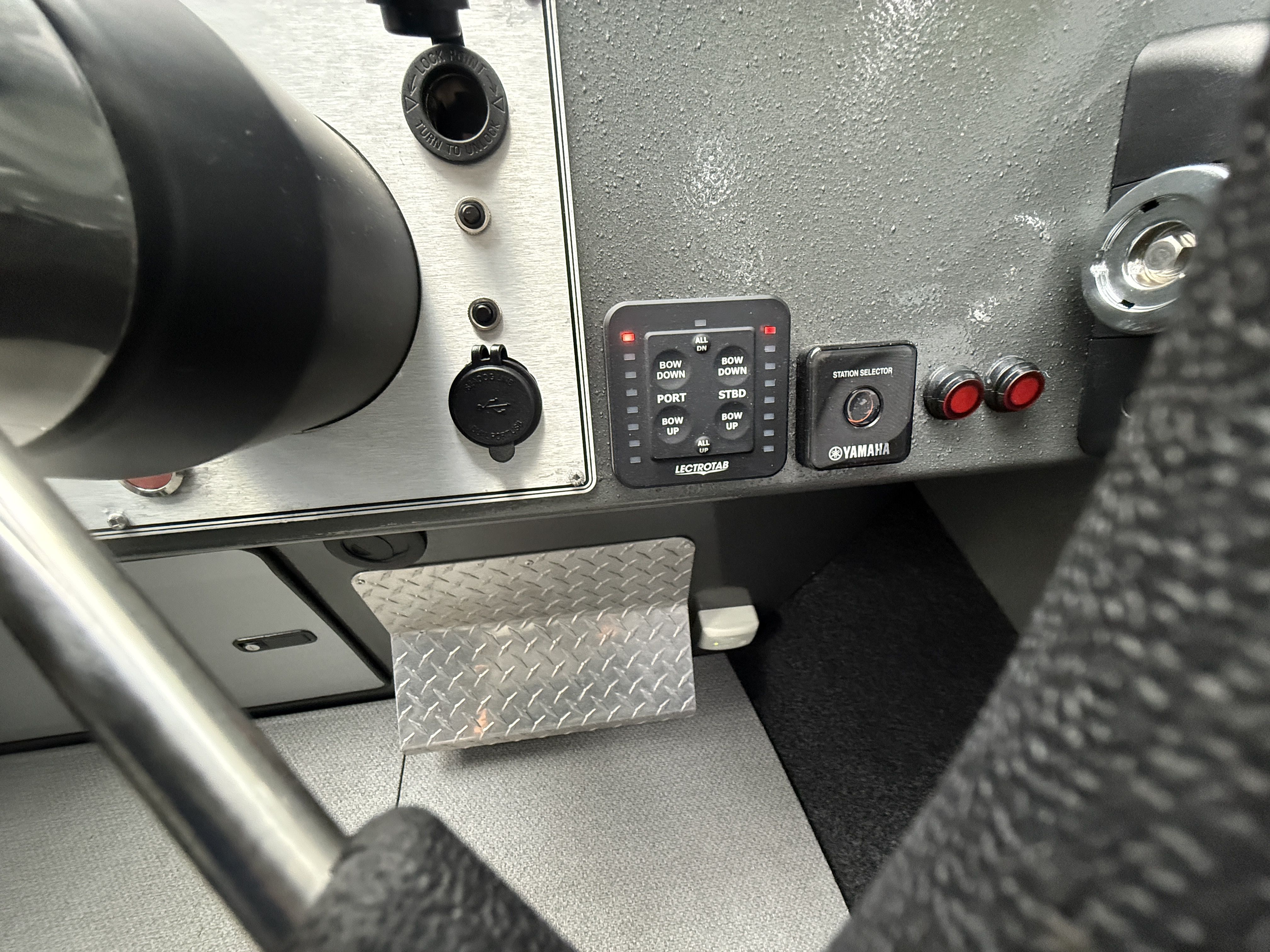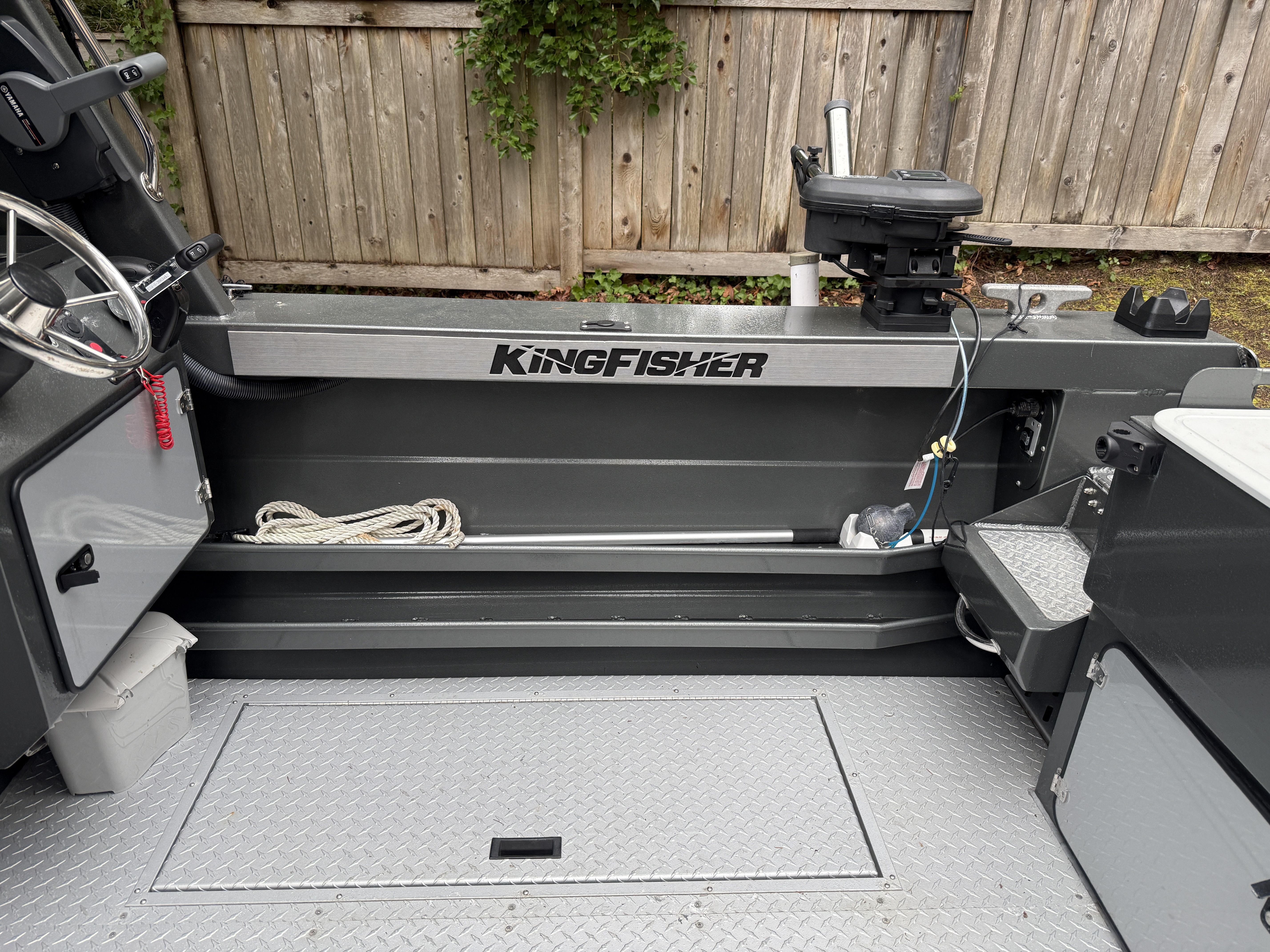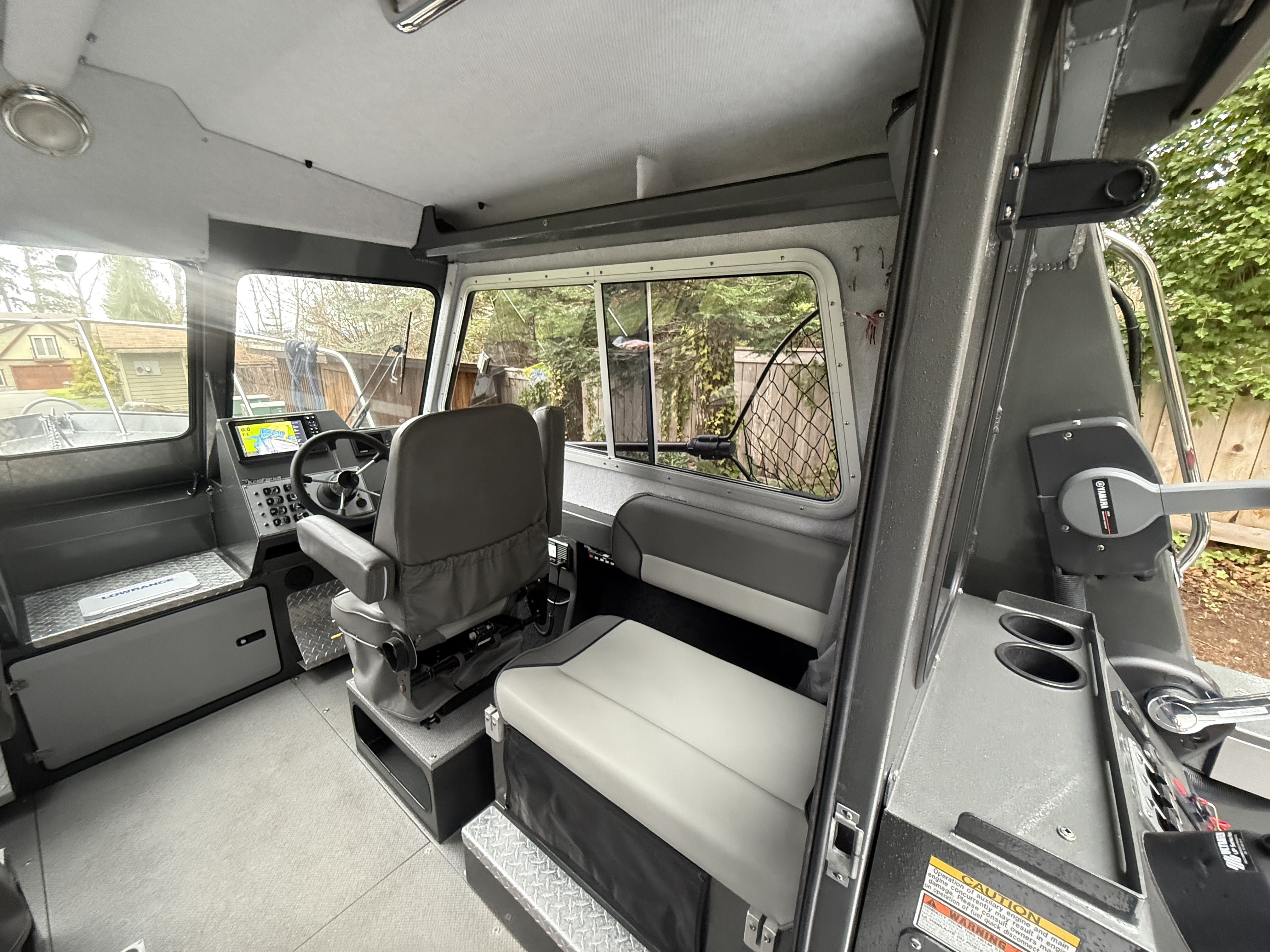 The Yamaha 200 delivers strong, reliable performance and features dual helm stations, allowing full control of the main engine from both the interior helm and the aft helm station. The 9.9HP high-thrust kicker is controlled from the aft helm station and is equipped with a TrollMaster Pro 3 system for precise trolling speed control.