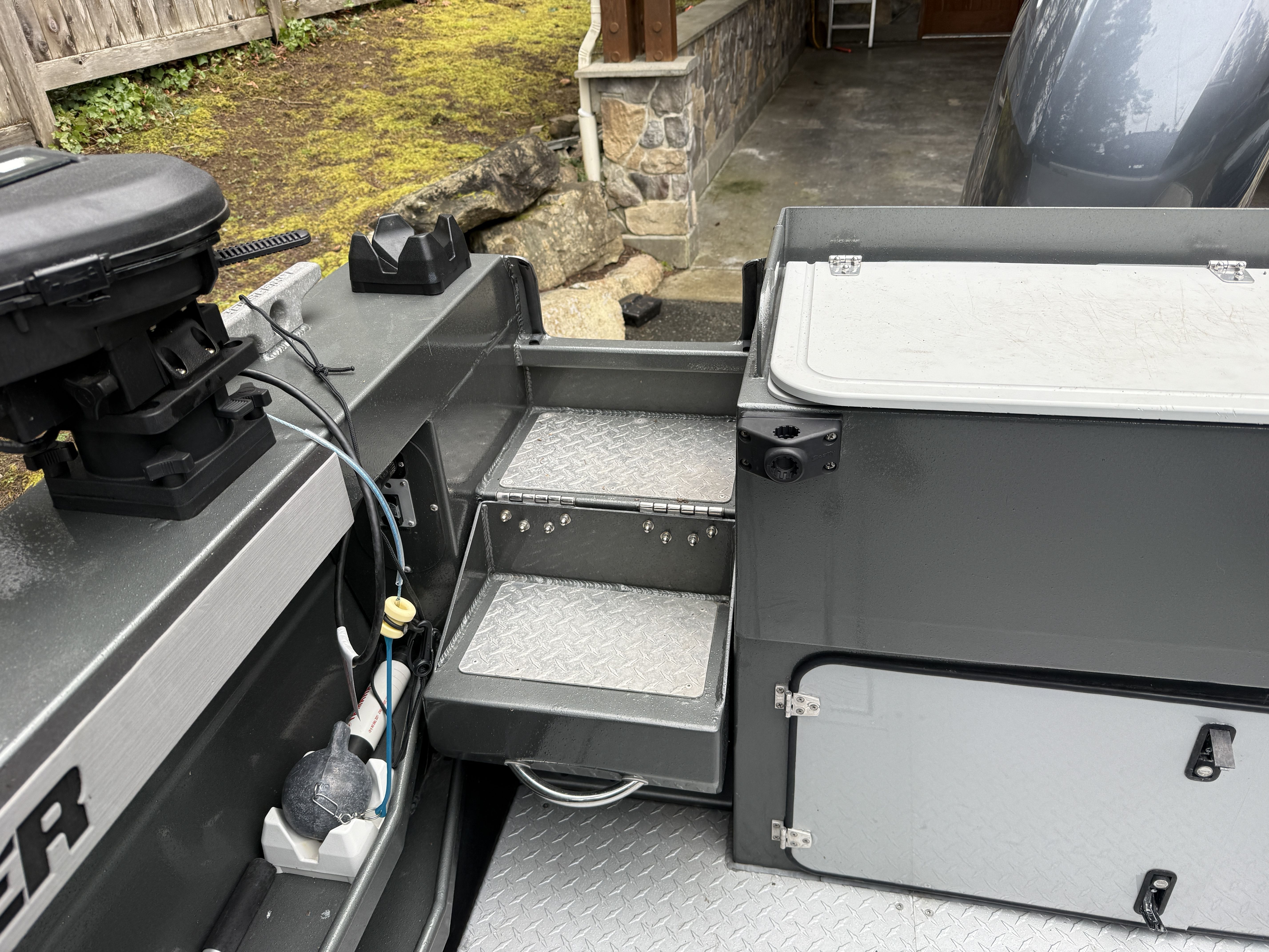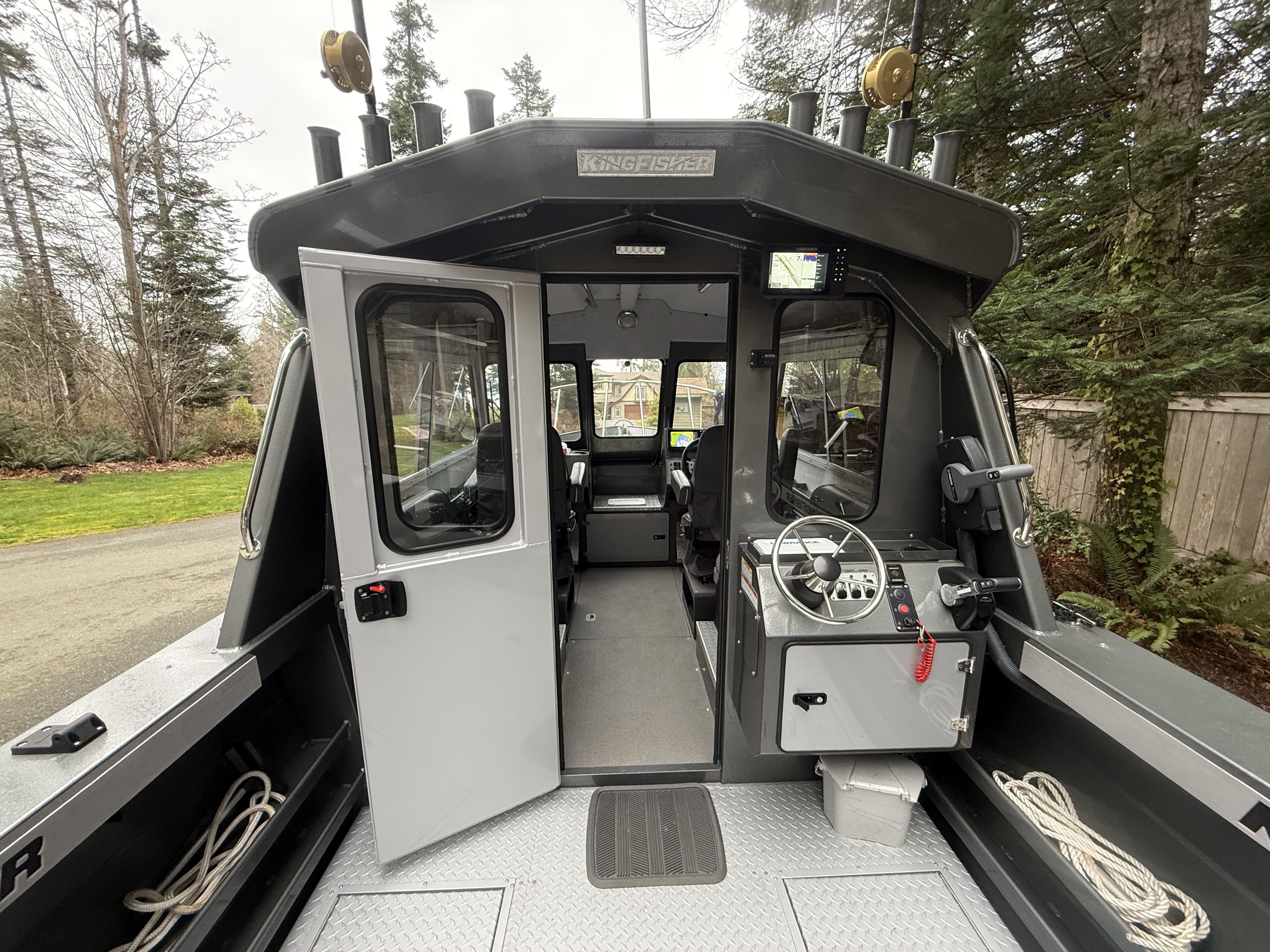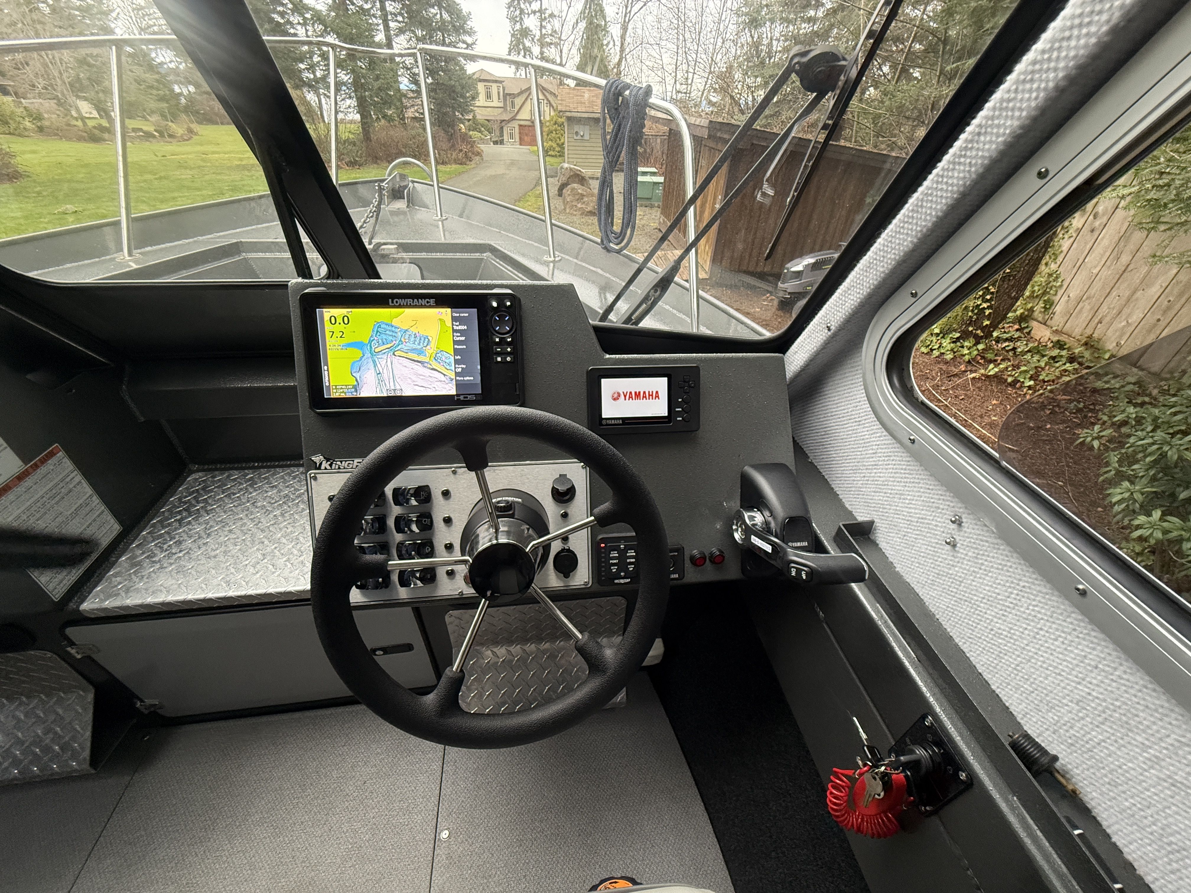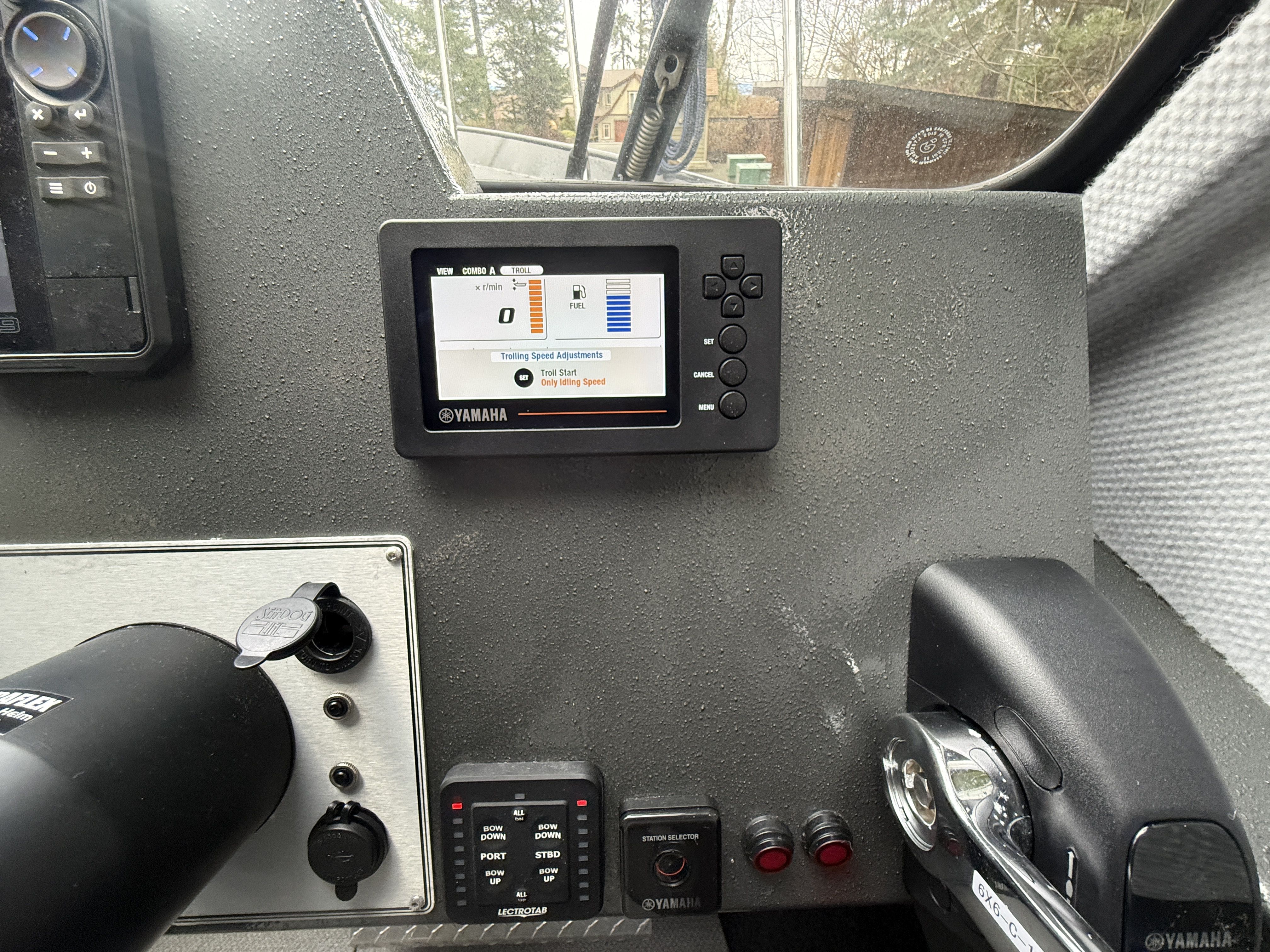 The Yamaha 200 delivers strong, reliable performance and features dual helm stations, allowing full control of the main engine from both the interior helm and the aft helm station. The 9.9HP high-thrust kicker is controlled from the aft helm station and is equipped with a TrollMaster Pro 3 system for precise trolling speed control.