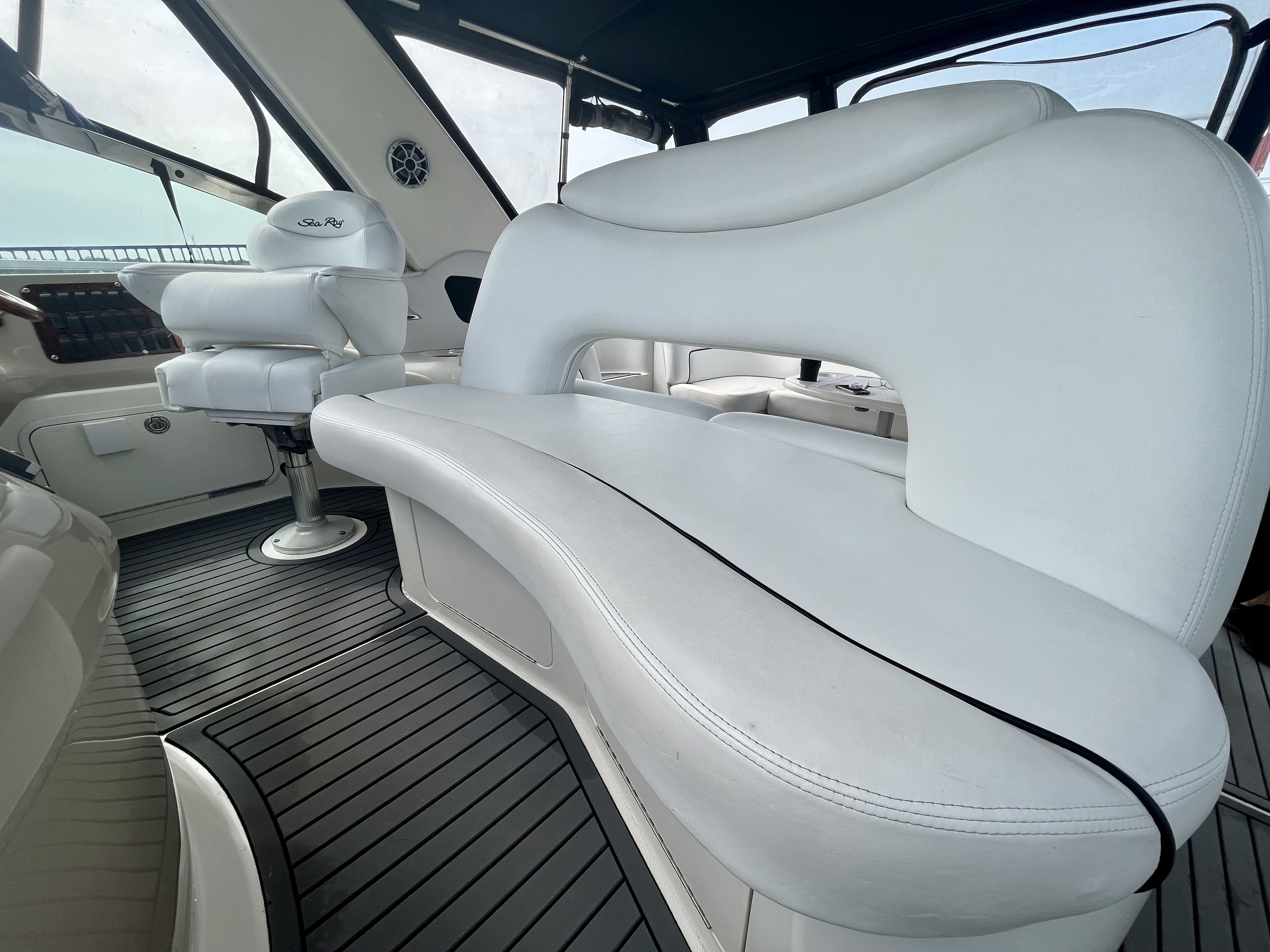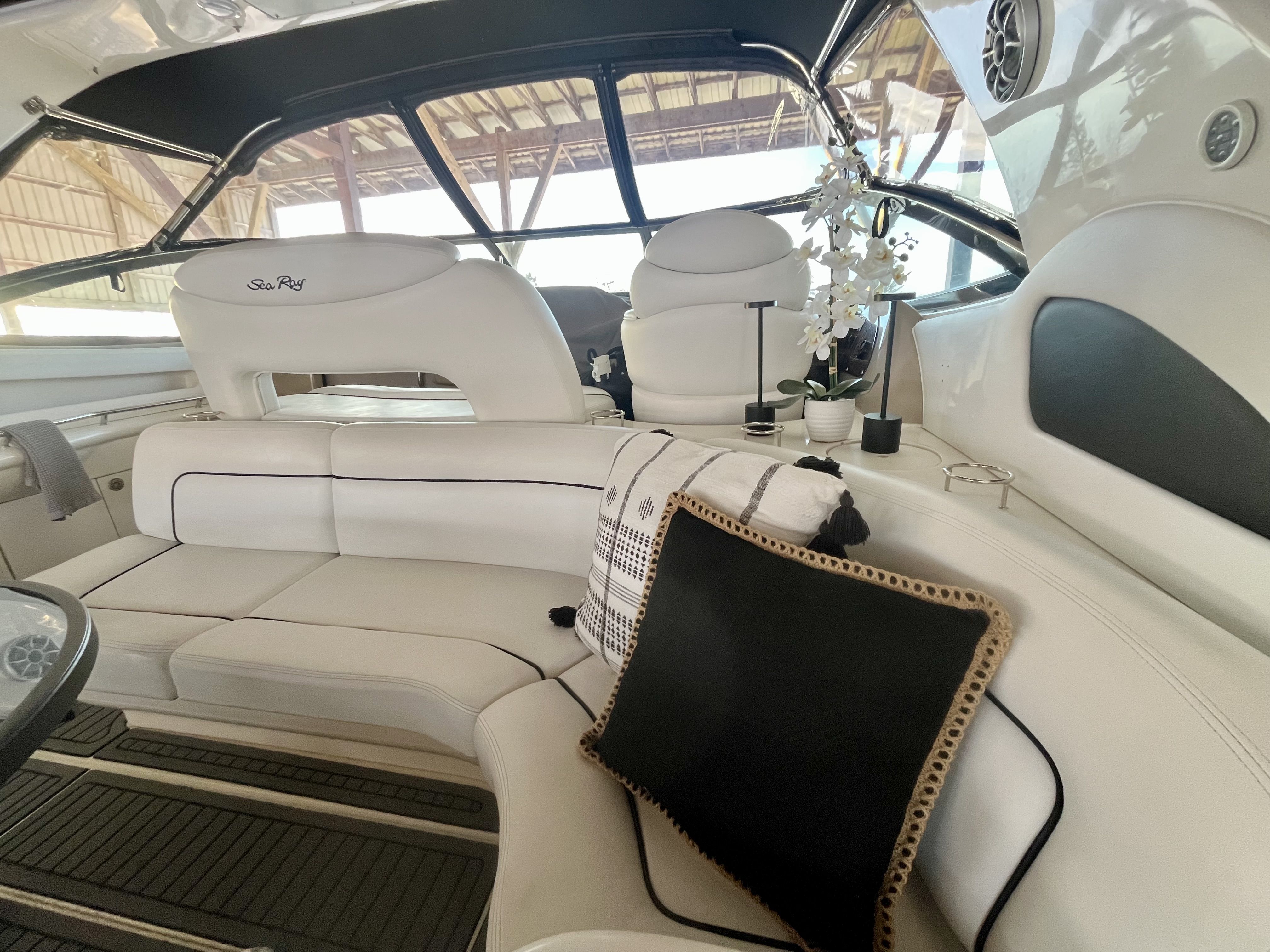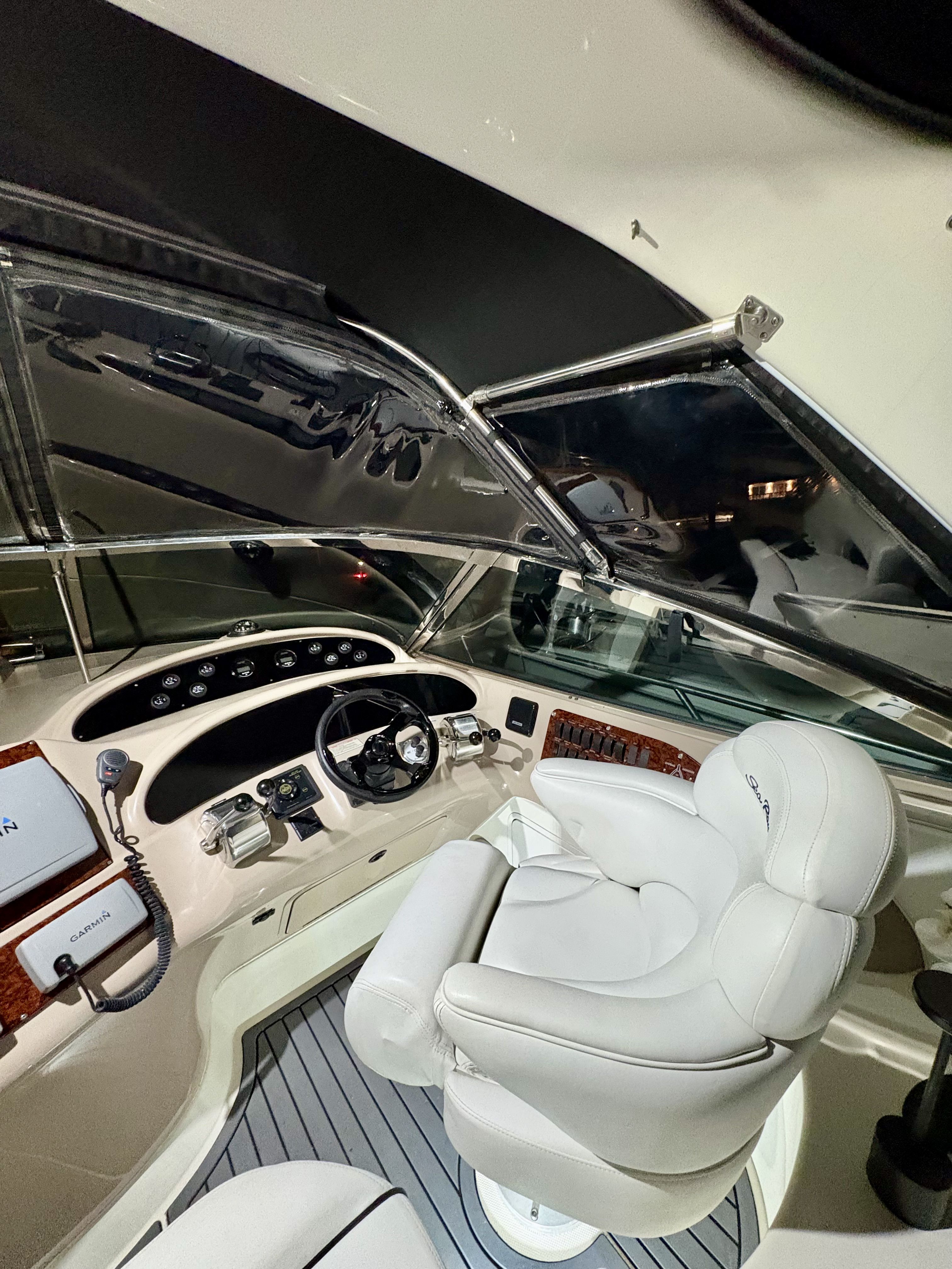 Sea Ray Boats built this fiberglass cruiser with a resin reinforced hull, fiberglass stringers, and composite cored decks. The deck to hull connection is well bonded, and the deck hardware and fittings are secure.