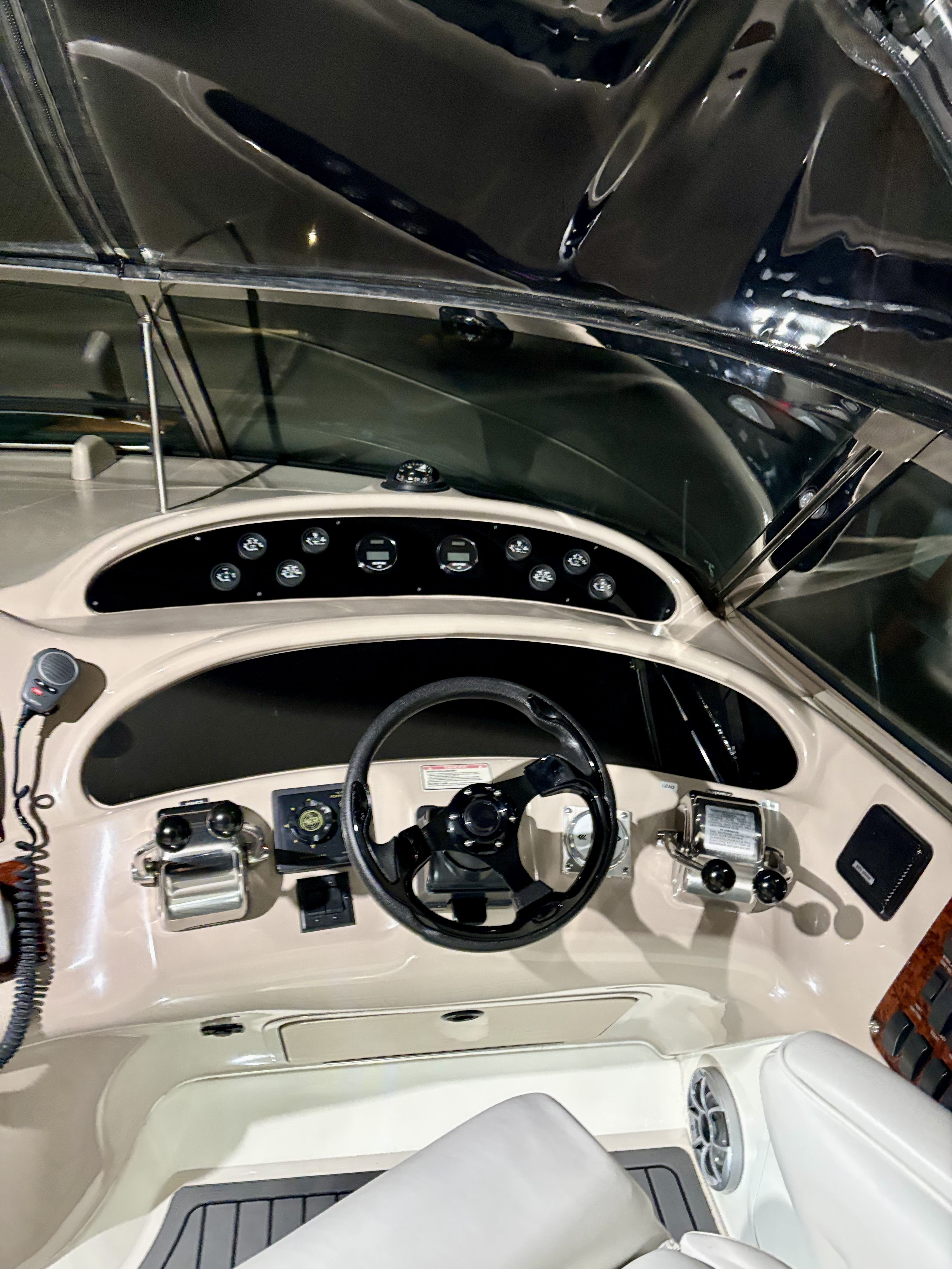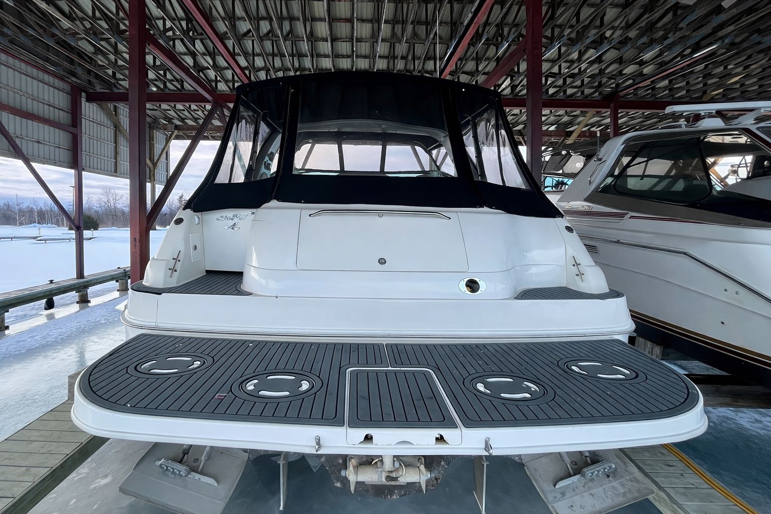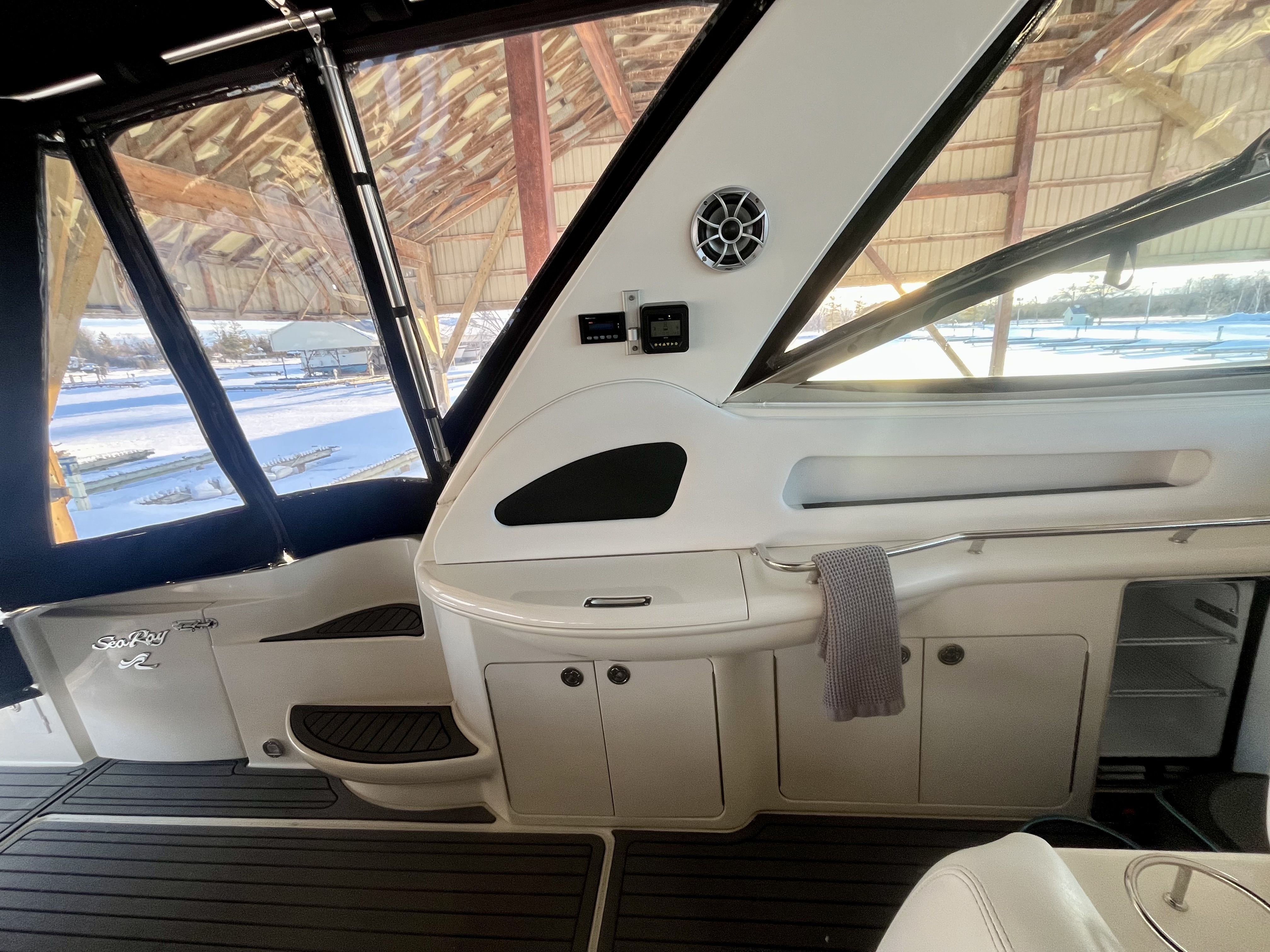 Sea Ray Boats built this fiberglass cruiser with a resin reinforced hull, fiberglass stringers, and composite cored decks. The deck to hull connection is well bonded, and the deck hardware and fittings are secure.