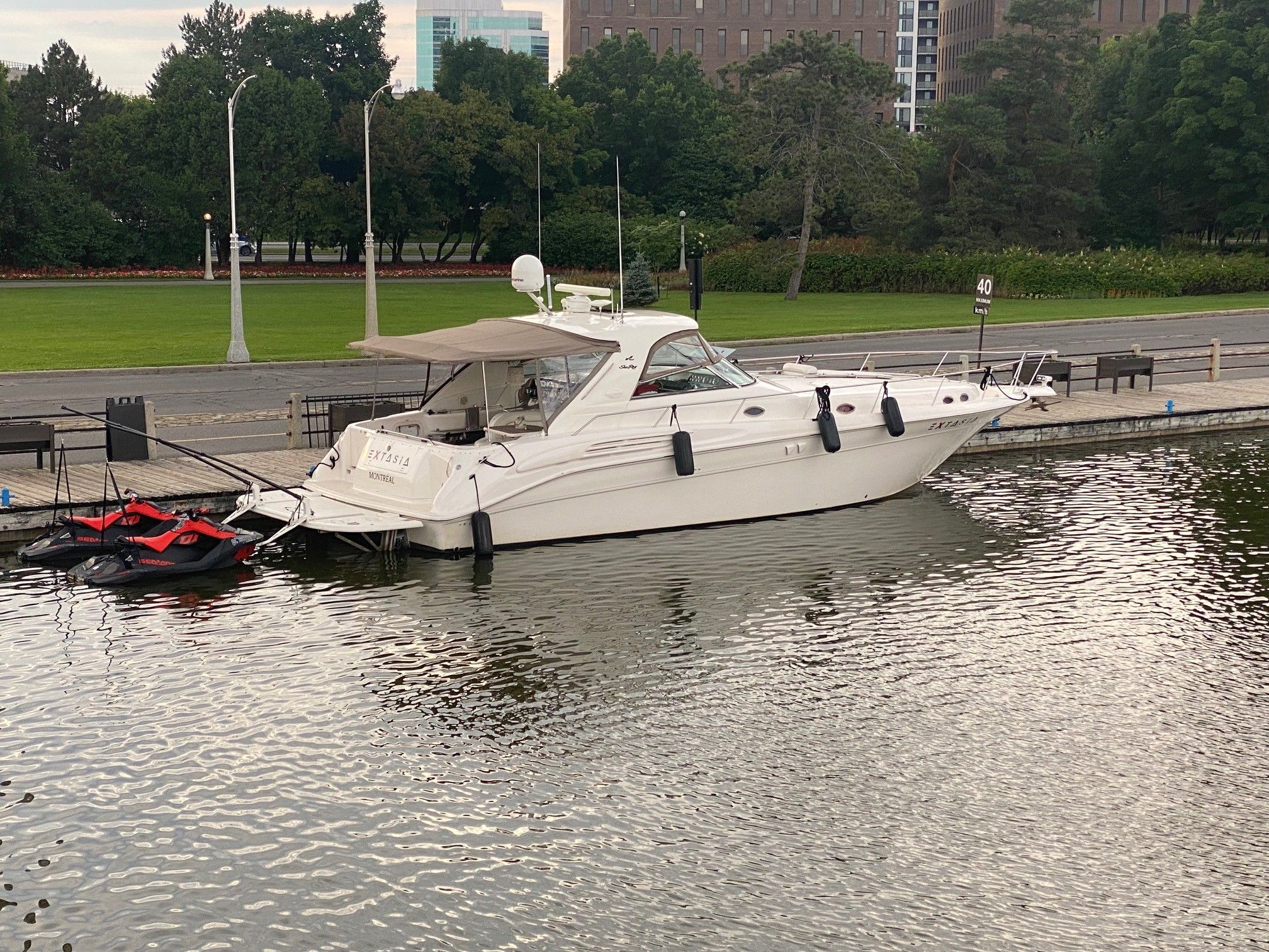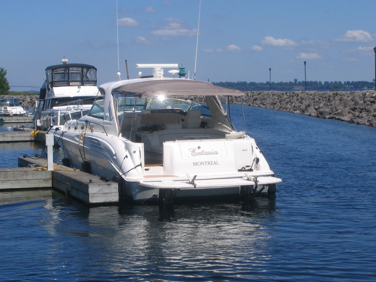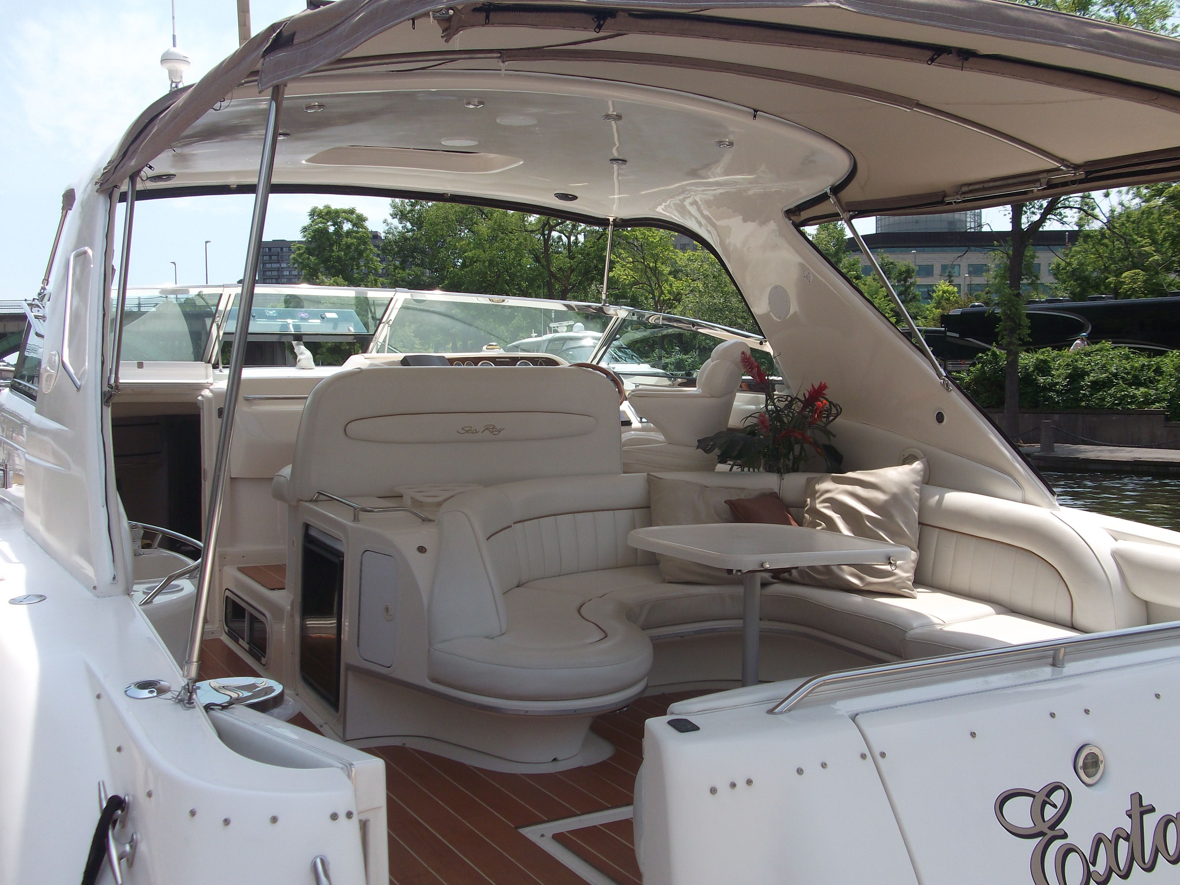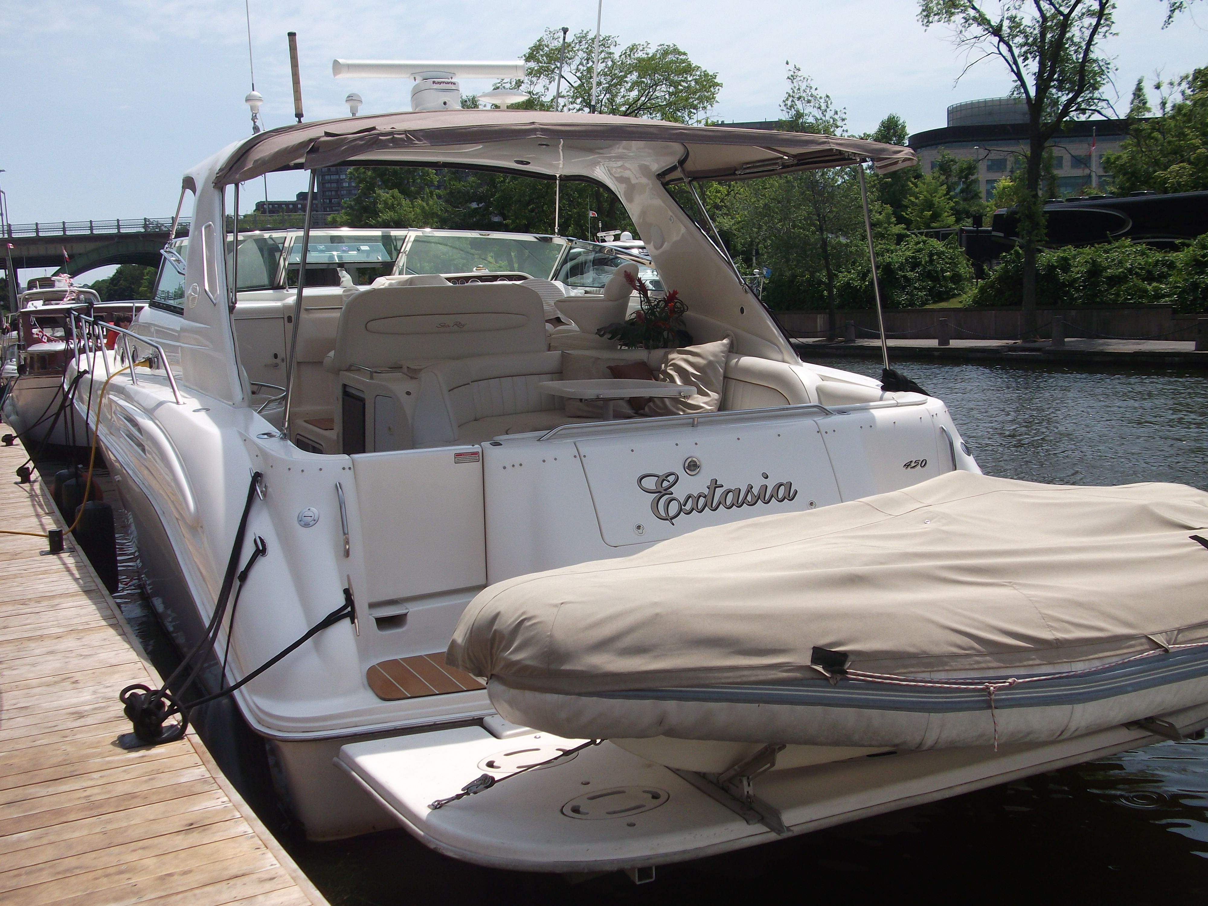 Sea Ray is the undisputed leader in the luxury sport cruiser market, known for blending high-performance hulls with sophisticated interior design. The 450 Sundancer is a cornerstone of their fleet, offering a massive beam and a build quality that has made it one of the most sought-after express cruisers in North America. This model is specifically engineered for those who demand a yacht that can handle open water with grace while providing a five-star experience at the dock. The layout of the 450 Sundancer is designed for seamless entertaining and long-range comfort, featuring a wide-open salon with hardwood flooring, a full galley, and two private staterooms. This vessel is a rare freshwater find, powered by Twin Caterpillar 3116 Diesel engines and equipped with a Bow Thruster for effortless docking. The addition of a permanent custom Hardtop with a sunroof and a TNT Hydraulic Swim Platform elevates this yacht far beyond the standard factory specifications. EXTASIA has been under the care of the same owner since 2007 and has been used exclusively in Canadian fresh waters. The boat has undergone extensive professional structural and cosmetic updates, including a full resealing of all hatches and portholes (2024), new non-skid decking (2023-2024), and a refreshed gelcoat on the port side and hardtop. With a clean, odor-free interior, washer/dryer unit, and a Westerbeke 8.0 kW generator, this boat is perfectly equipped for extended cruising. Currently stored indoors in the 1000 Islands and ready for its next chapter in Valleyfield as of spring 2026.