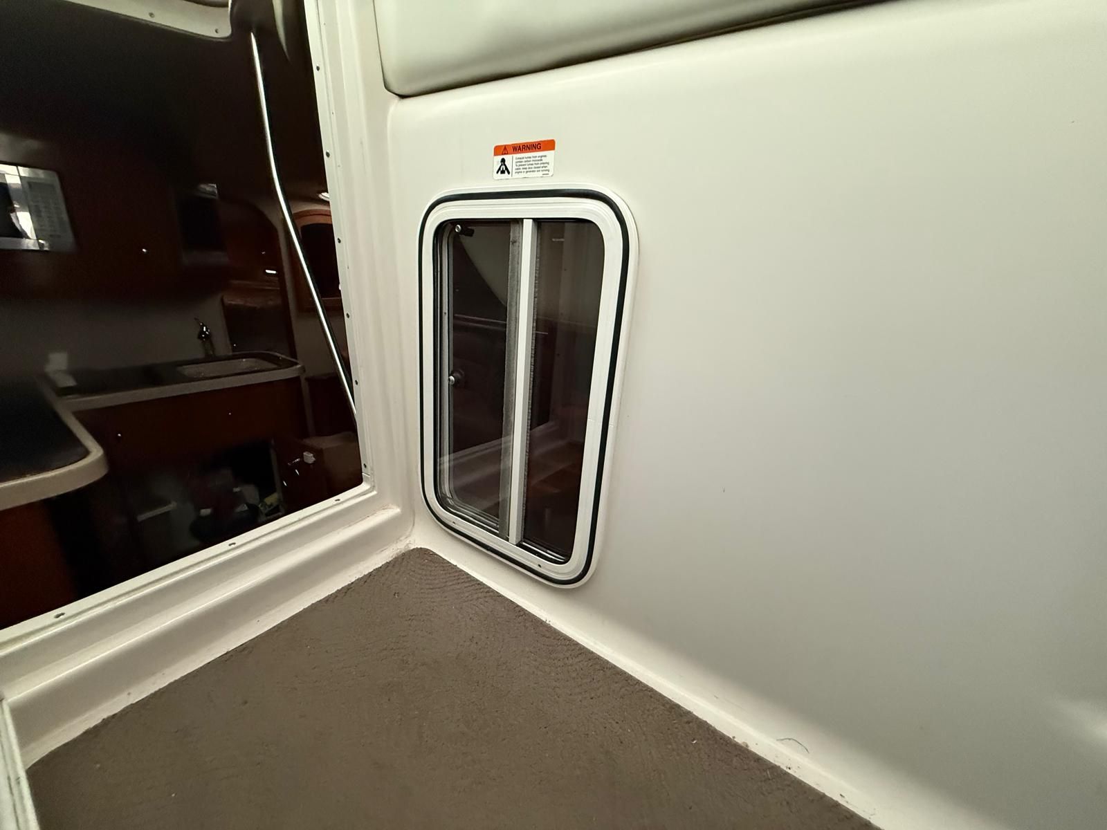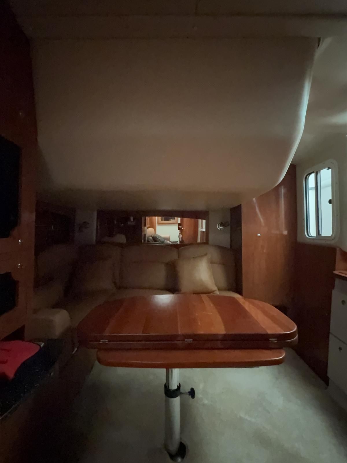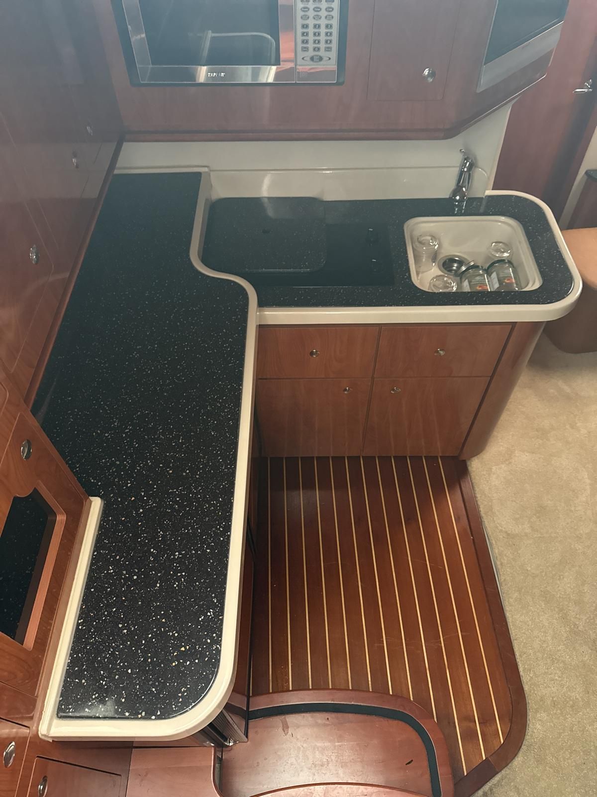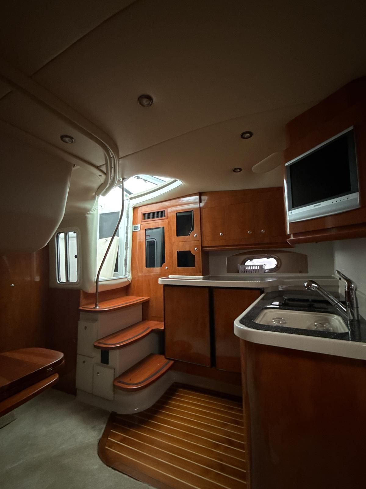 Below deck, the cabin features beautiful teak cabinetry and abundant storage. The galley is fully equipped with an electric cooktop, large refrigerator/freezer, microwave, sink, and TV. The mid-cabin lounge converts to a bed with a privacy curtain, while the forward cabin offers a large berth, hanging locker, storage, TV, and opening hatch. The head and shower are separate, and the vessel is equipped with air conditioning and a Kohler generator, offering all the comforts of home on the water. A clean, well-kept cruiser ready for its next owner to enjoy.