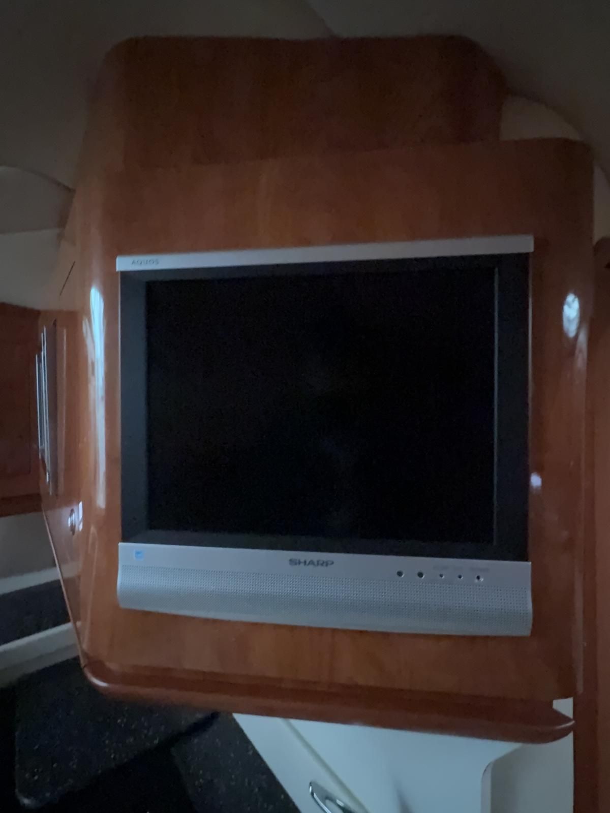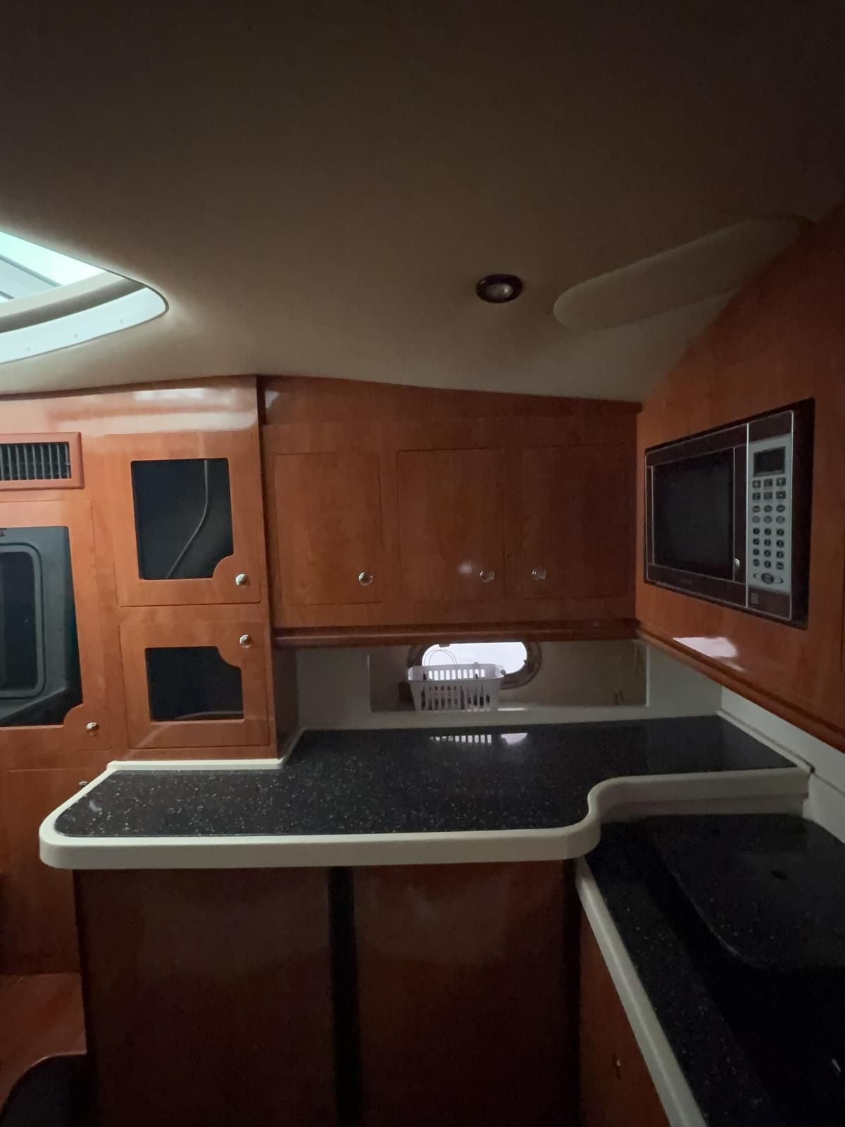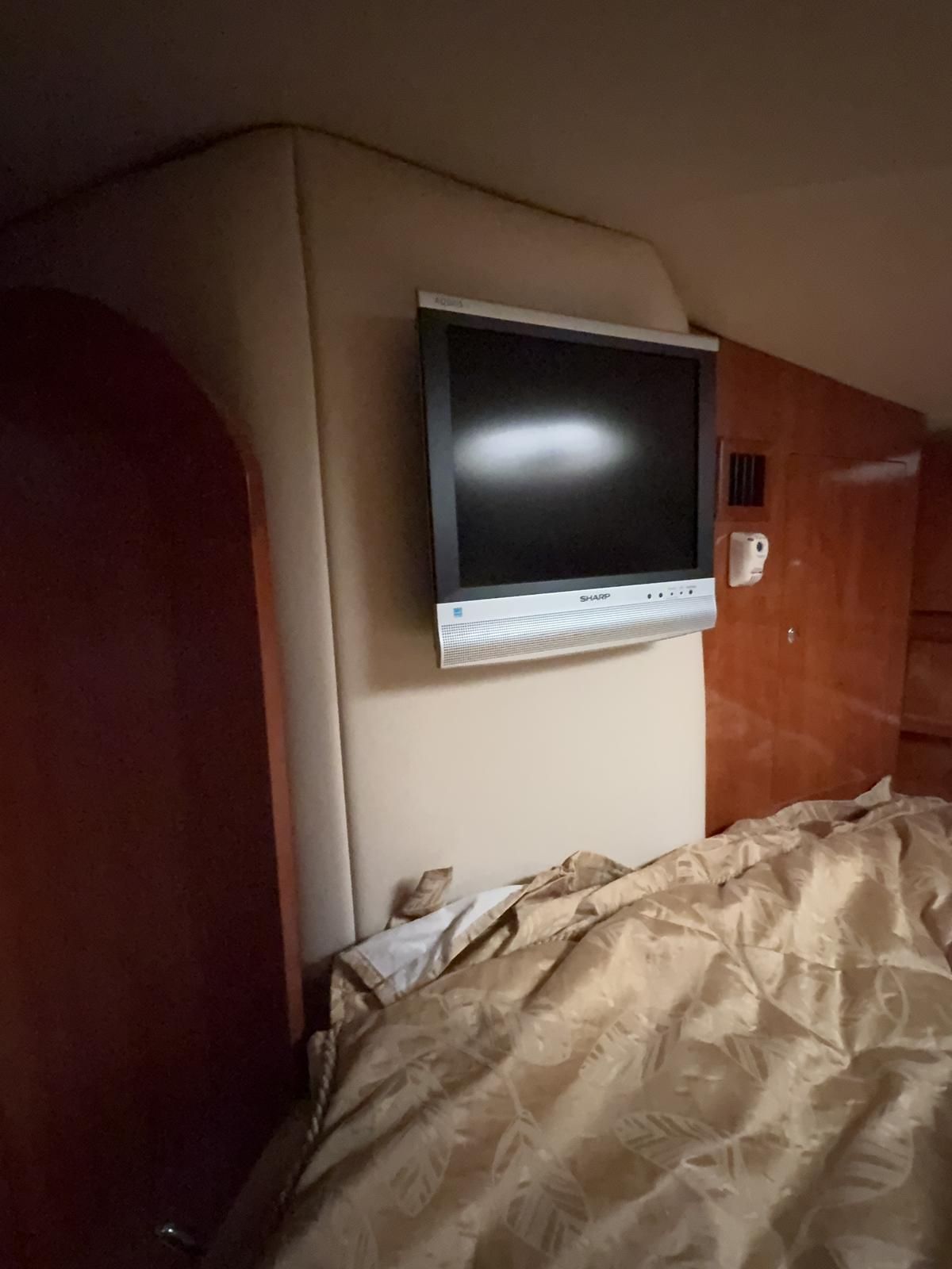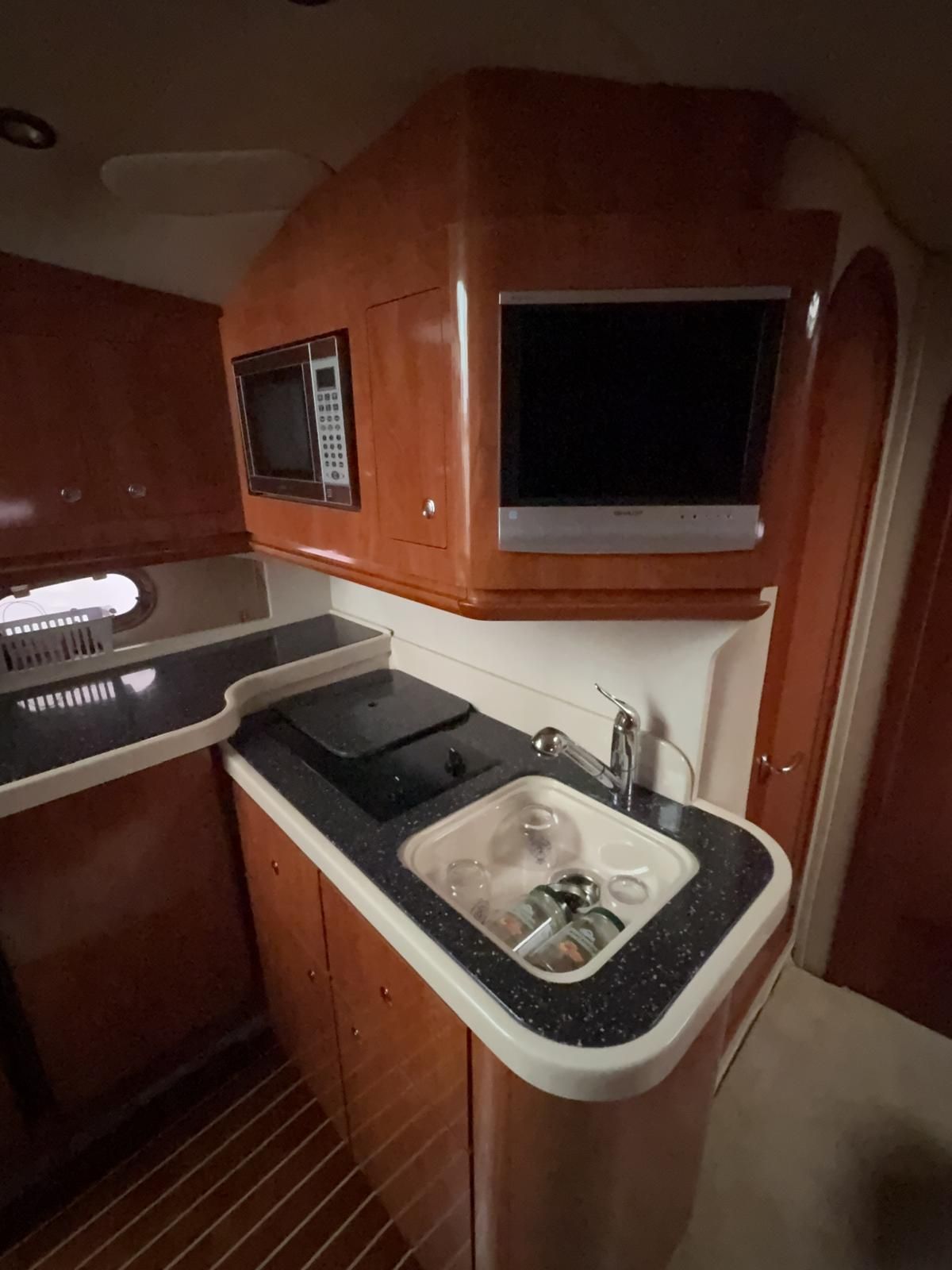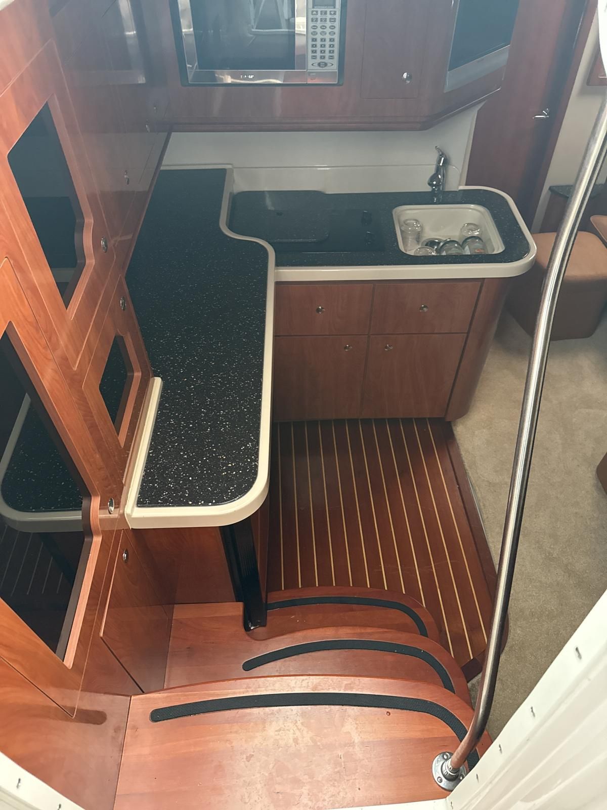Below deck, the cabin features beautiful teak cabinetry and abundant storage. The galley is fully equipped with an electric cooktop, large refrigerator/freezer, microwave, sink, and TV. The mid-cabin lounge converts to a bed with a privacy curtain, while the forward cabin offers a large berth, hanging locker, storage, TV, and opening hatch. The head and shower are separate, and the vessel is equipped with air conditioning and a Kohler generator, offering all the comforts of home on the water. A clean, well-kept cruiser ready for its next owner to enjoy.