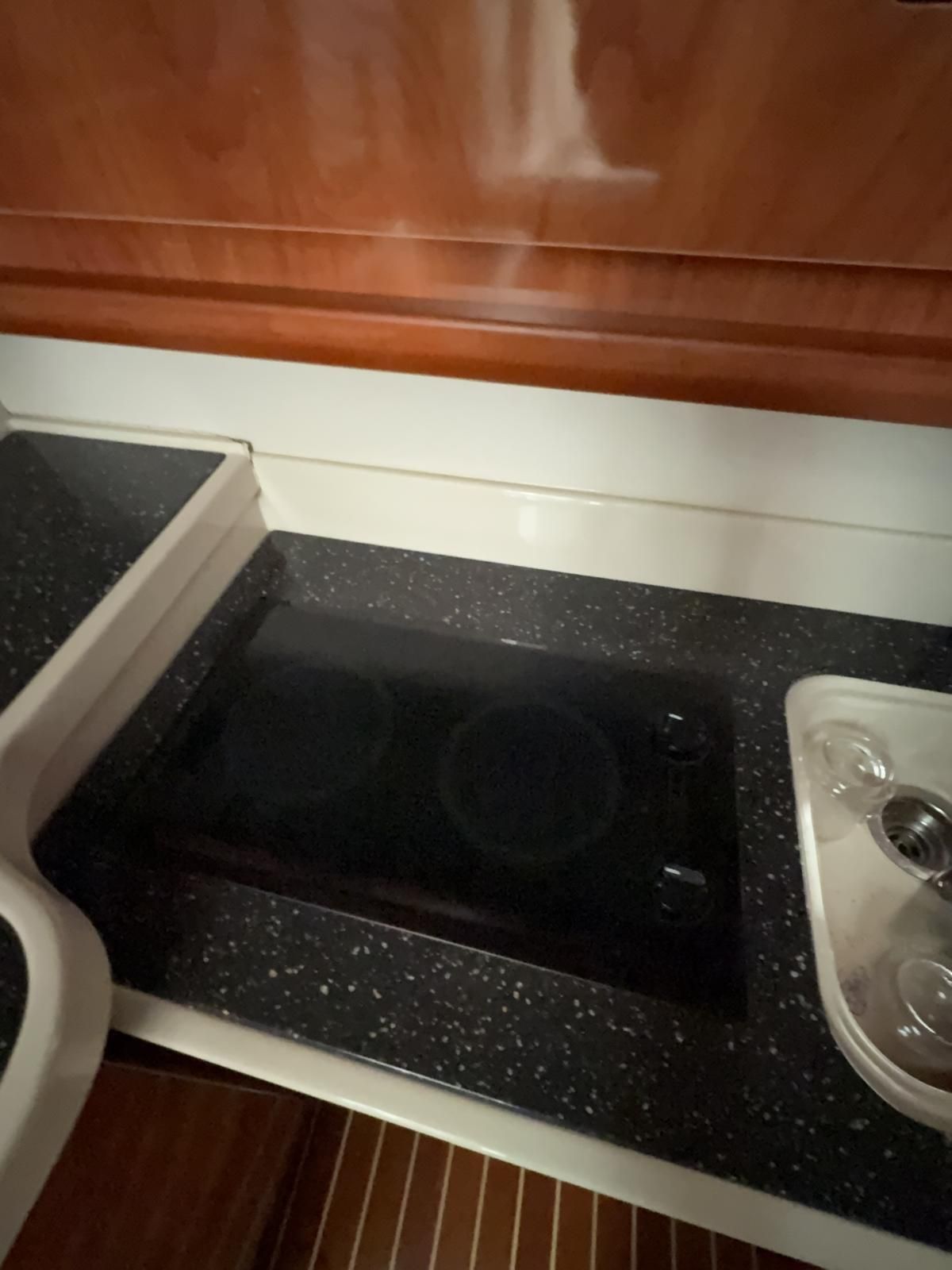 Electric Cook Top, Large Refrigerator/Freezer, Microwave & Sink in the Galley