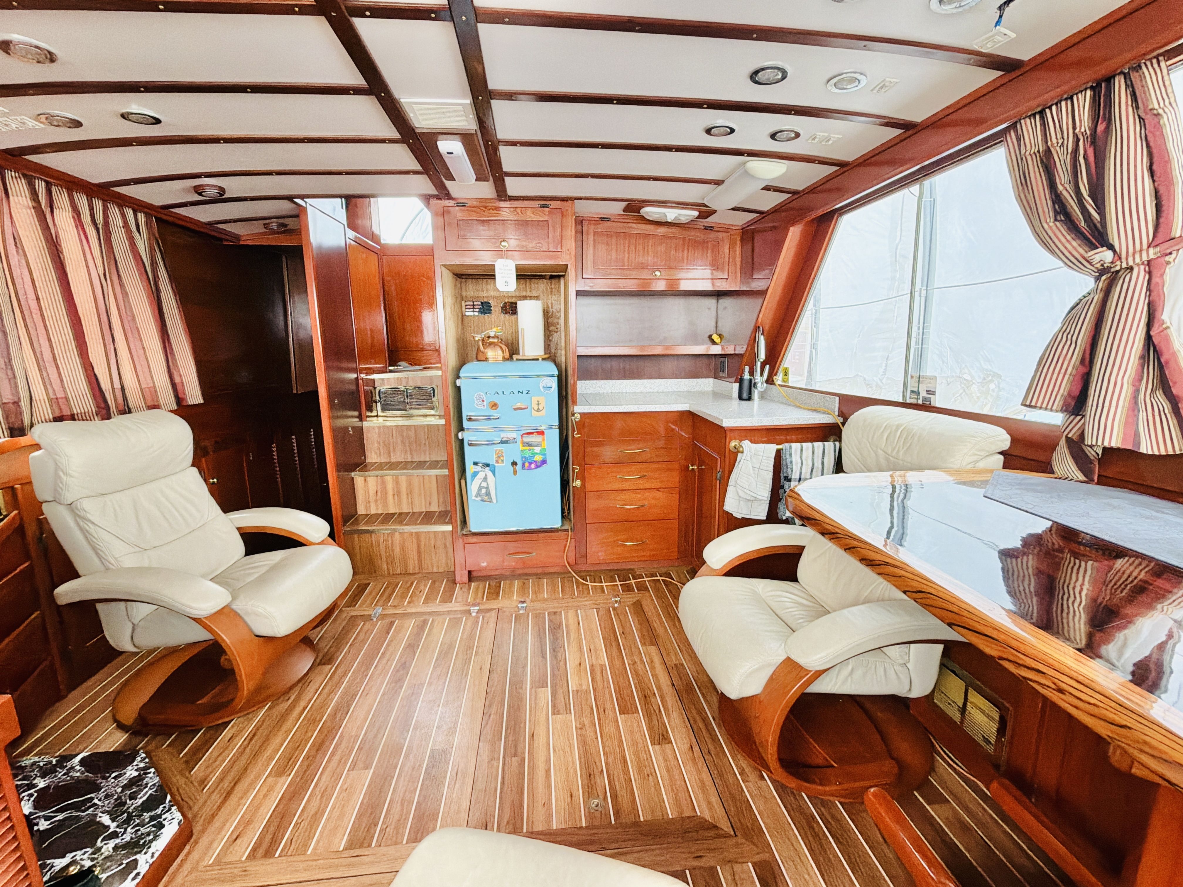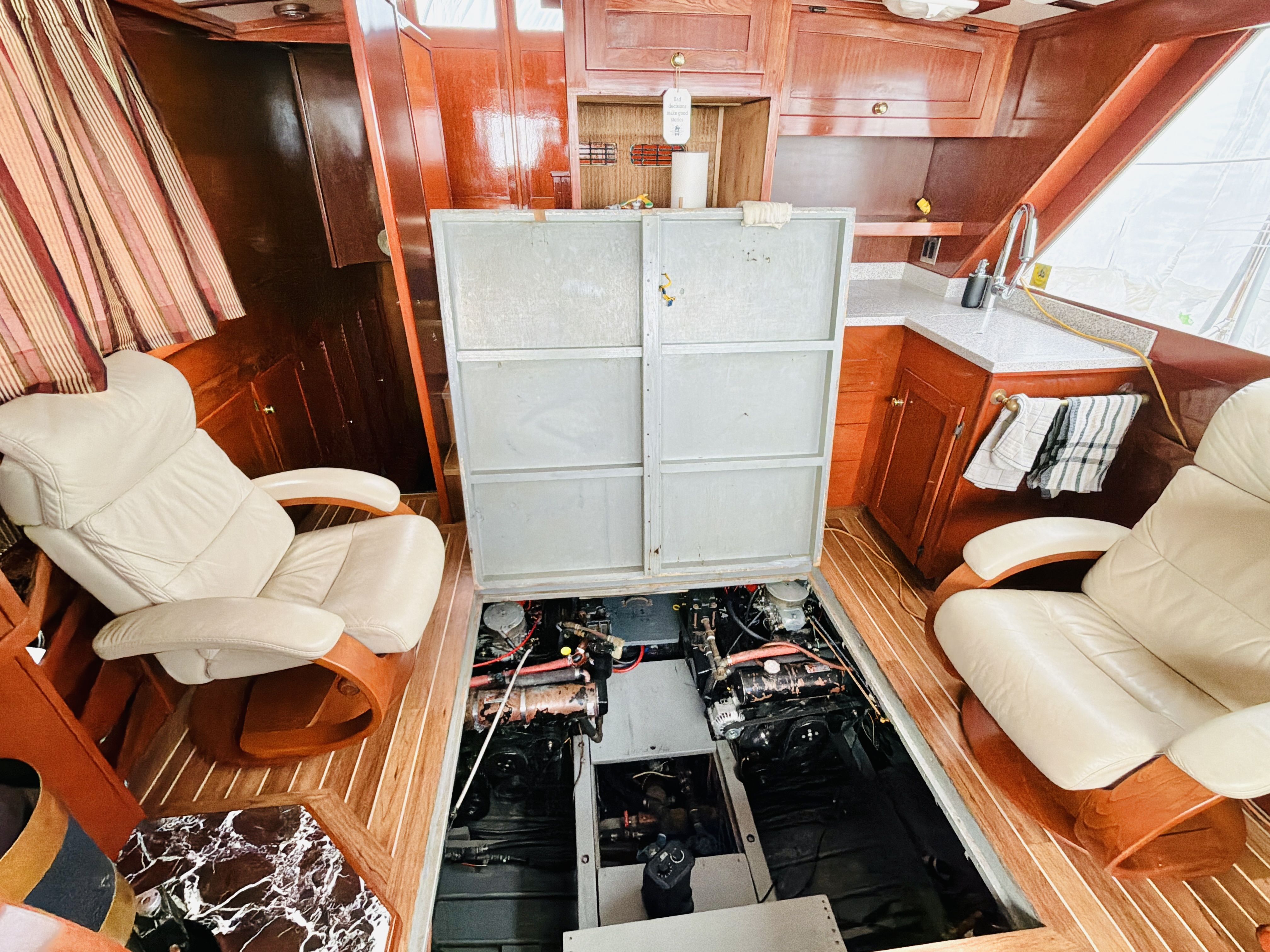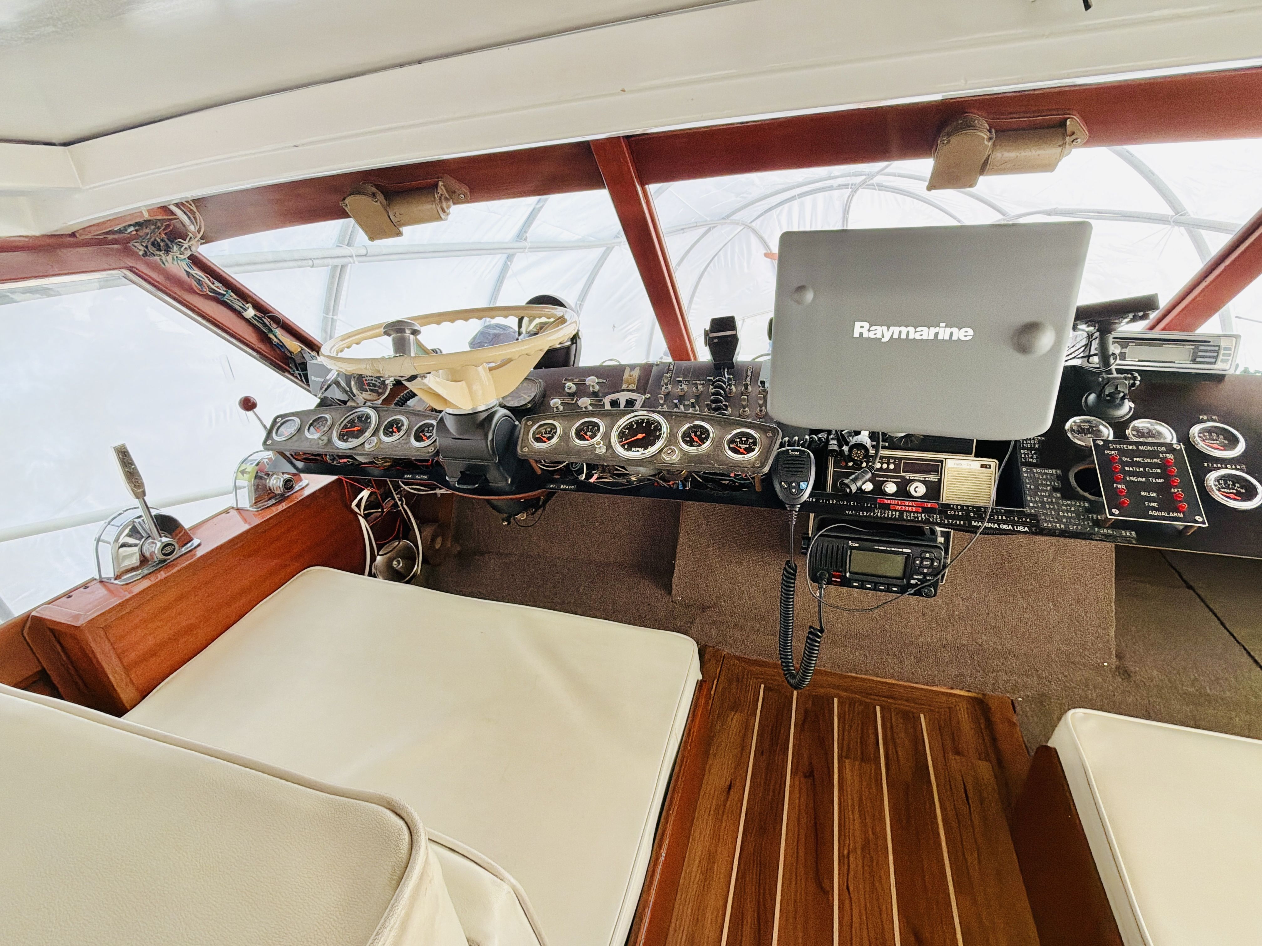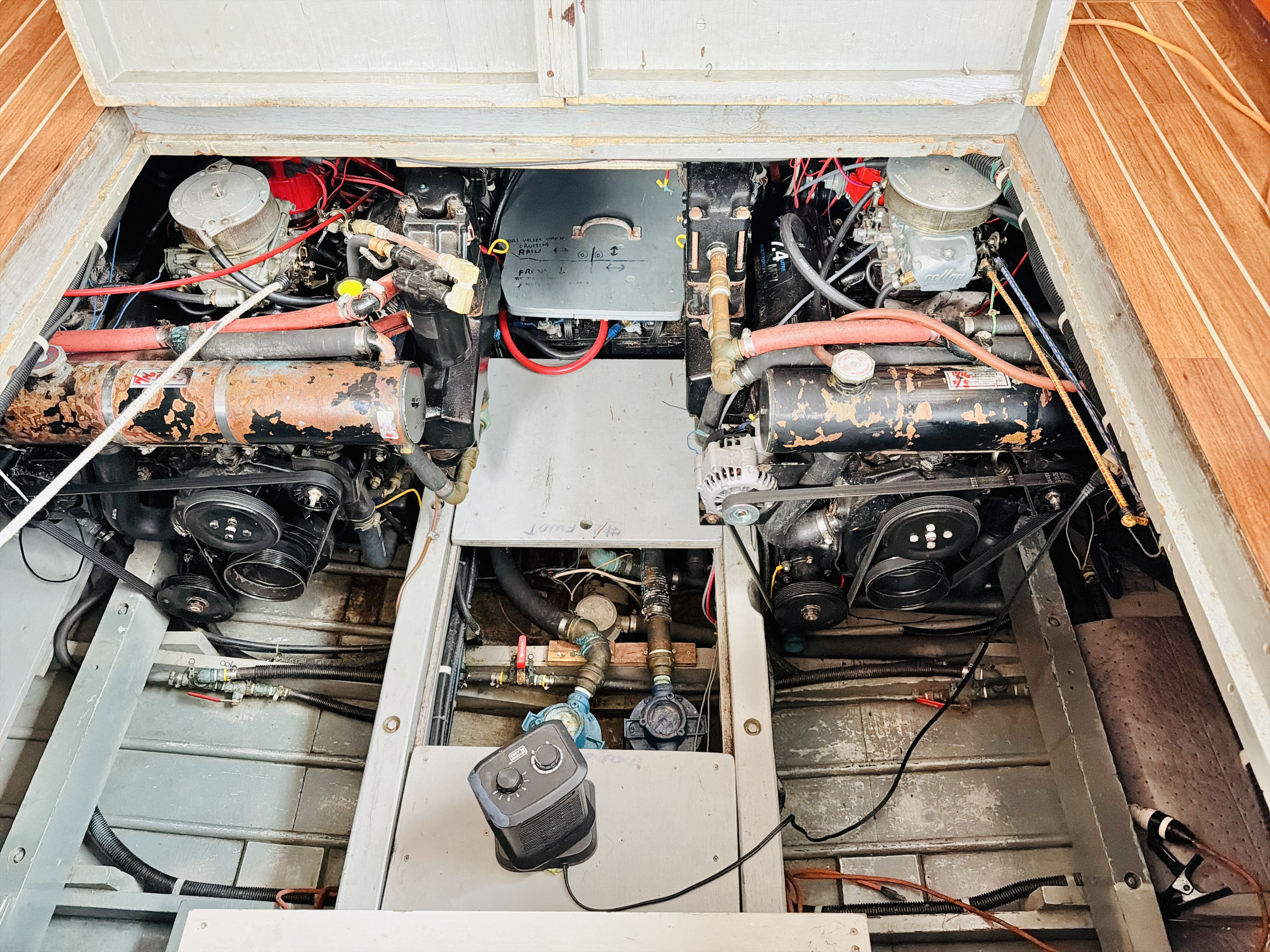 NAUTI GAL IV is powered by twin MerCruiser 350HP gas engines (700HP total) on direct drives, offering impressive performance for a classic 40-footer. She gets up on plane easily and delivers confident handling underway. The port engine has seen extensive recent mechanical upgrades including rebuilt internals (approx. 300 hours ago), new exhaust manifolds and risers, new 150-amp alternator charging the house bank, new starter, new fuel pump, new custom wiring harness, new billet HEI distributor, and a rebuilt Holley 750 marine carburetor. Both engines received new plugs and wires last season along with new starting batteries. Engine care has been meticulous, with consistent seasonal oil changes and documented servicing. Importantly, there is no fuel smell in the cabin — a testament to proper maintenance and fuel system integrity.
