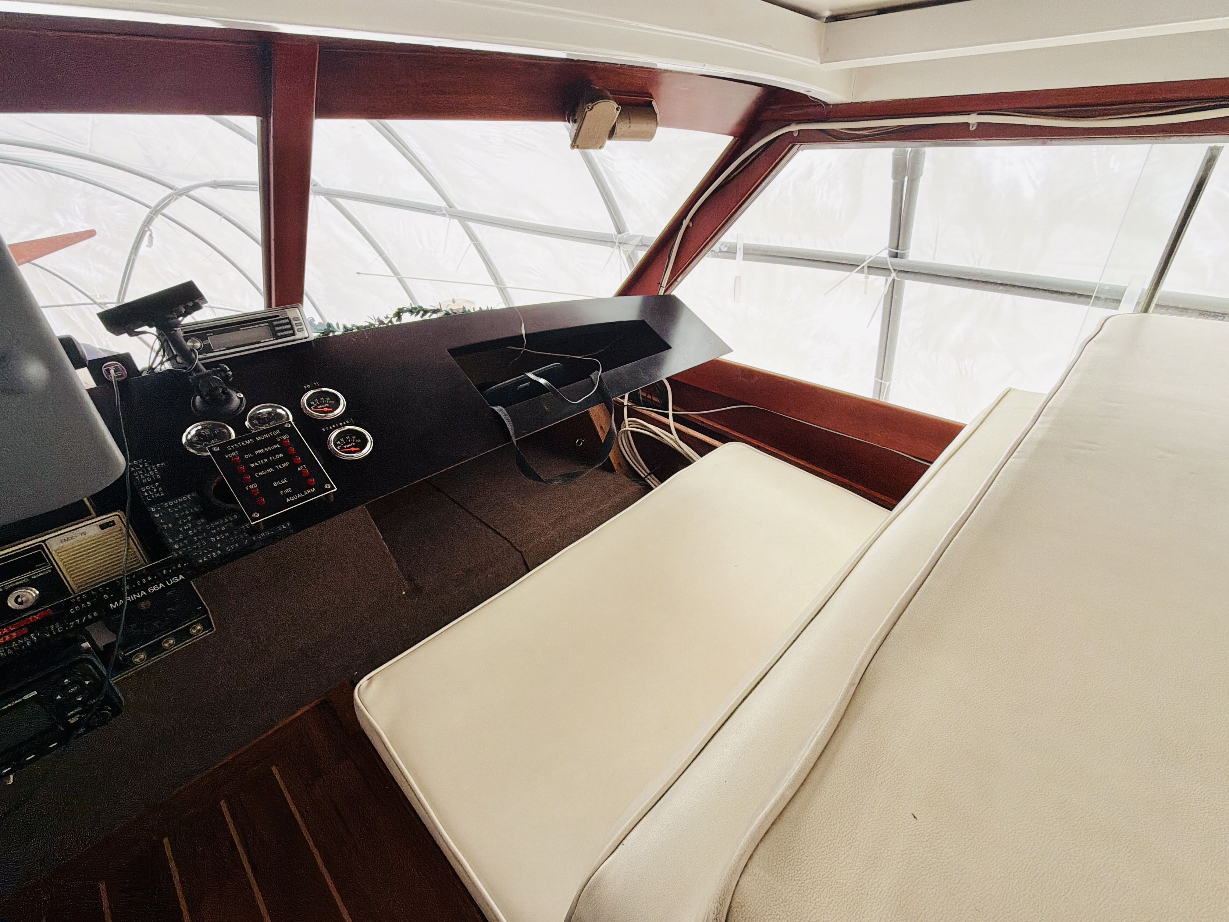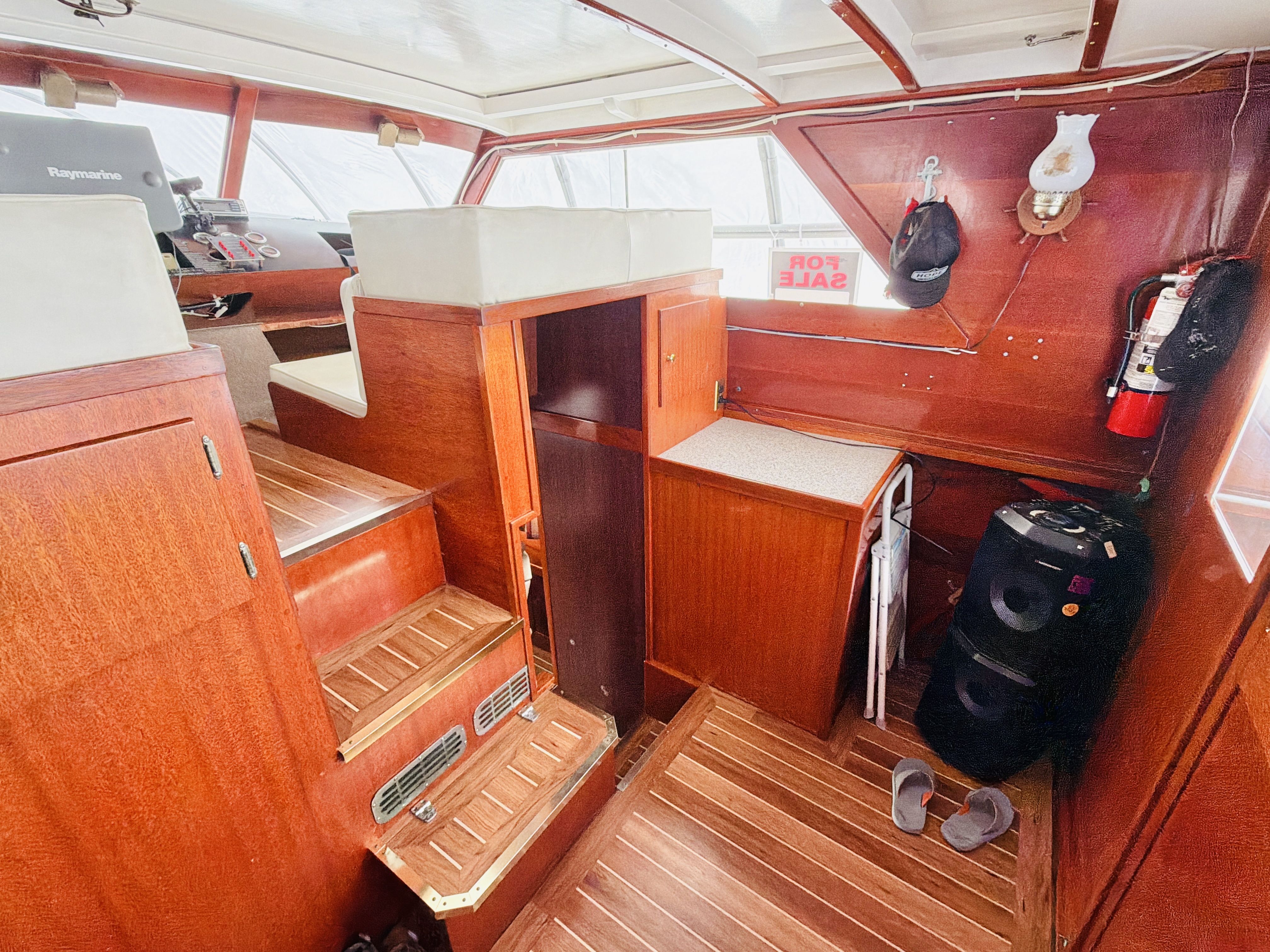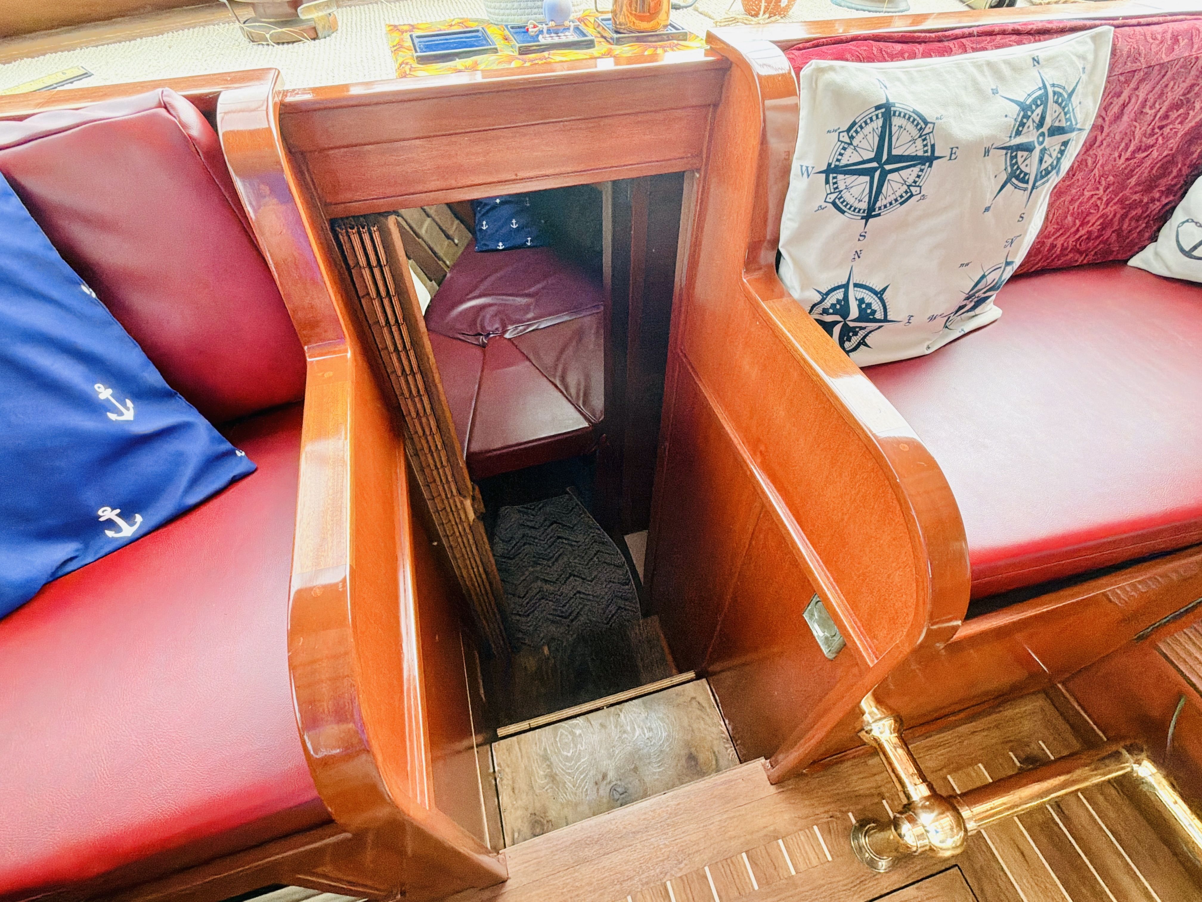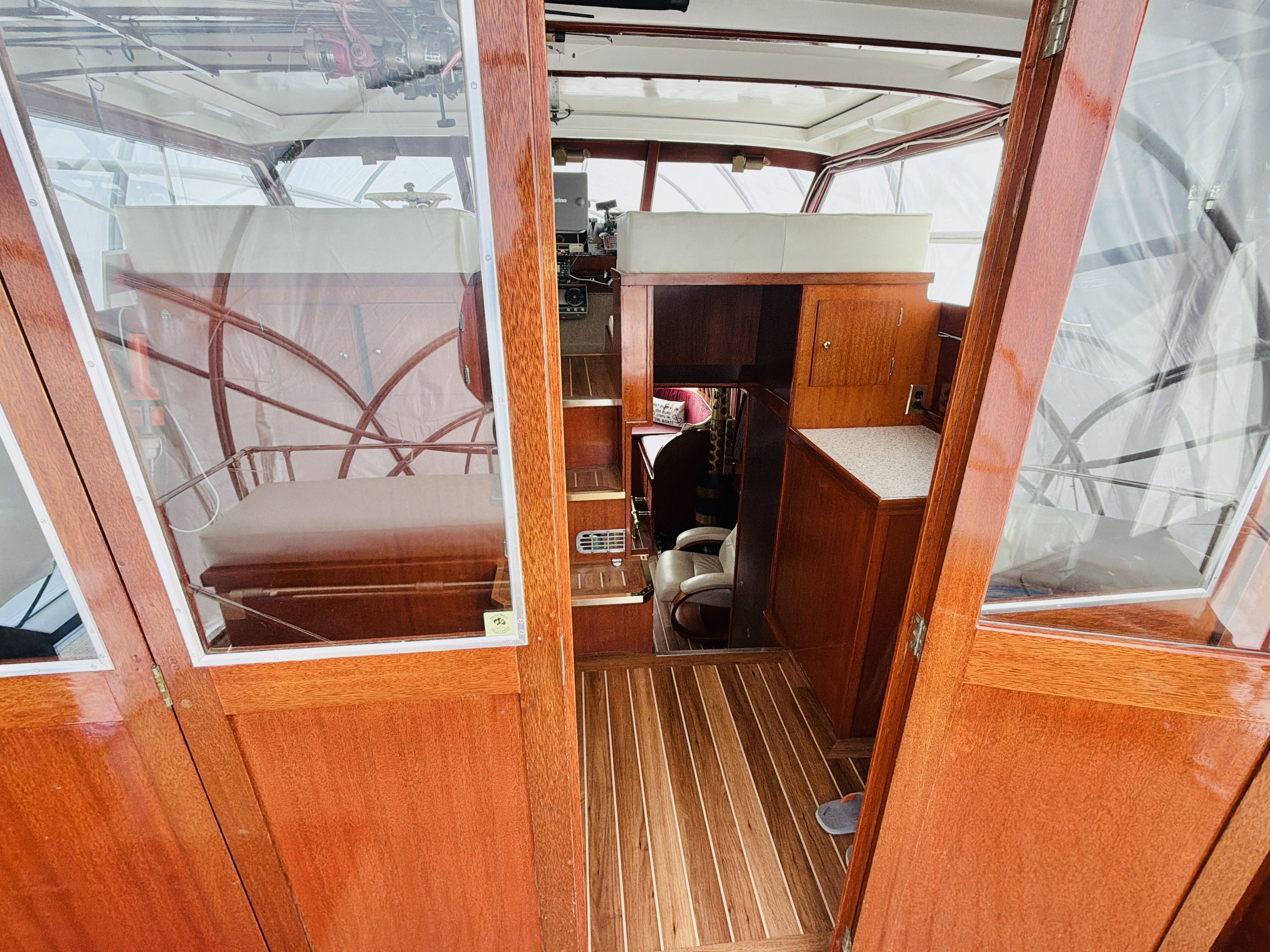 NAUTI GAL IV is powered by twin MerCruiser 350HP gas engines (700HP total) on direct drives, offering impressive performance for a classic 40-footer. She gets up on plane easily and delivers confident handling underway. The port engine has seen extensive recent mechanical upgrades including rebuilt internals (approx. 300 hours ago), new exhaust manifolds and risers, new 150-amp alternator charging the house bank, new starter, new fuel pump, new custom wiring harness, new billet HEI distributor, and a rebuilt Holley 750 marine carburetor. Both engines received new plugs and wires last season along with new starting batteries. Engine care has been meticulous, with consistent seasonal oil changes and documented servicing. Importantly, there is no fuel smell in the cabin — a testament to proper maintenance and fuel system integrity.