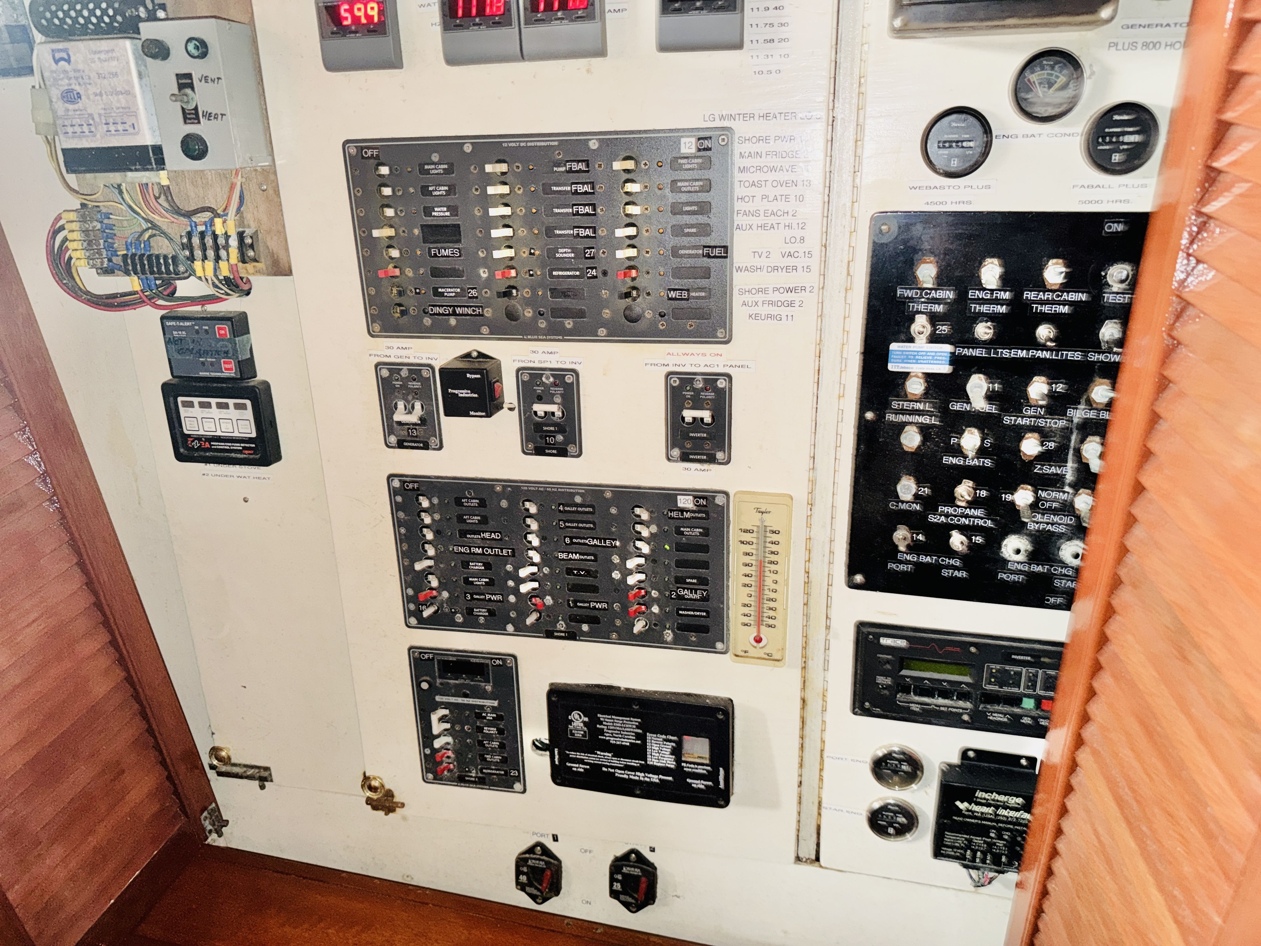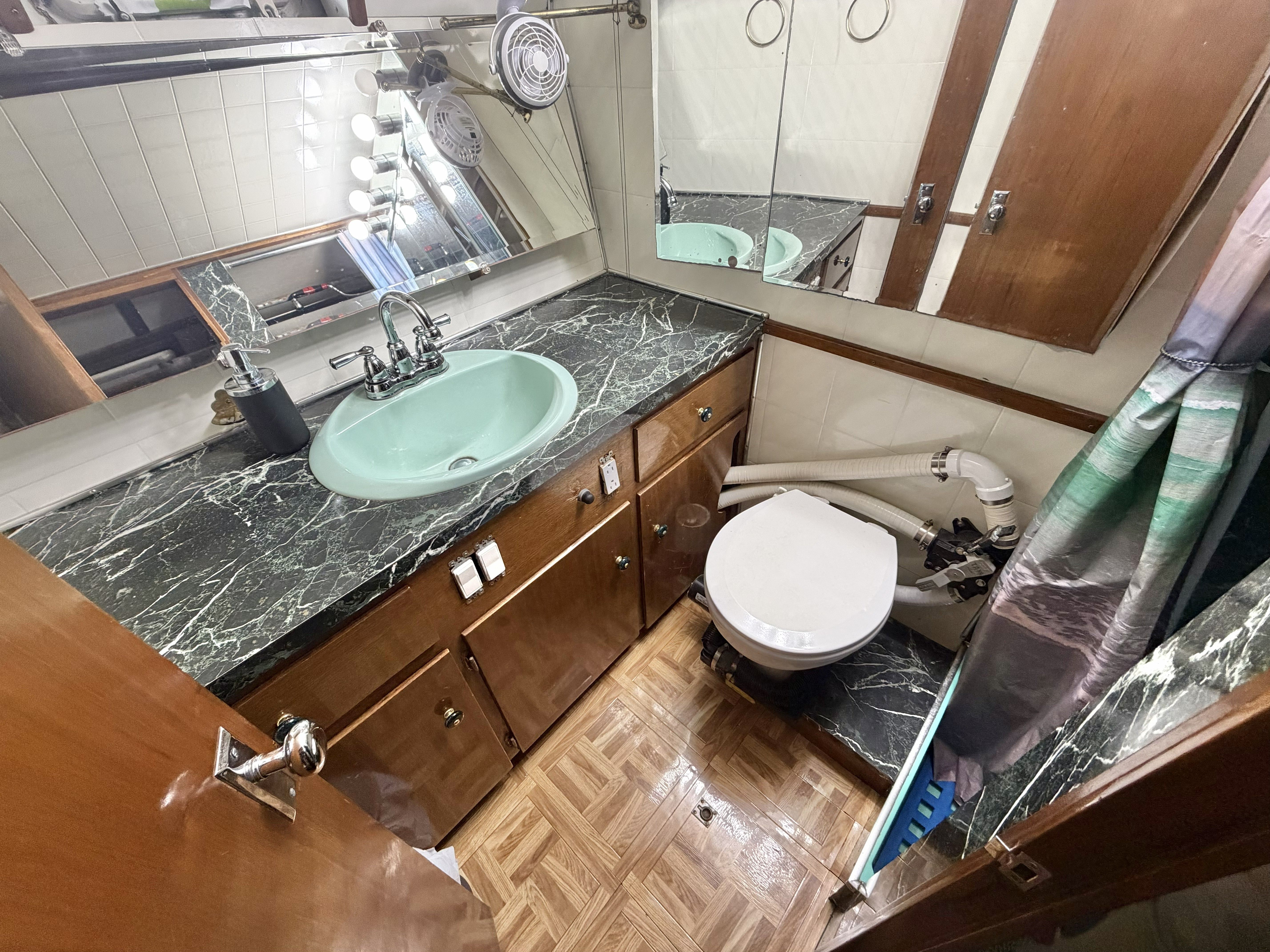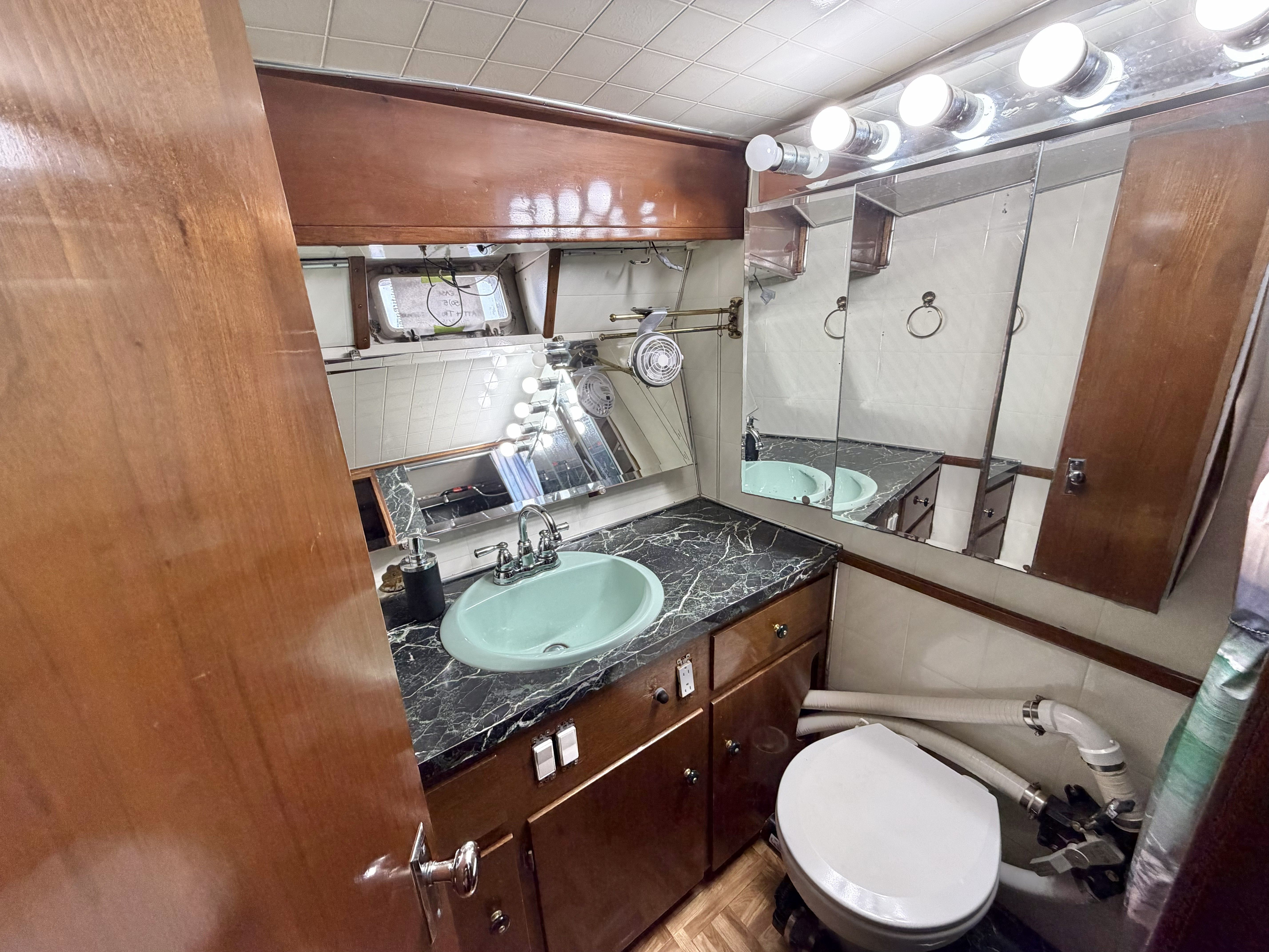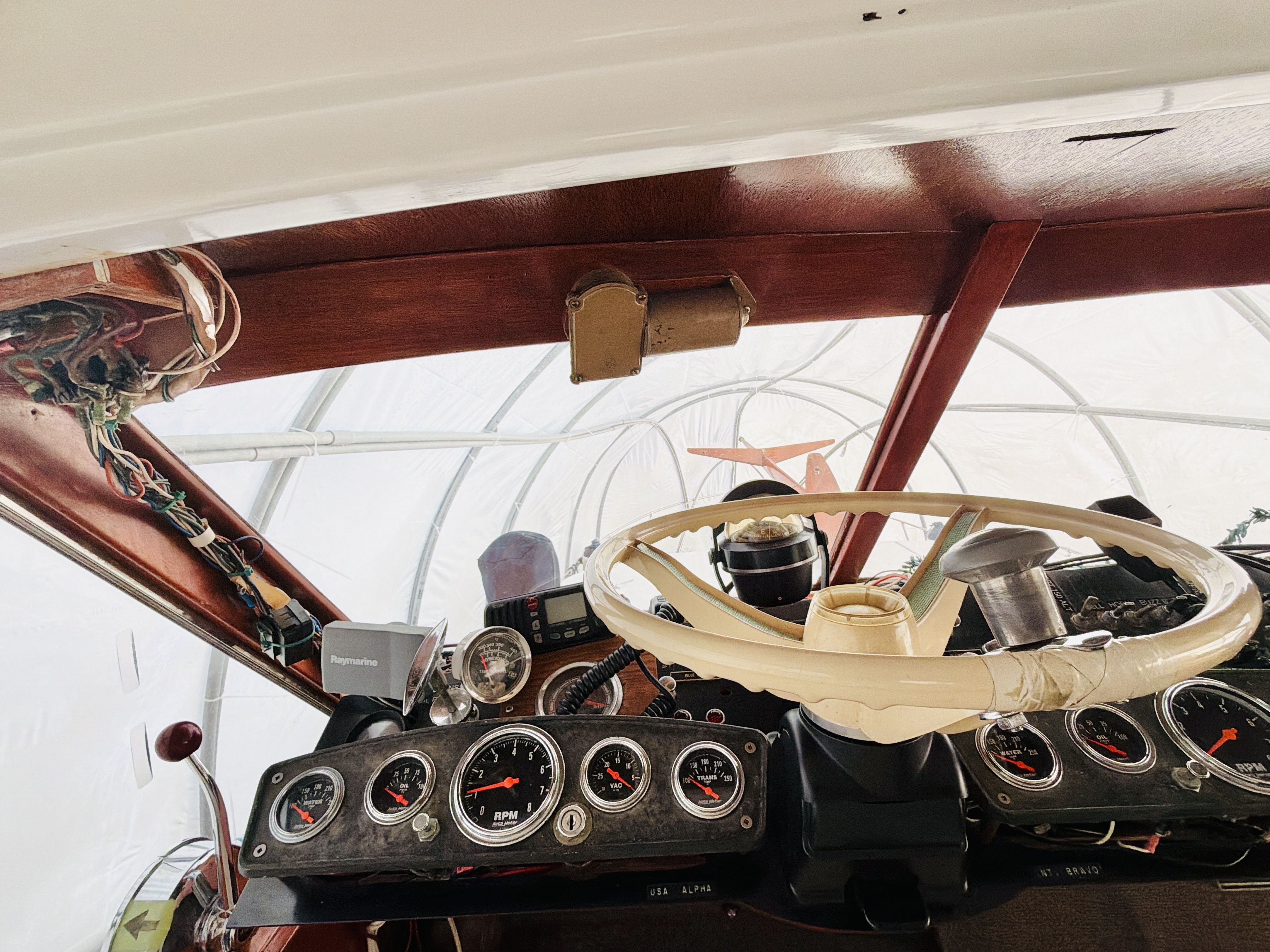 NAUTI GAL IV is powered by twin MerCruiser 350HP gas engines (700HP total) on direct drives, offering impressive performance for a classic 40-footer. She gets up on plane easily and delivers confident handling underway. The port engine has seen extensive recent mechanical upgrades including rebuilt internals (approx. 300 hours ago), new exhaust manifolds and risers, new 150-amp alternator charging the house bank, new starter, new fuel pump, new custom wiring harness, new billet HEI distributor, and a rebuilt Holley 750 marine carburetor. Both engines received new plugs and wires last season along with new starting batteries. Engine care has been meticulous, with consistent seasonal oil changes and documented servicing. Importantly, there is no fuel smell in the cabin — a testament to proper maintenance and fuel system integrity.