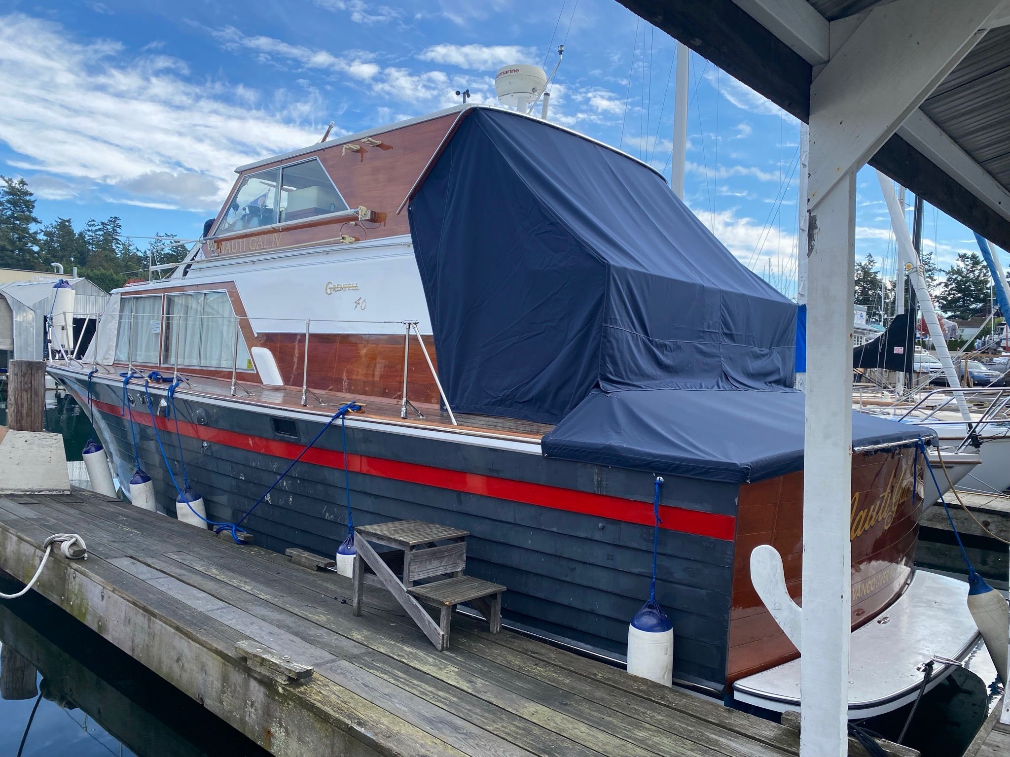 This 1965 Grenfell 40’ represents a rare opportunity to own a true West Coast classic with modernized mechanical reliability and strong performance. She offers the charm and warmth of a vintage wooden yacht while delivering the power to cruise efficiently and comfortably. With her spacious two-cabin layout, generous tankage, and substantial beam, NAUTI GAL IV is well-suited for local cruising, weekend getaways, or extended time on the water. A distinctive and capable classic that turns heads in every harbour.