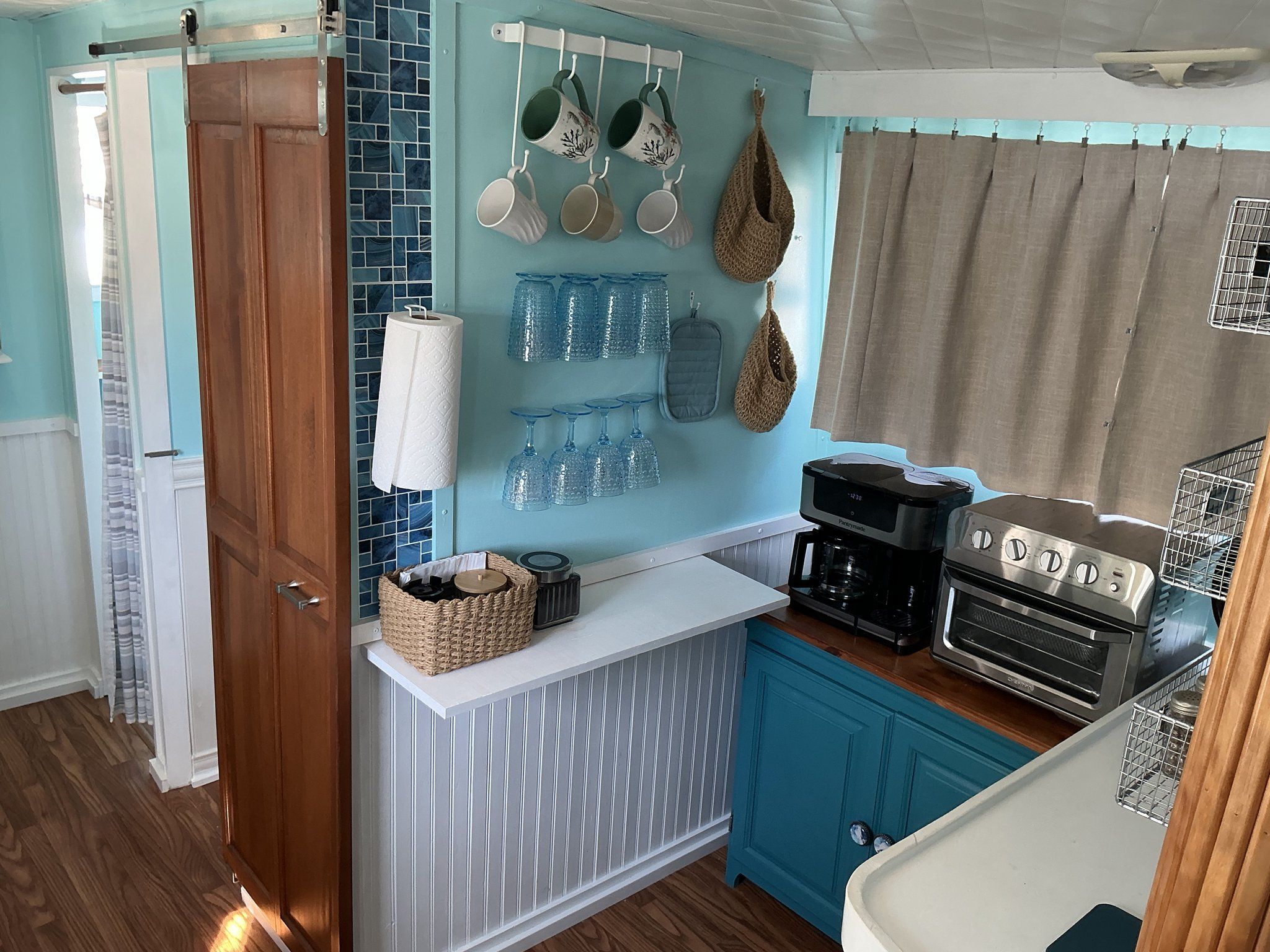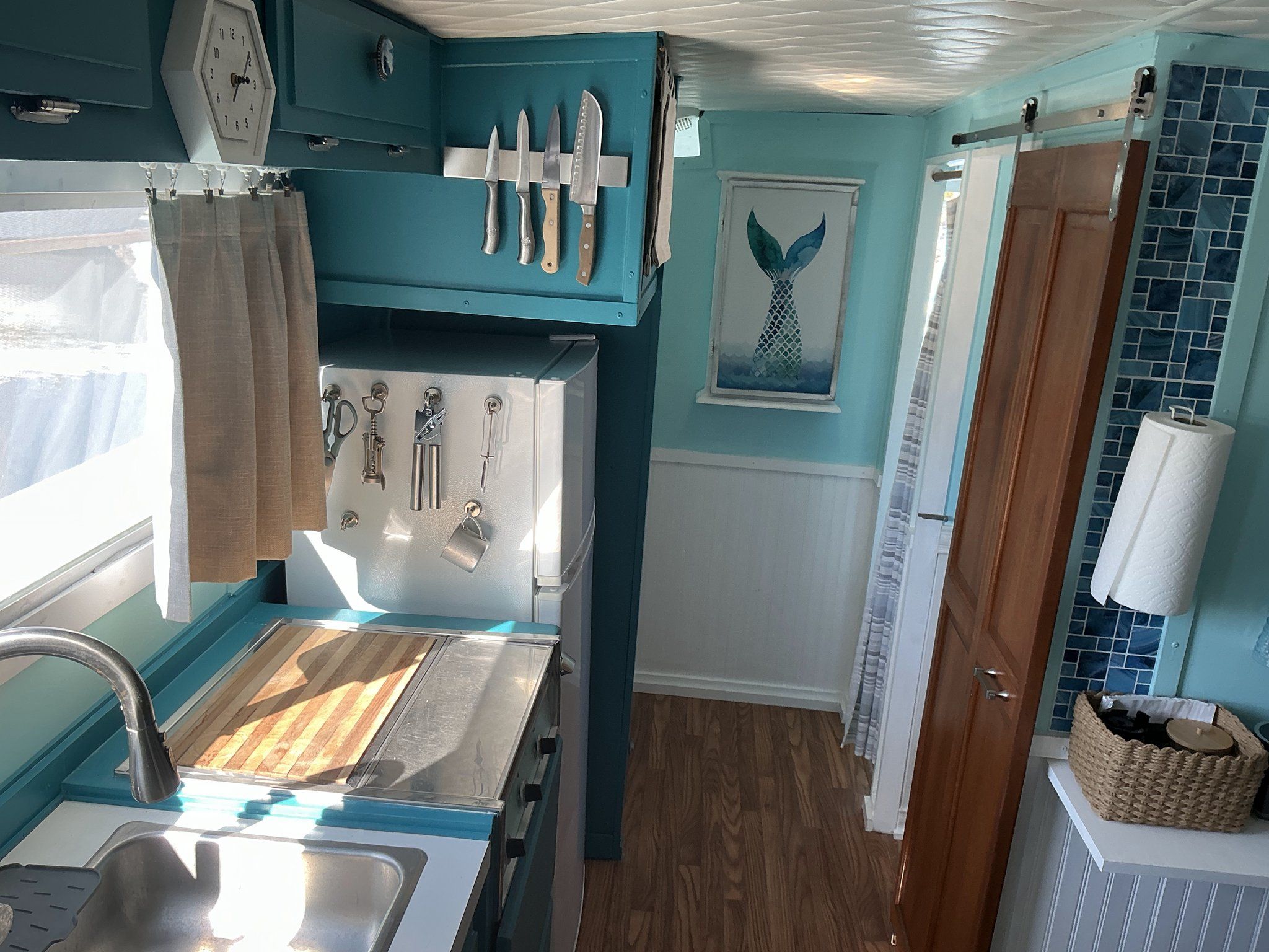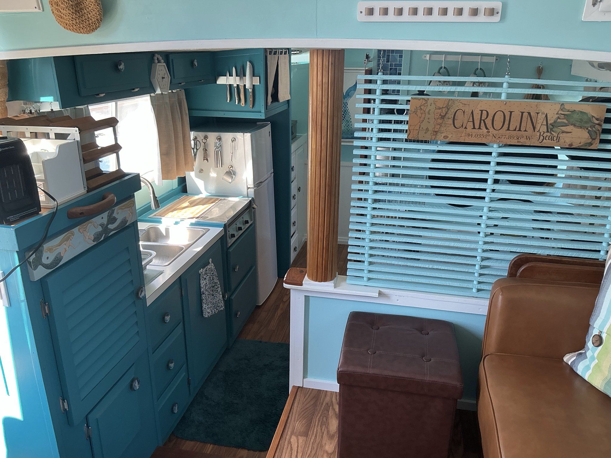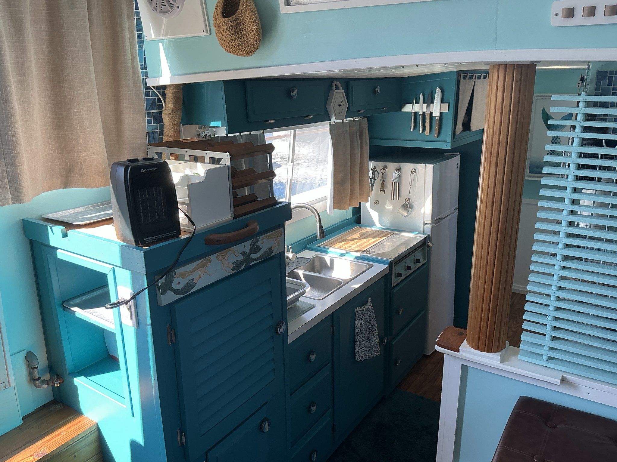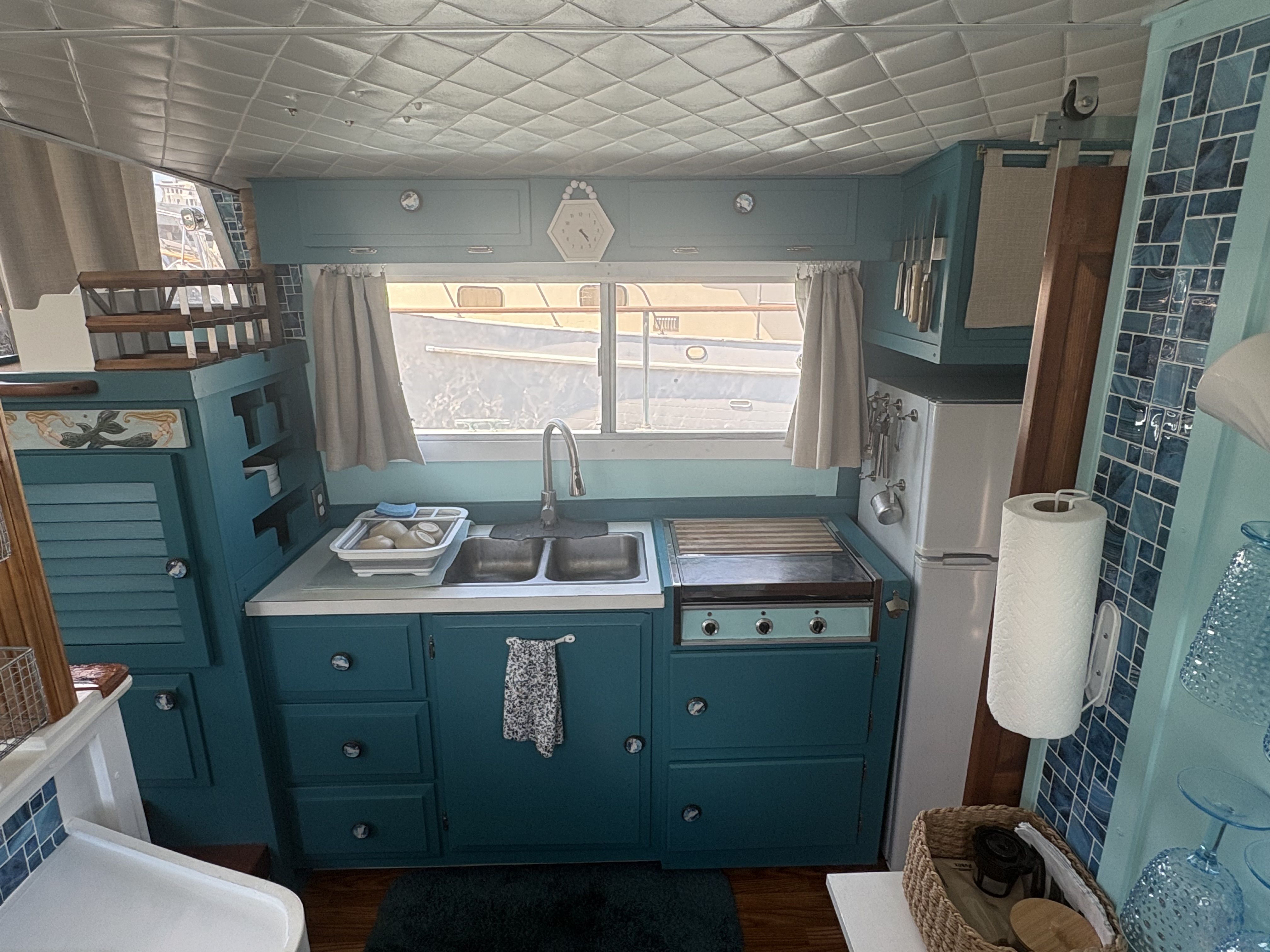 Galley: Located in the starboard amidship solon, 3 burner electric range, RCA refrigerator/freezer